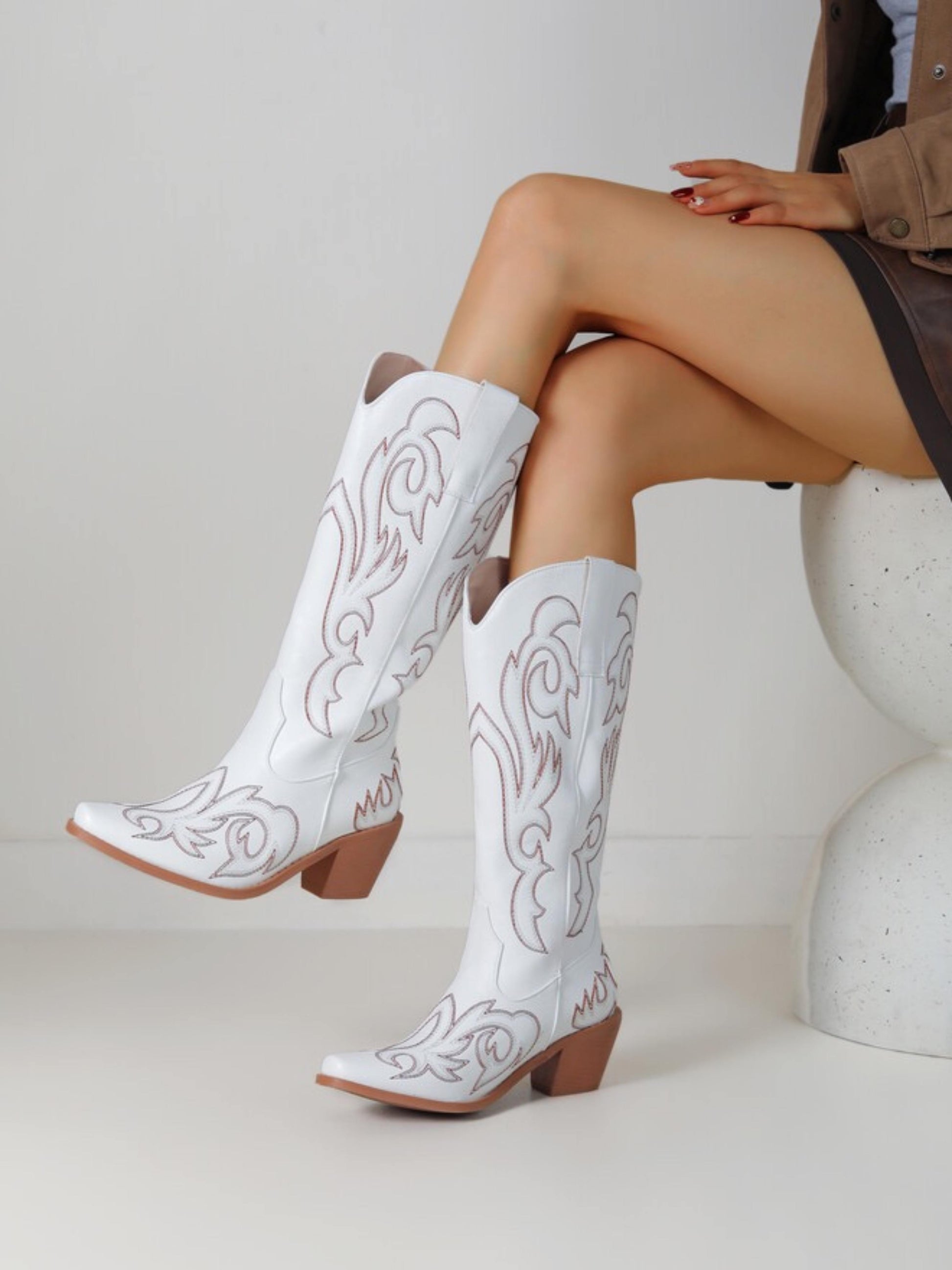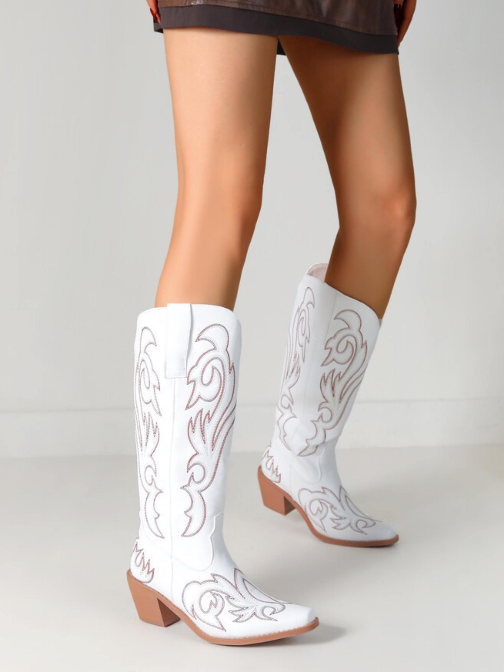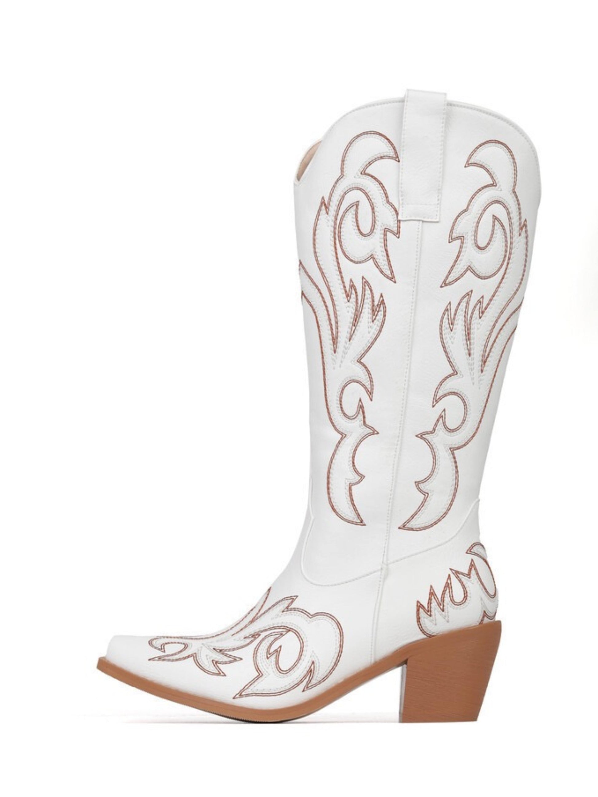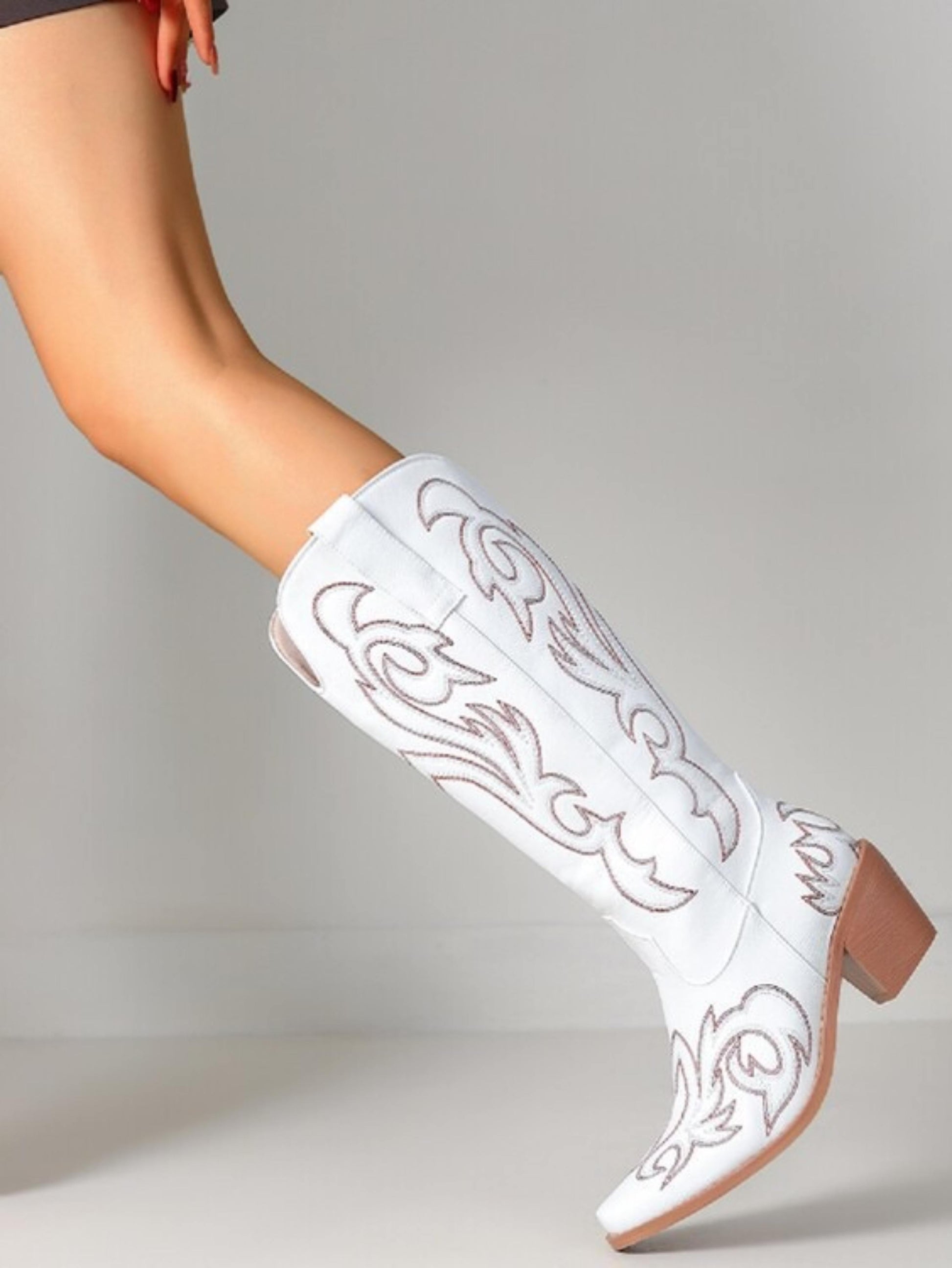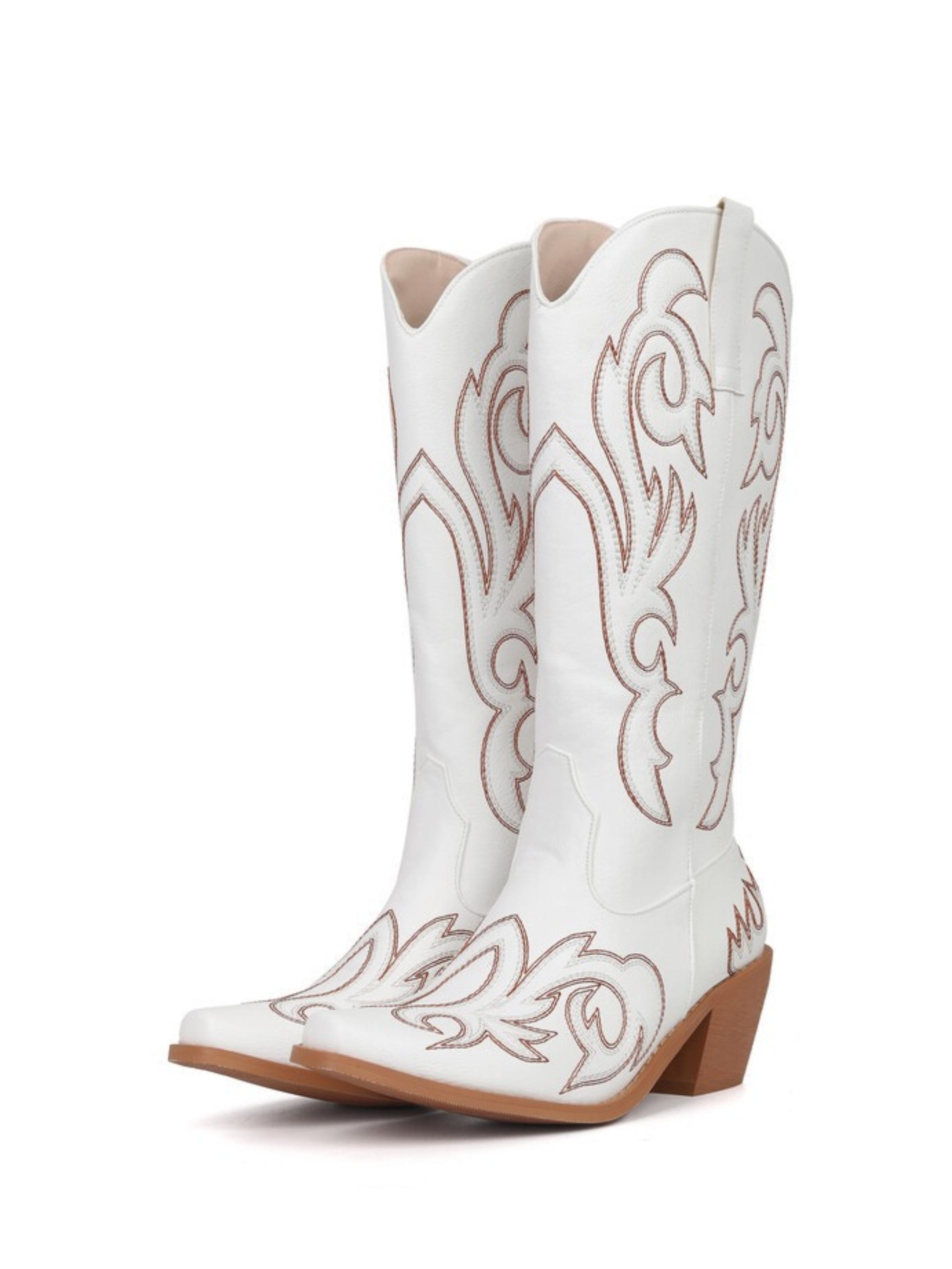 Pure white cowgirl boots with pretty floral designs. Mid-calf height for classic look. Delicate floral artwork stands out on clean white base. Comfy inside with easy pull-on tabs. Perfect for weddings or special events. Fresh, eye-catching style that pairs with any outfit. Elegant twist on classic Western boots with feminine charm.