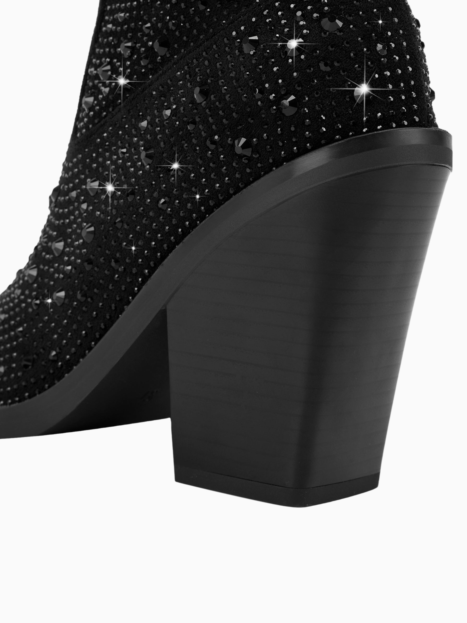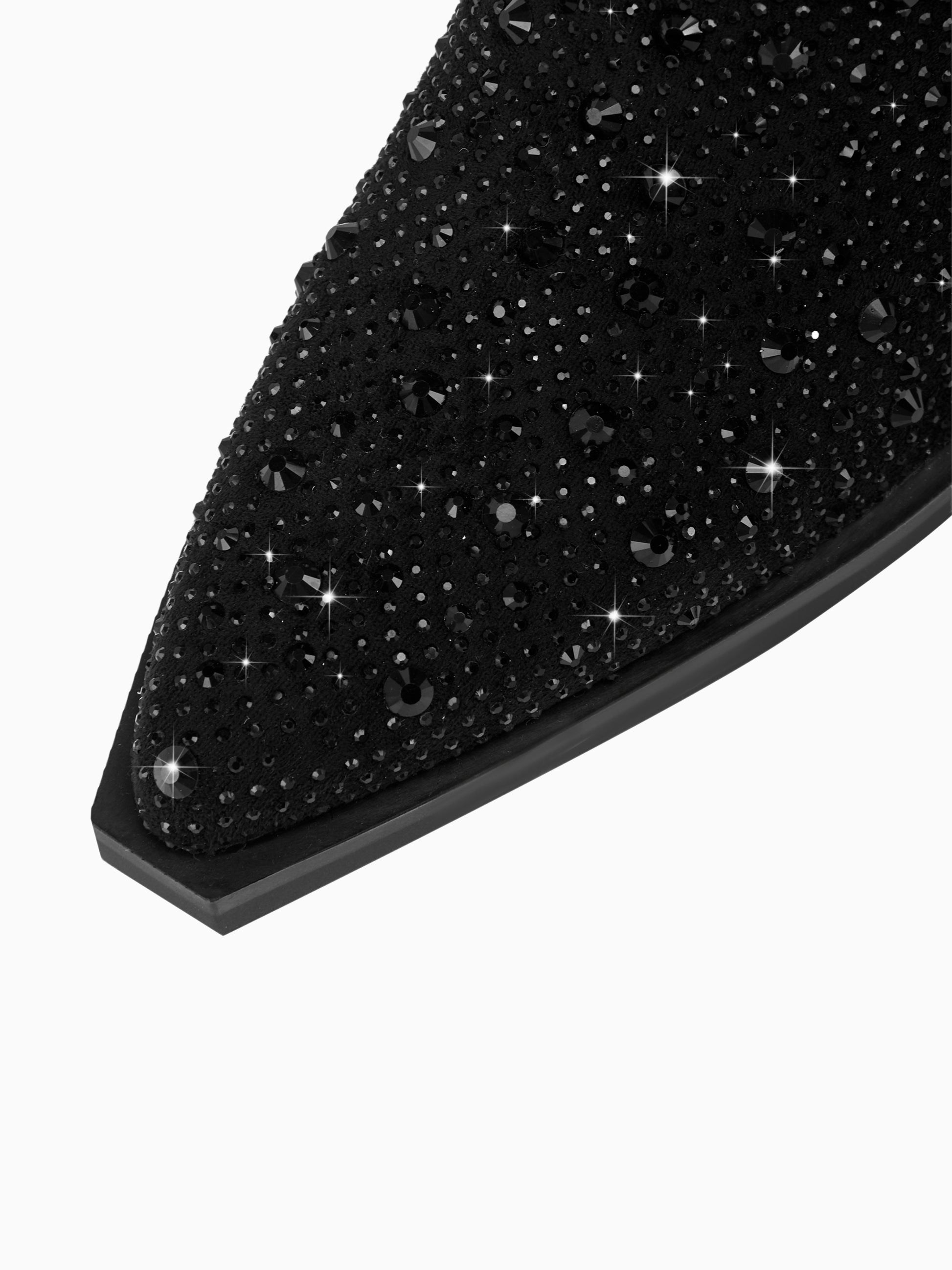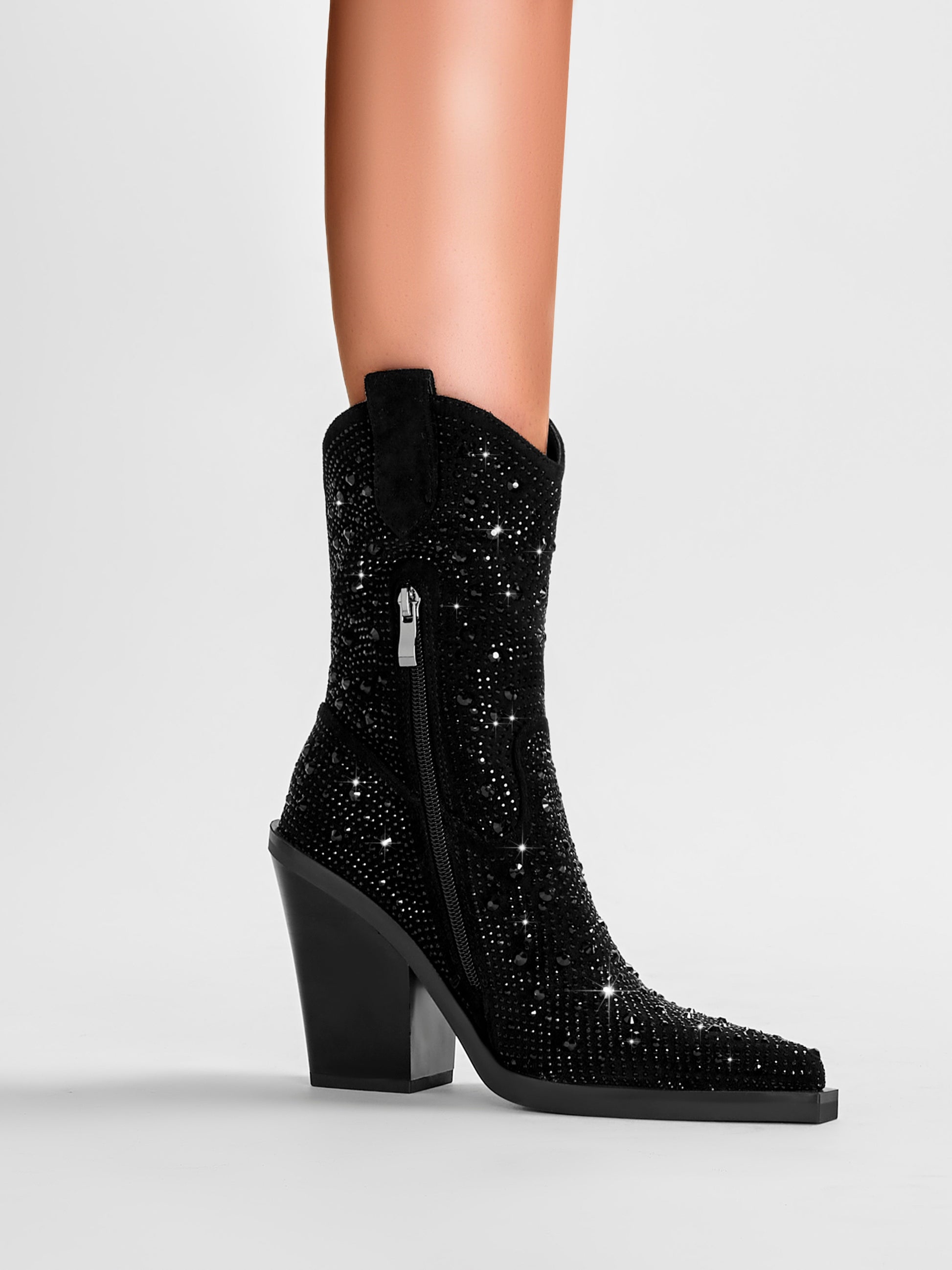 Glamorous Western boots adorned with dazzling black crystals from top to toe, featuring a dramatic high heel and sleek square design.