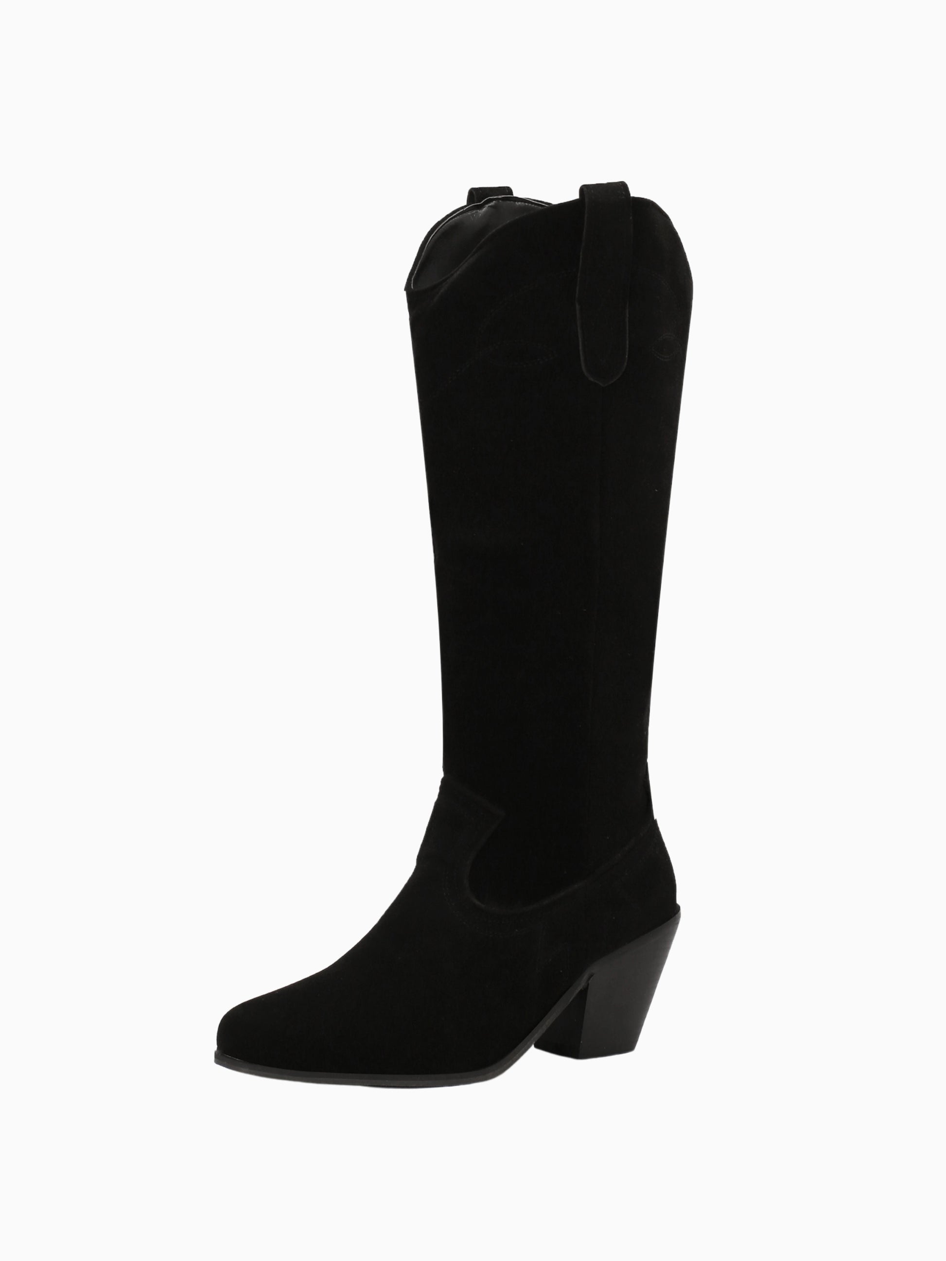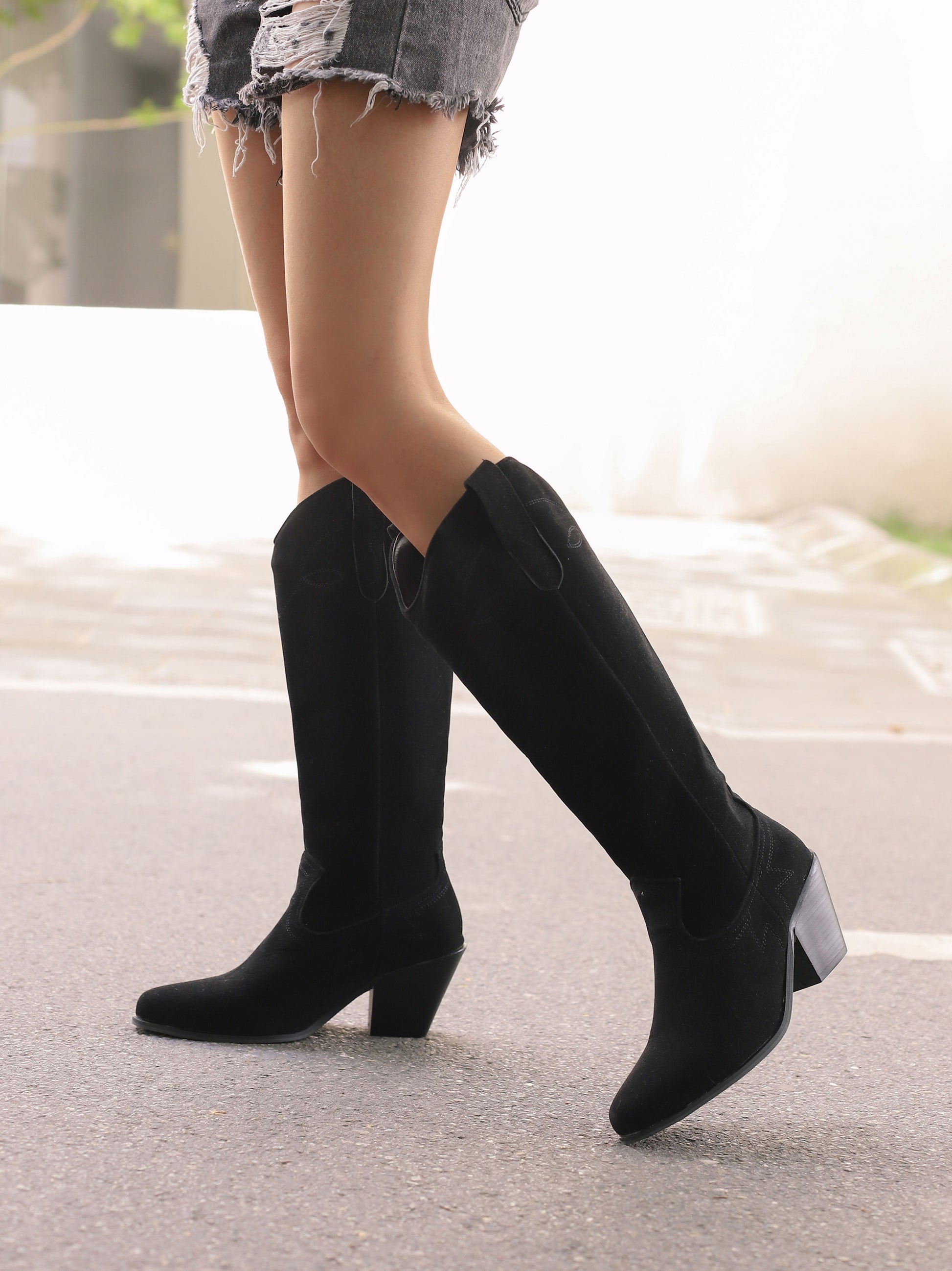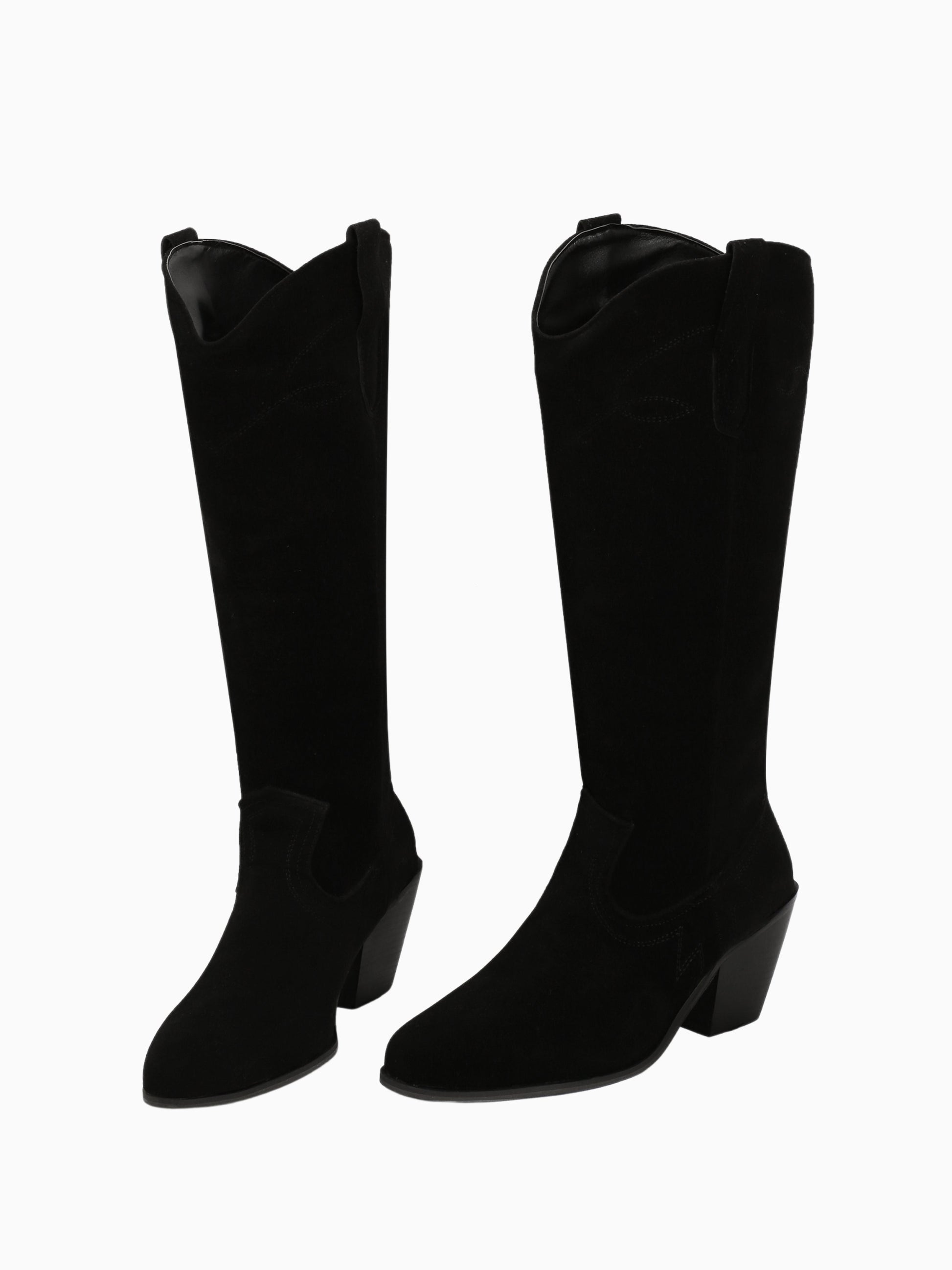 Elegant black suede western boots feature sleek minimalist design and comfortable stacked heel, offering sophisticated style for any occasion.
