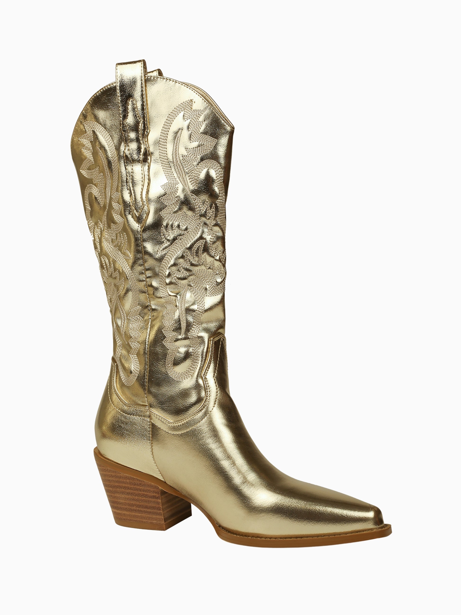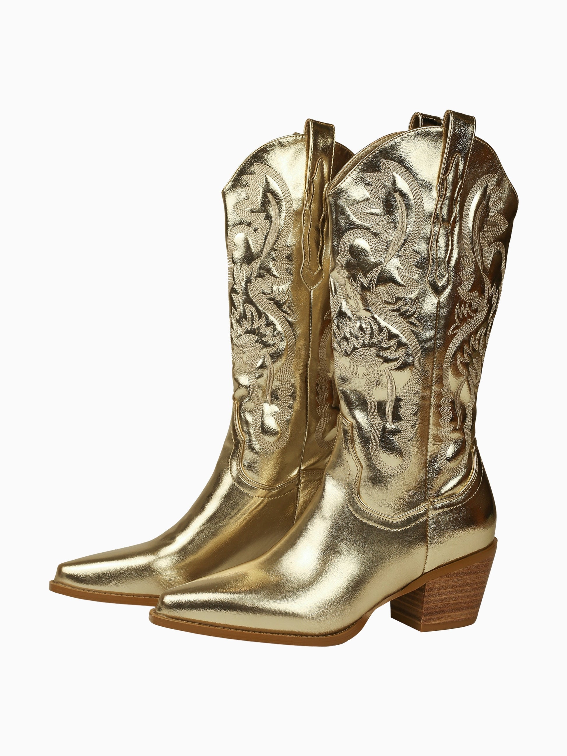 Make a stunning statement in these mirror-finish gold cowgirl boots. Featuring intricate western embroidery, a sleek pointed toe, and a dazzling metallic shine, these mid-calf boots merge traditional craftsmanship with show-stopping glamour.