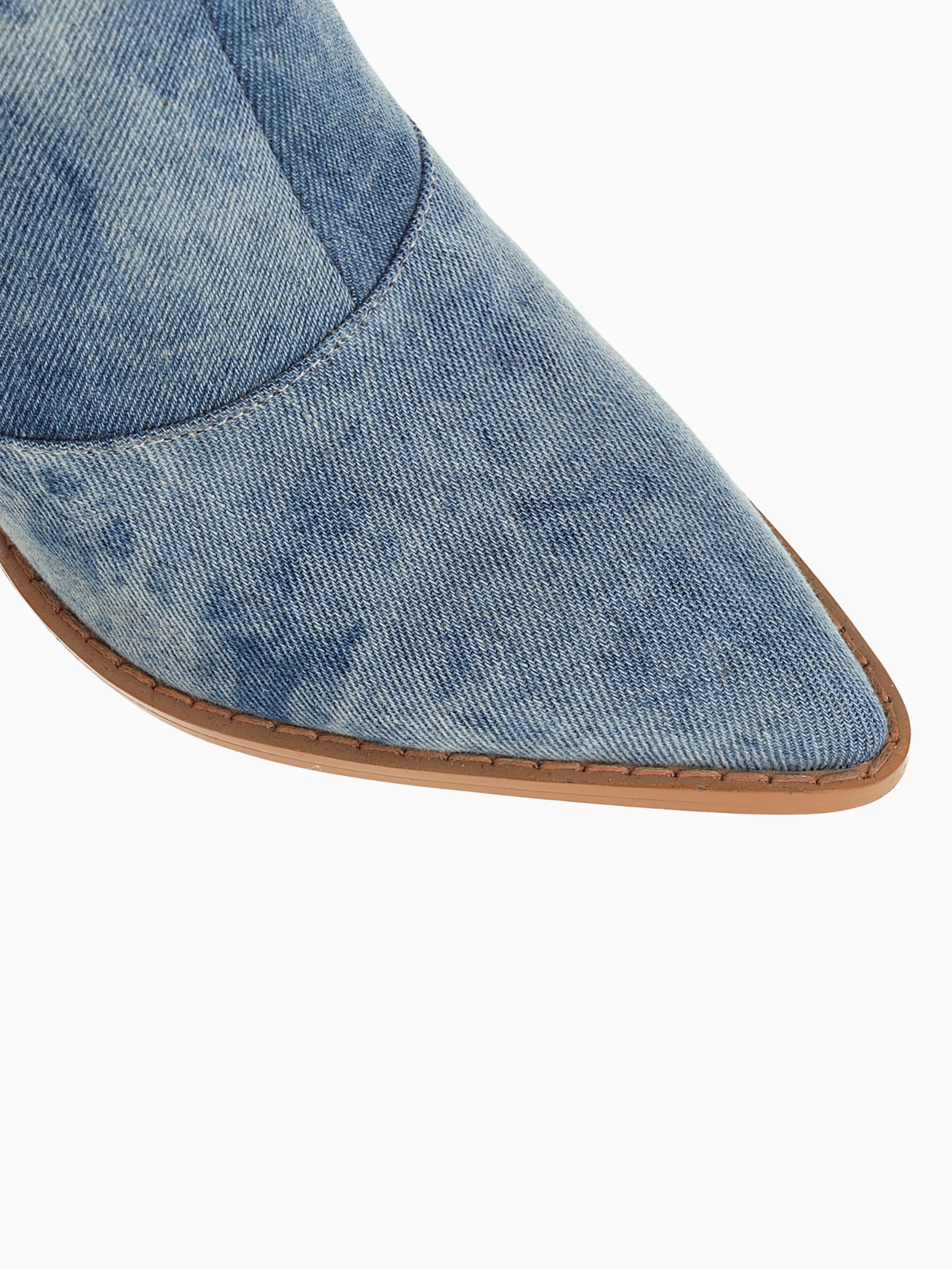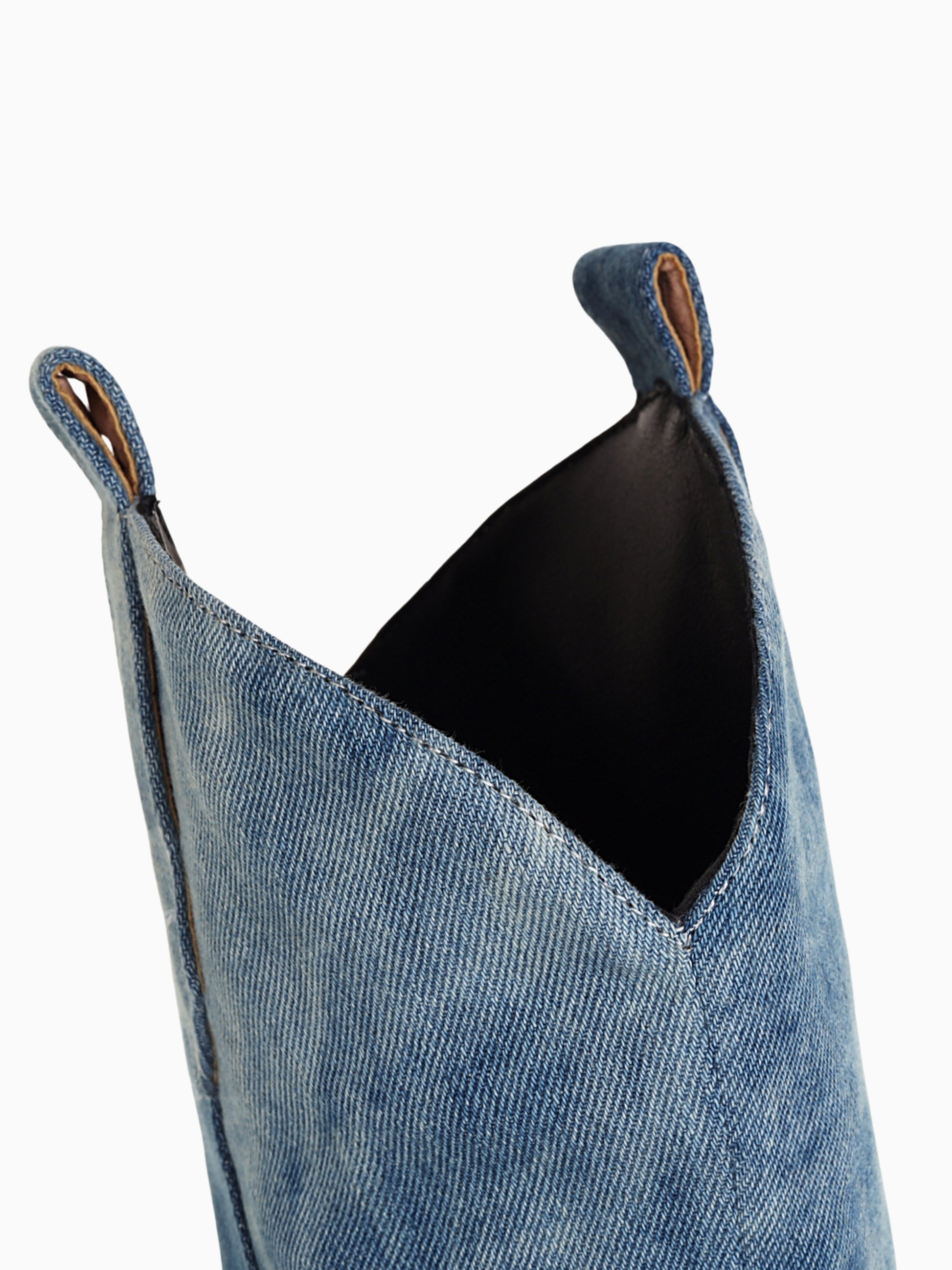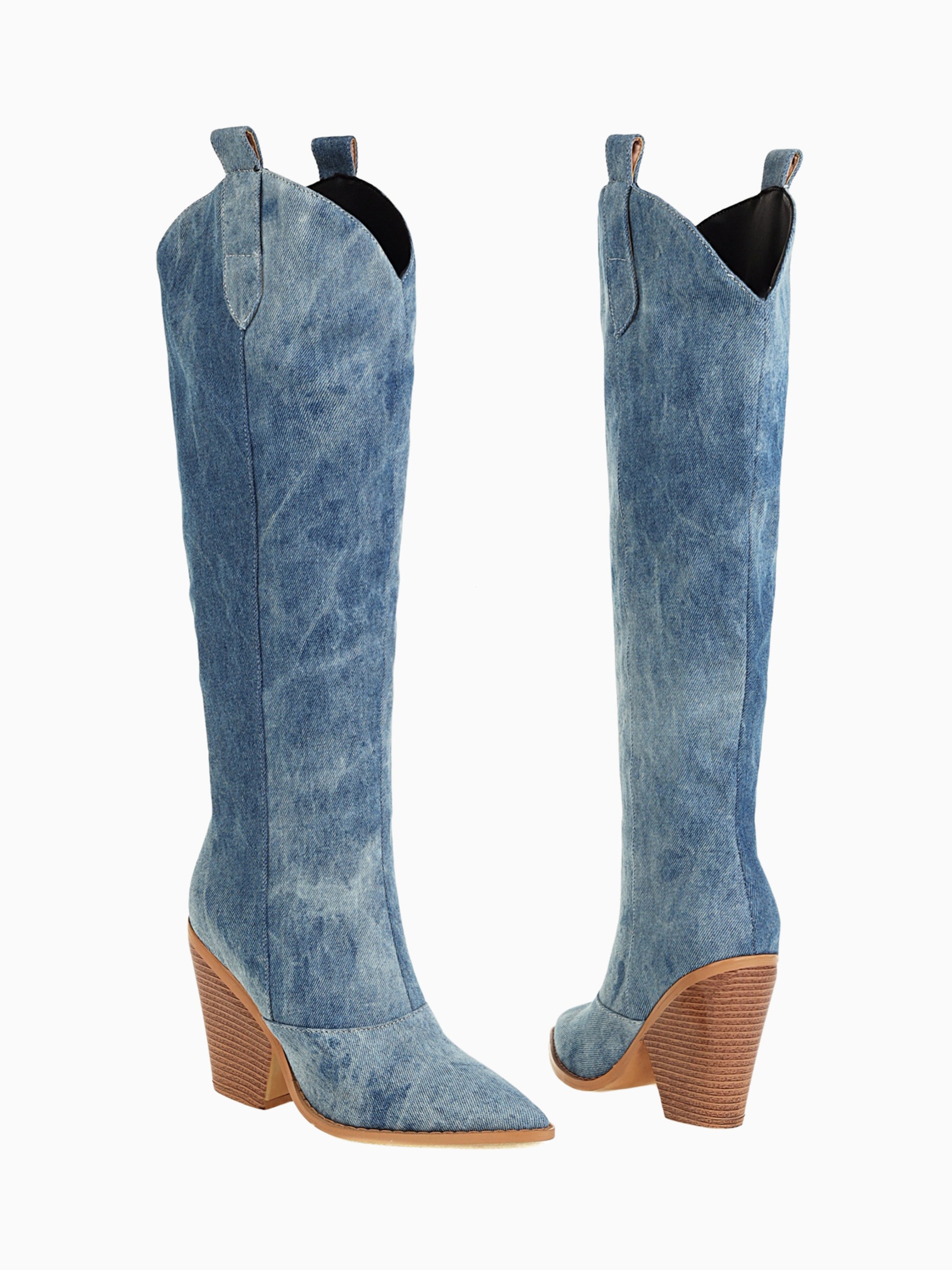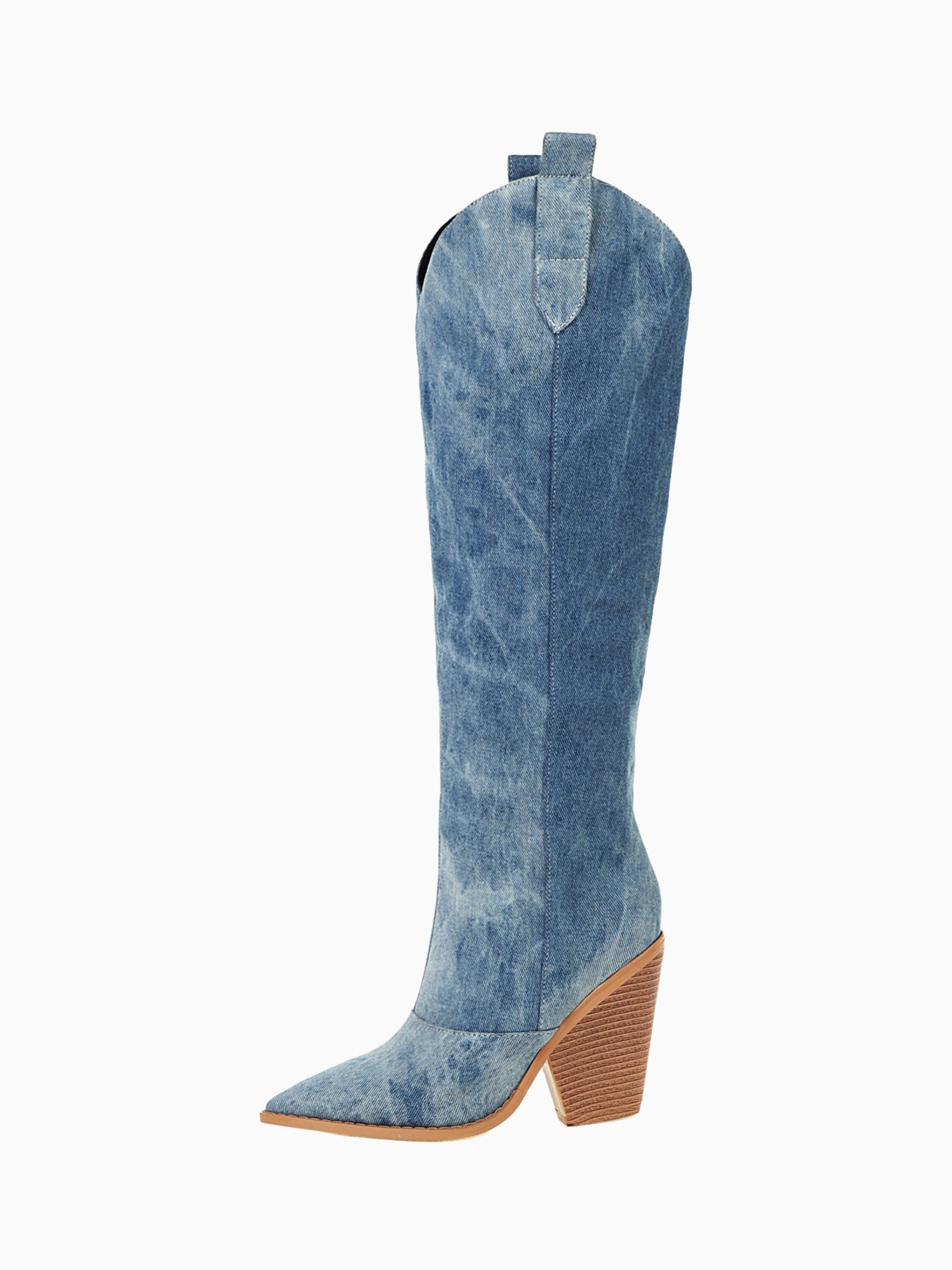 These contemporary tall cowgirl boots showcase a unique denim construction in washed light blue, balanced with a sturdy block heel. The knee-high silhouette delivers Western charm with urban sophistication.