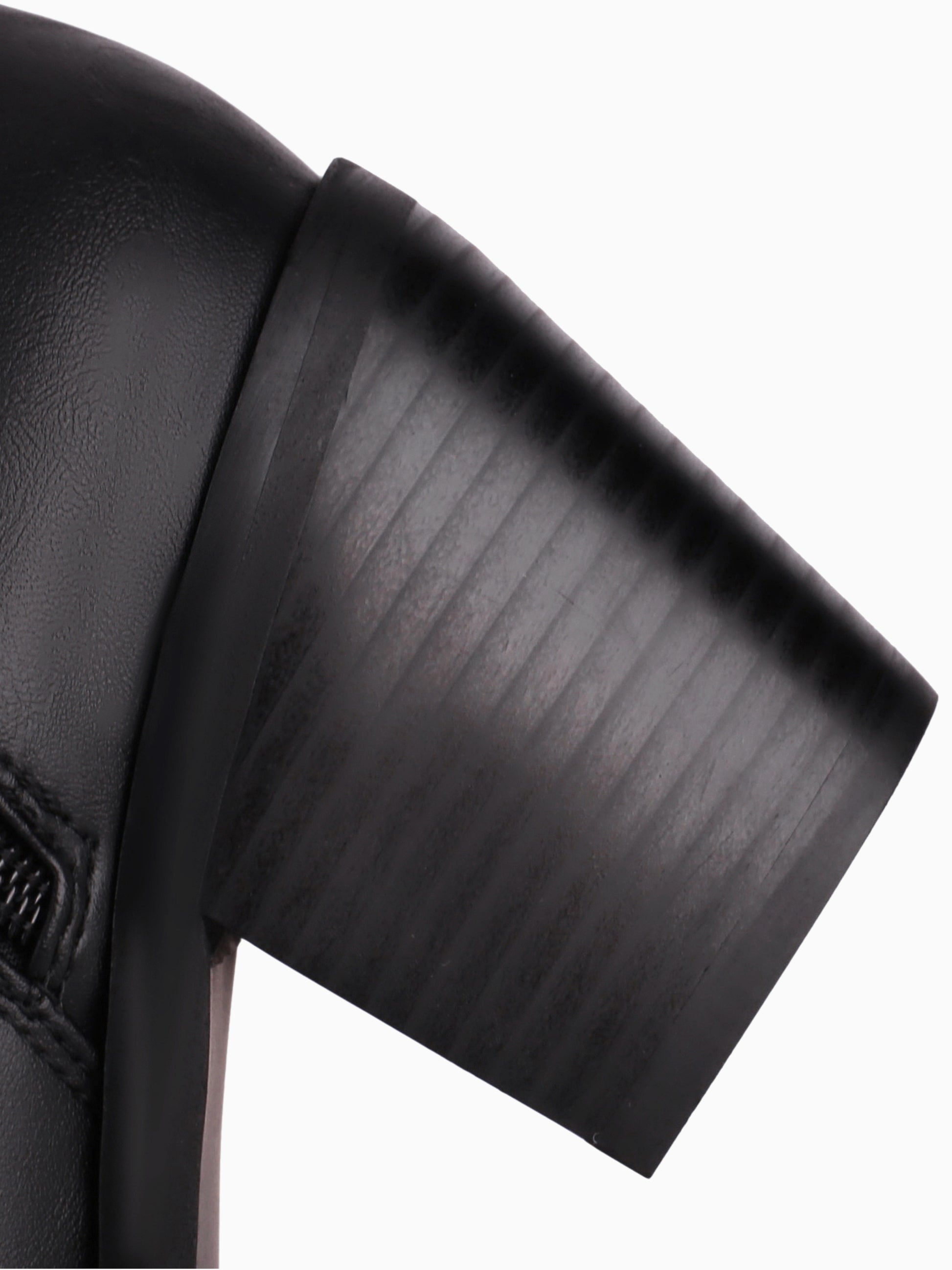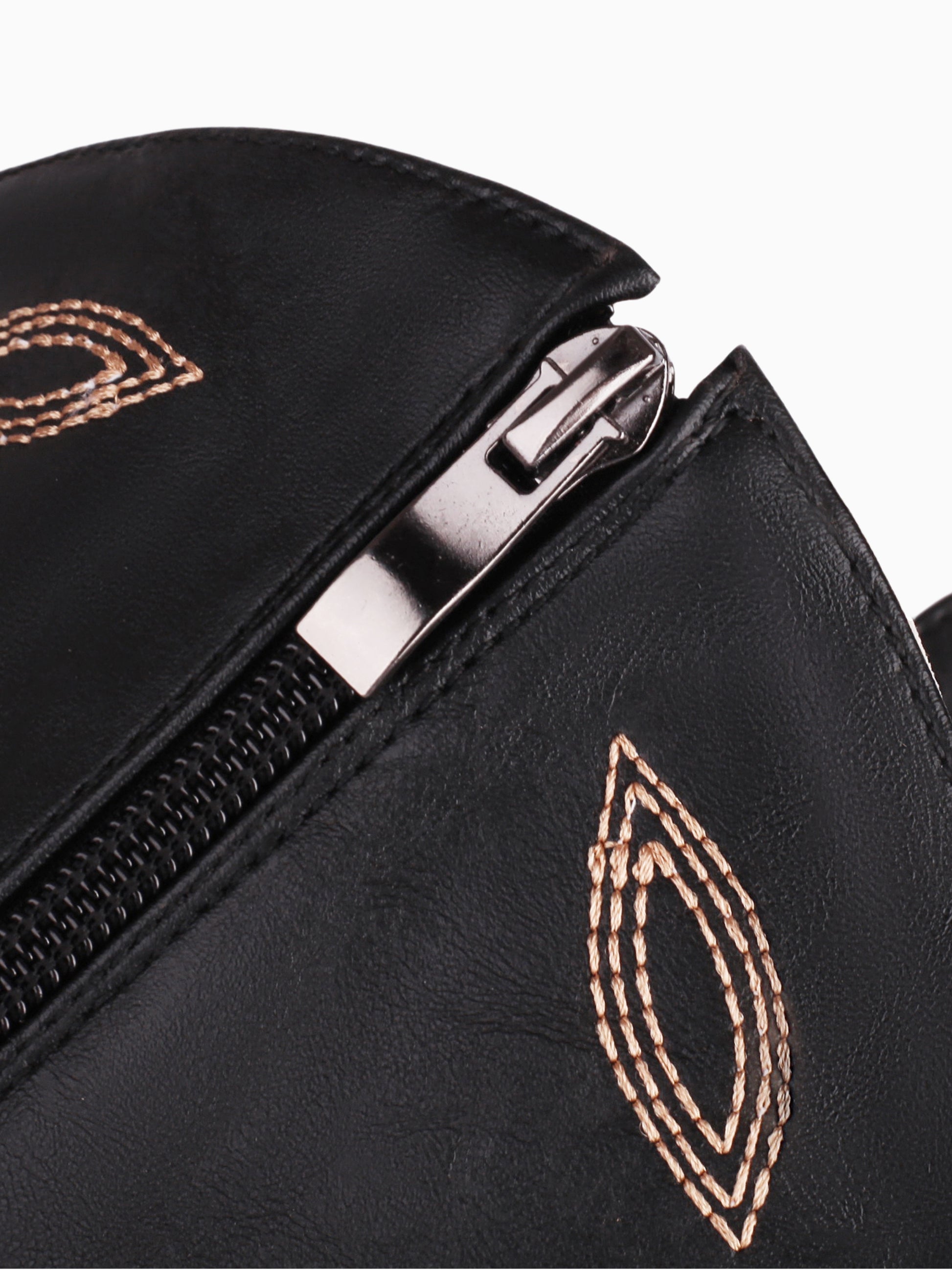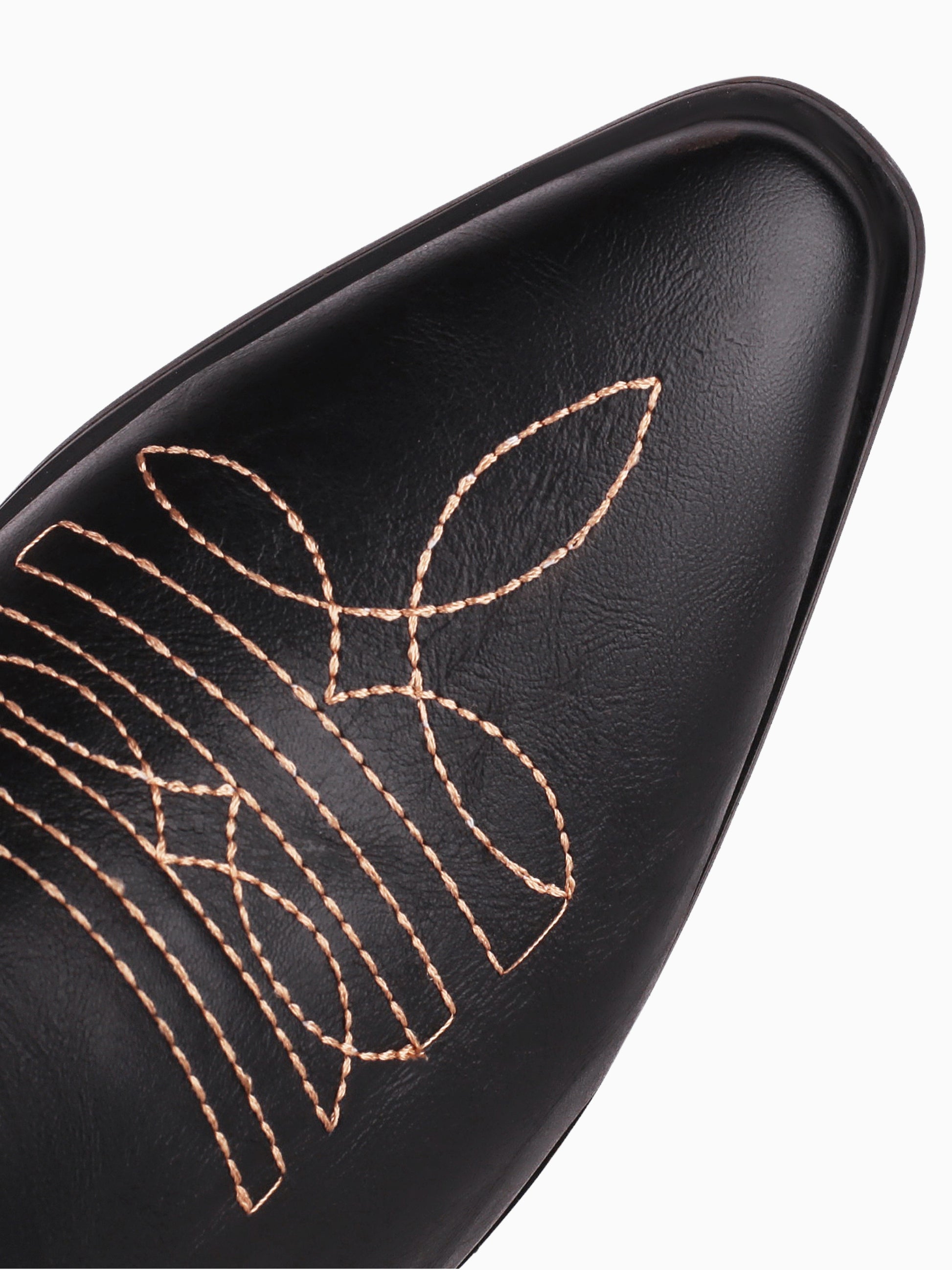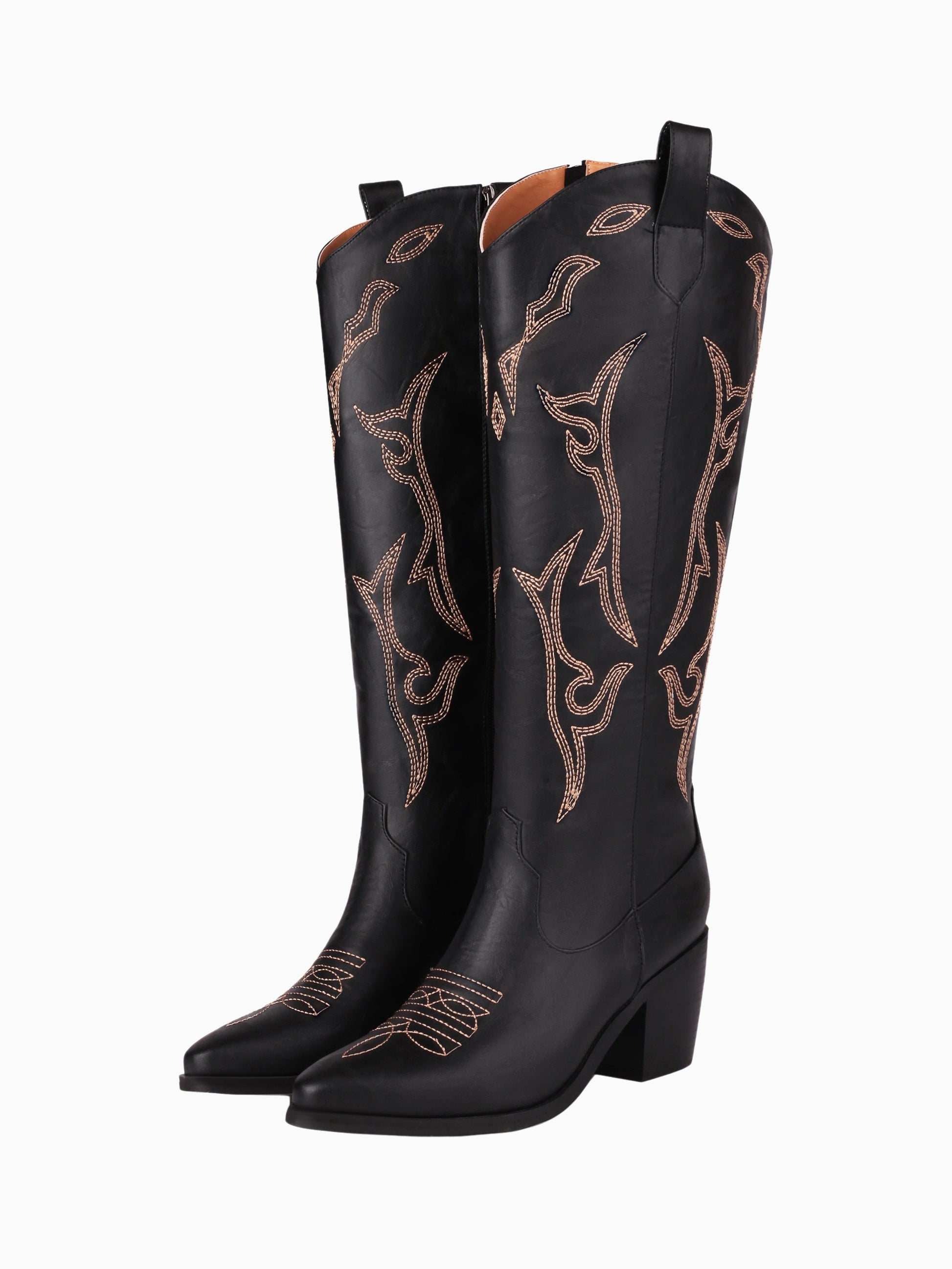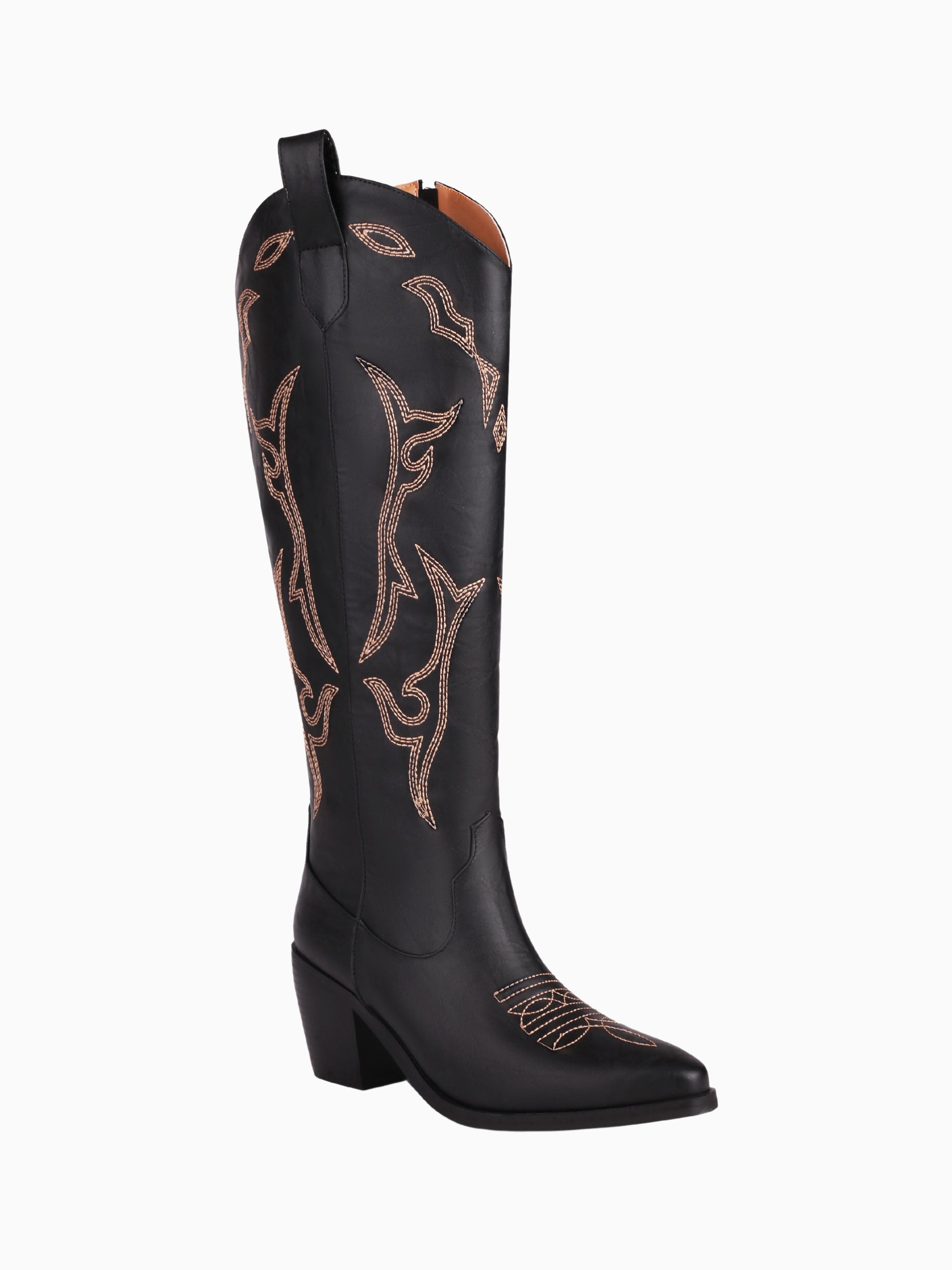 Modern knee-high cowgirl boots in black synthetic feature elegant copper-toned embroidery patterns and stacked heels for contemporary Western flair.