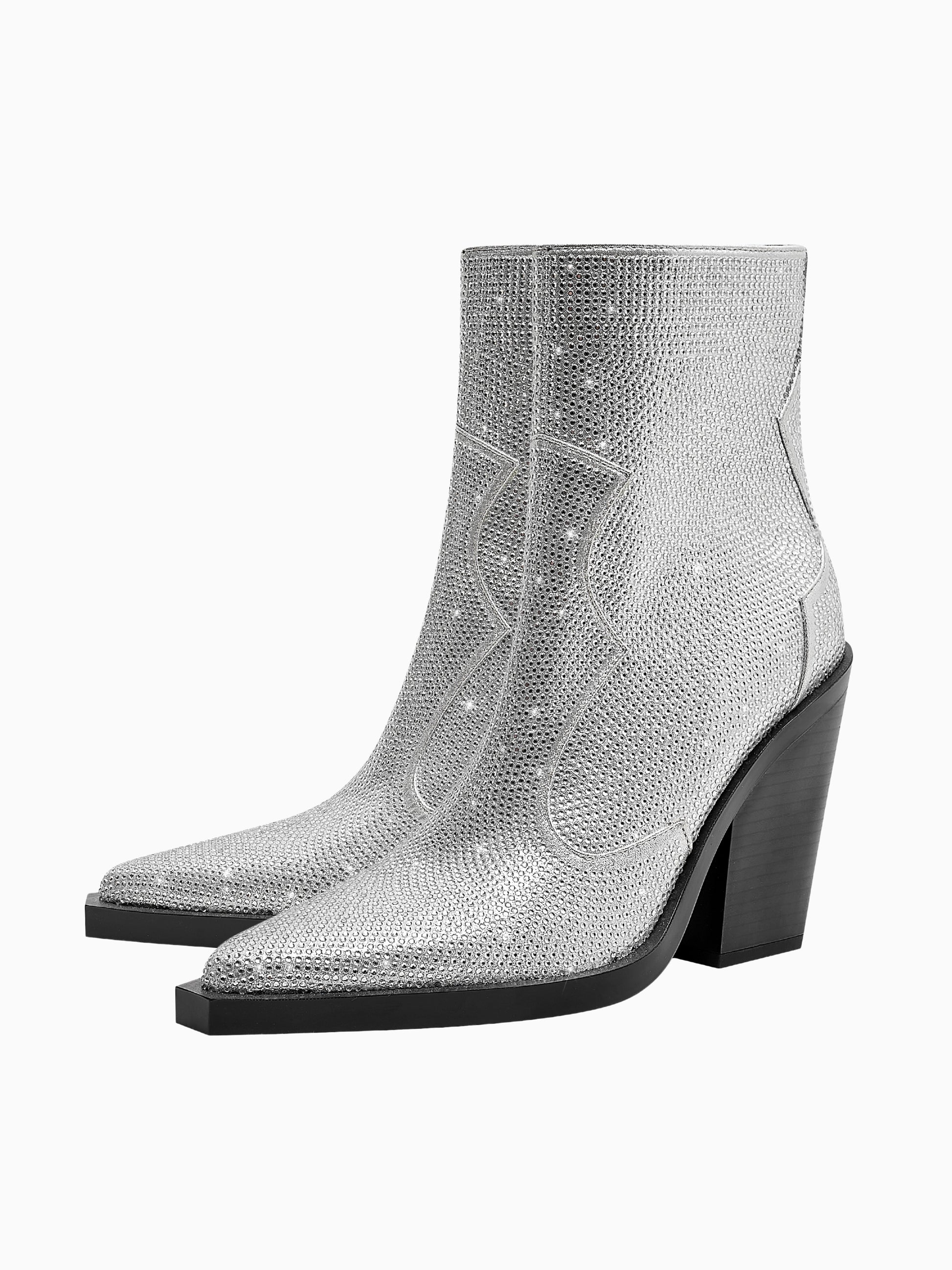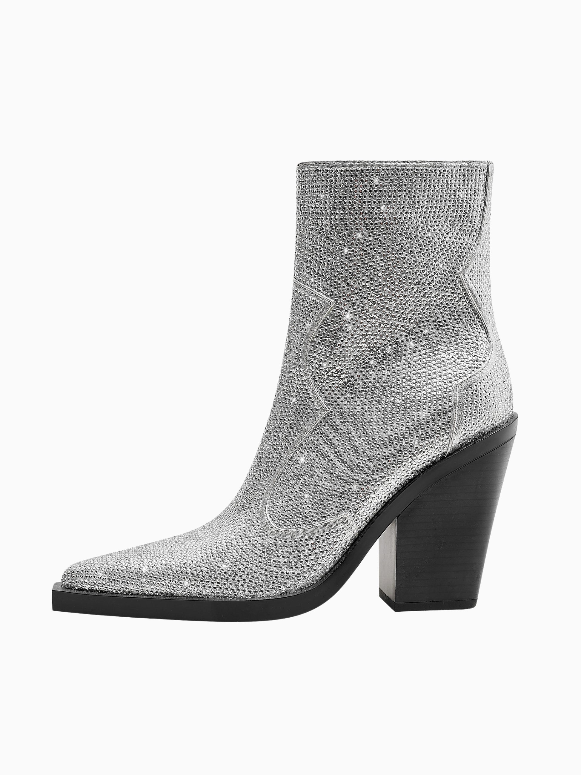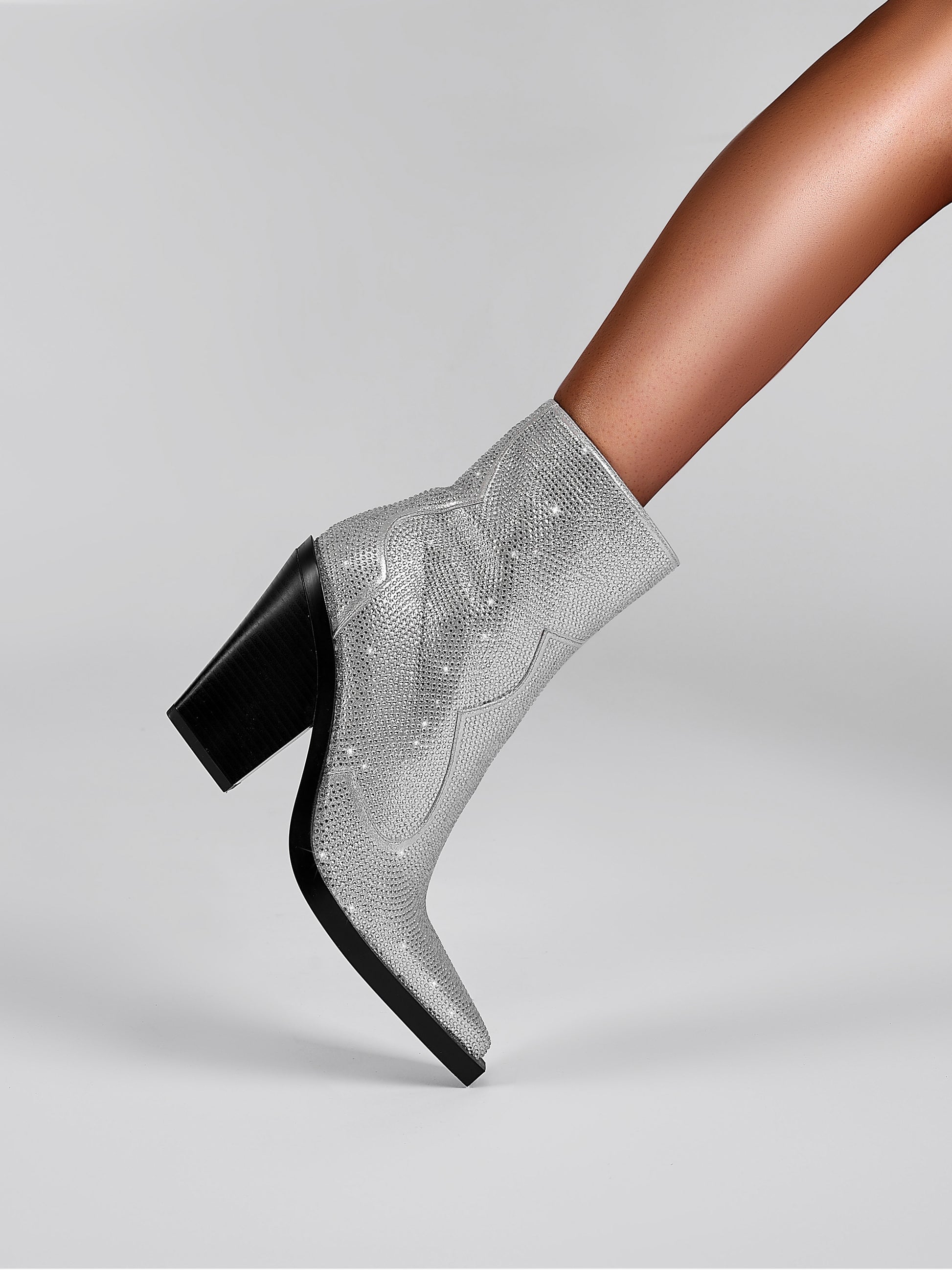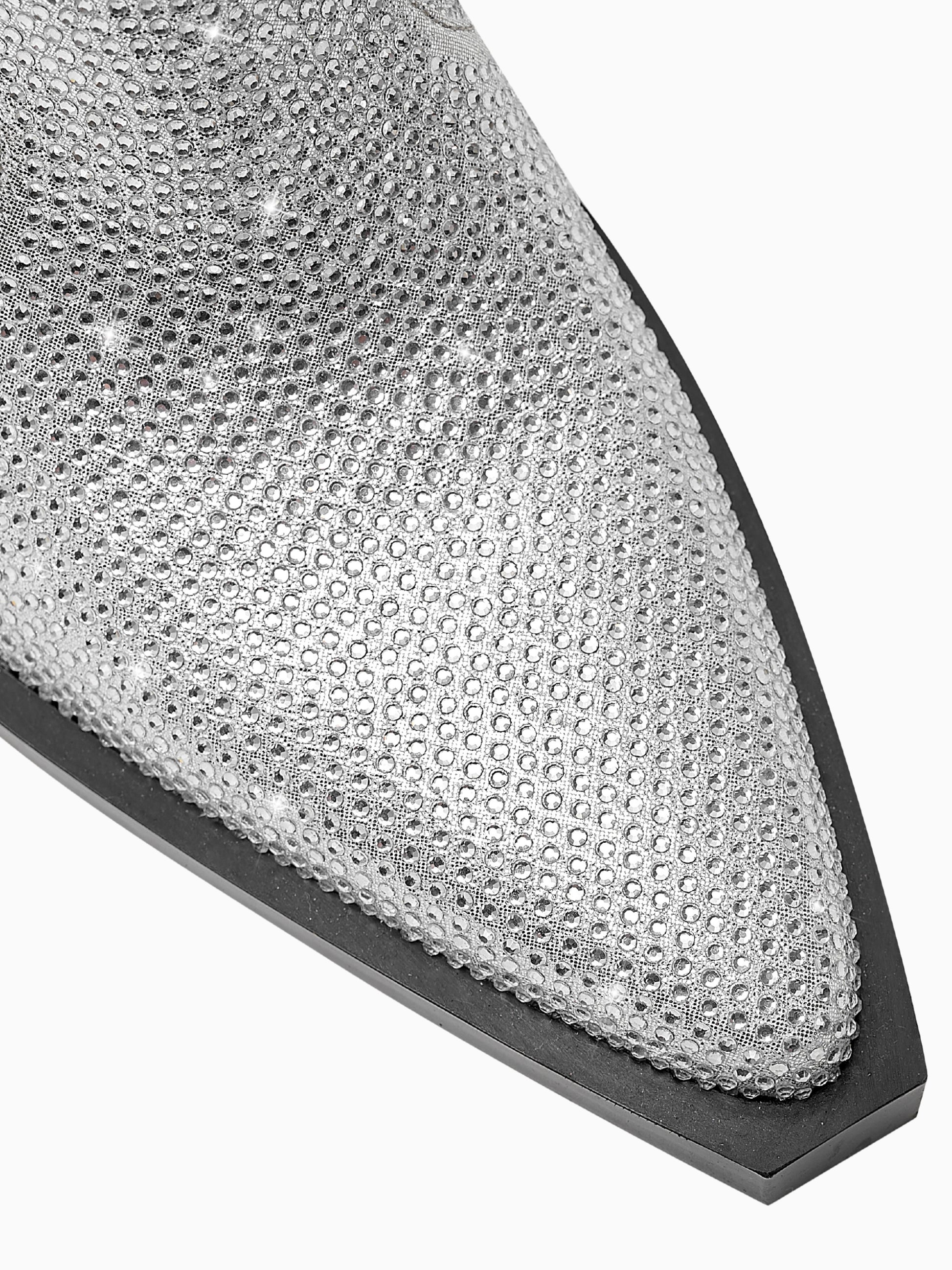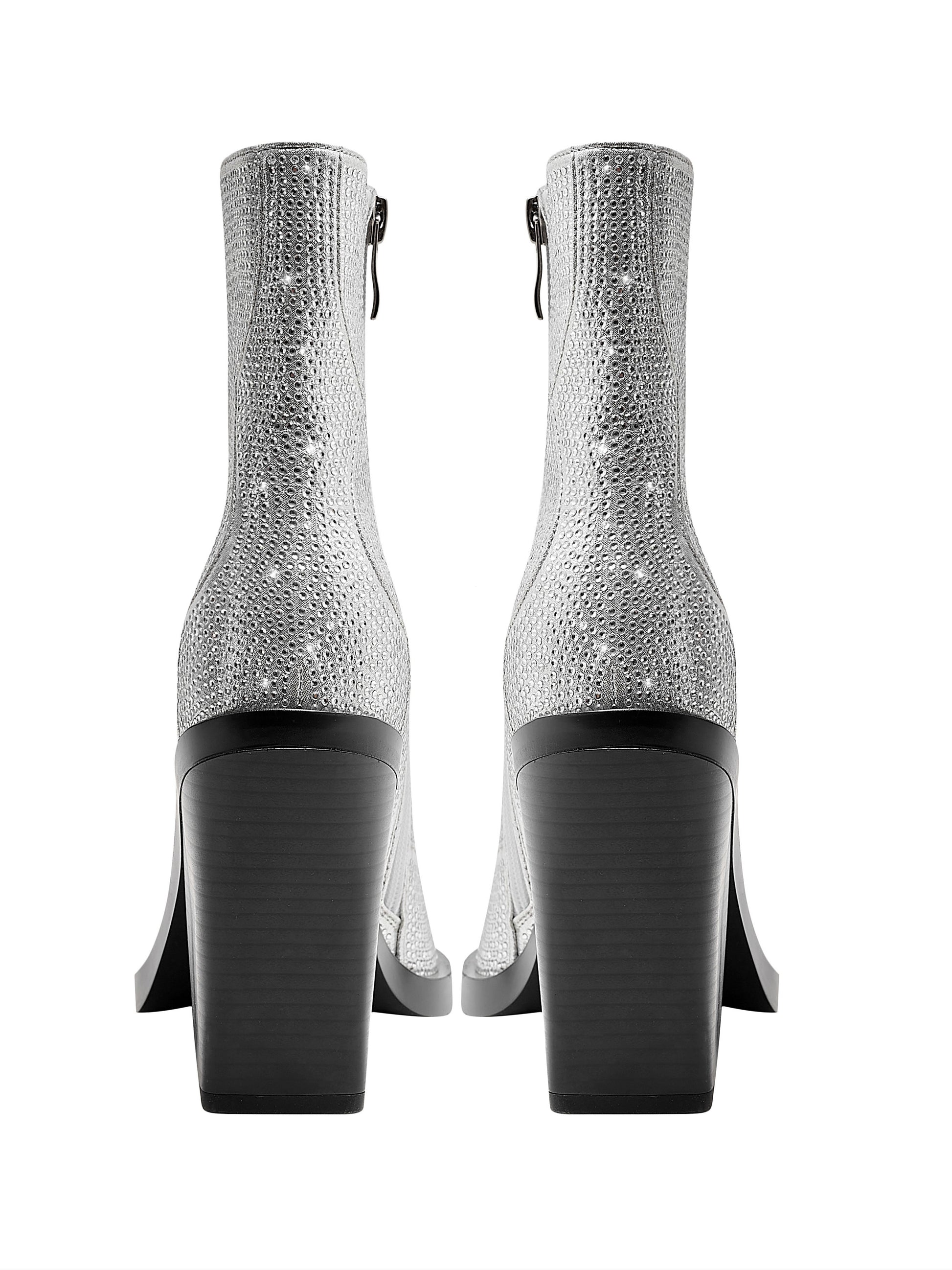 Glamorous rhinestone cowgirl ankle boots in metallic silver feature allover crystal mesh texture, pointed toe and chunky heel for dazzling style.