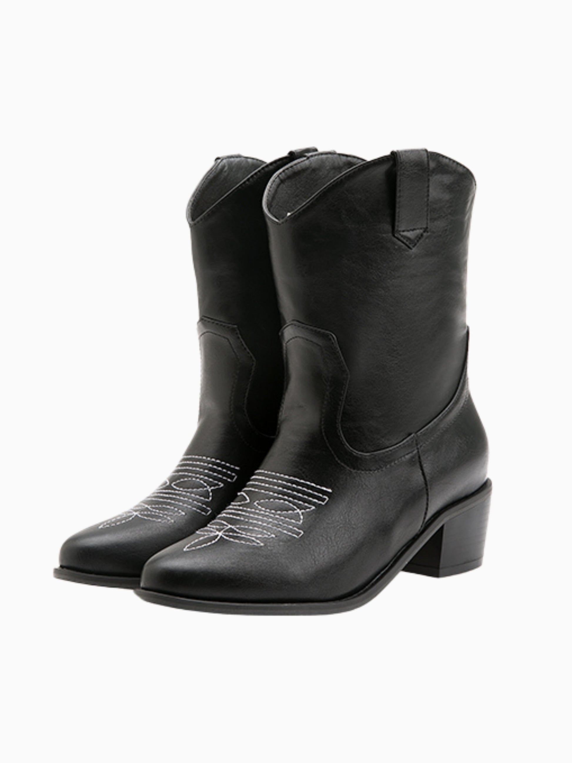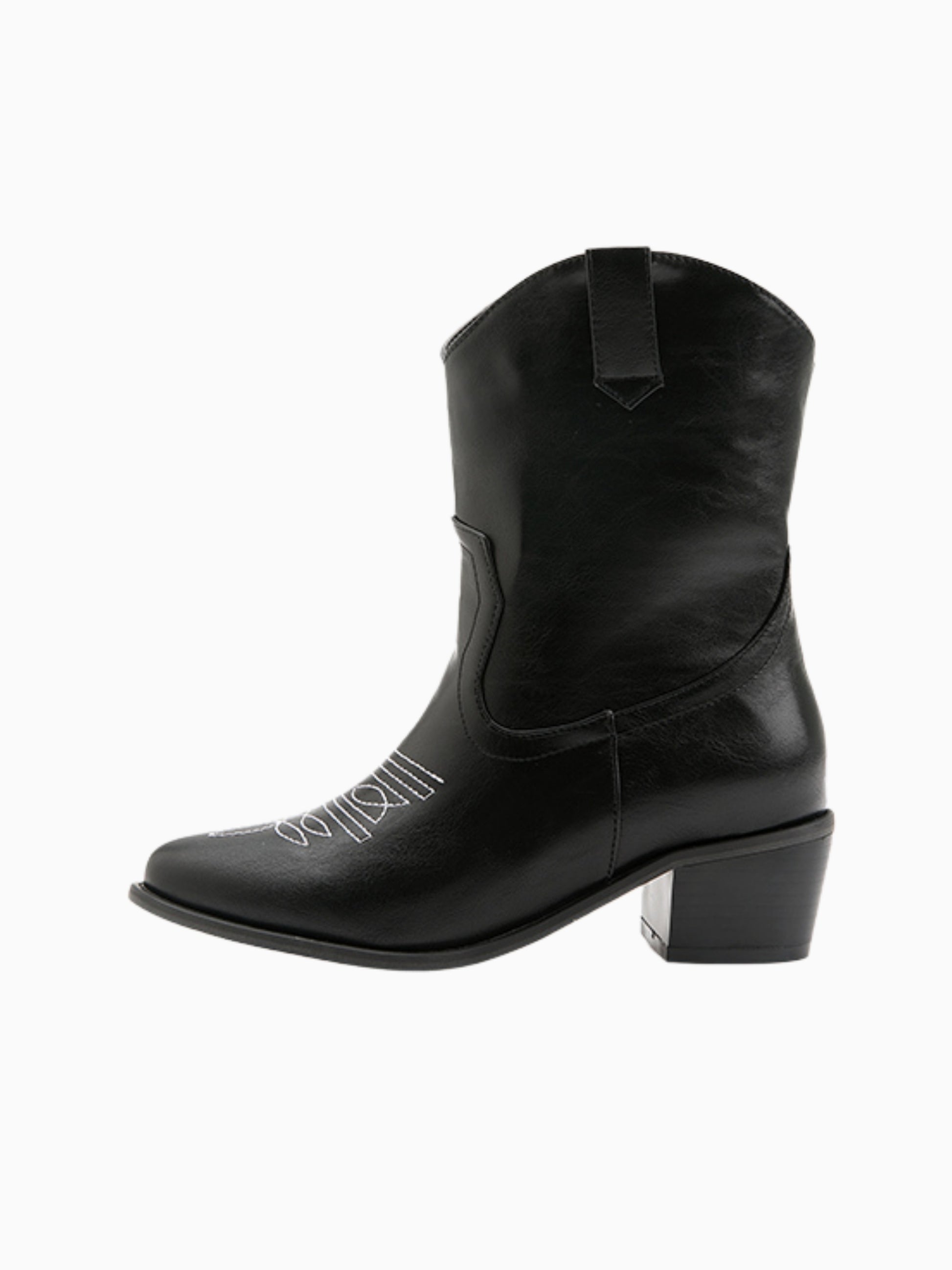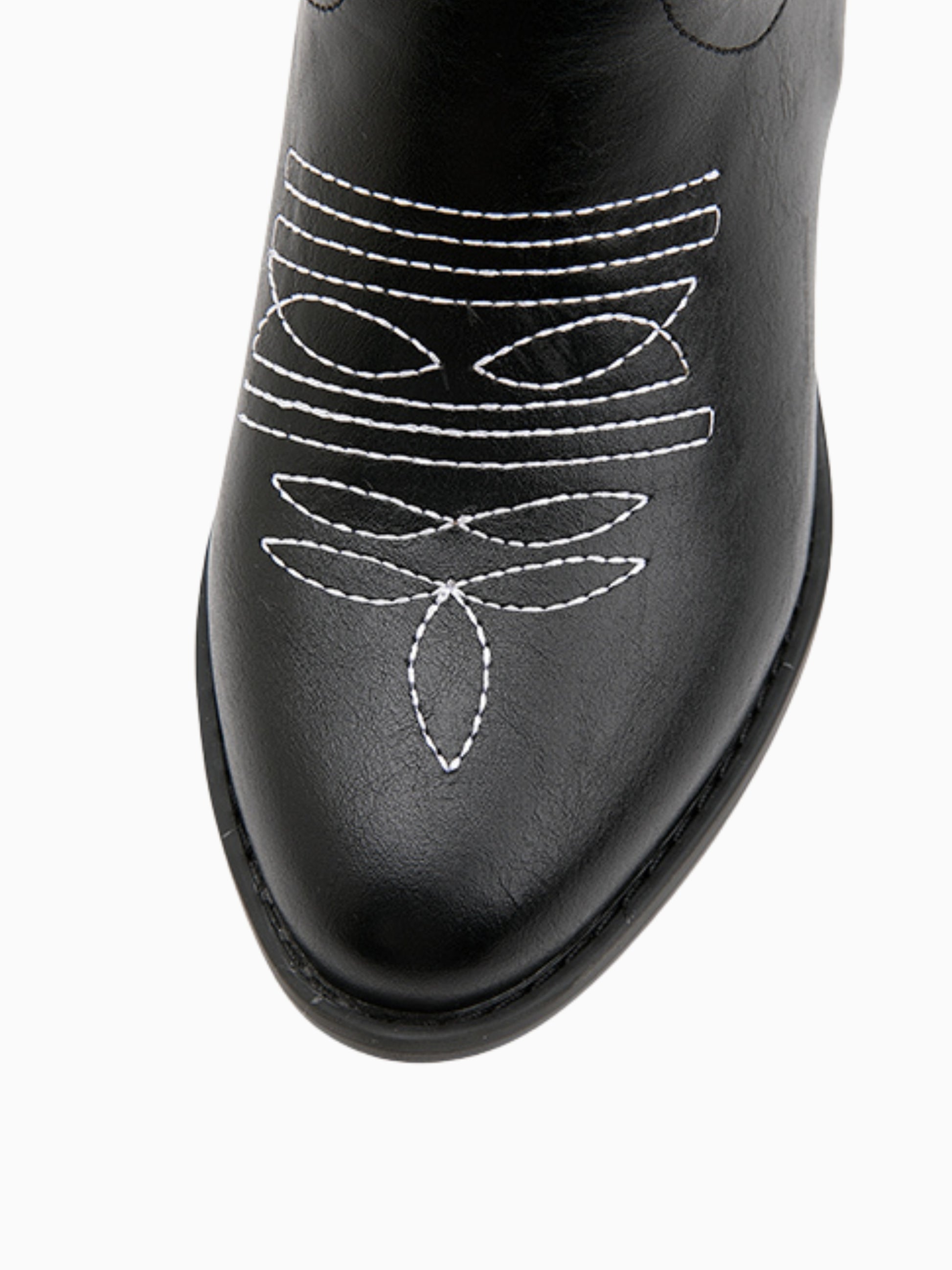 Sleek black ankle cowgirl boots featuring contrast white stitching and chunky heel, perfect for a modern urban-Western style.