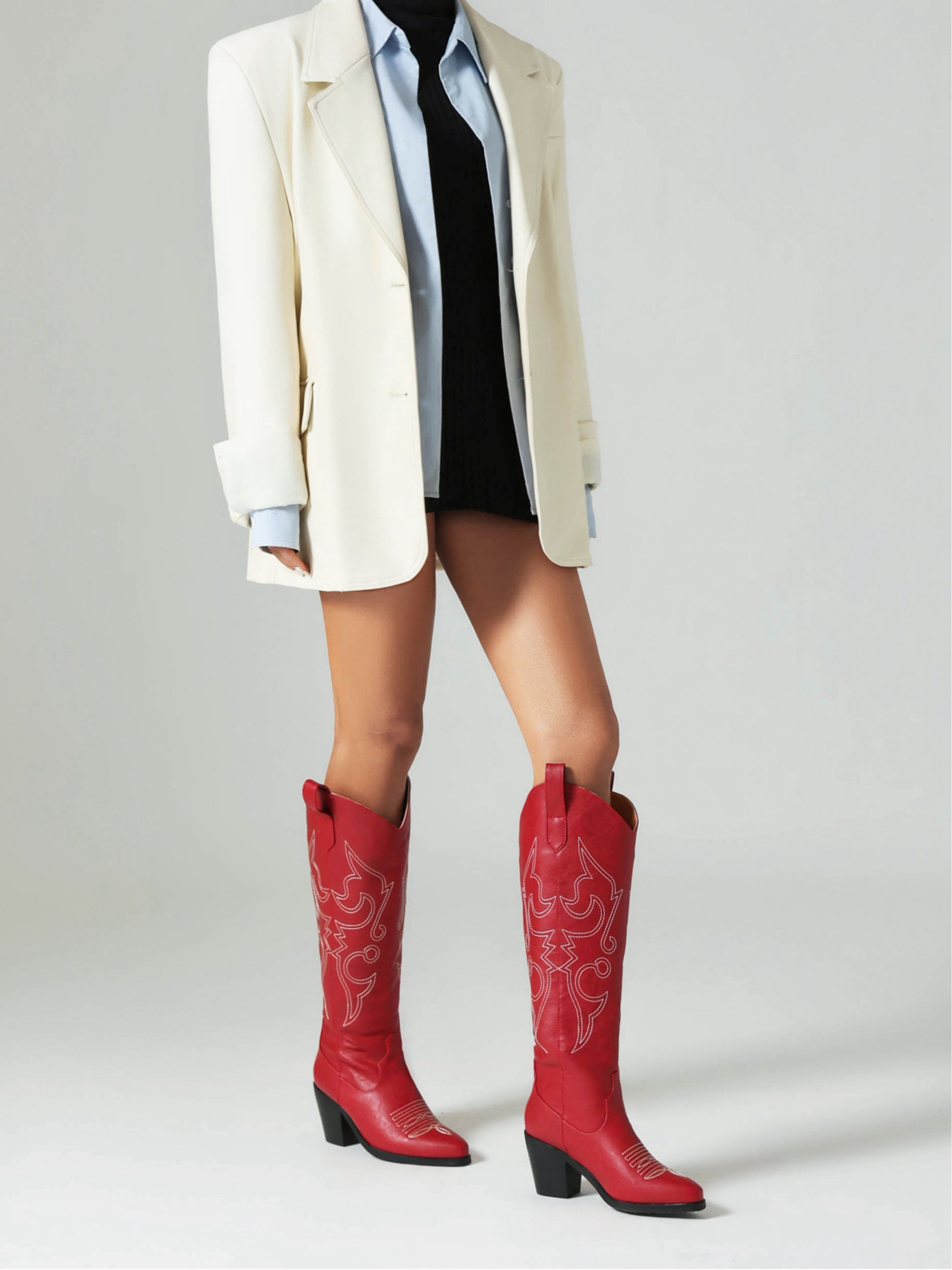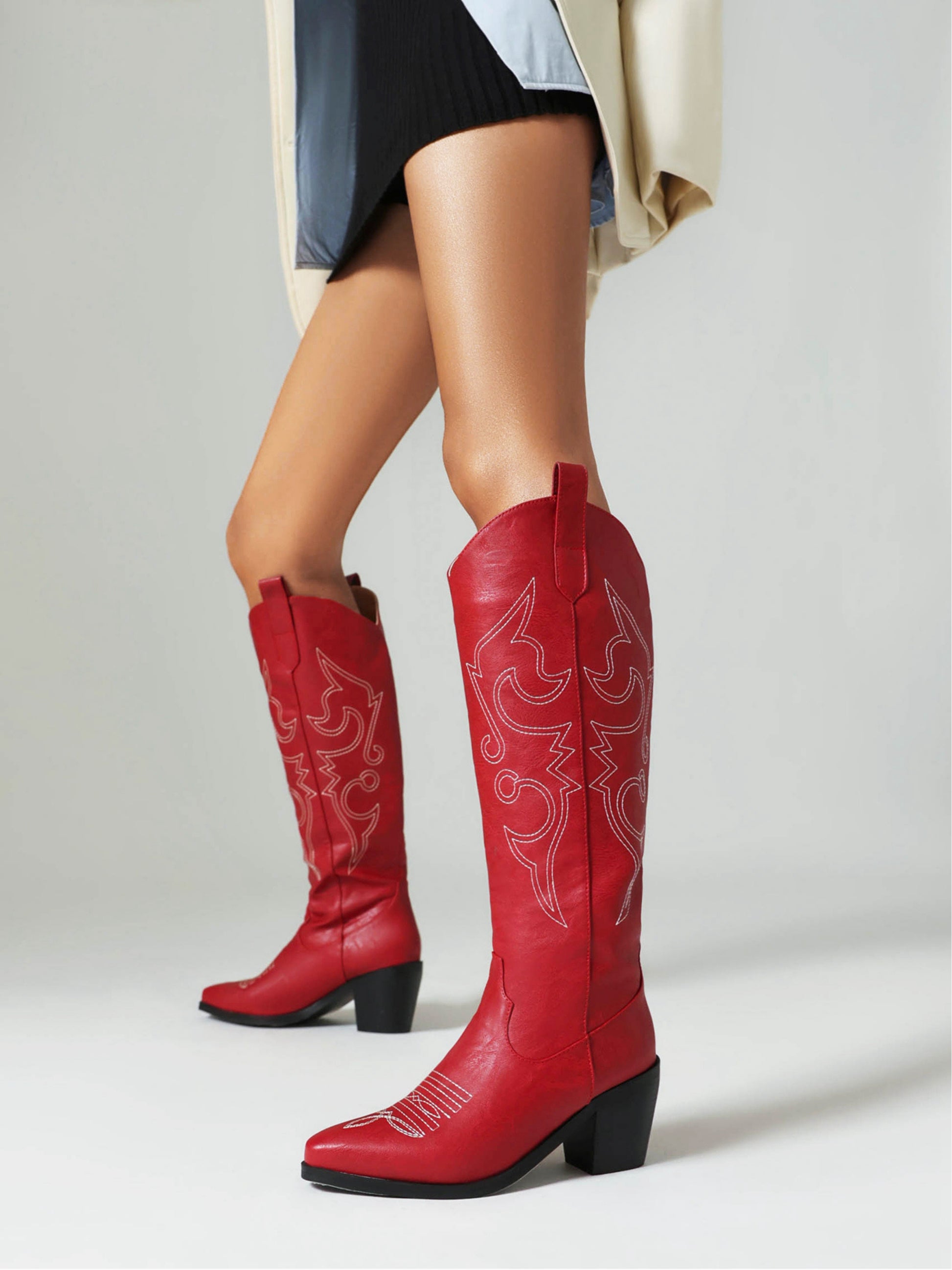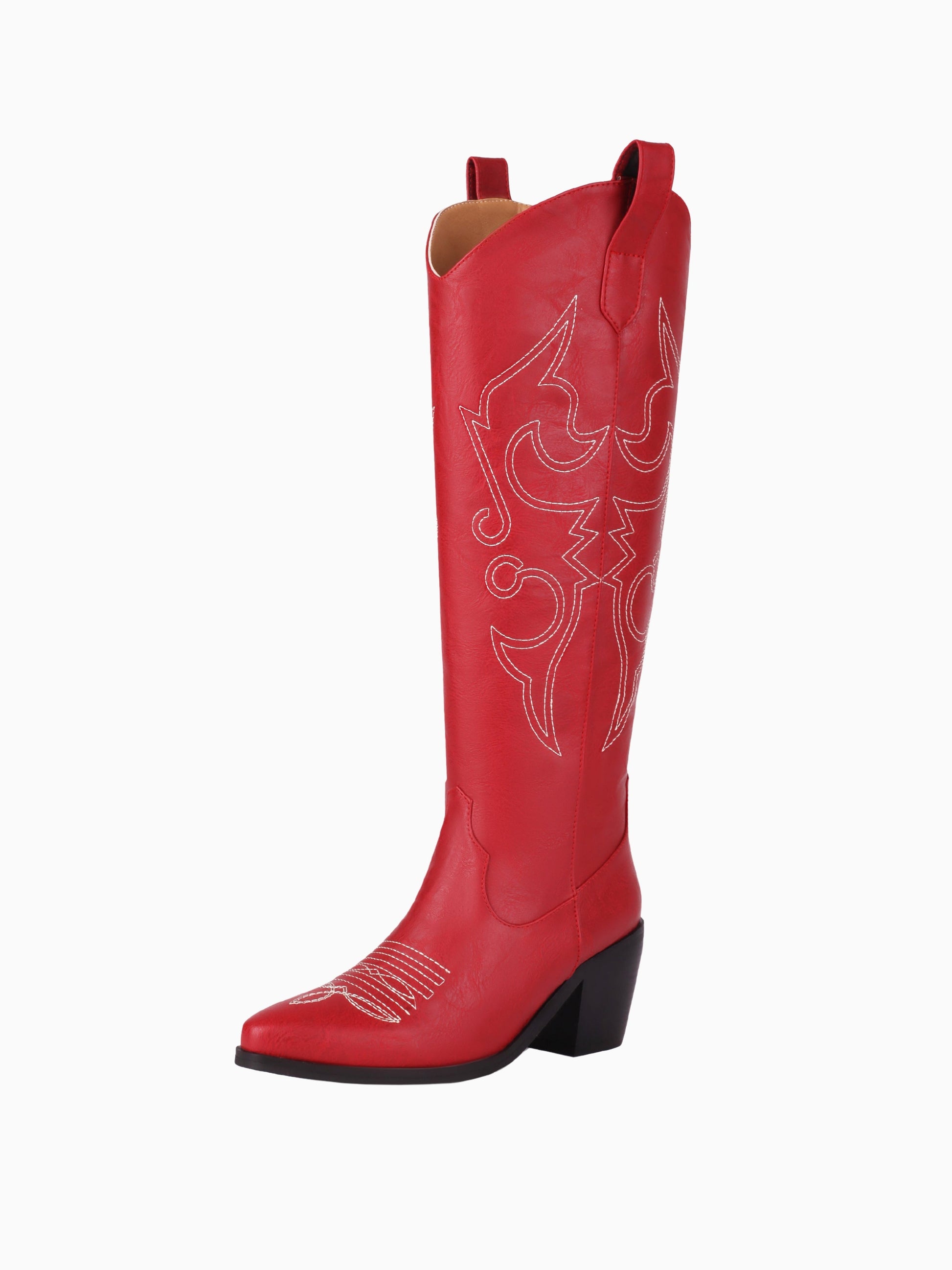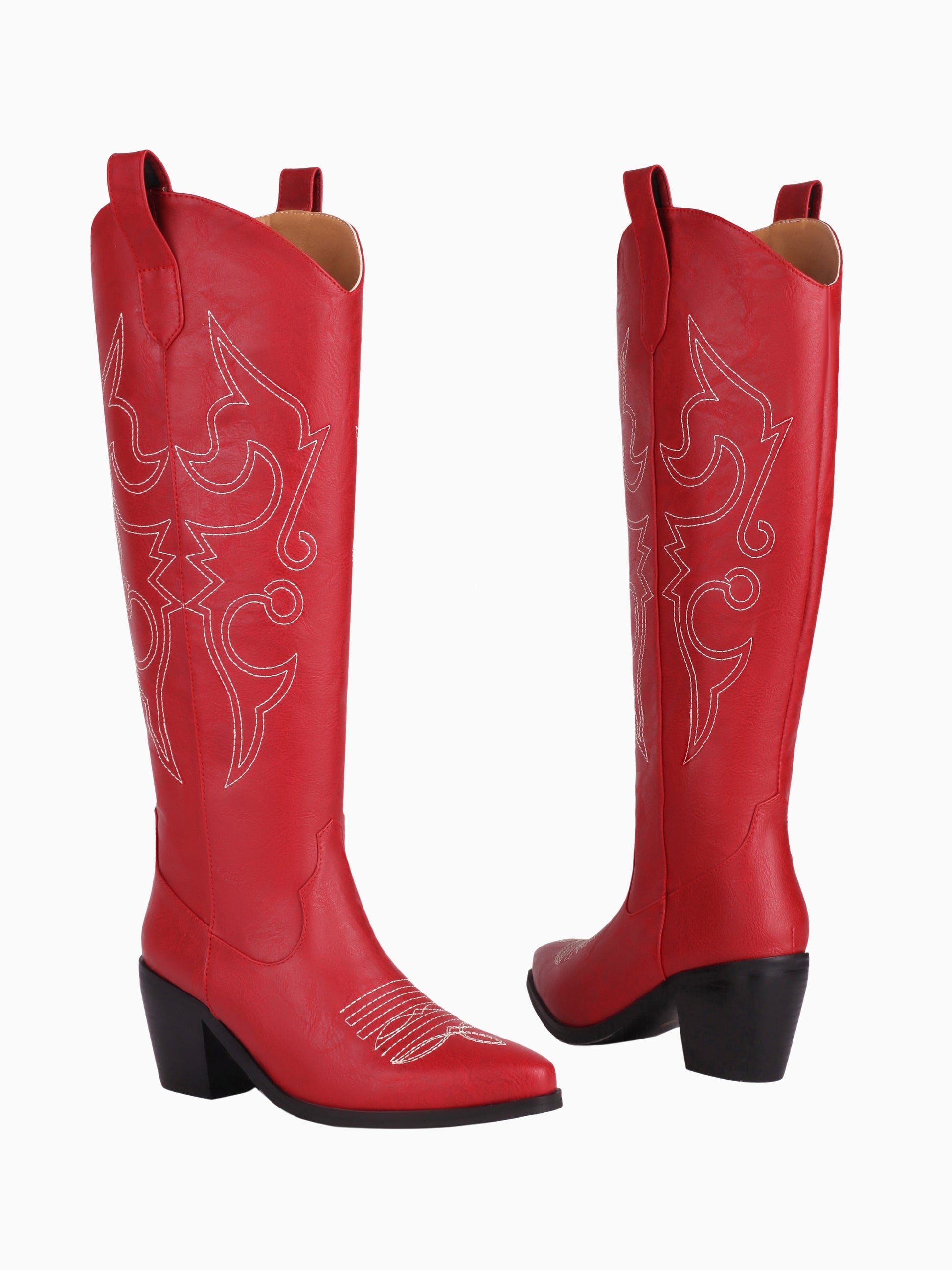 Modern knee-high cowgirl boots in vibrant red synthetic feature minimalist embroidered patterns, snip toe and stacked western heel for streamlined style.