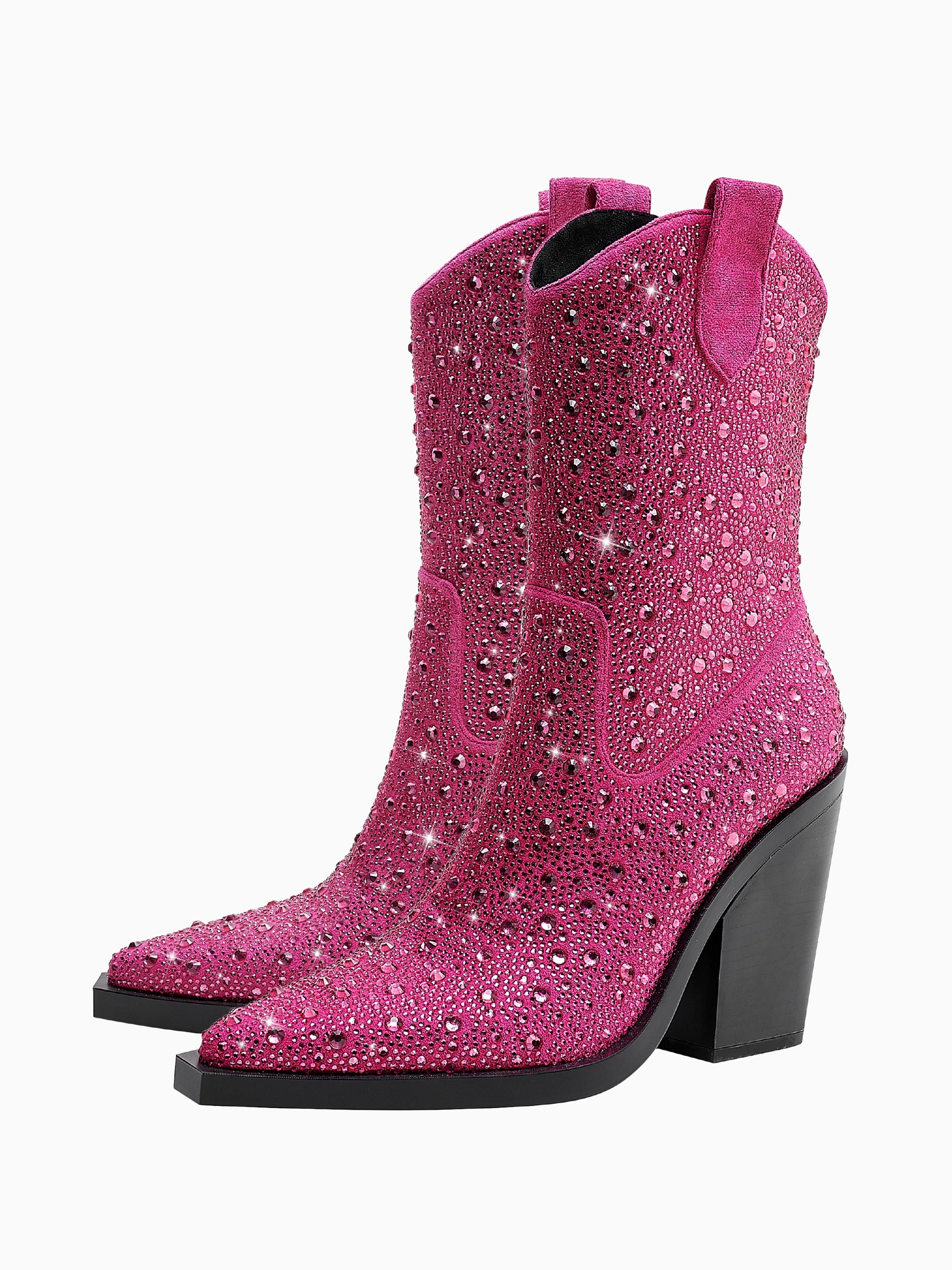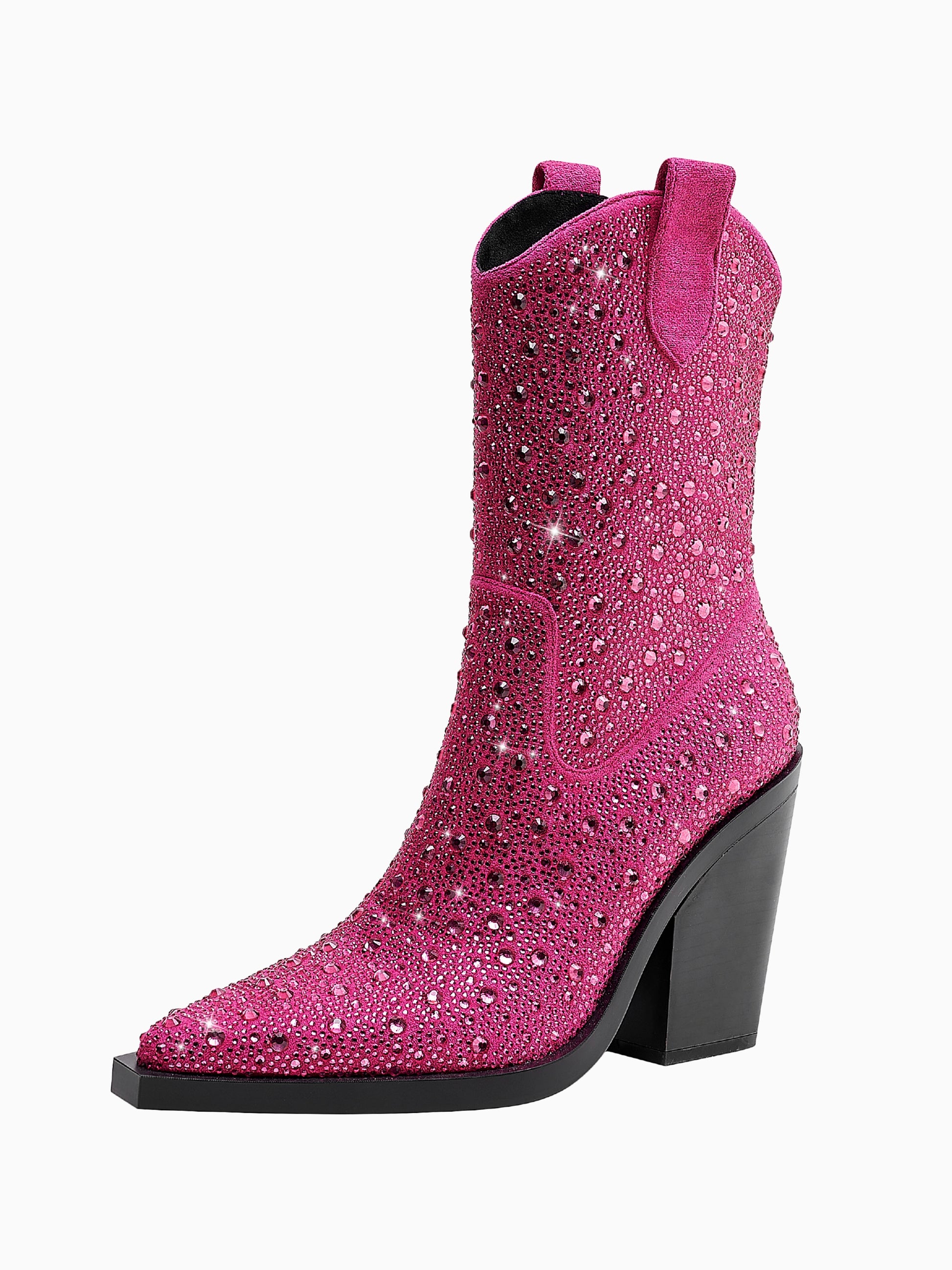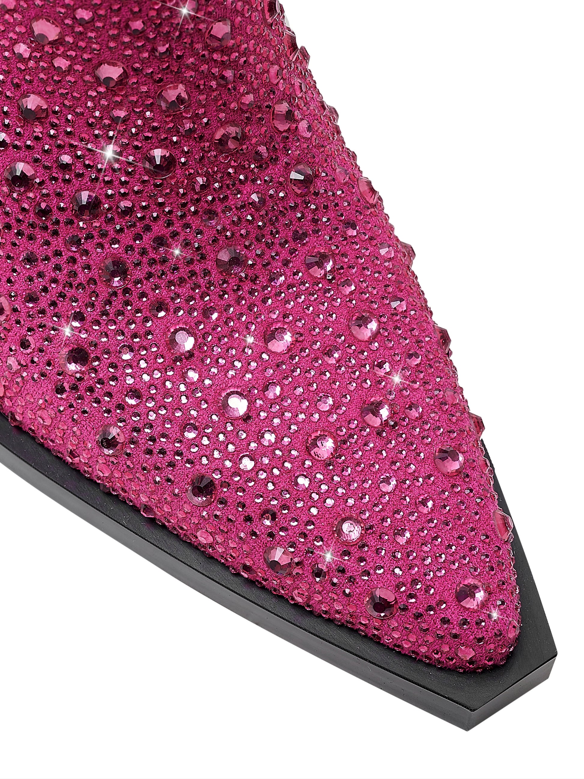 Glamorous rhinestone cowgirl ankle boots in vibrant pink feature allover crystal embellishments, pointed toe and block heel for dazzling style.