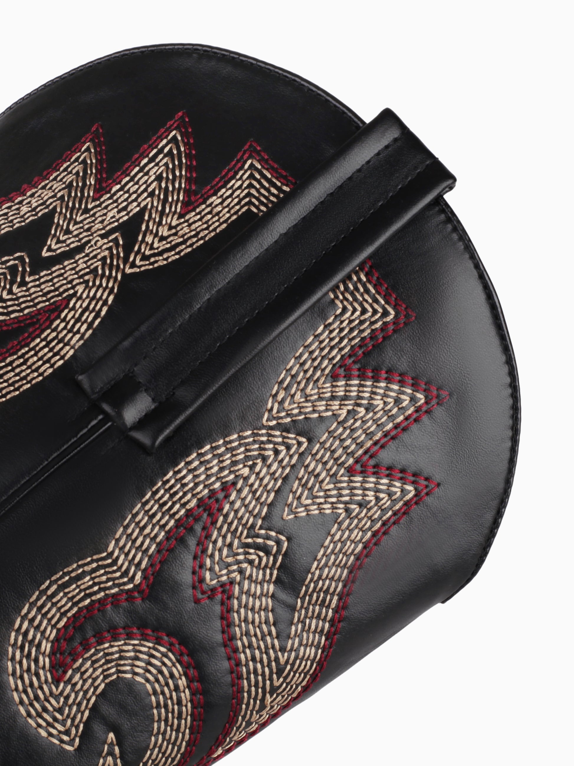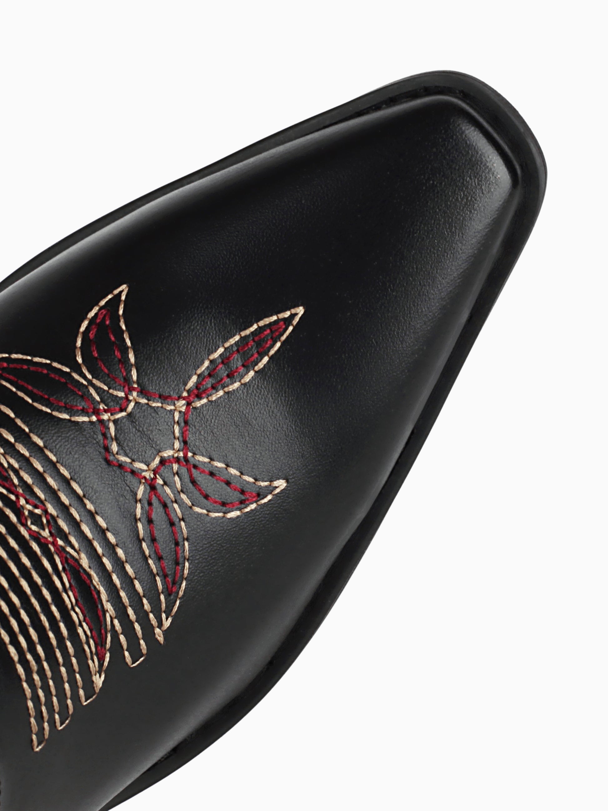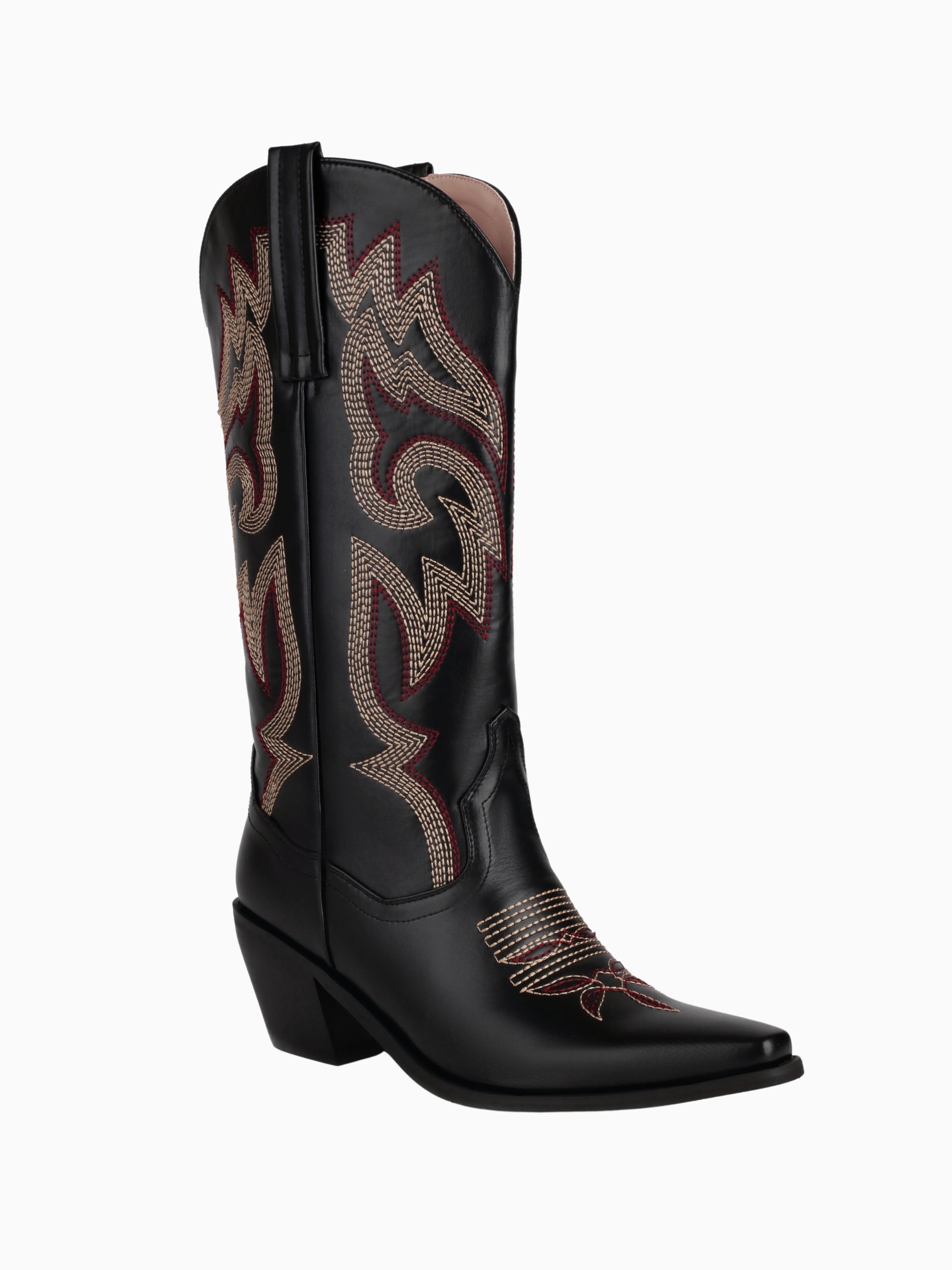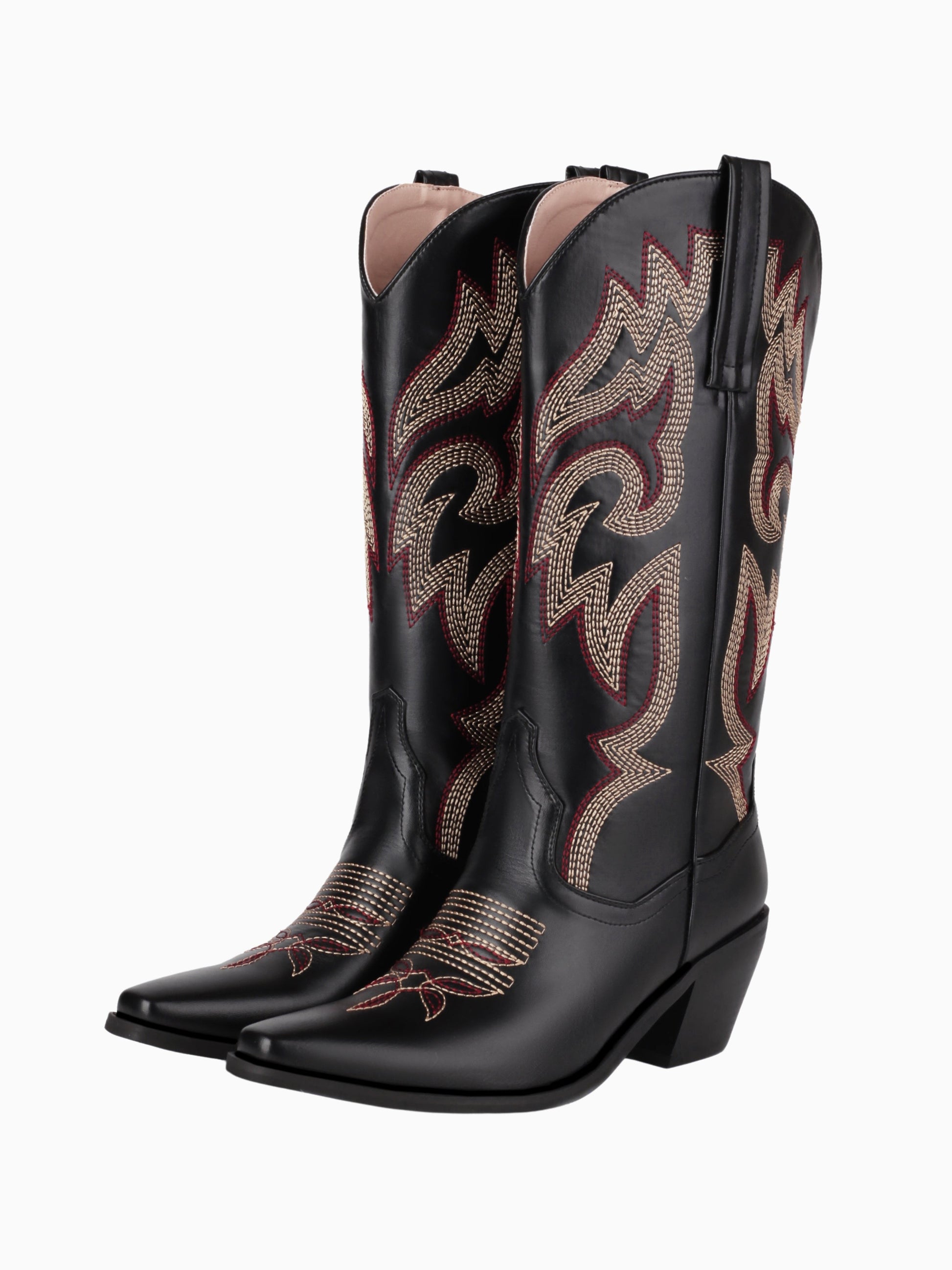 Sophisticated black cowgirl boots featuring intricate silver and burgundy tribal embroidery, designed with a sleek pointed toe for modern Western elegance.