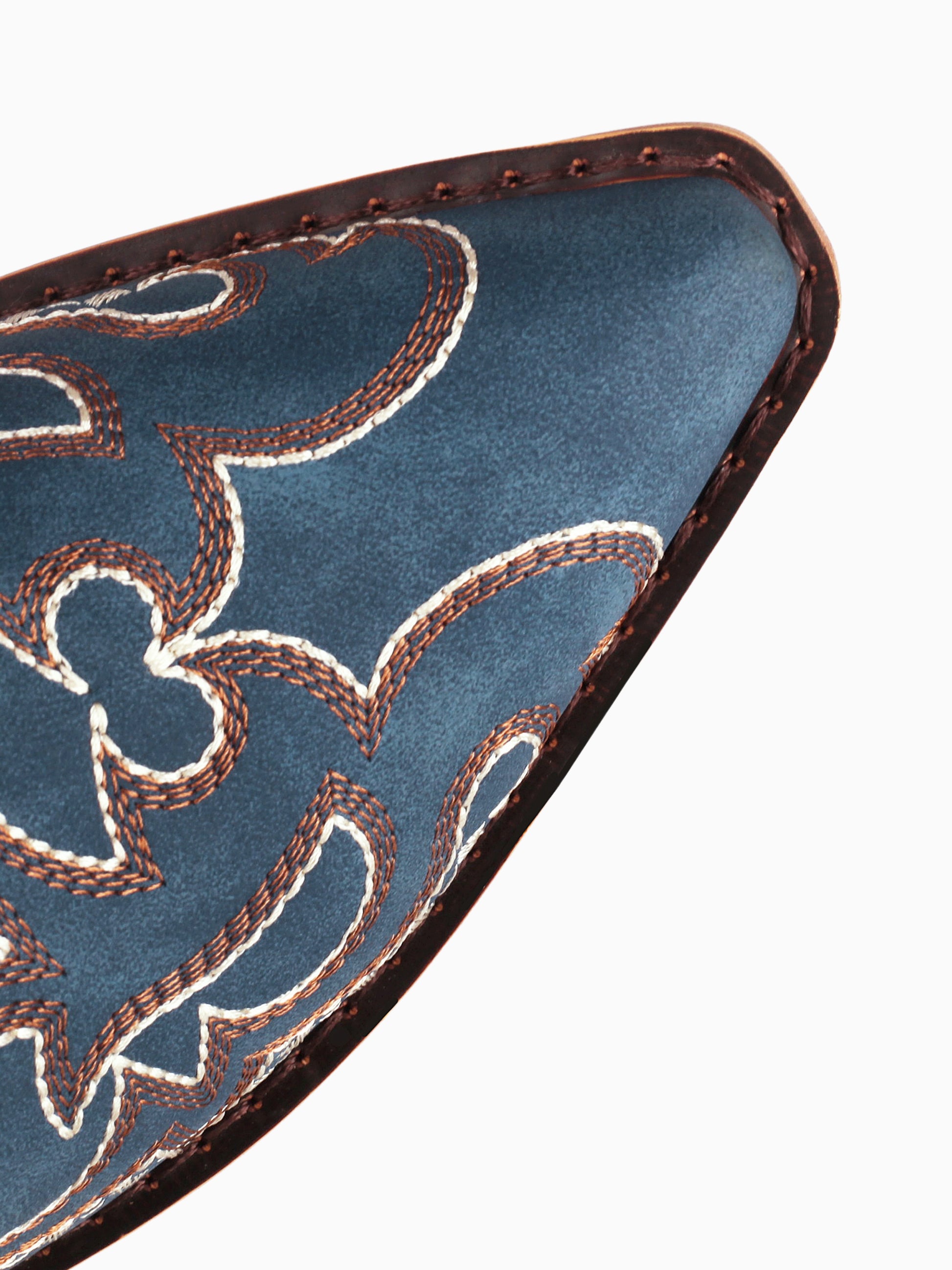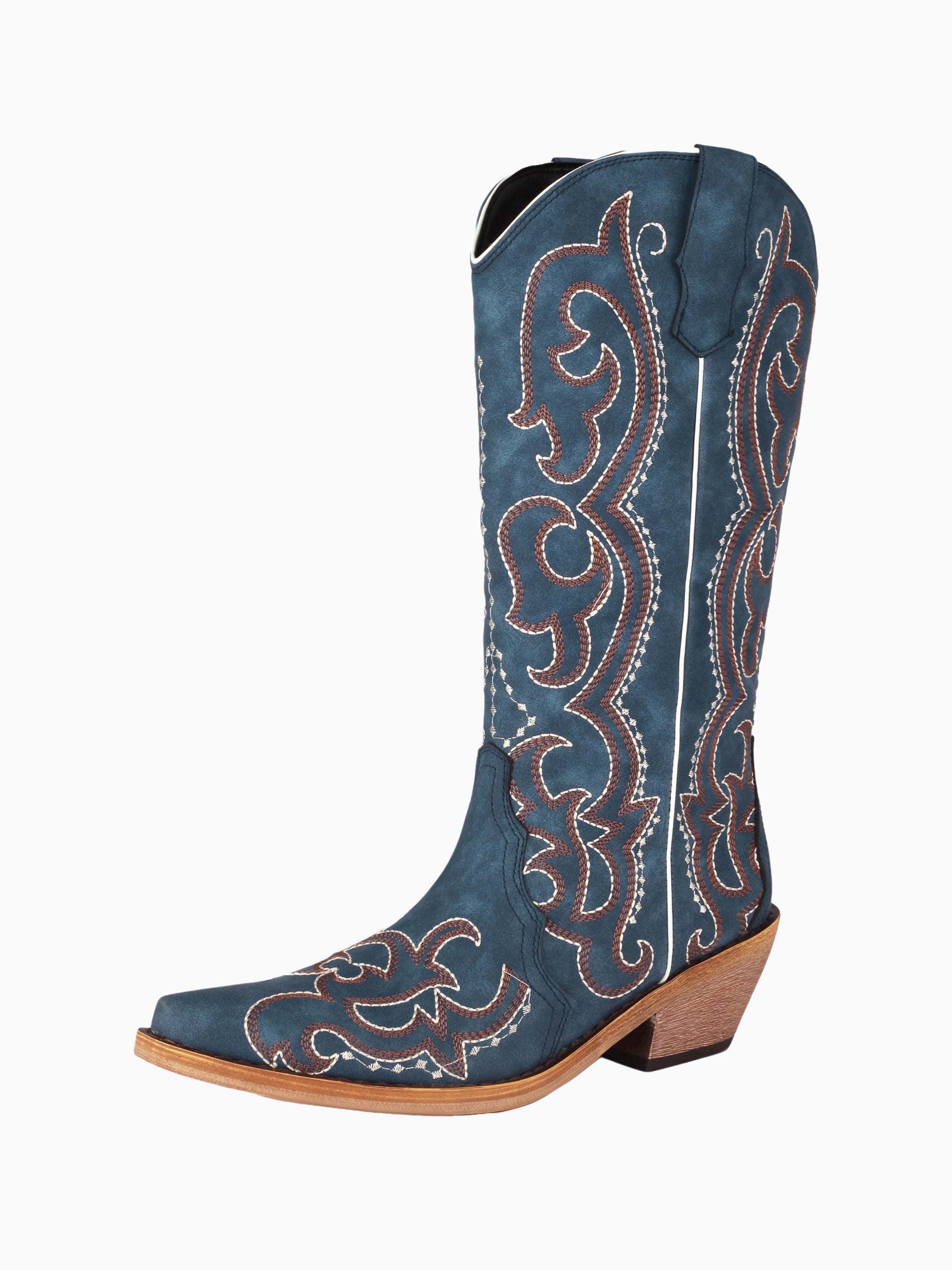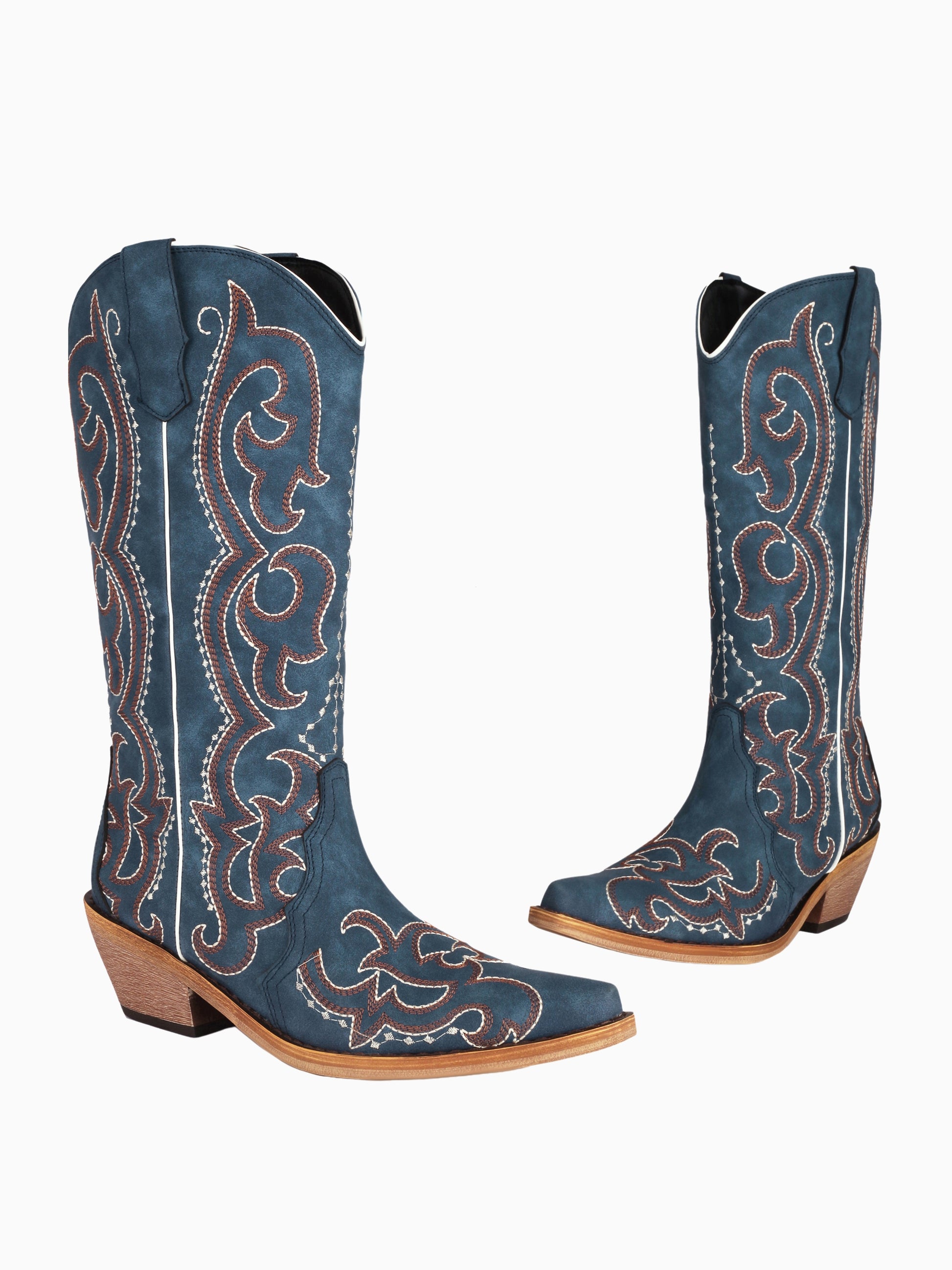 Mid-calf cowgirl boots featuring elegant baroque-style embroidery in brown and white on navy blue material, adorned with classic pointed toe.