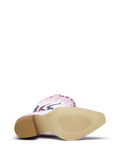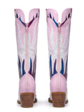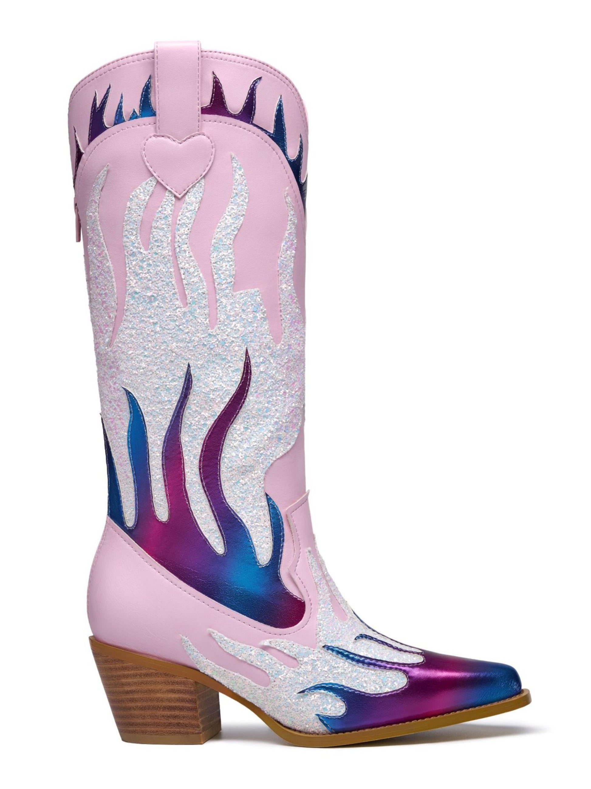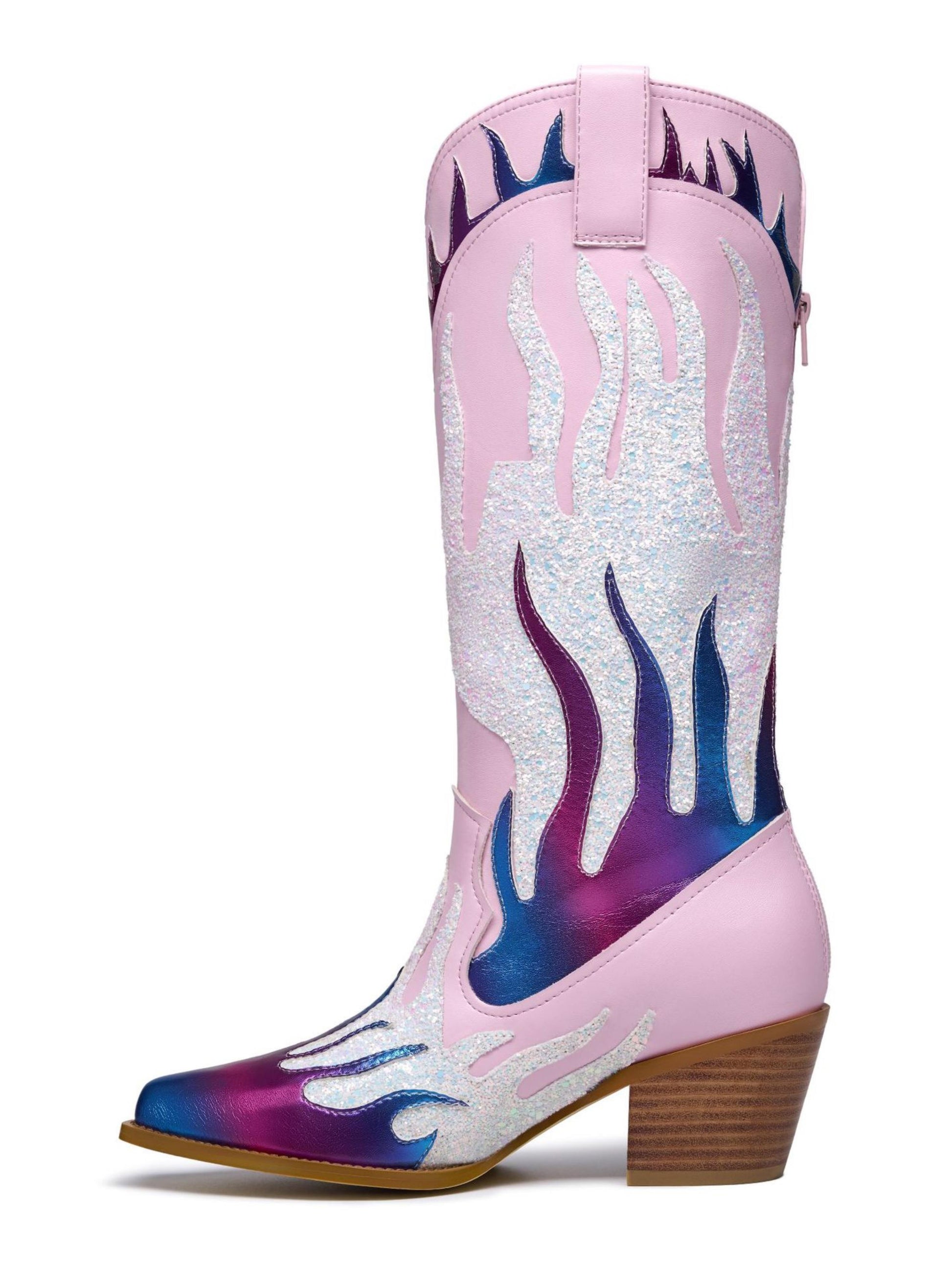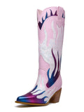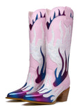 Flame Knee-High Heel Pink Cowgirl Boots with Zip feature a white, purple, and blue layered flame, side heart patchwork design, and a fashion block mid-heel.