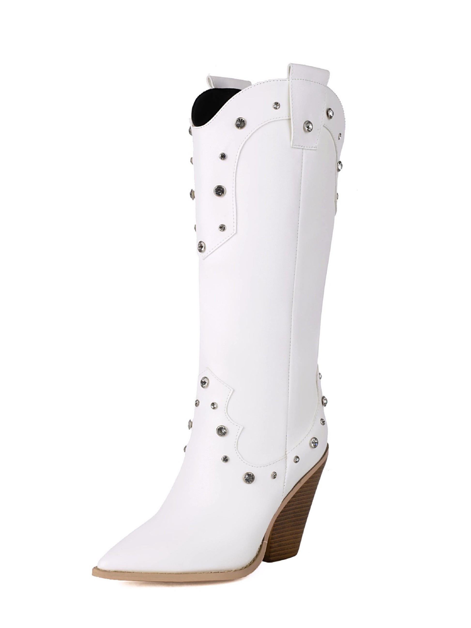 Pointed Studded White Heeled Cowgirl Boots feature a western style, rhinestone studds, mid-calf length, and comfortable block high-heel design.