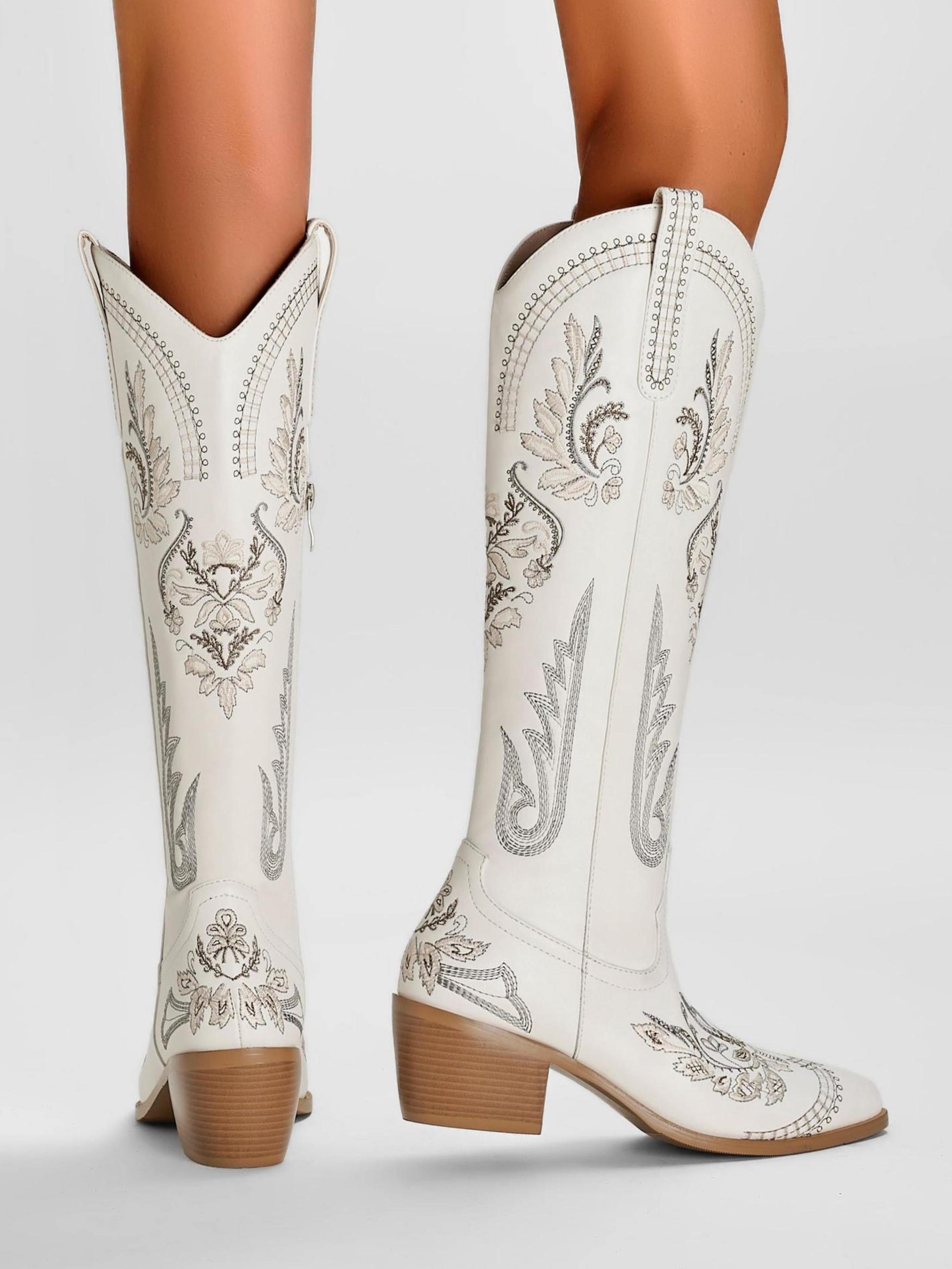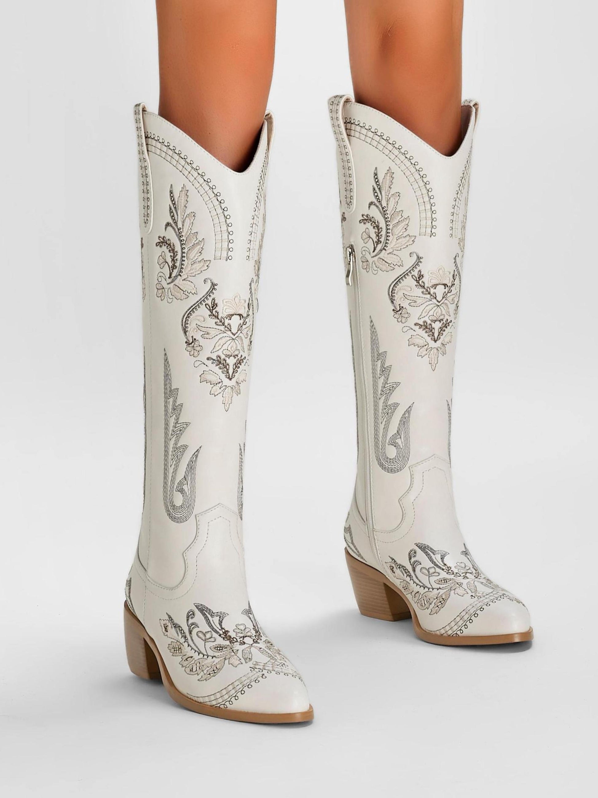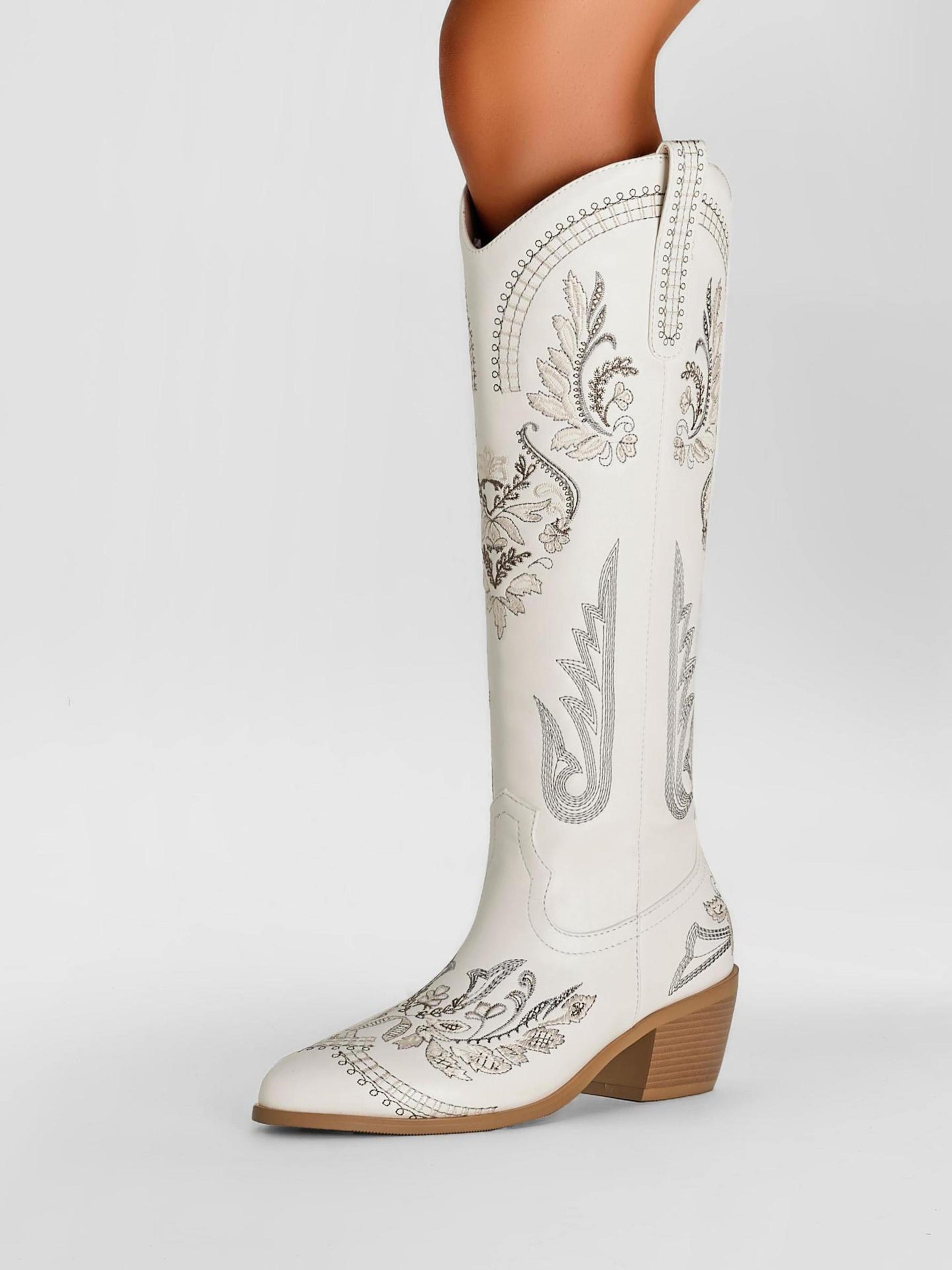 Pointed Toe Embroidered Floral White Cowgirl Boots feature a comfy low-heel, knee-high length, and a pointed toe.