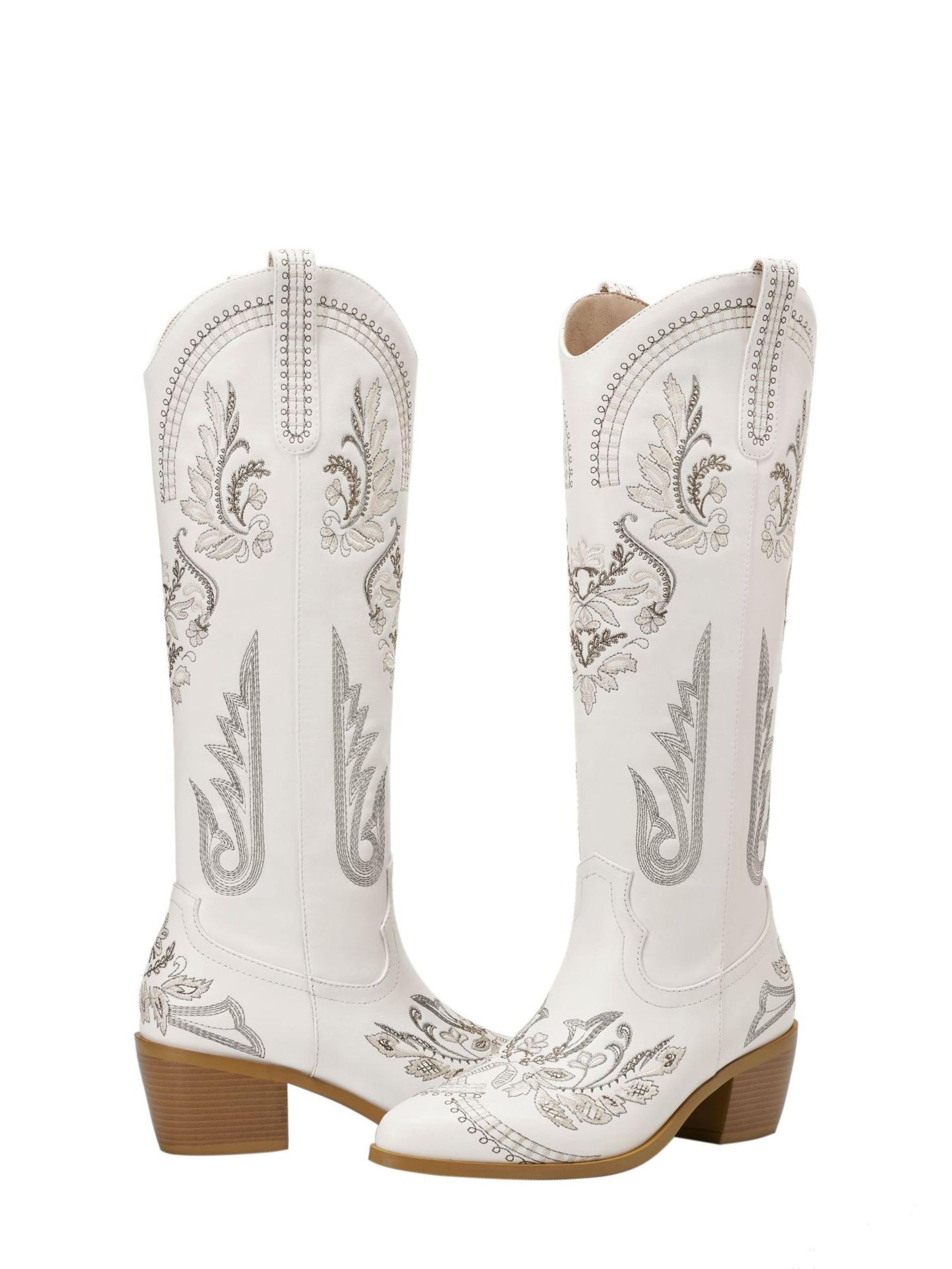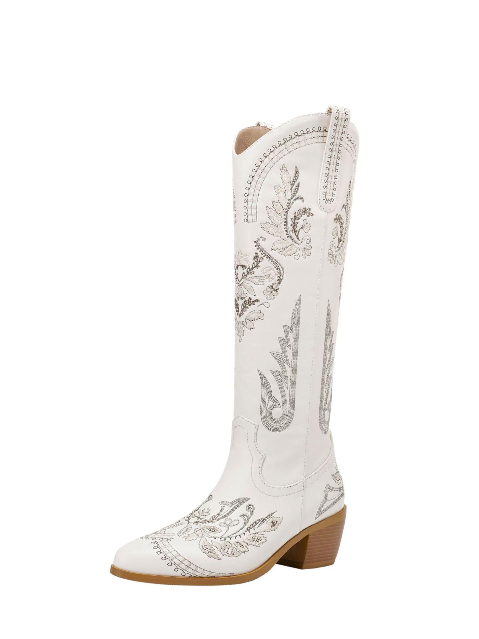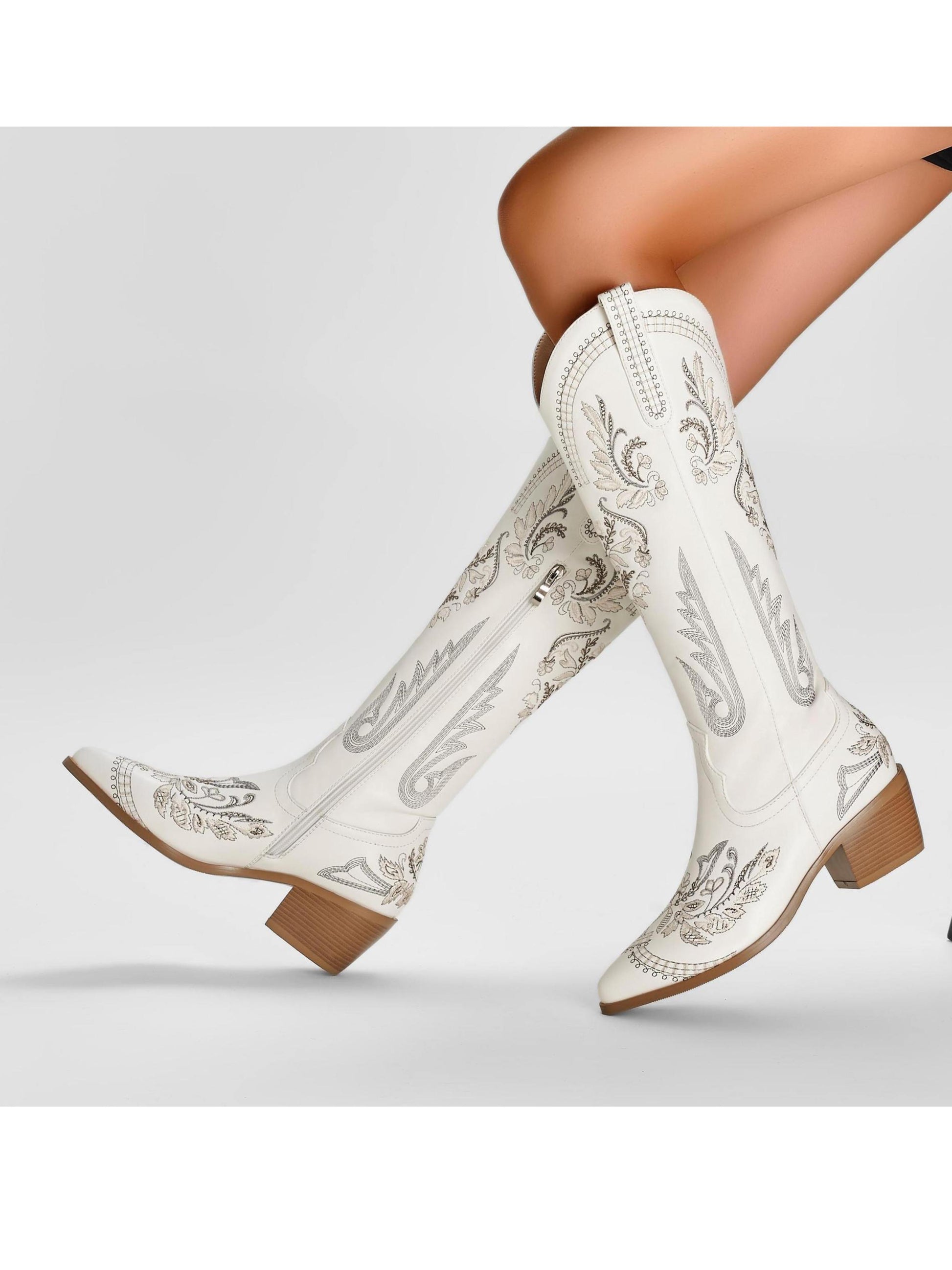 Pointed Toe Embroidered Floral White Cowgirl Boots feature a comfy low-heel, knee-high length, and a pointed toe.