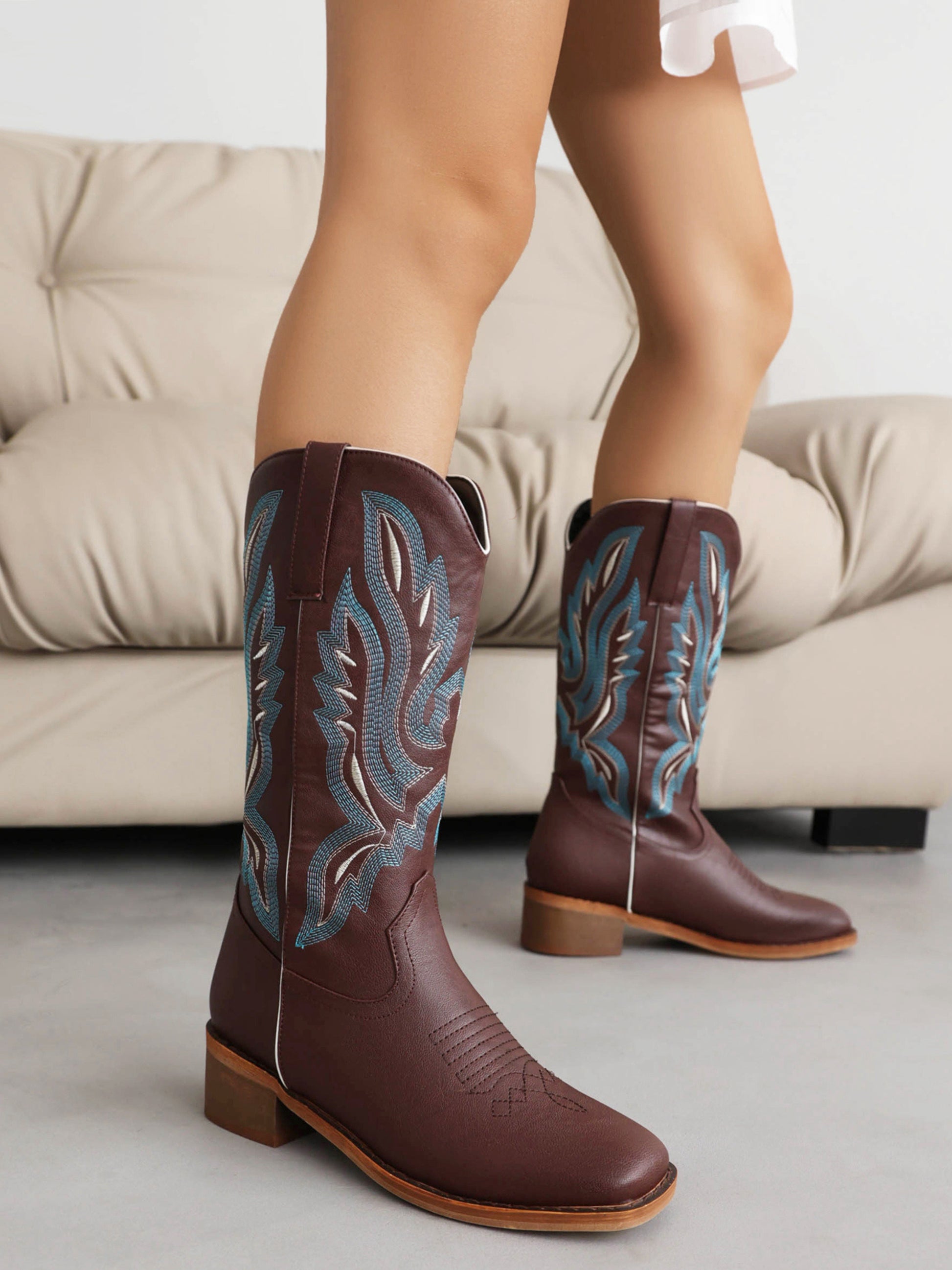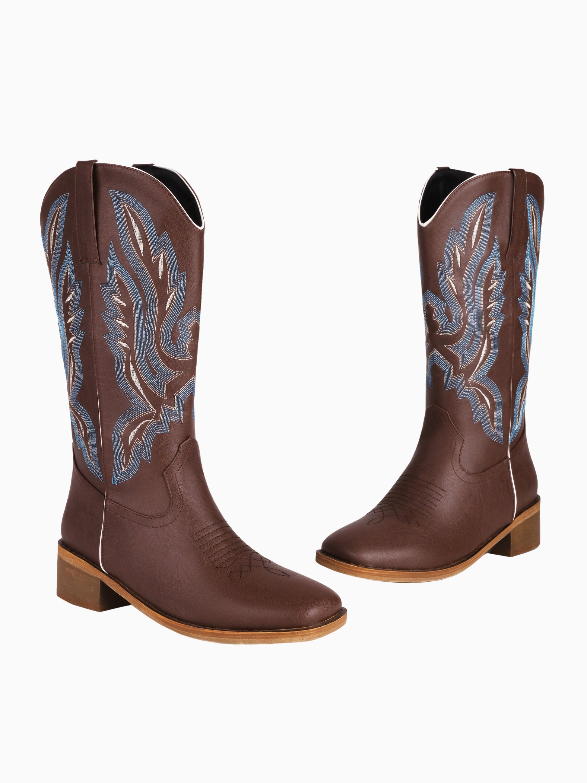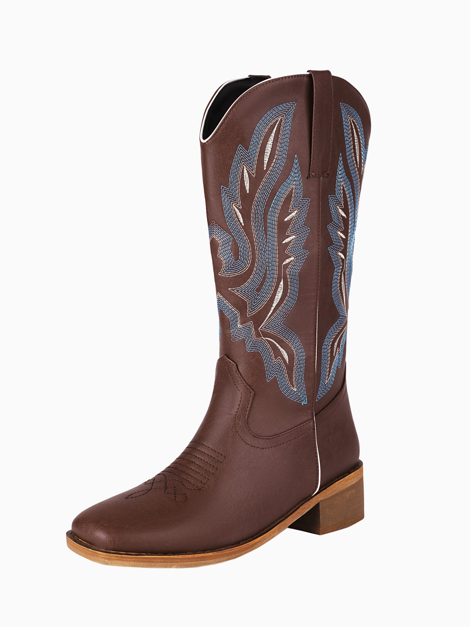 Timeless dark brown western boots feature eye-catching blue stitched patterns and a vintage-inspired design, perfect for authentic cowgirl style.