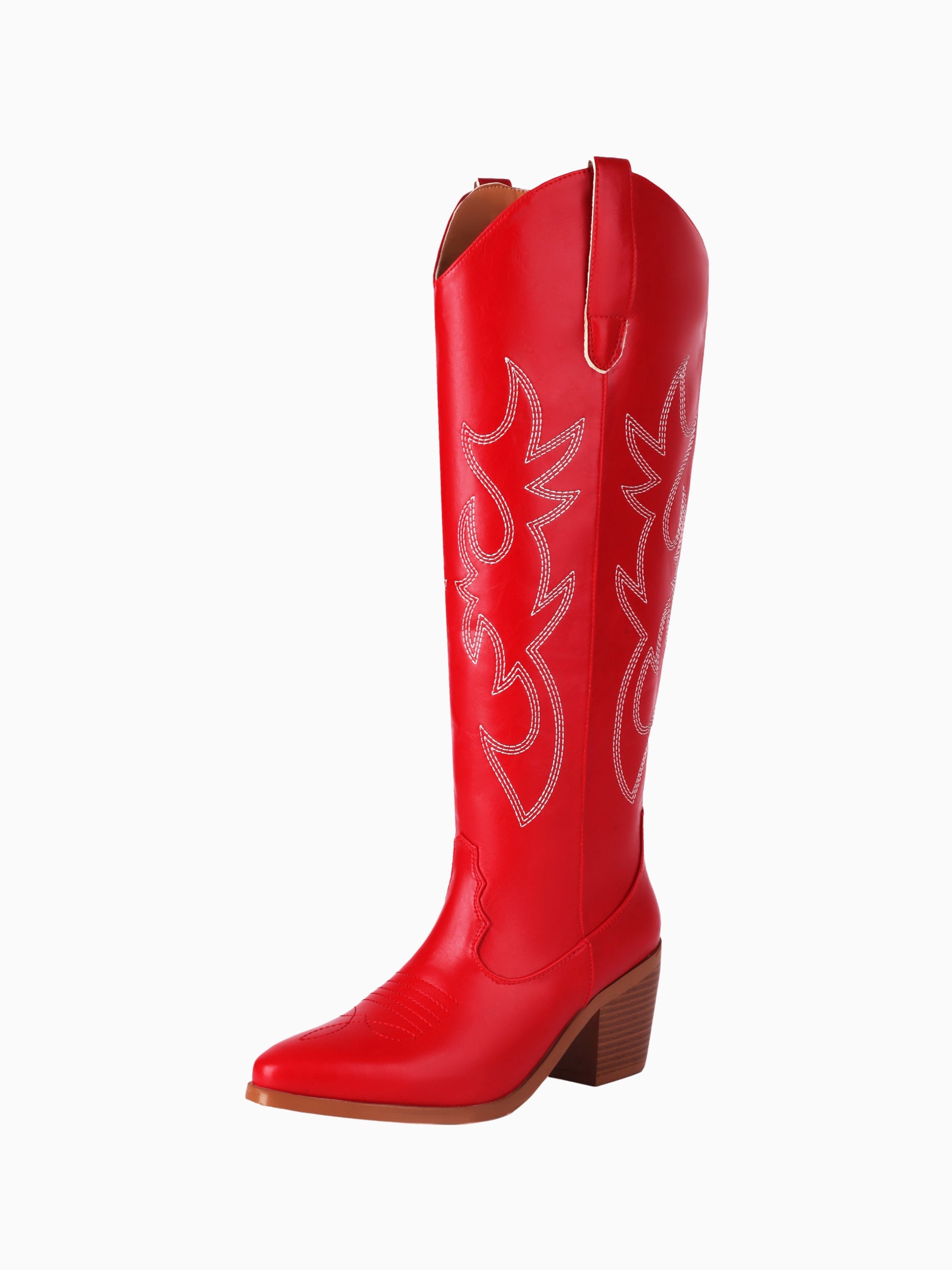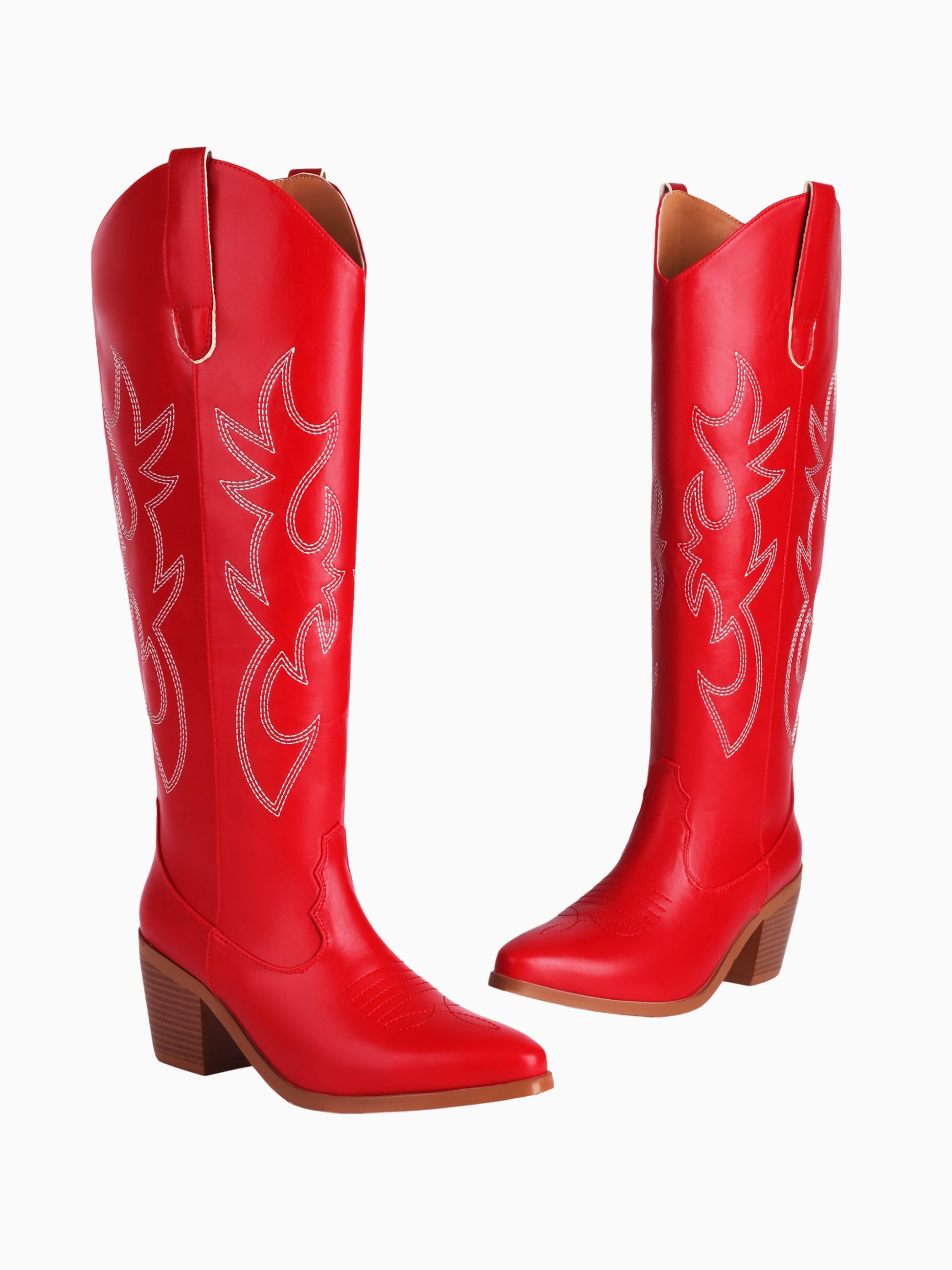 Bold red knee-high heel western boots showcase classic white stitching and modern silhouette, creating a stunning statement for any occasion.