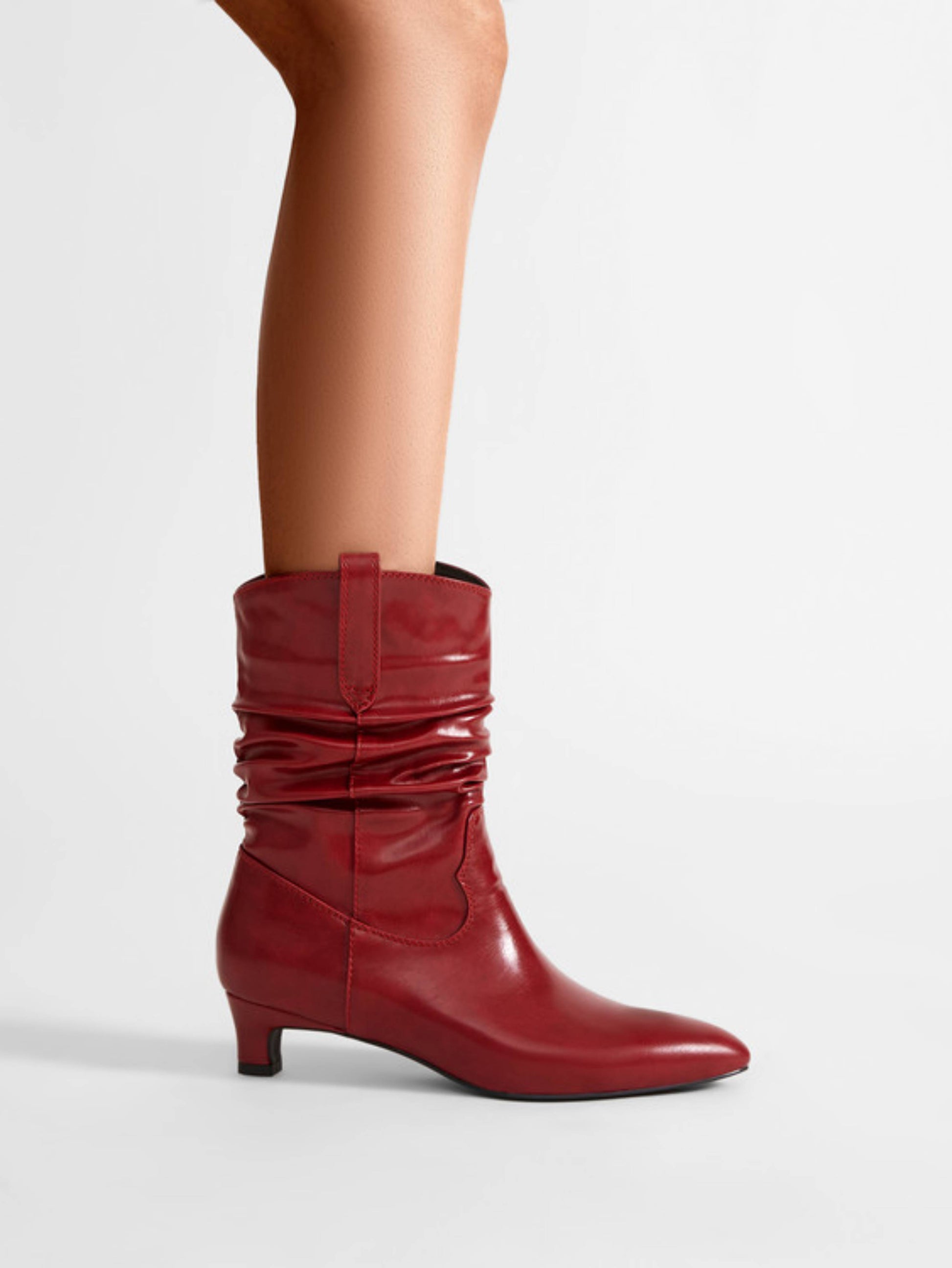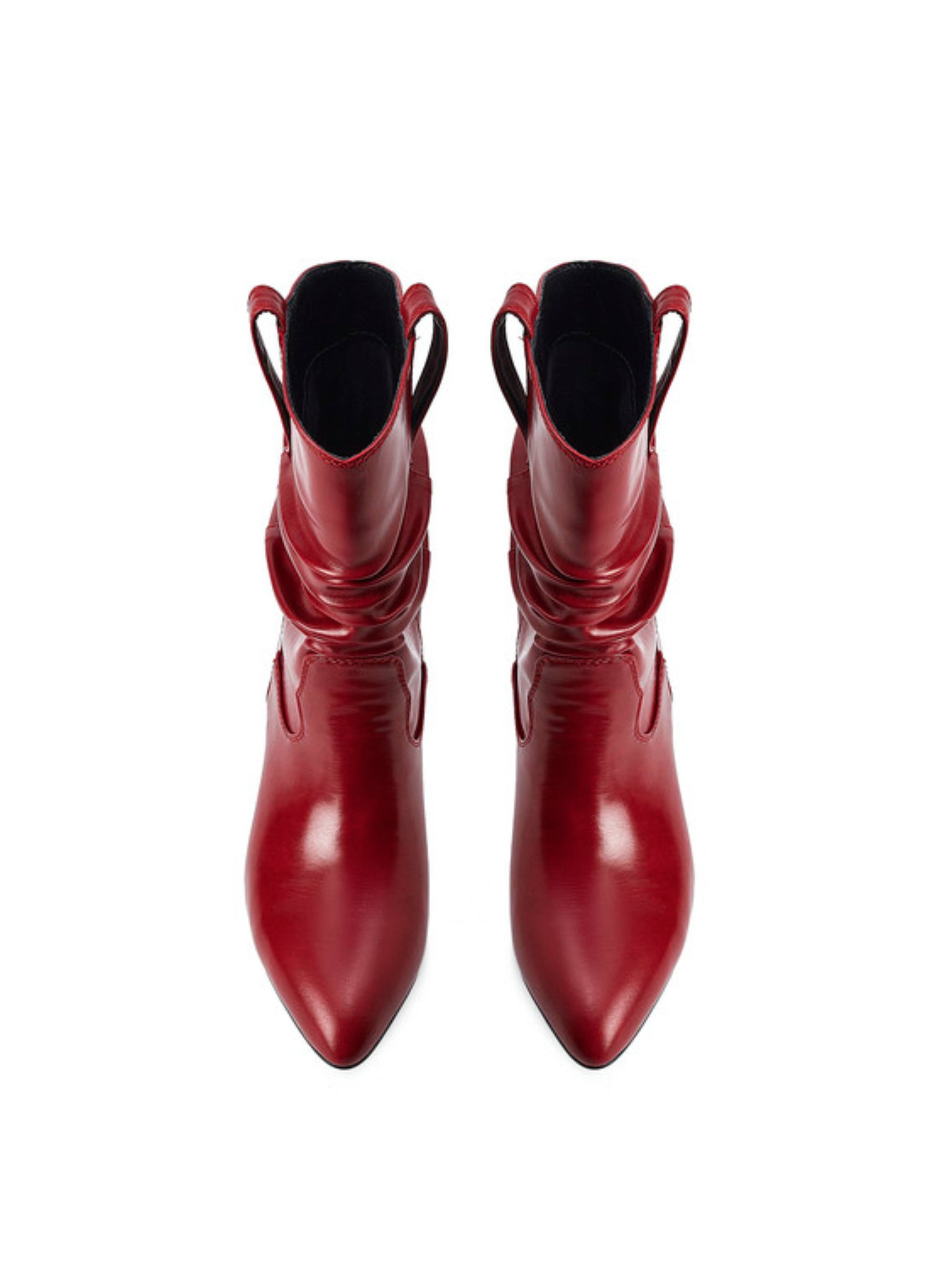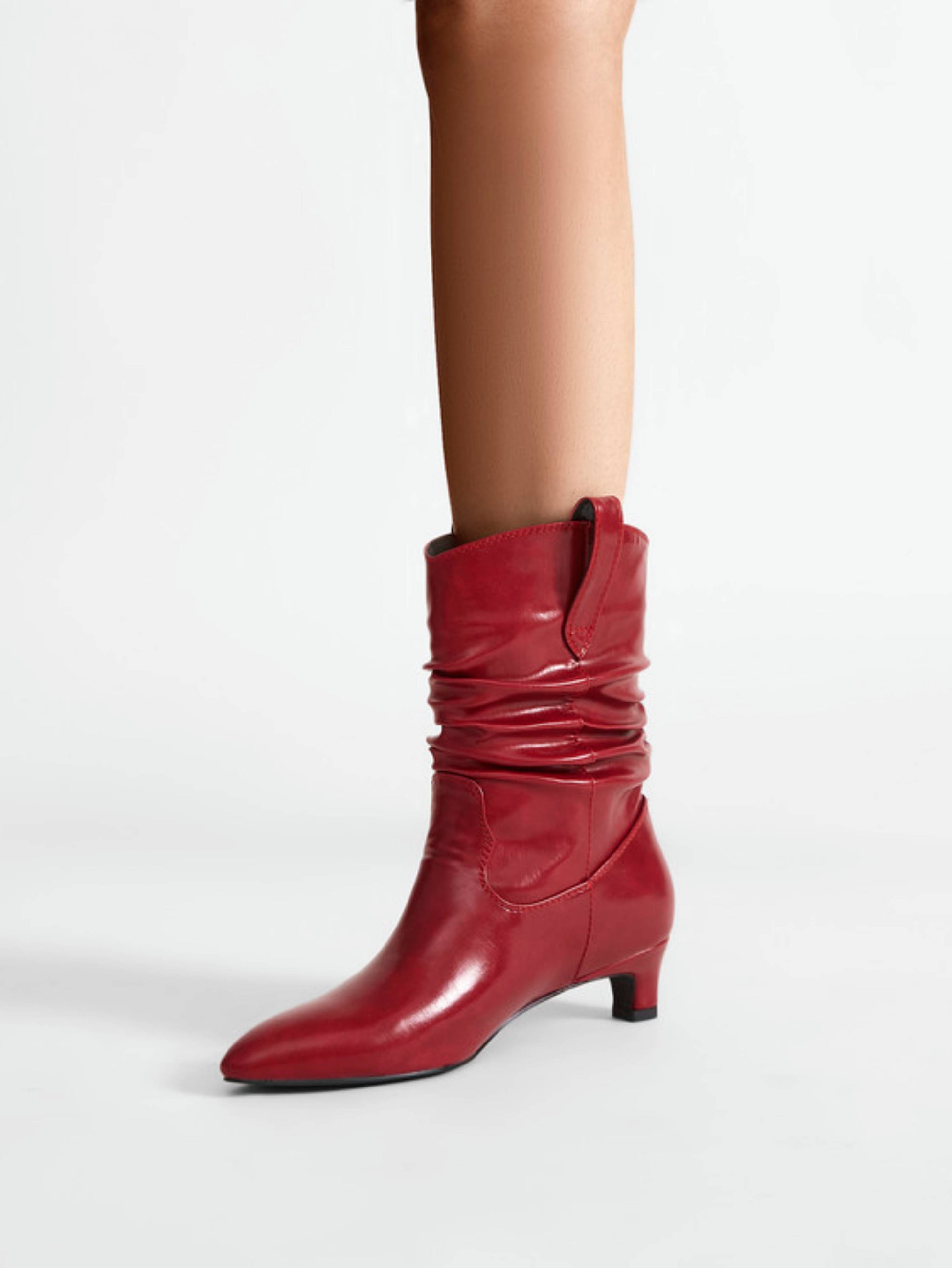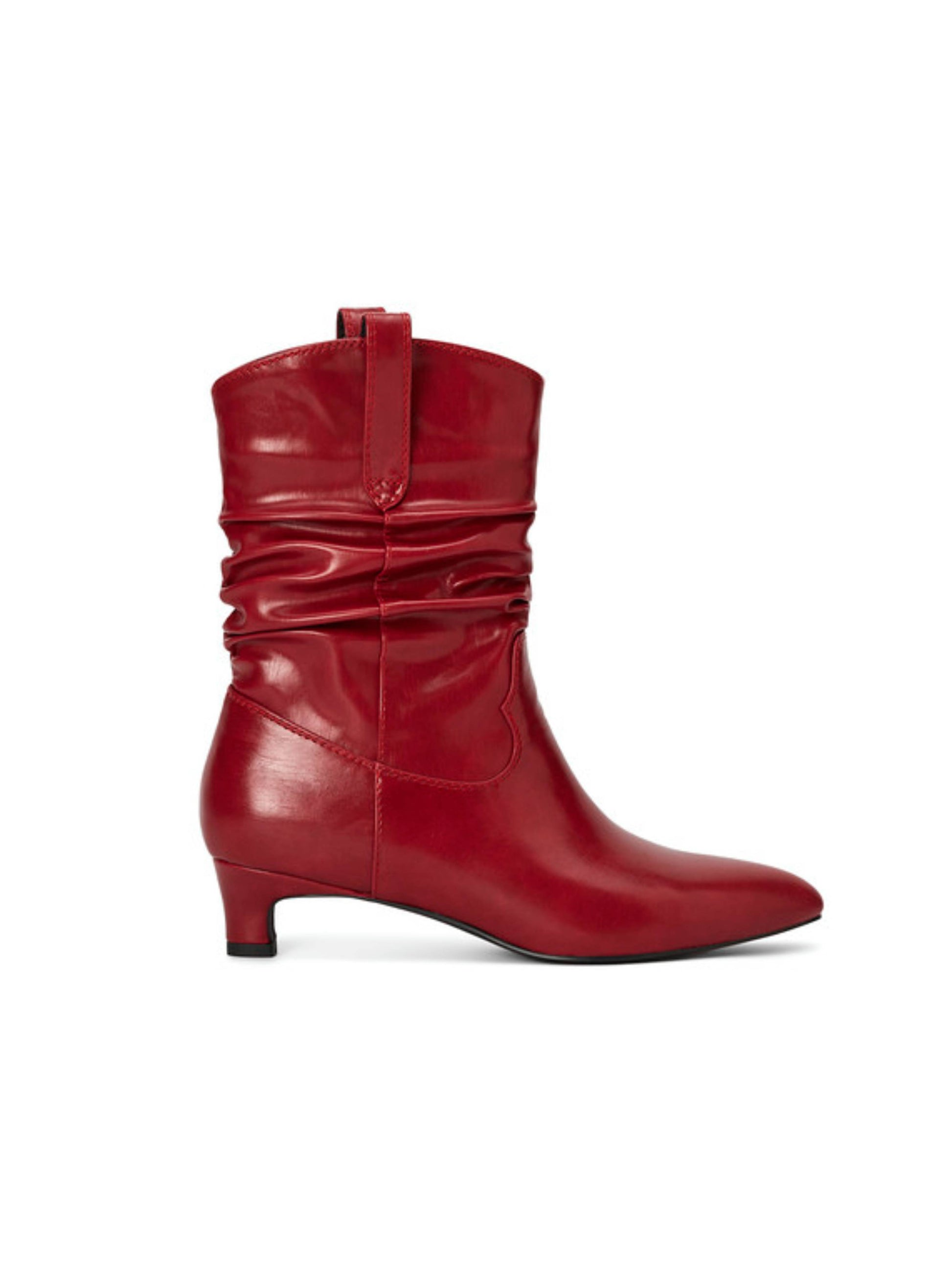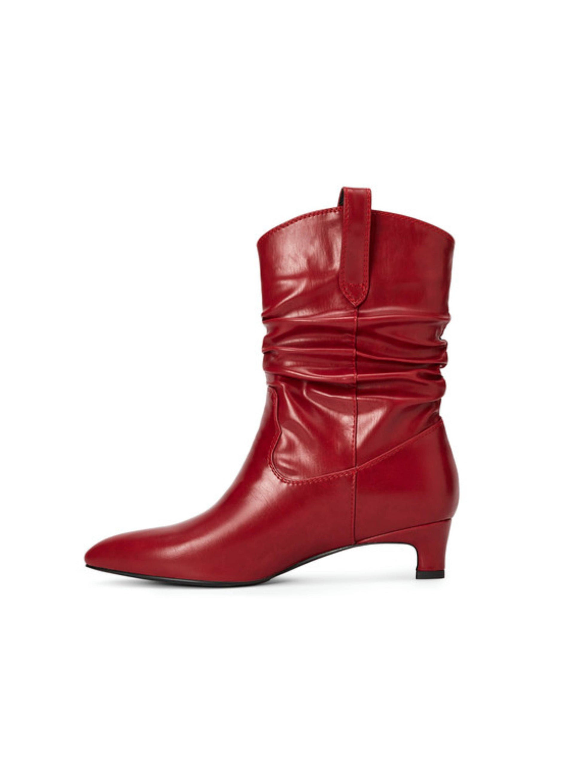 Red wrinkled slouchy cowgirl boots for women featuring mid-calf height and comfortable kitten heels. Stylish western boots with relaxed slouchy design combine fashion-forward cowboy style with easy wearability.