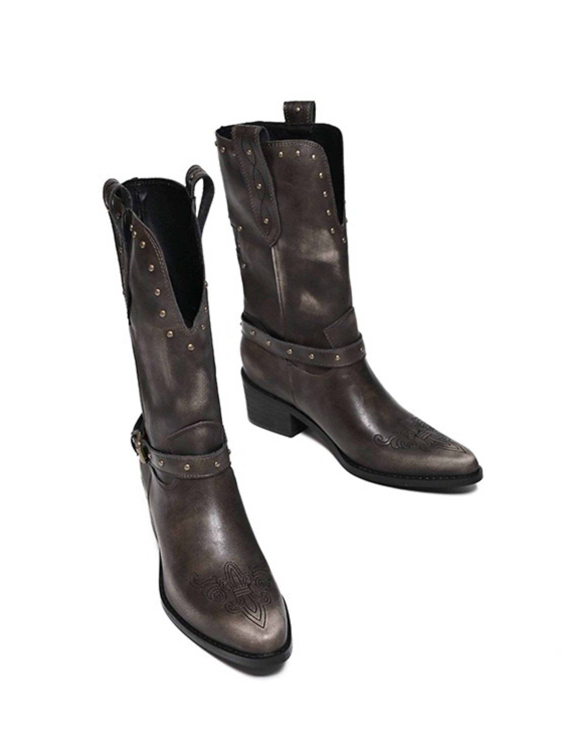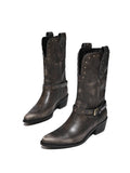 Retro Buckled Strap Studded Copper Black Cowgirl Boots