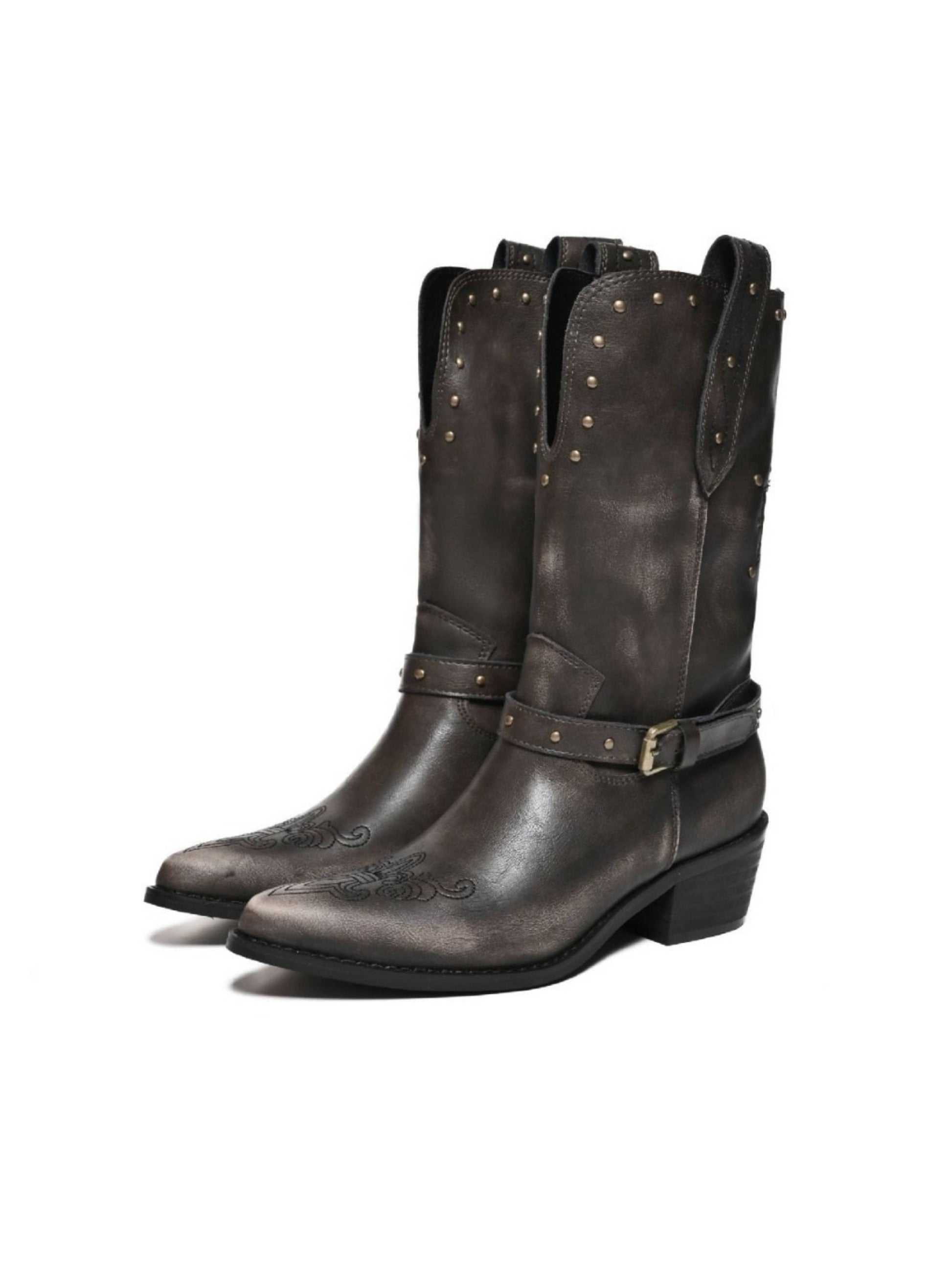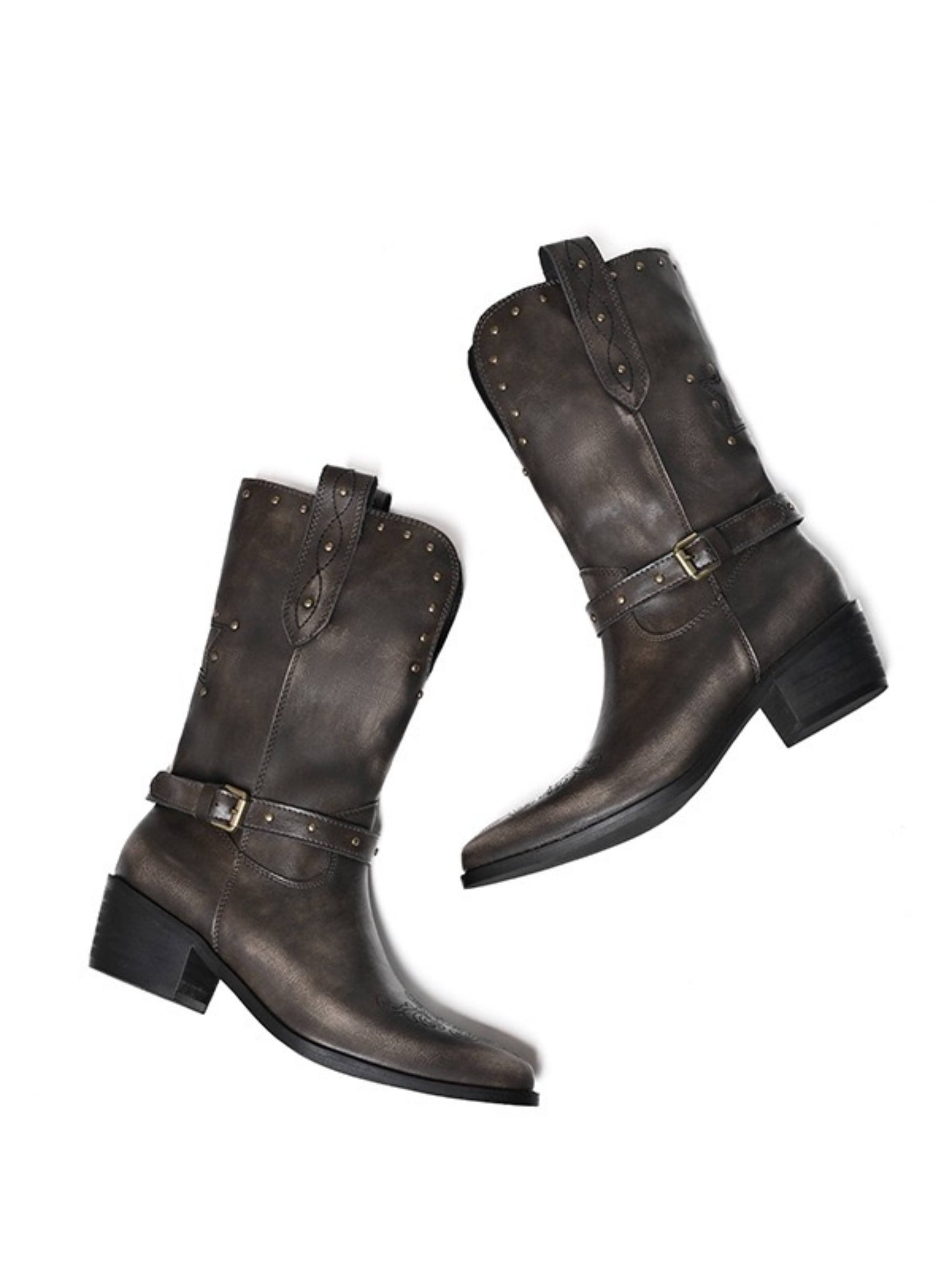 Vintage-inspired cowgirl boots in copper-black finish with bold buckled straps and edgy metal studs. Retro Western footwear blending classic cowboy style with rock-and-roll attitude. Perfect for rodeo fashion, biker aesthetic, country concerts, bohemian outfits, statement shoes, distressed look.