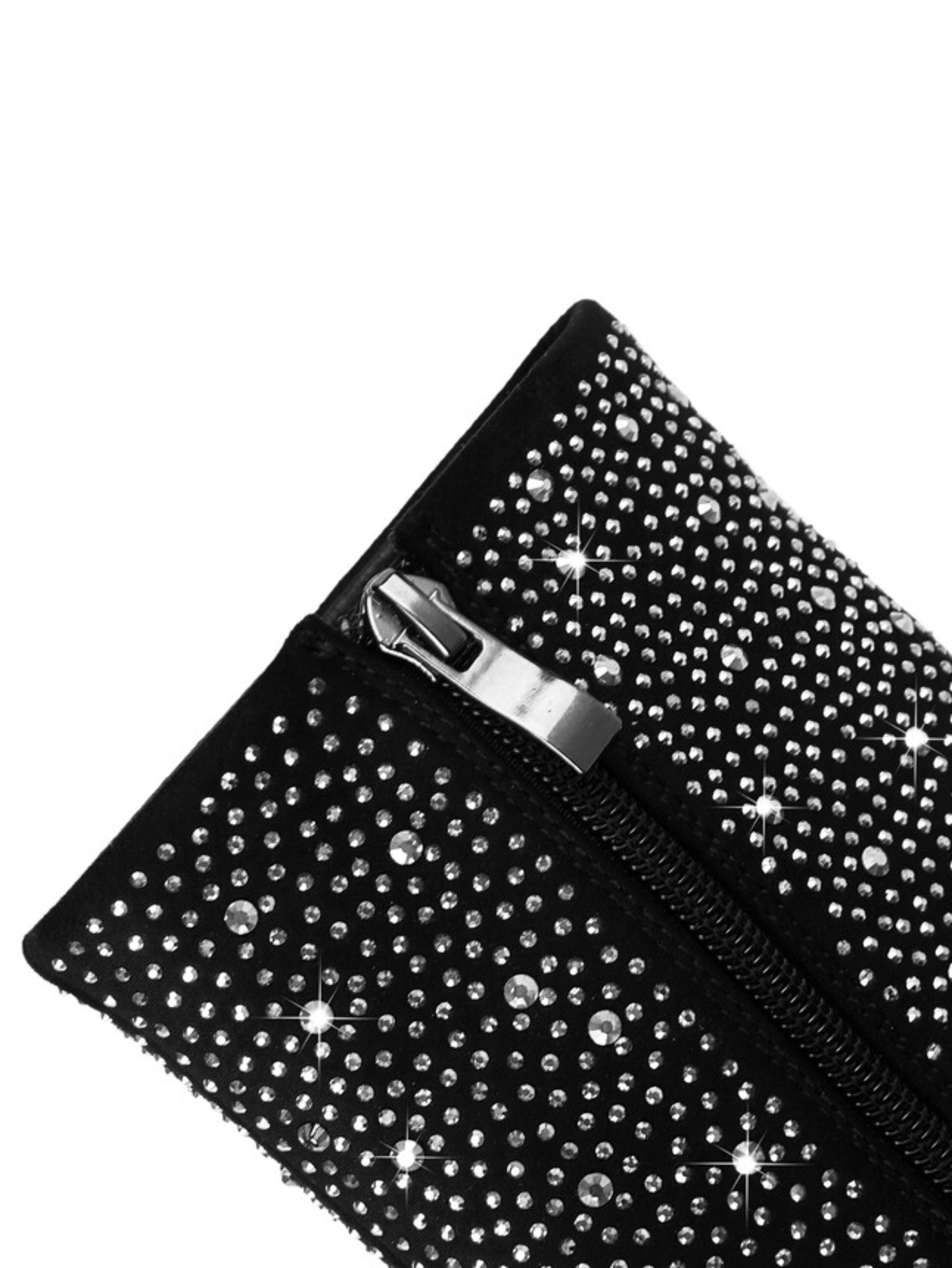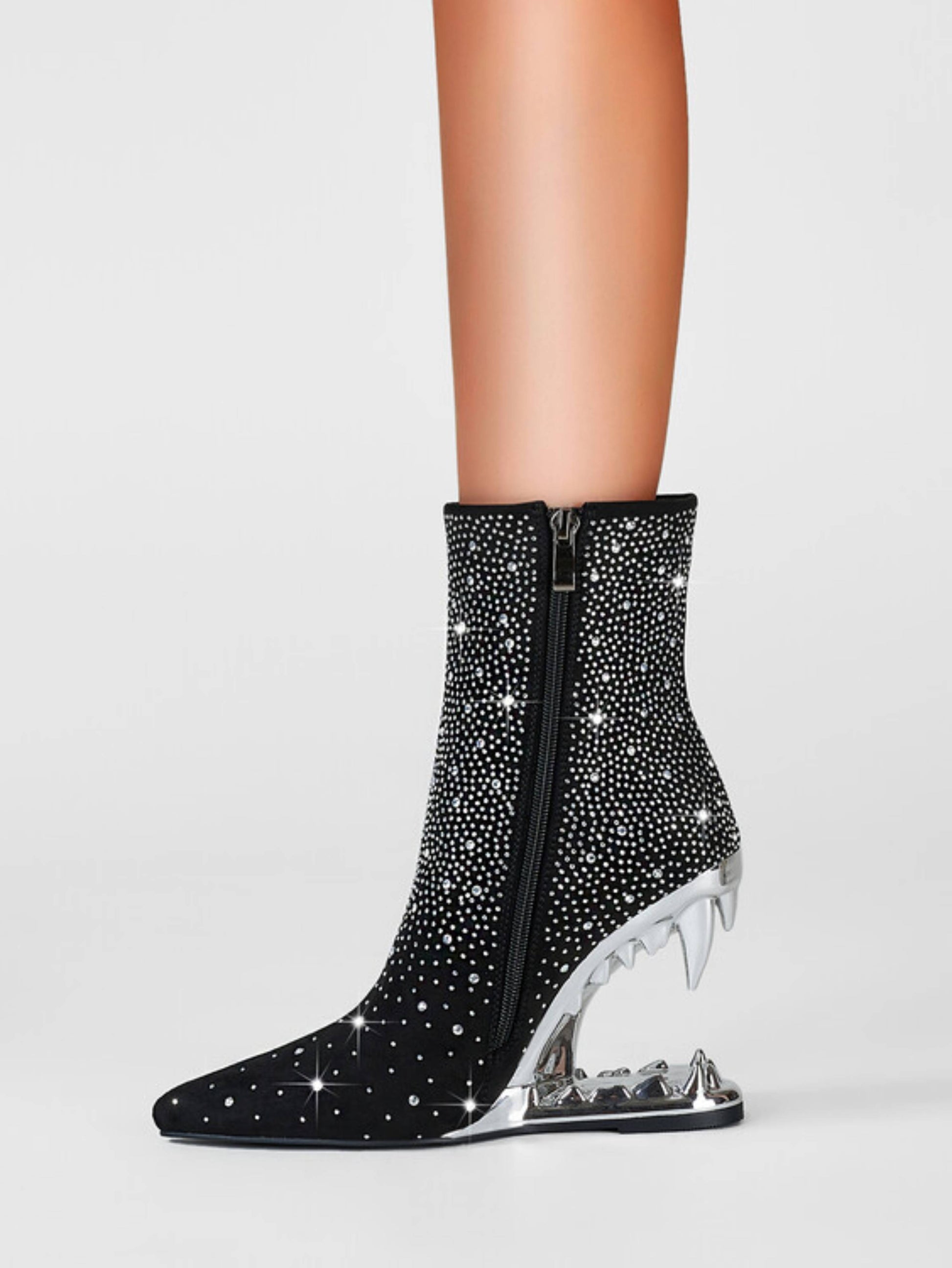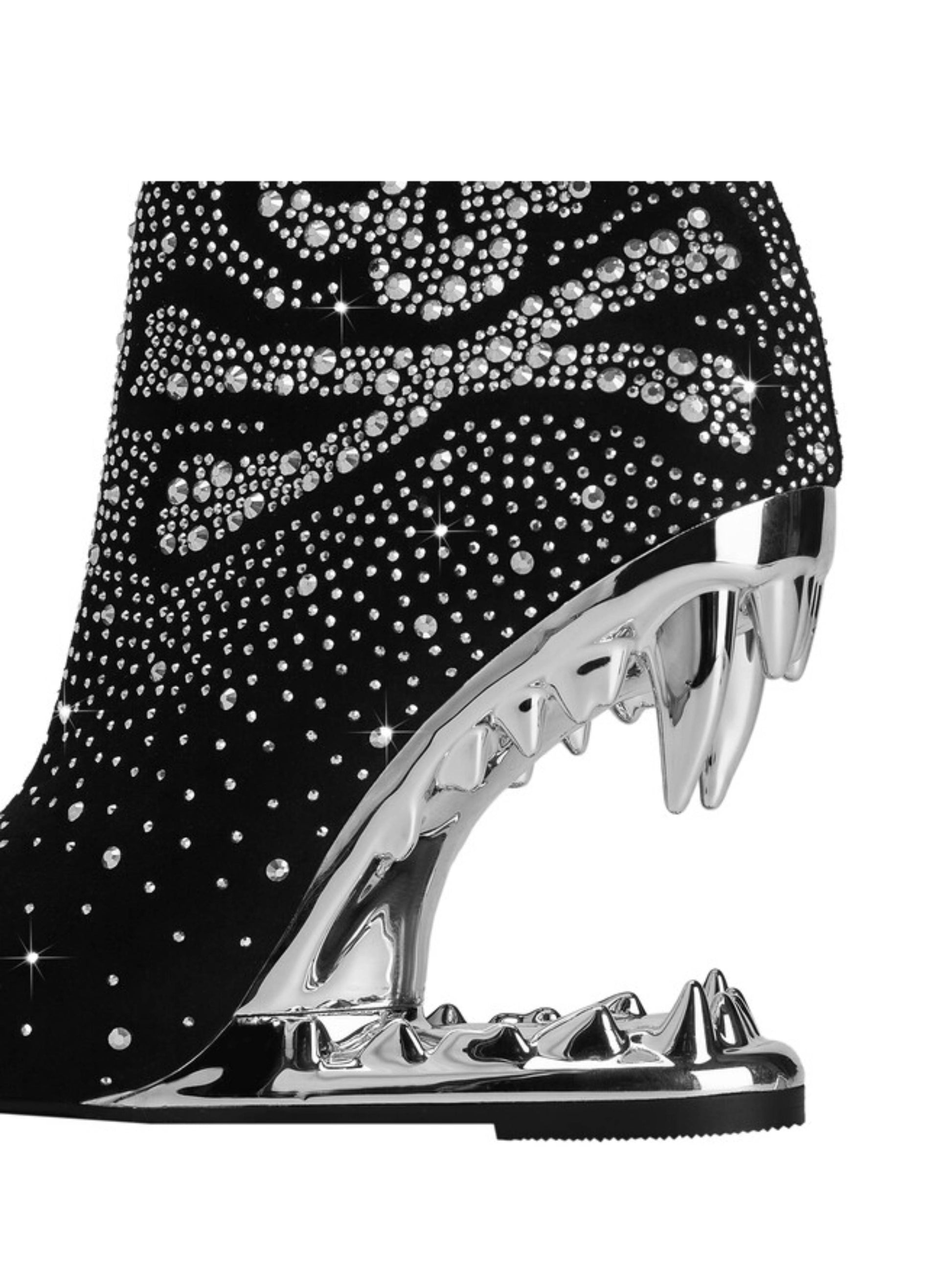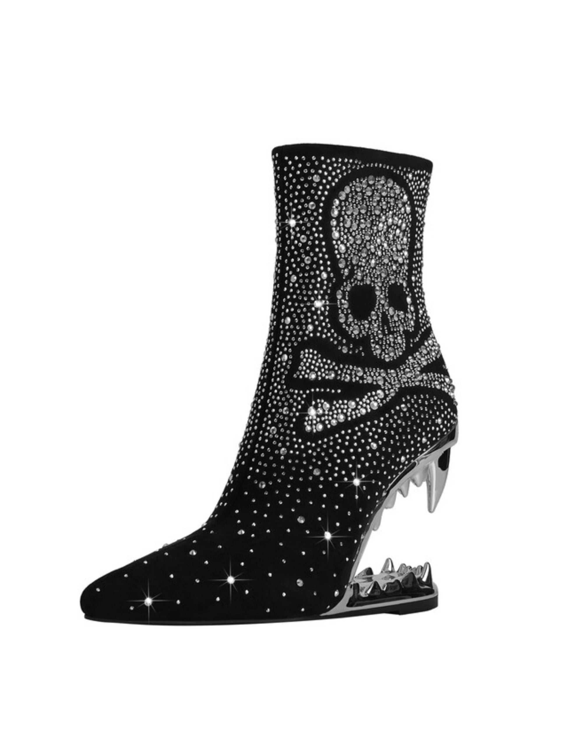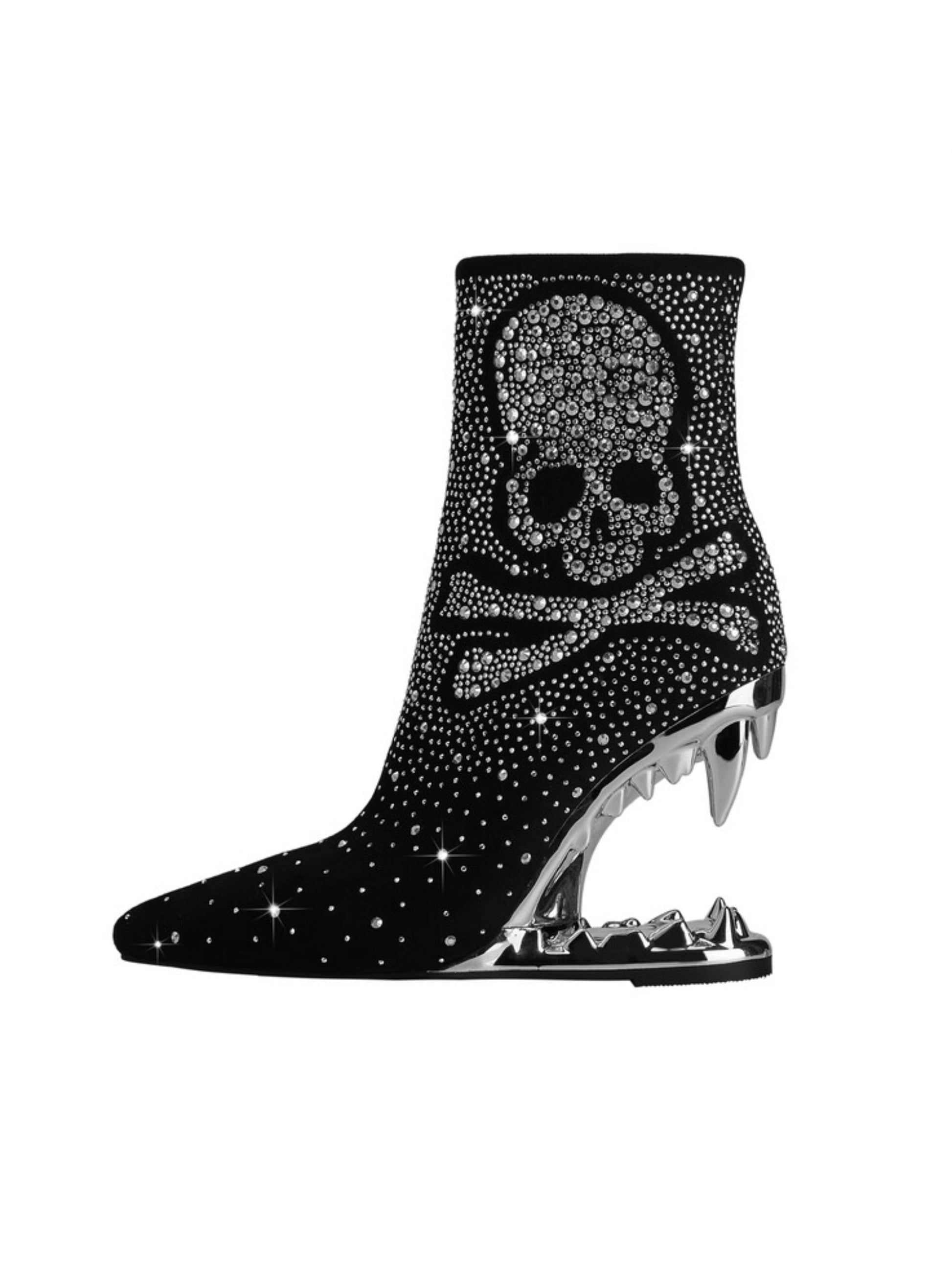 Edgy black and silver rhinestone skeleton short boots with striking teeth heel design and bold western style. These statement gothic boots combine sparkling embellishments with unique sculptural heels, perfect for trendy rhinestone western boots and alternative skull embellished footwear lovers.