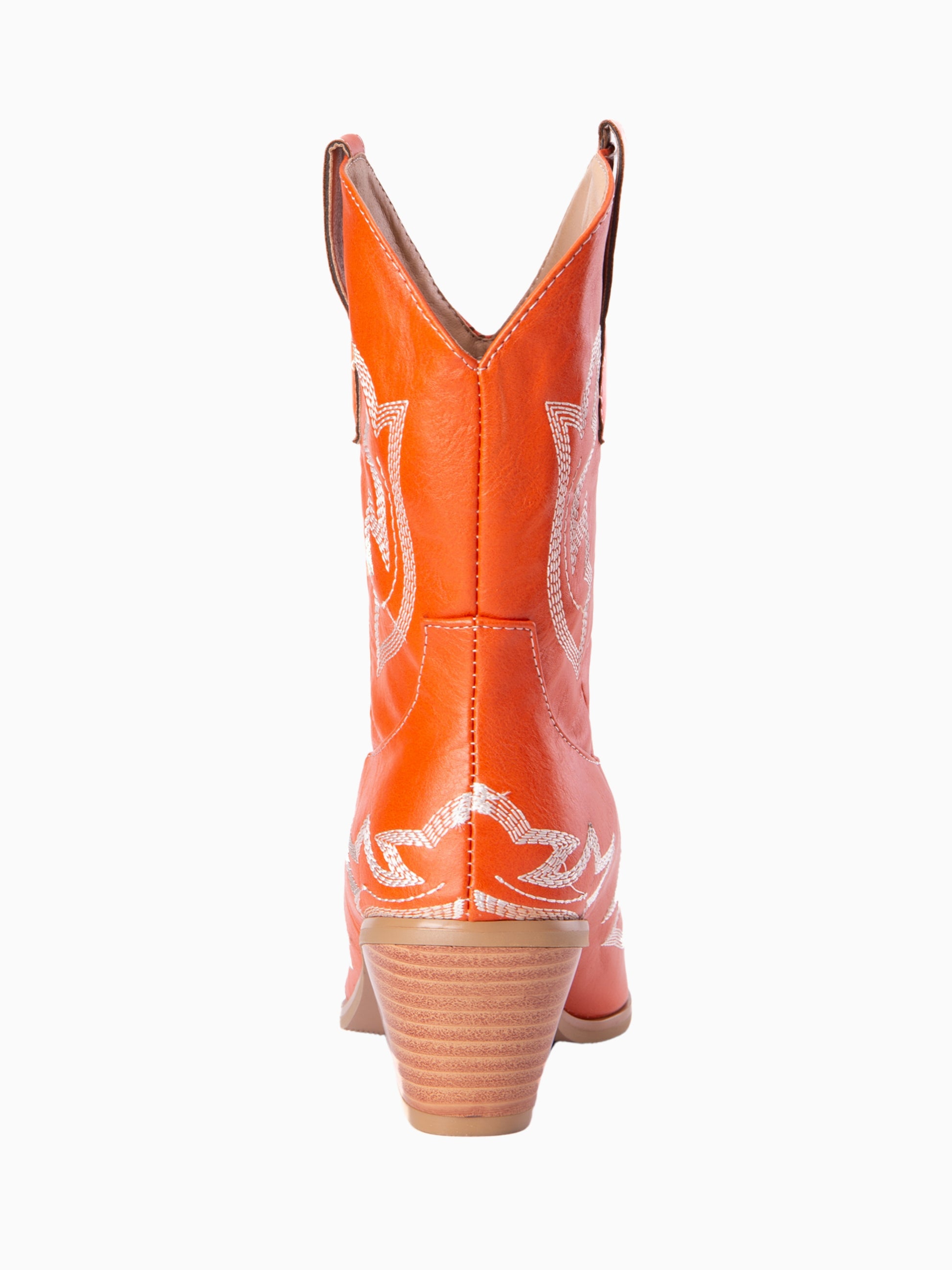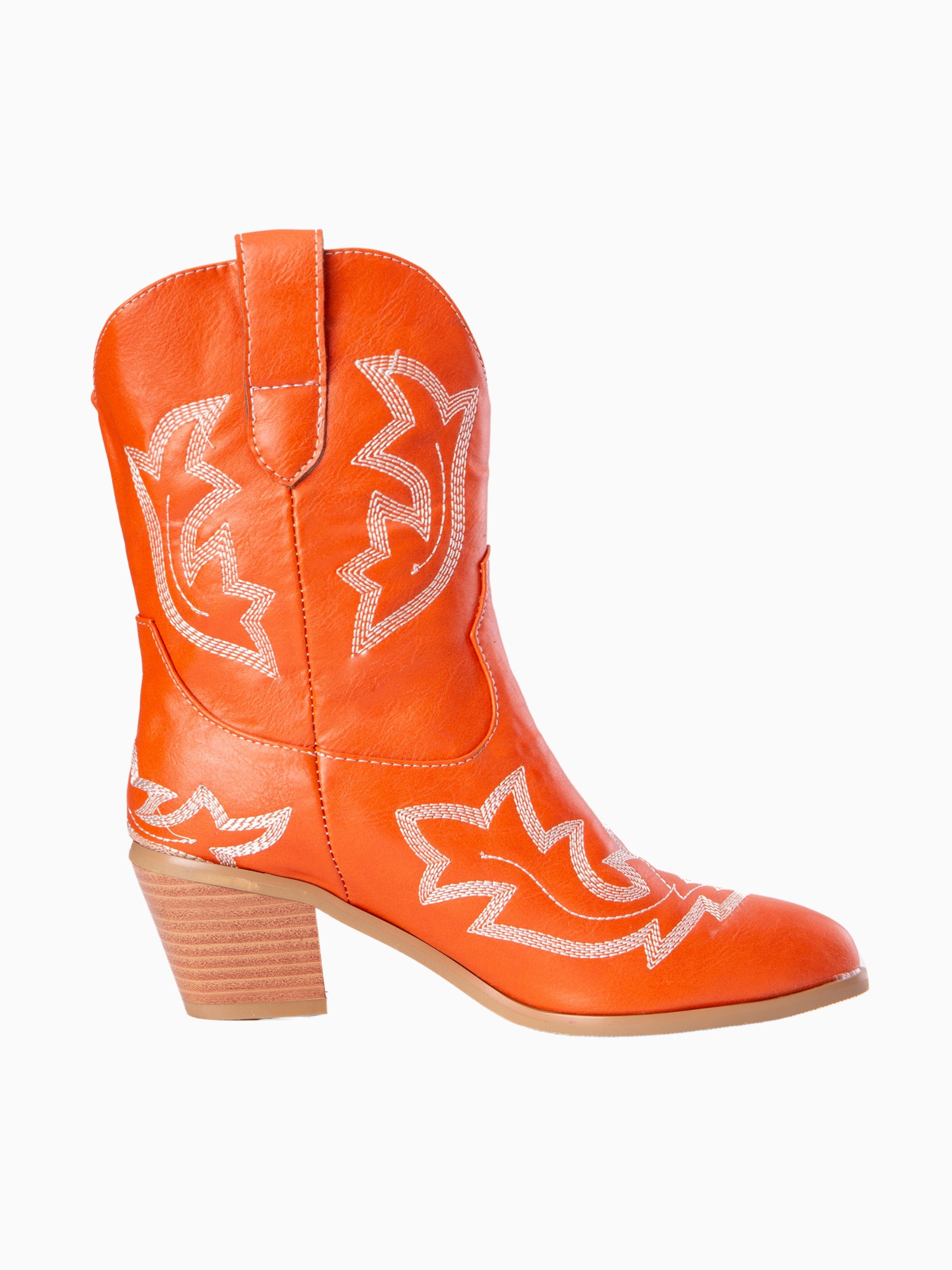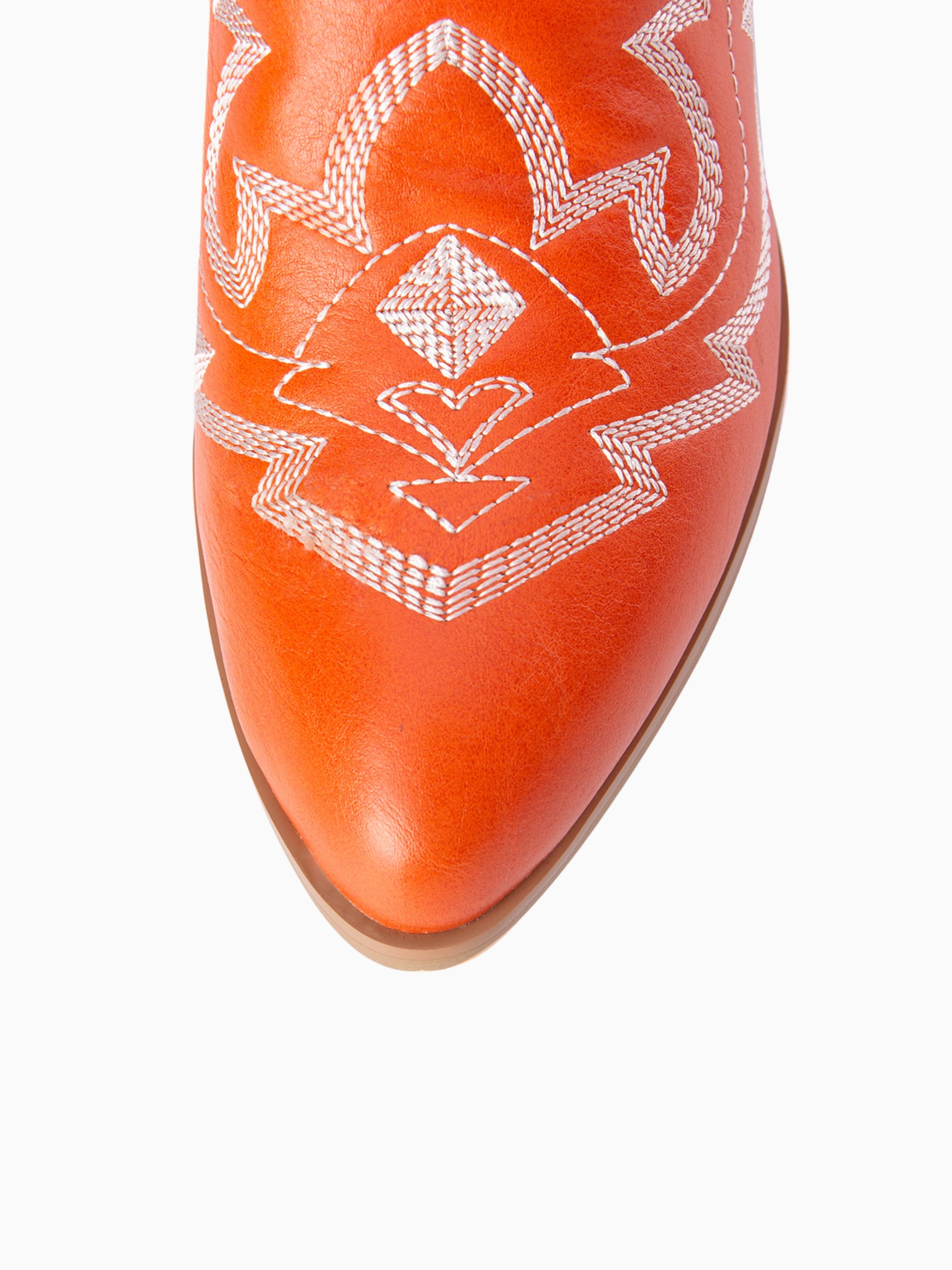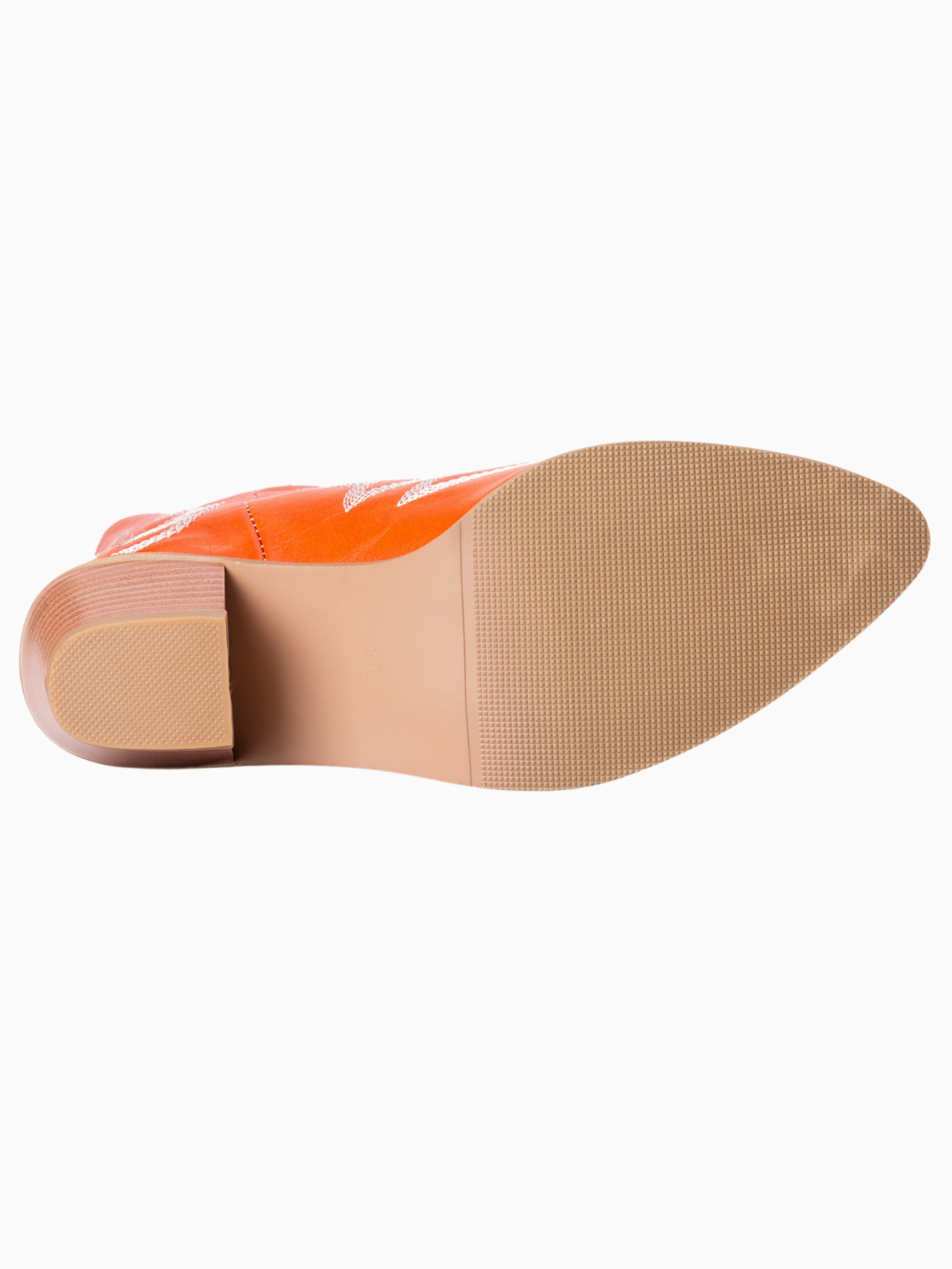 Bold Western ankle boots in eye-catching orange with striking white embroidered patterns. Pointed toe and stacked heel add classic style. A statement boot for modern cowgirls.