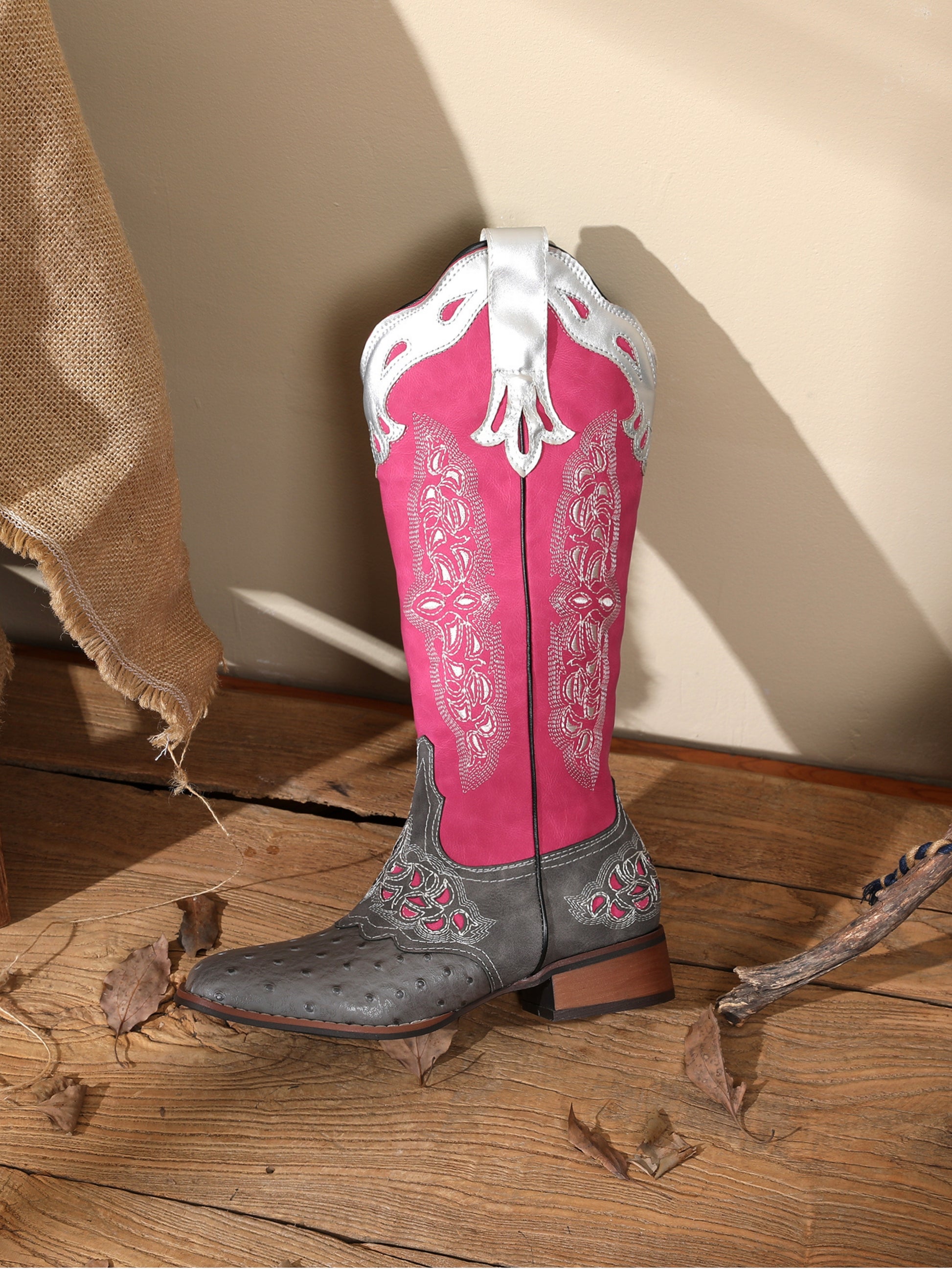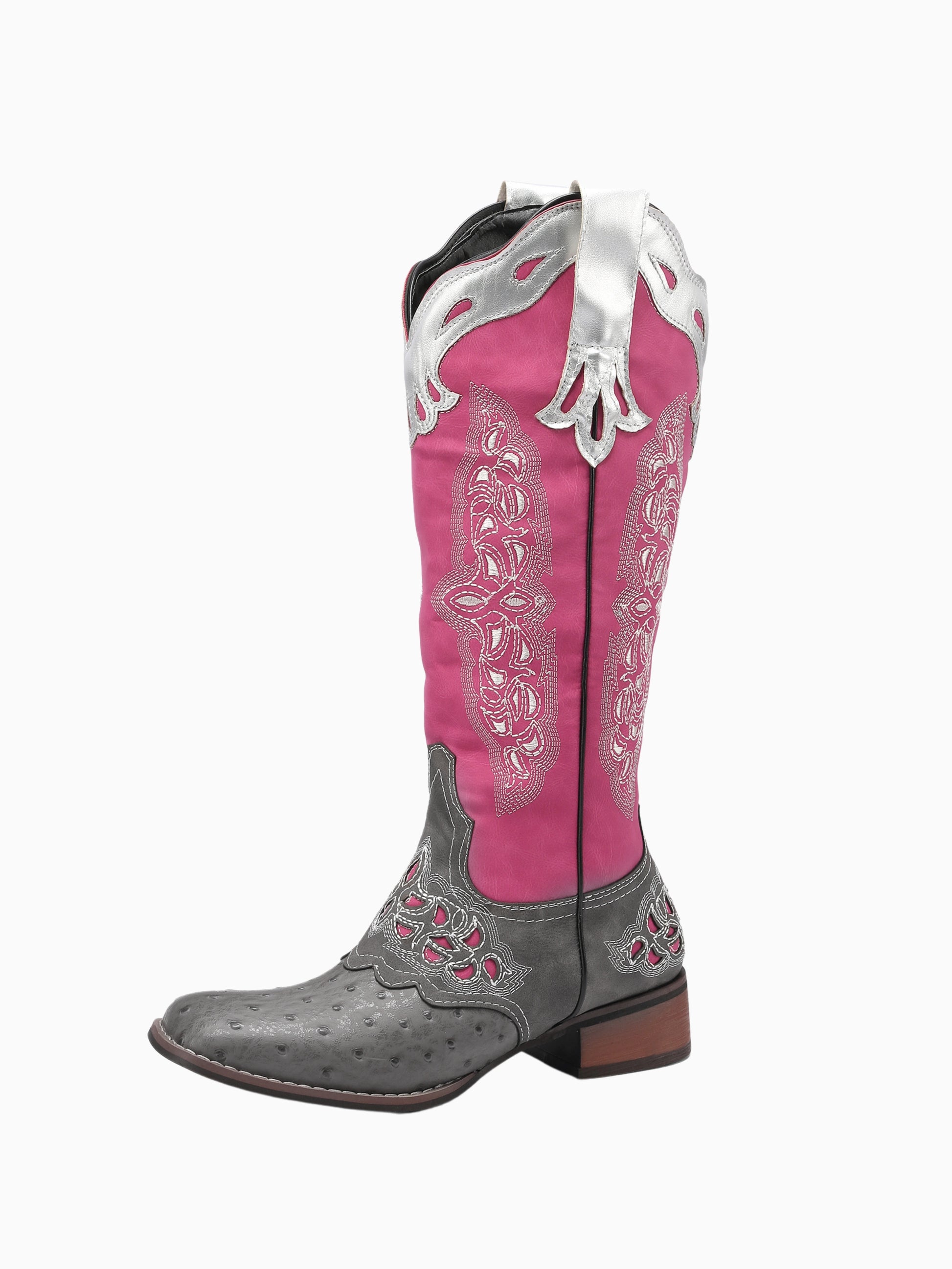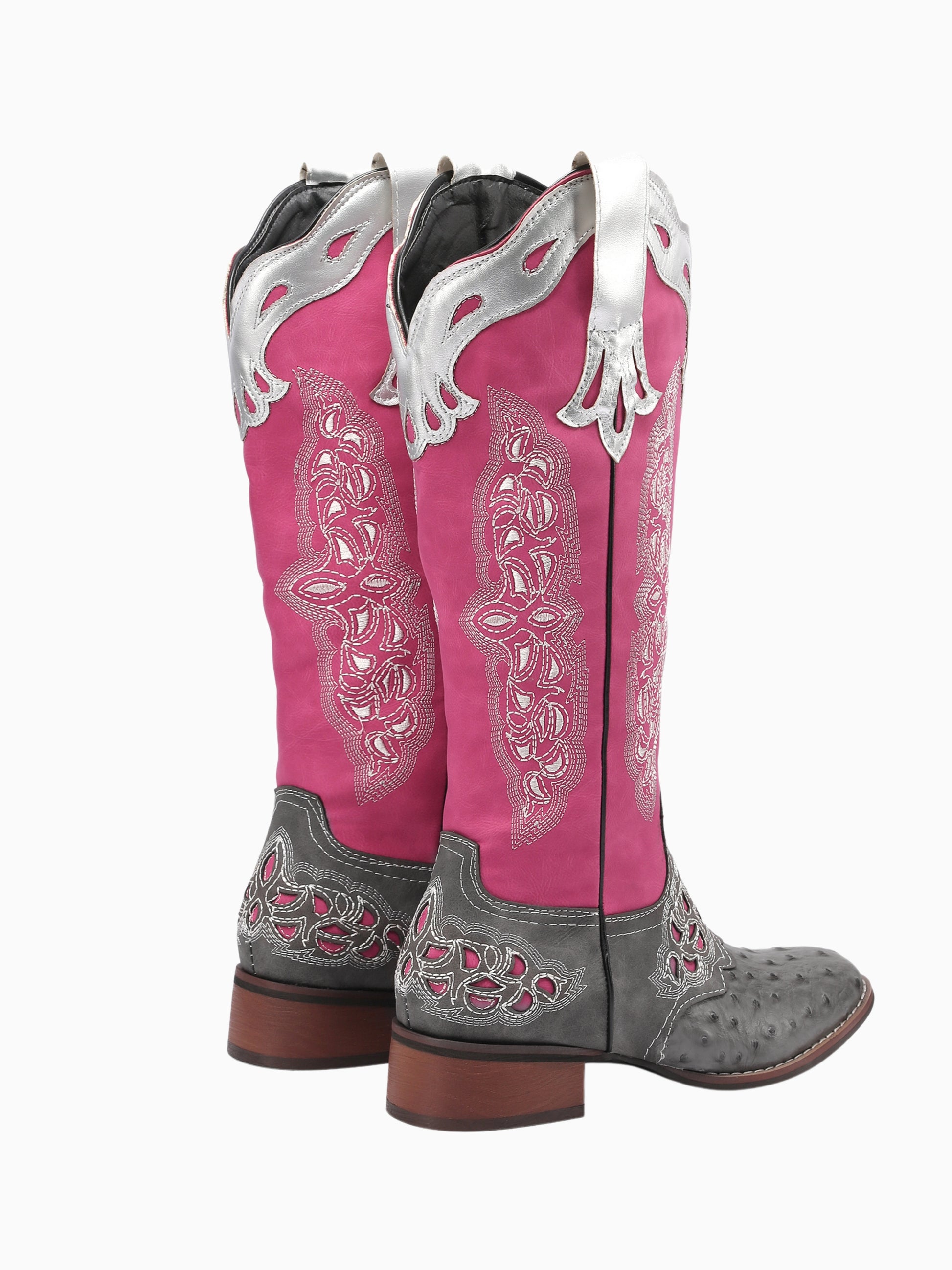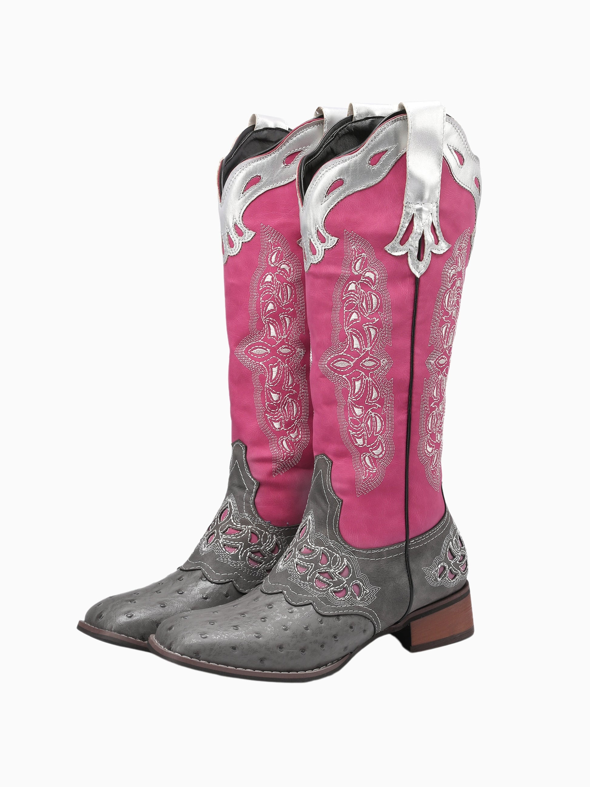 Vibrant pink cowgirl boots with grey ostrich-print foot, featuring ornate silver overlays, intricate embroidery, and square toe for a bold Western-inspired look.