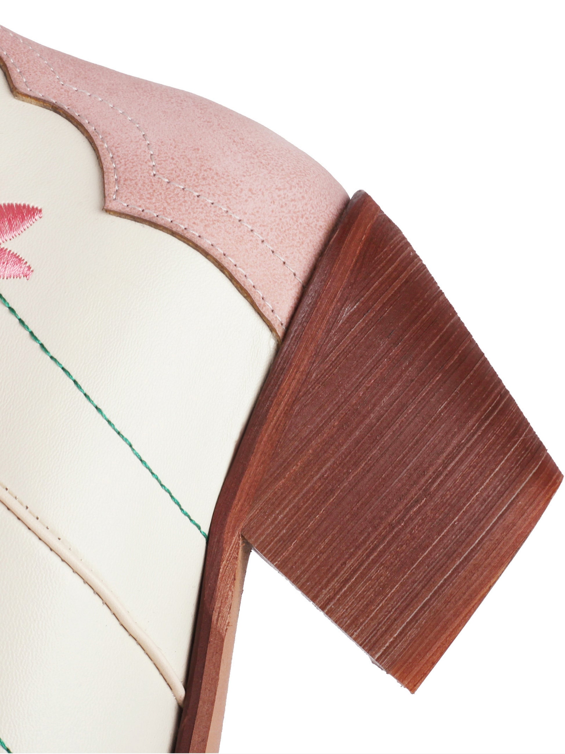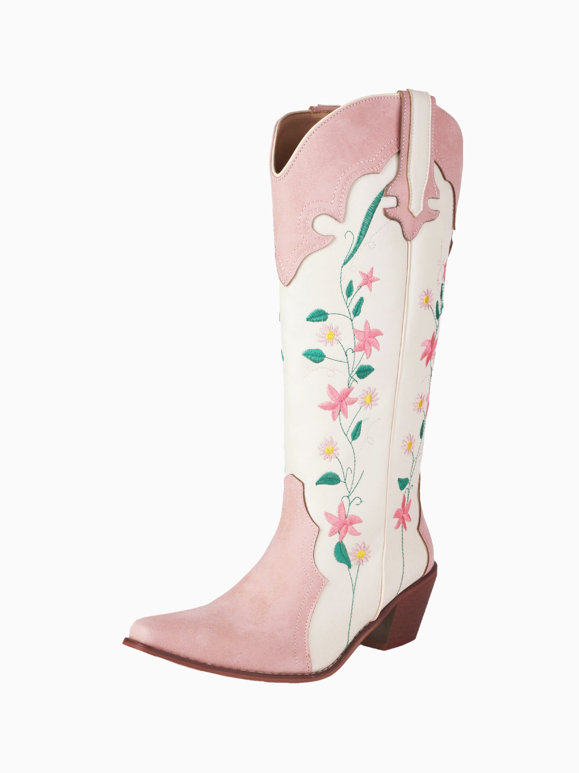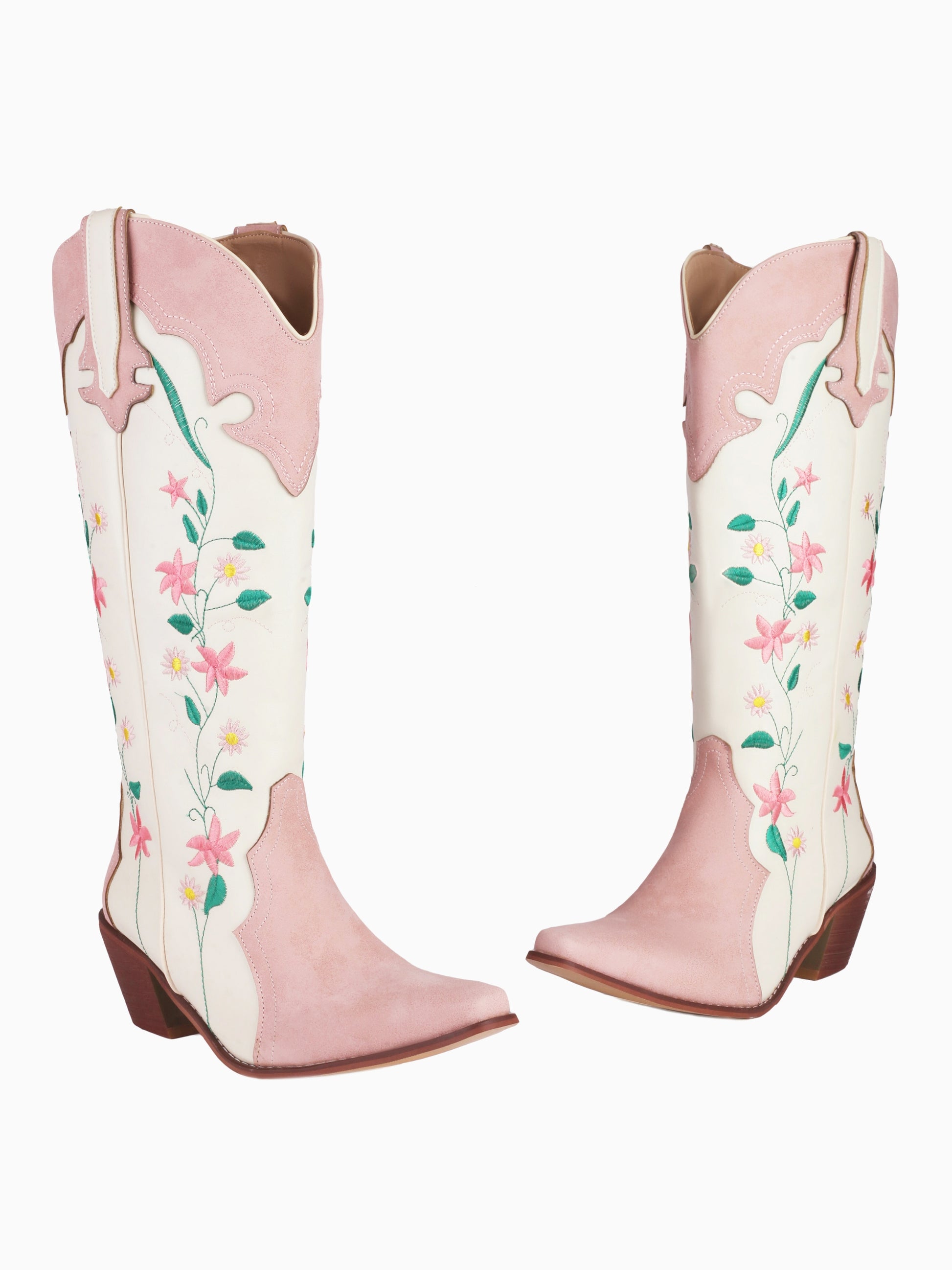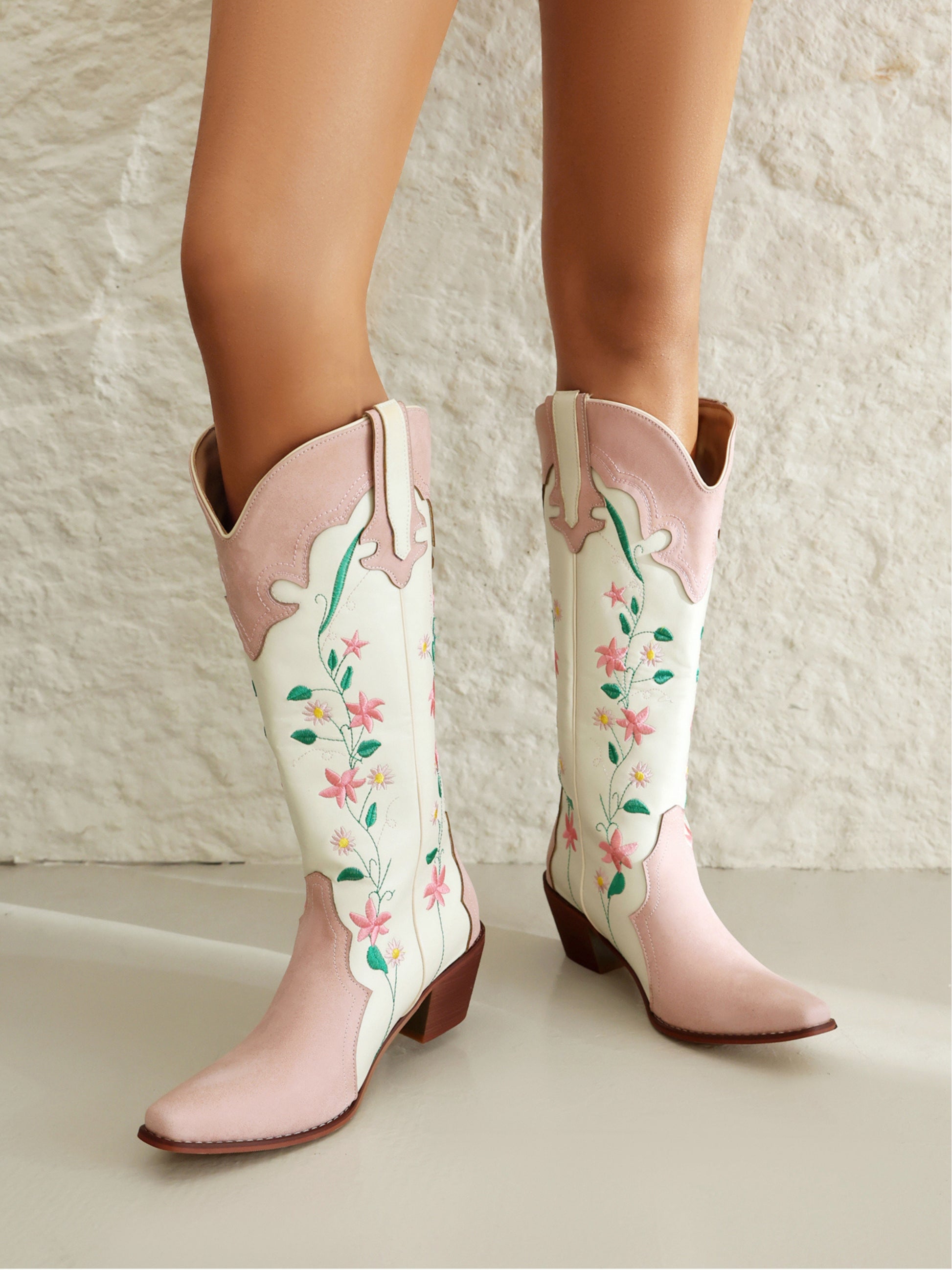 Romantic knee-high cowgirl boots feature pink and pearl-white colorblock design with delicate floral embroidery, snip toe, and stacked heels for feminine Western charm.