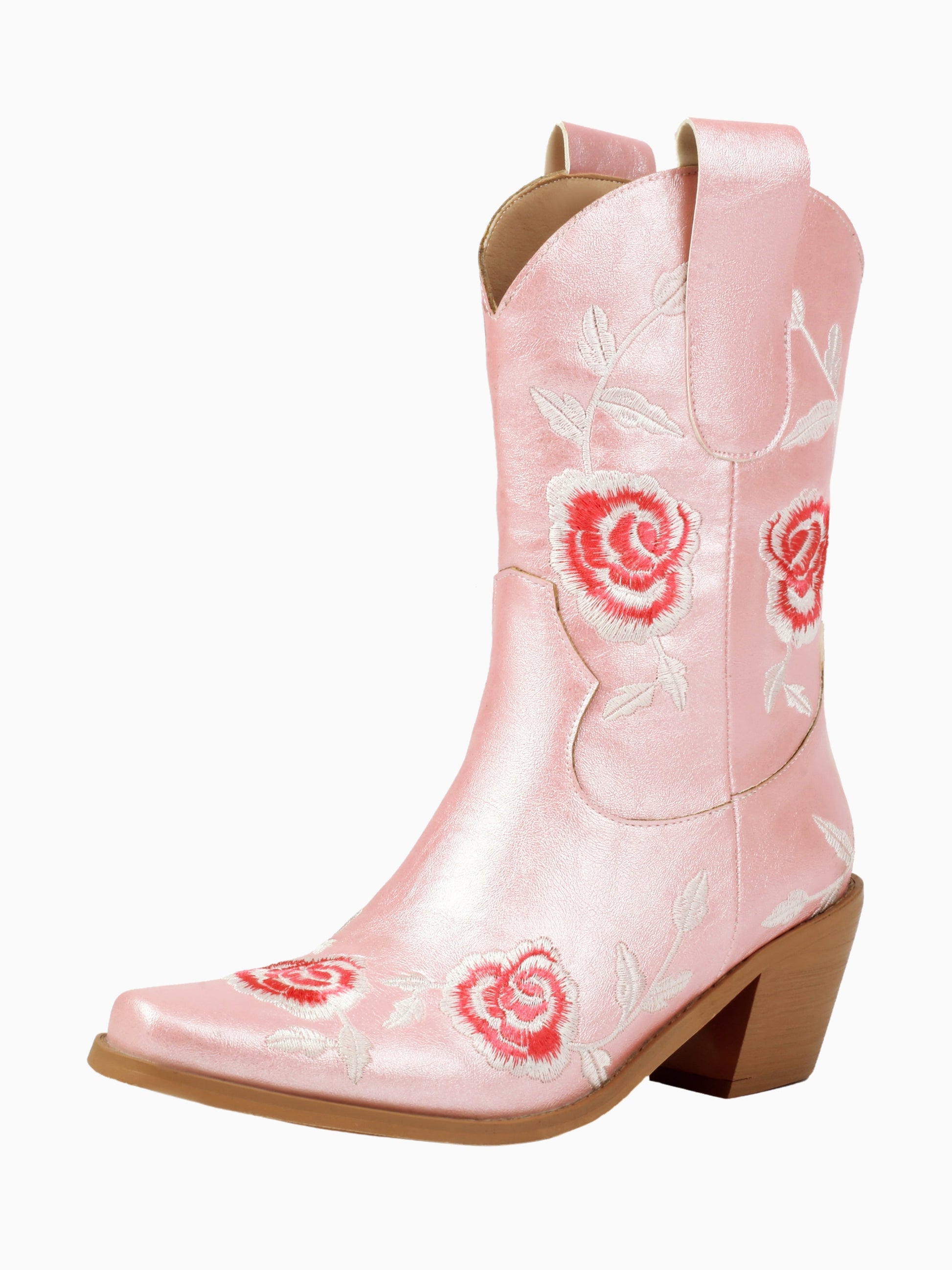 Enchanting Western boots with delicate rose embroidery on soft pink background, featuring a block heel and pointed toe. Blending feminine charm with cowgirl style for special occasions or statement looks.
