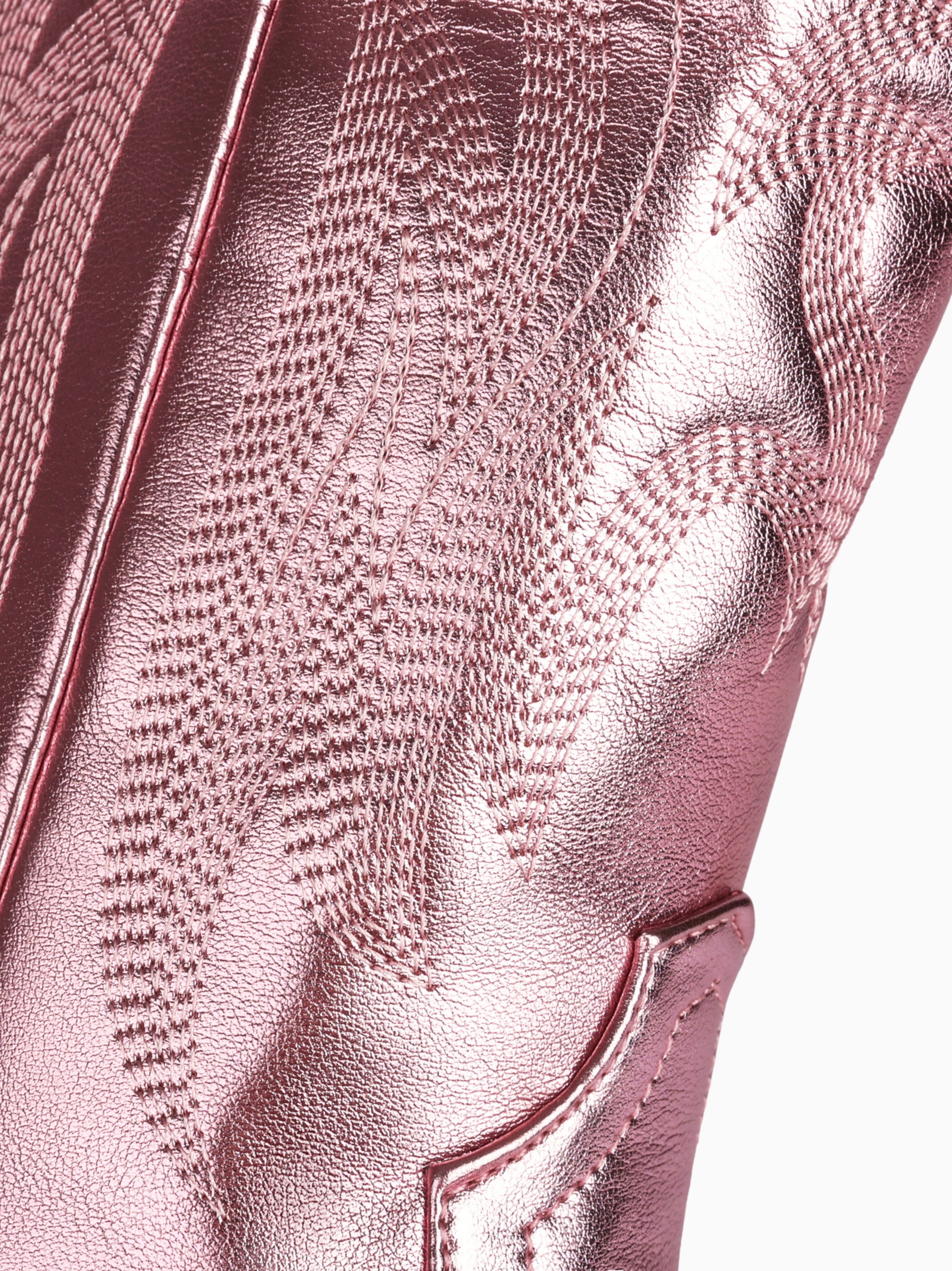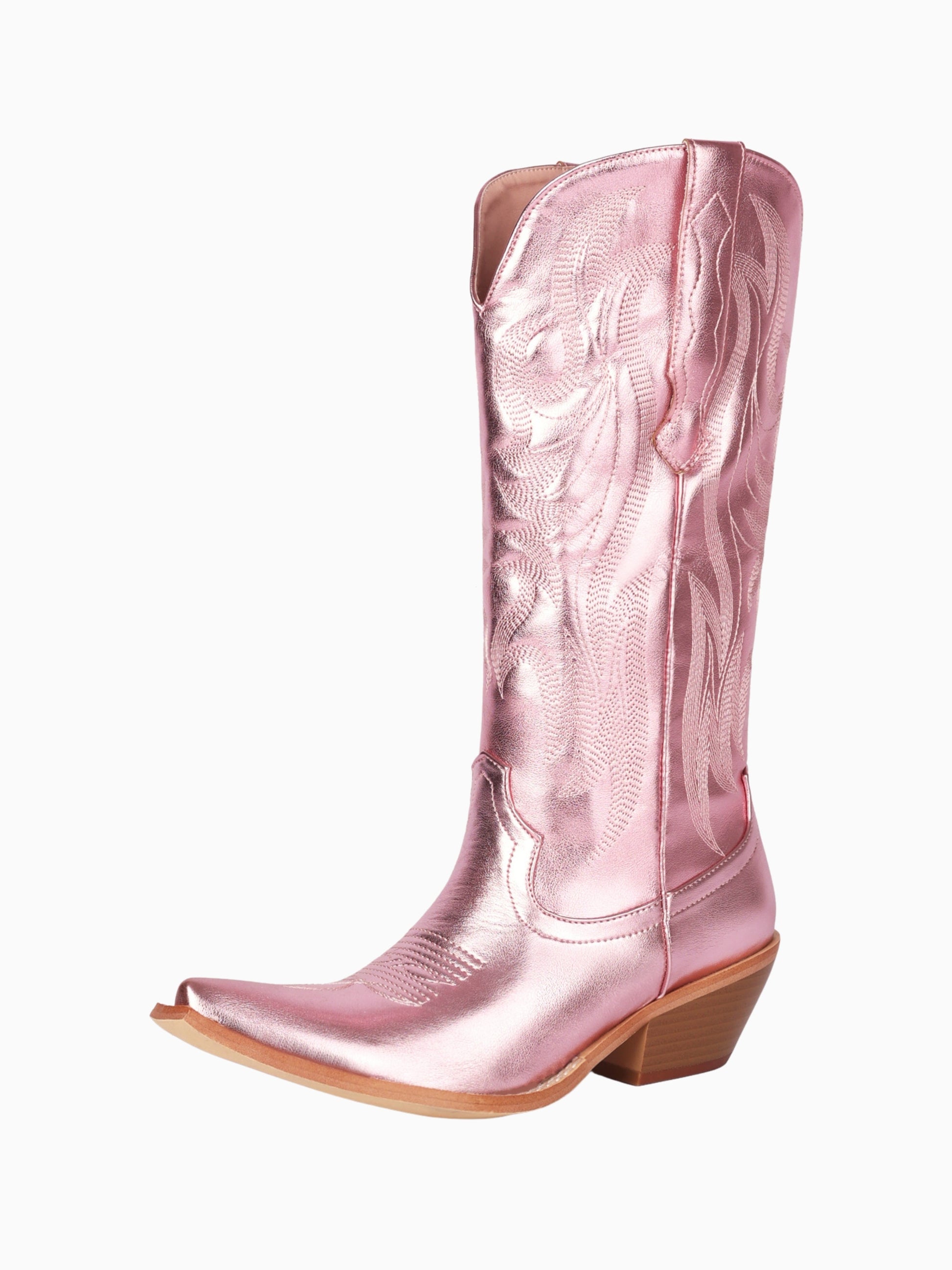 Glamorous metallic pink cowgirl boots featuring embroidered Western patterns, crafted with a snip toe and lustrous finish for a statement-making style.