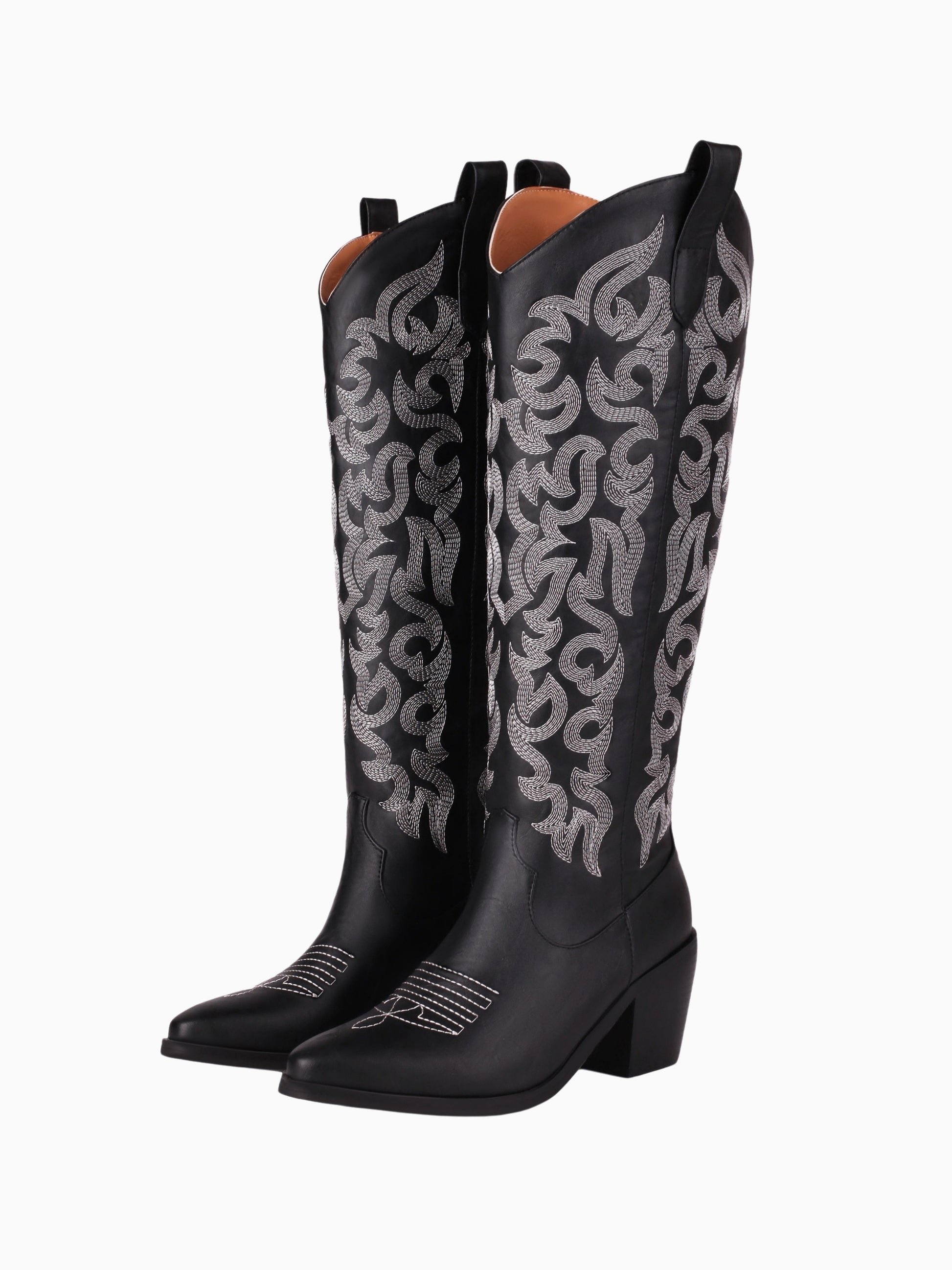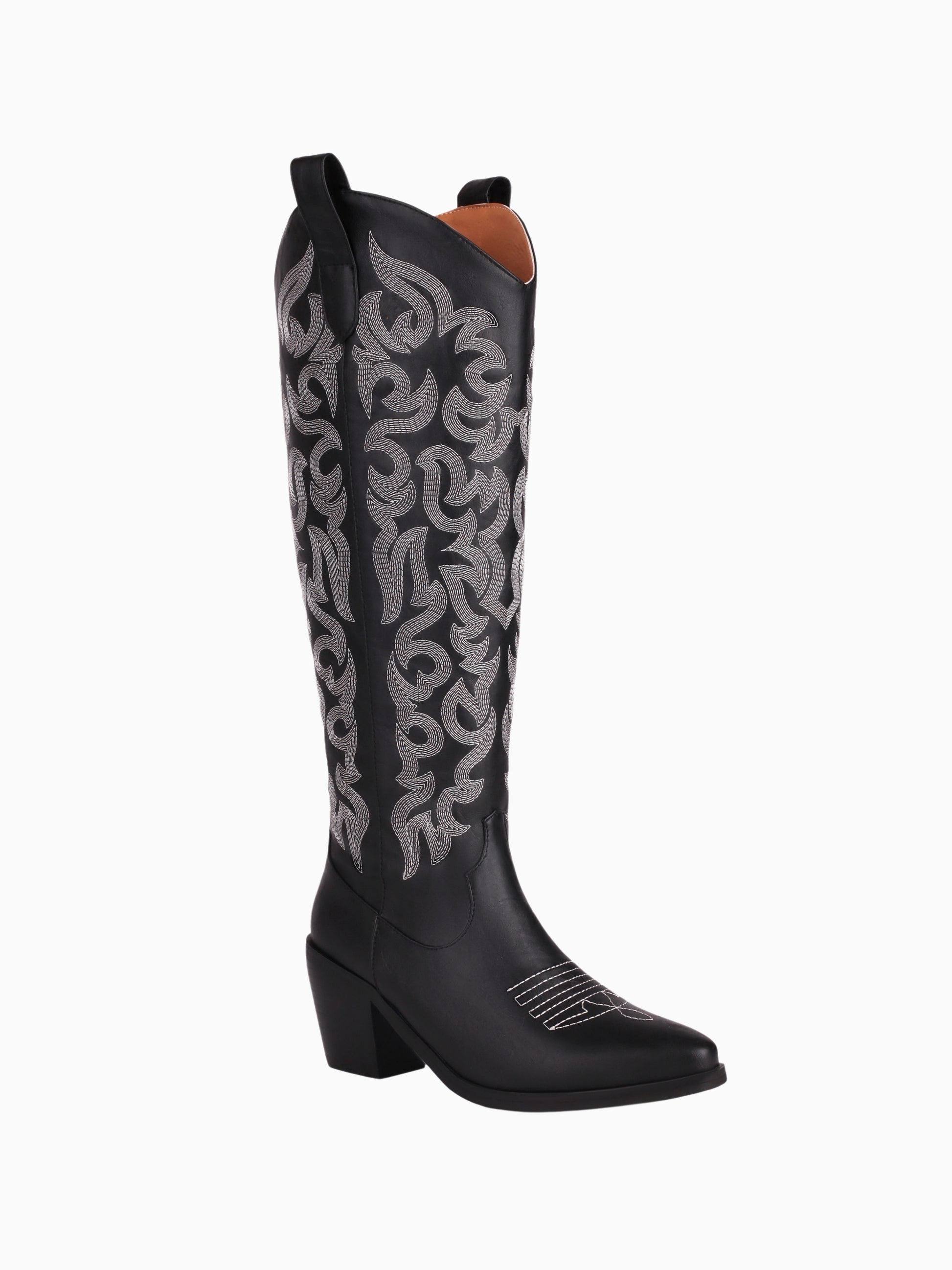 Elegant black cowgirl boots featuring intricate silver swirl embroidery and all-over pattern, creating a sophisticated Western statement.