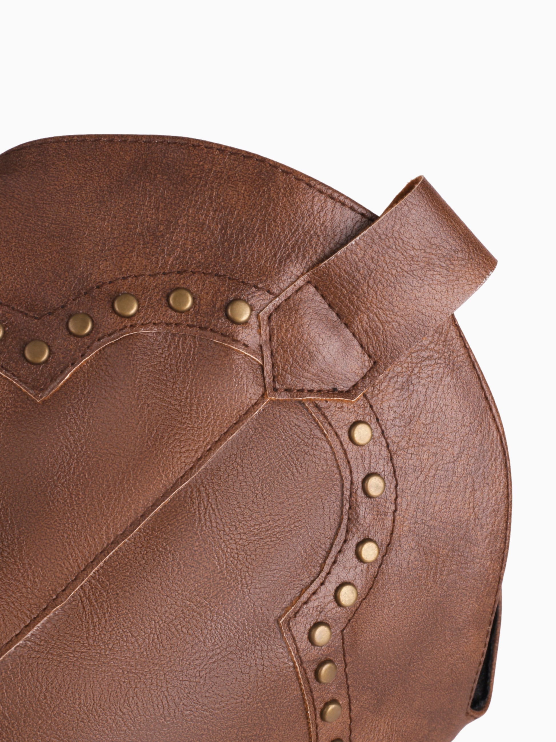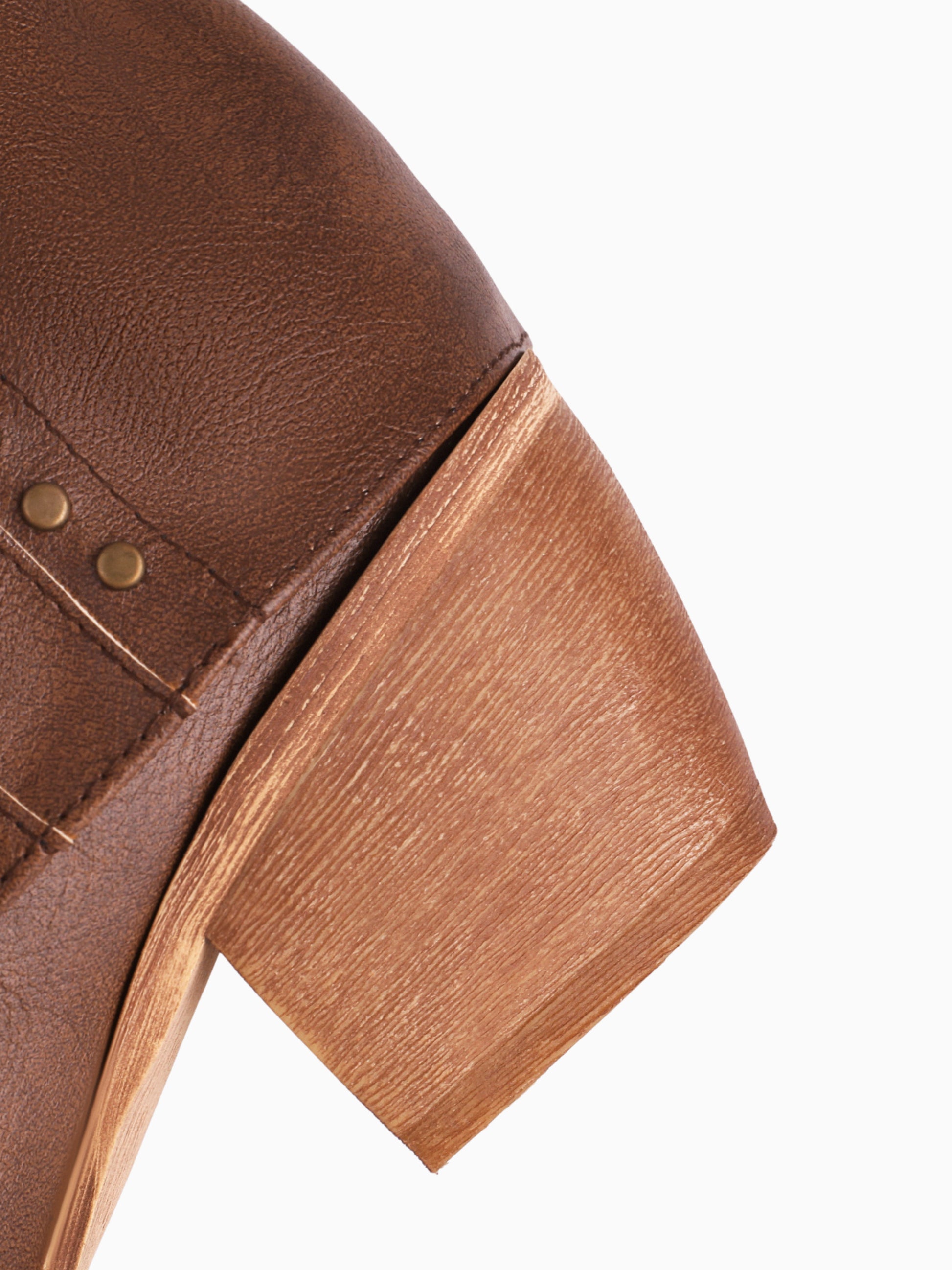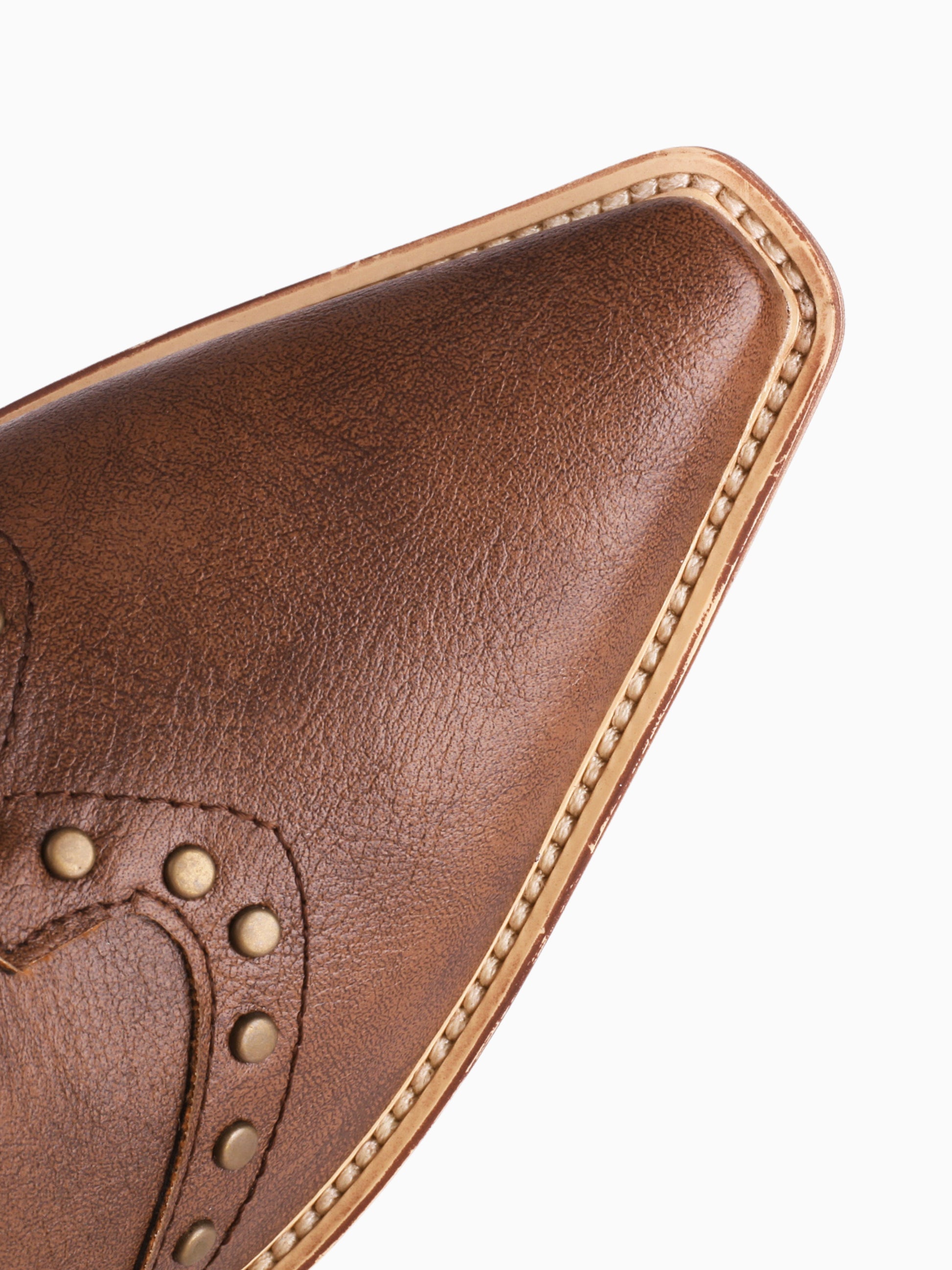 Rustic dark brown western boots feature antique brass rivets, mid-calf length, and clean-lined design, offering a sophisticated take on traditional cowgirl style.