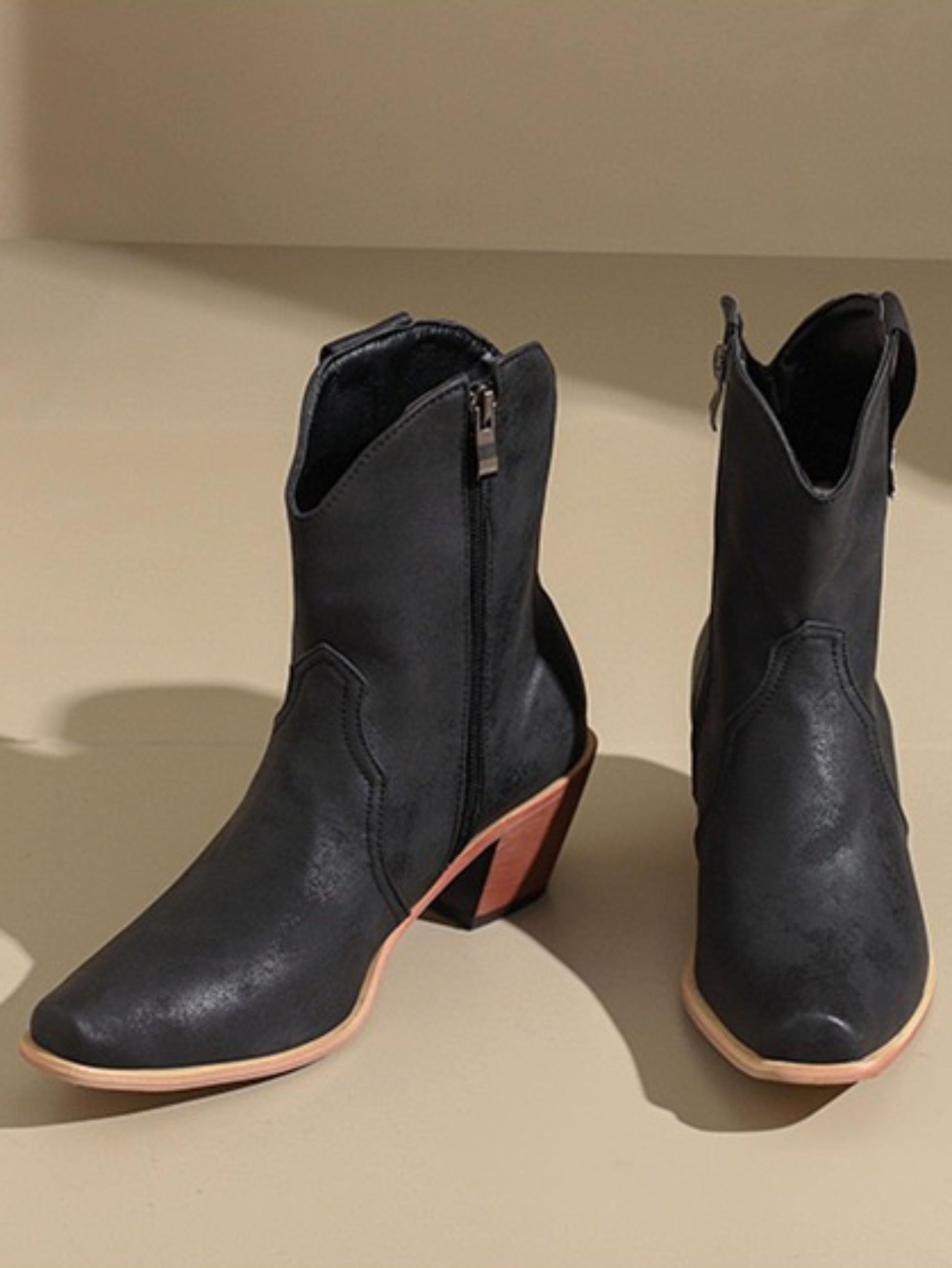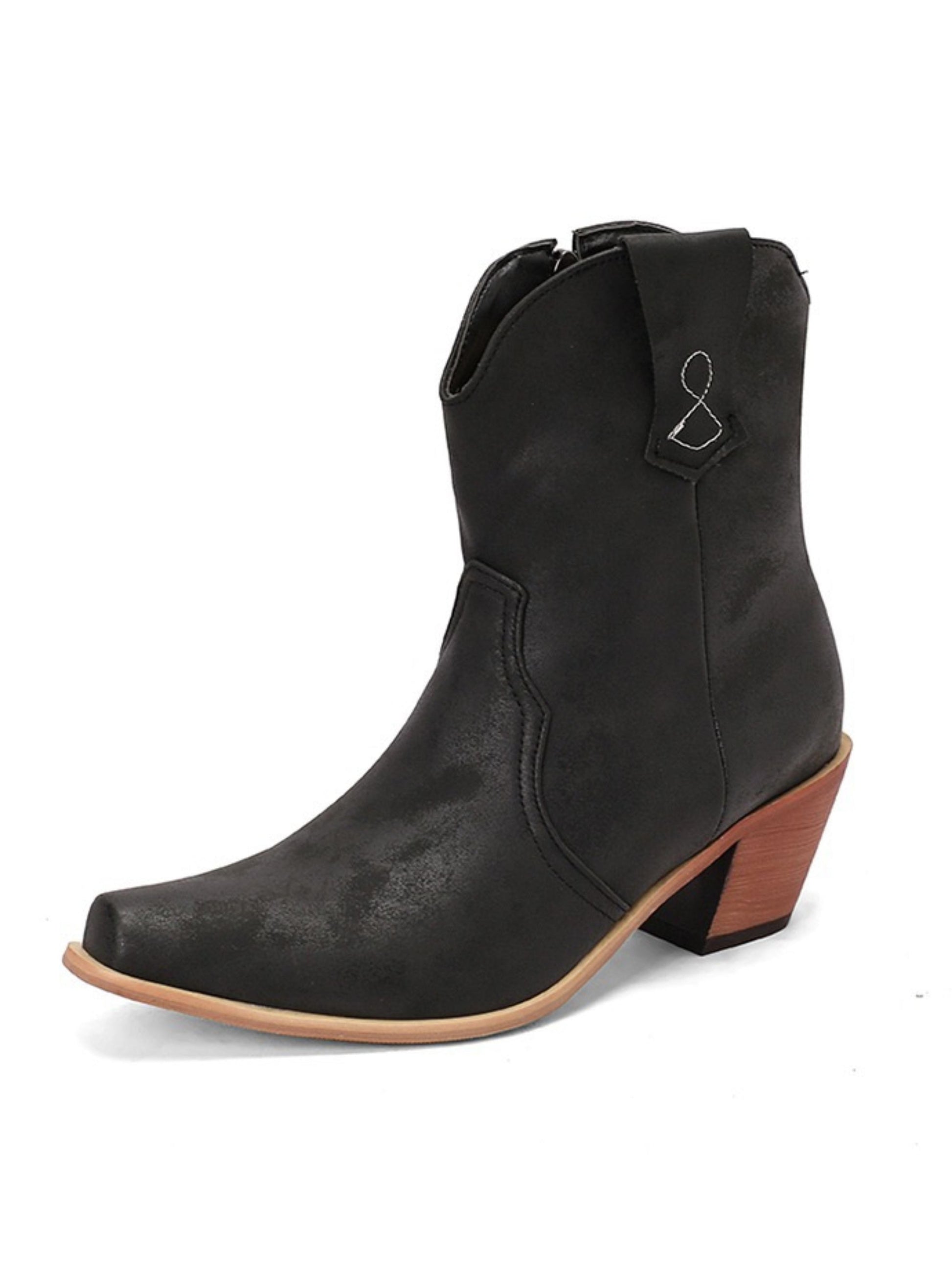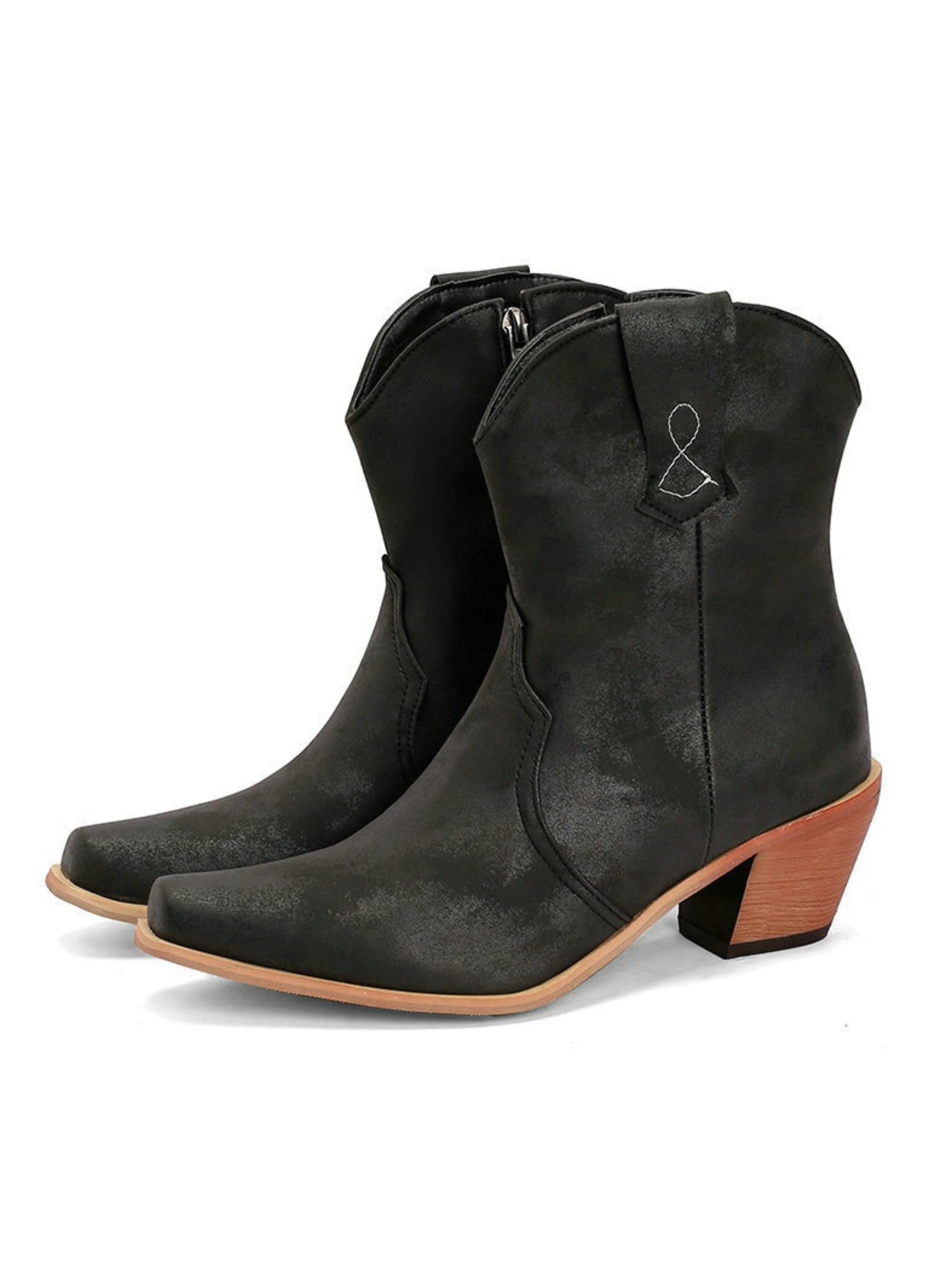 Rustic Wide Calf Chelsea Black Cowgirl Boots feature a comfy mid-heel and a snip toe.