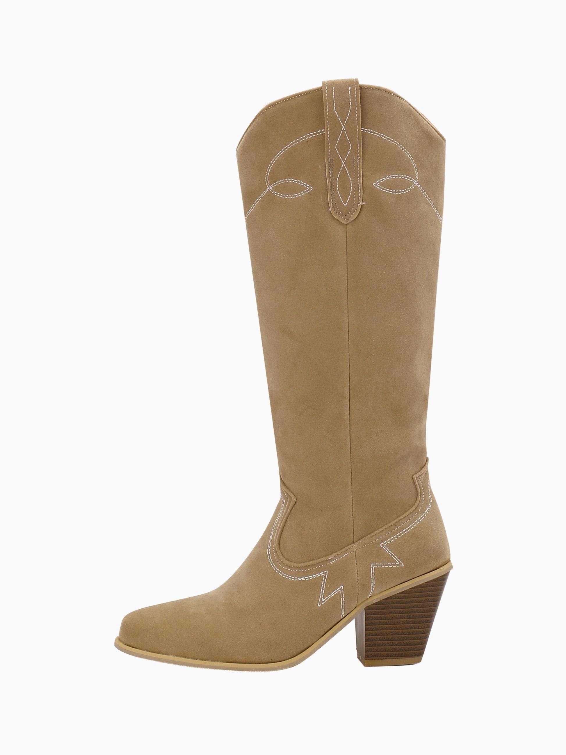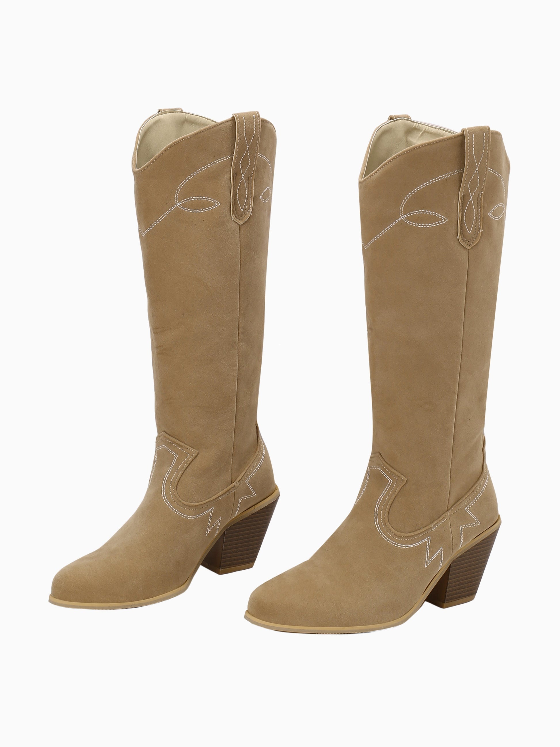 These Rustic Vintage Tan Cowgirl Boots showcase a stunning knee-high design with elegant western stitching. Their warm tan color and chunky stacked heel perfectly balance traditional ranch charm with modern fashion flair.