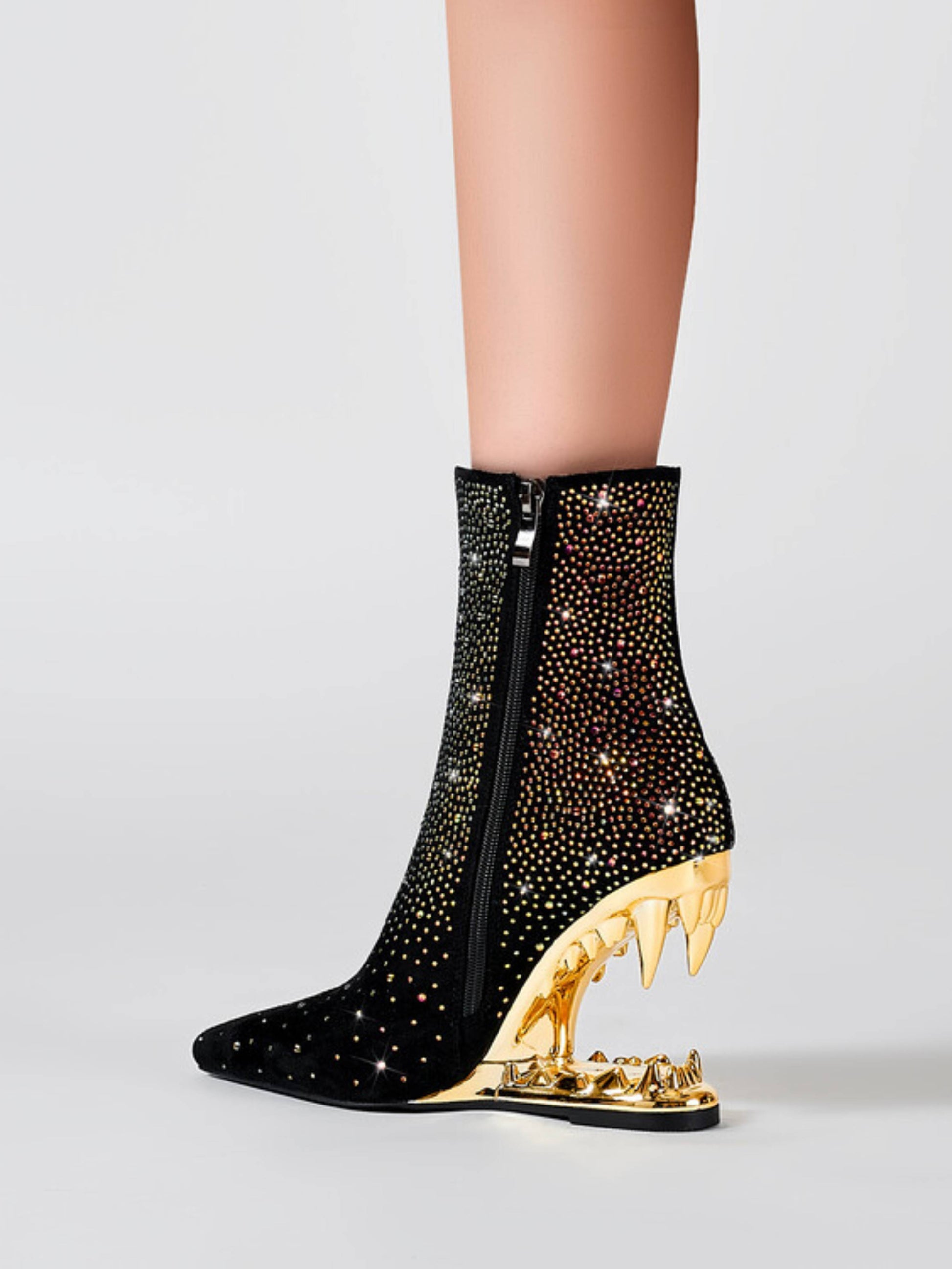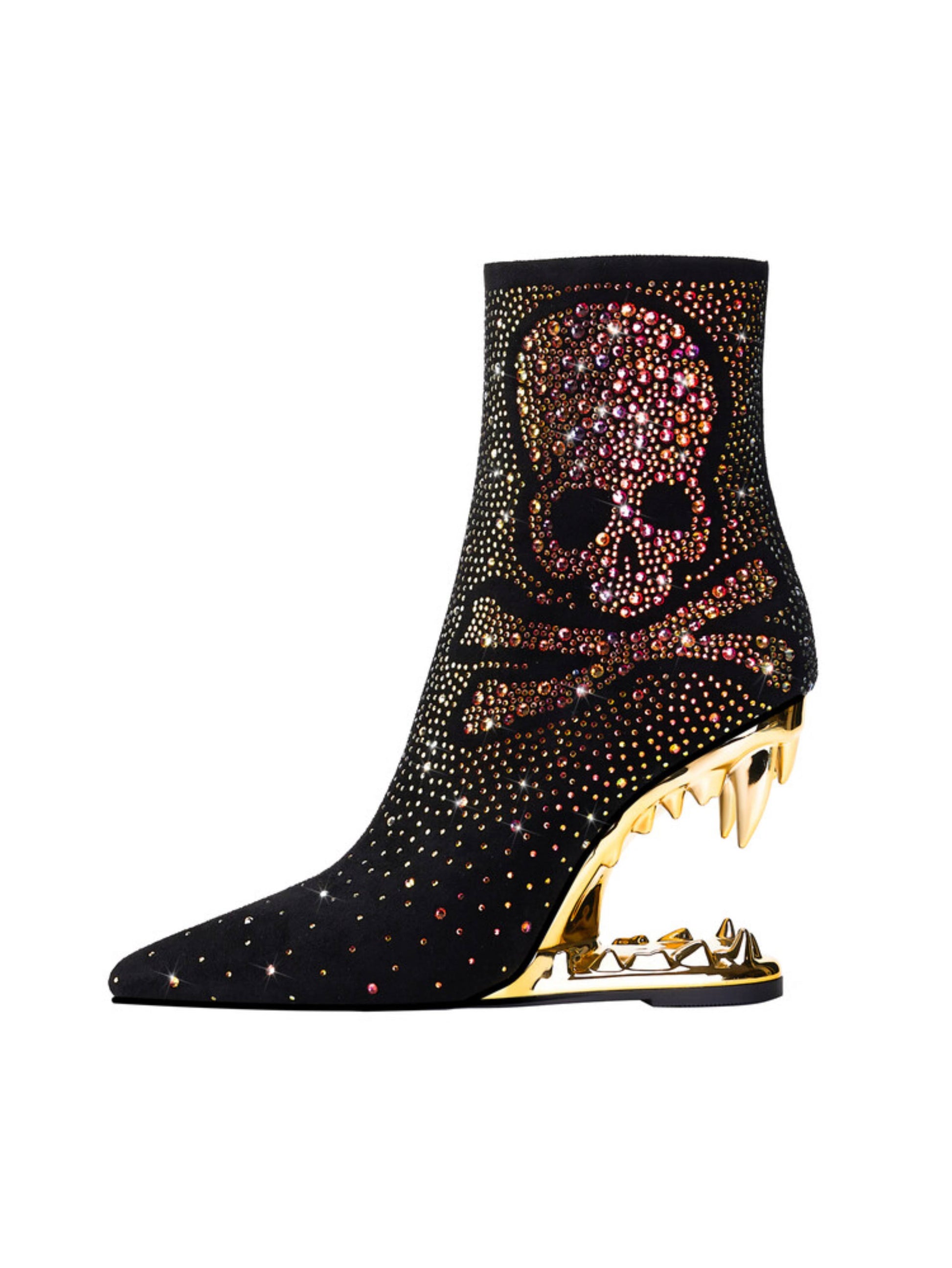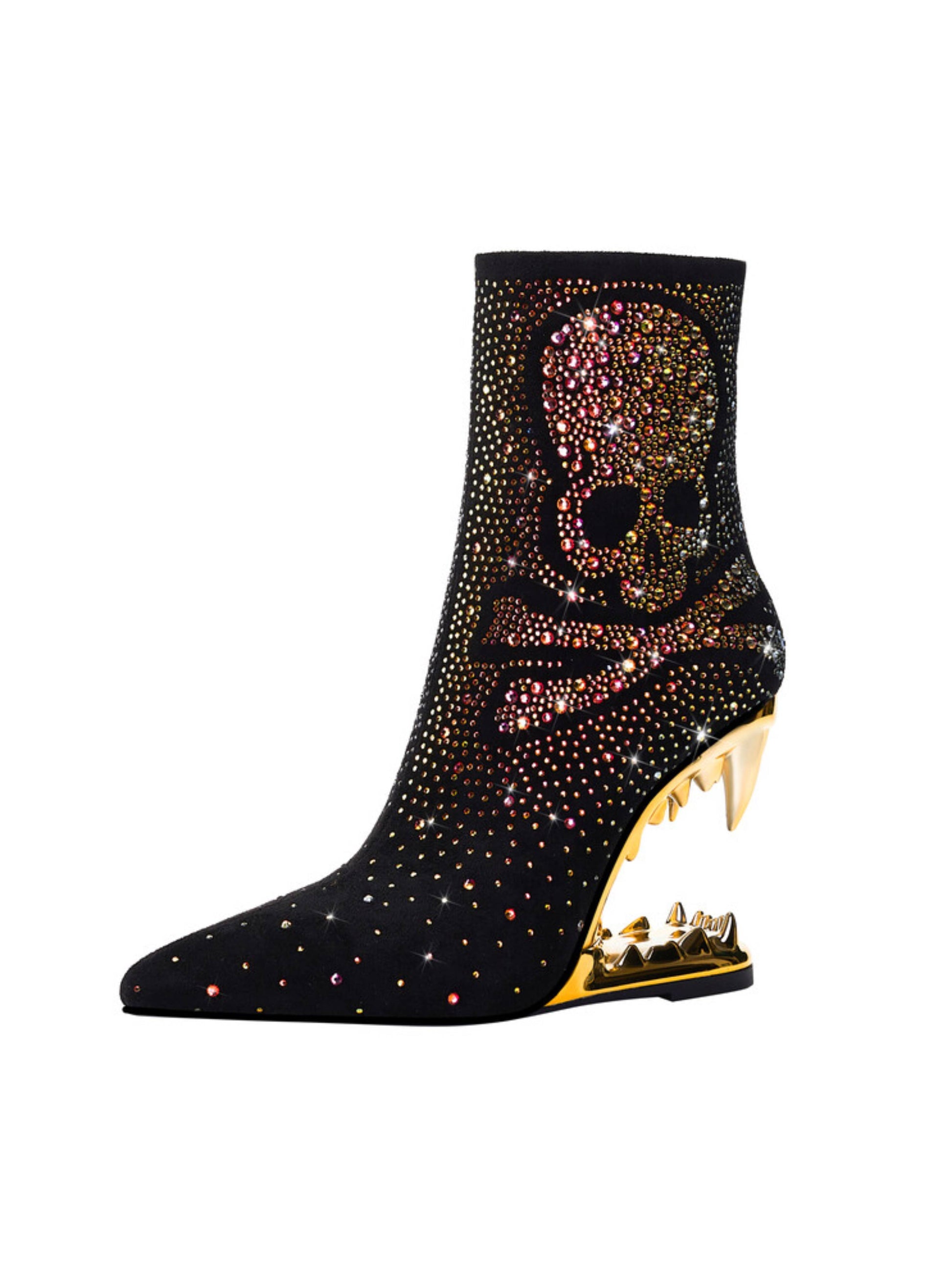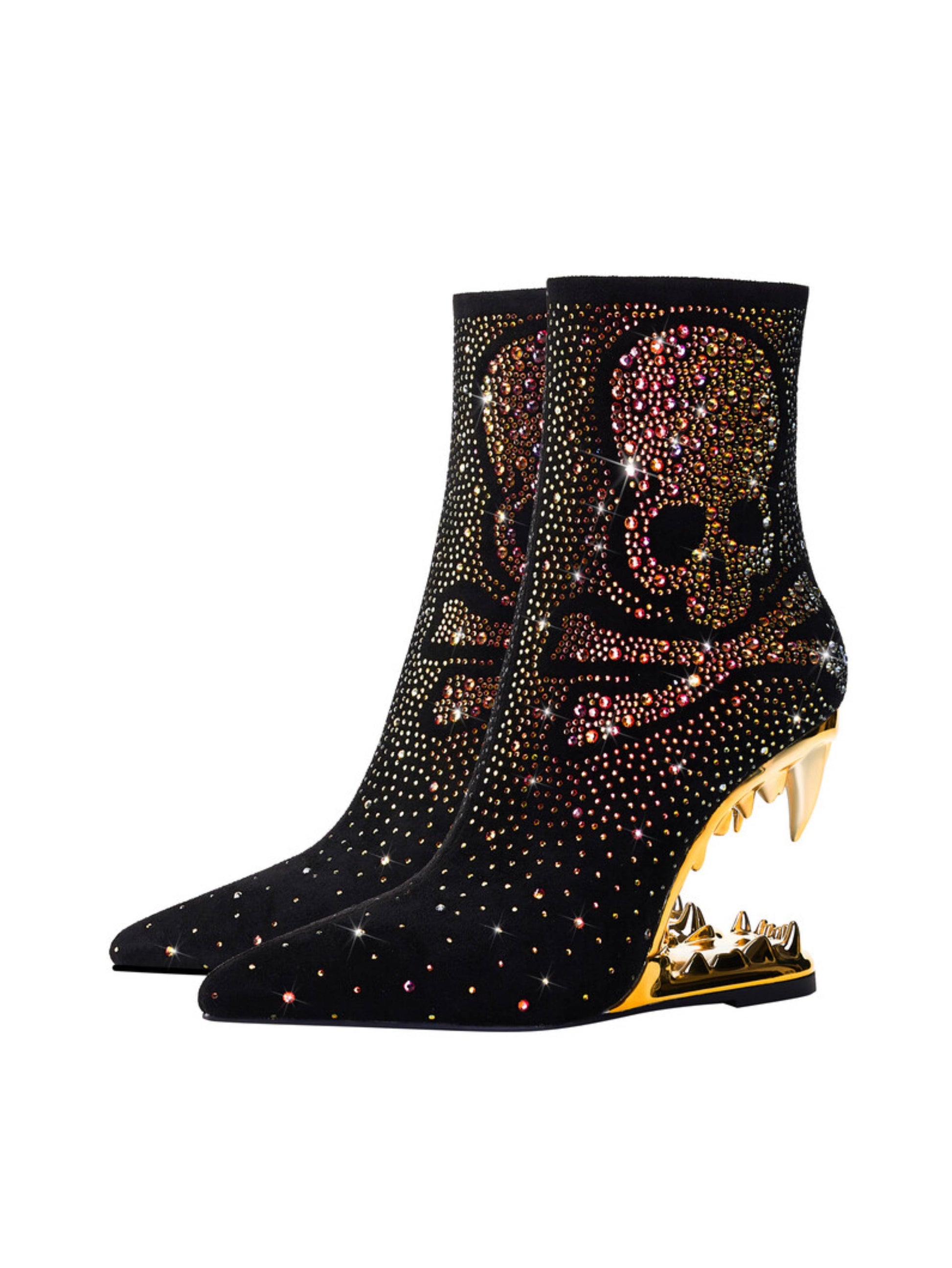 Bold black and gold cowgirl boots featuring rhinestone skeleton details, dramatic teeth high heels, and edgy western style. These statement gothic boots blend sparkling embellishments with unique sculptural heels, ideal for rhinestone cowboy boots and alternative skull embellished western footwear enthusiasts.