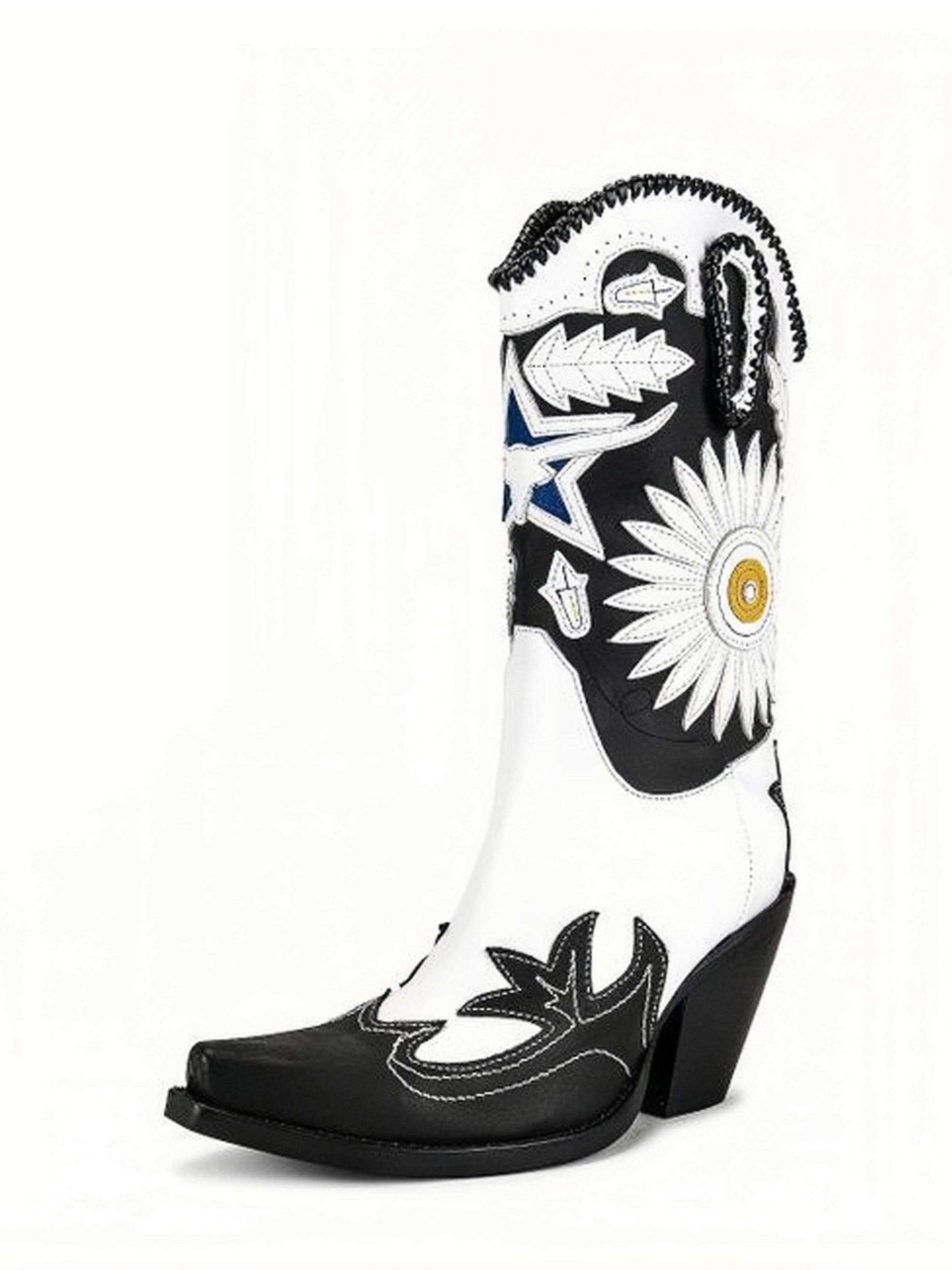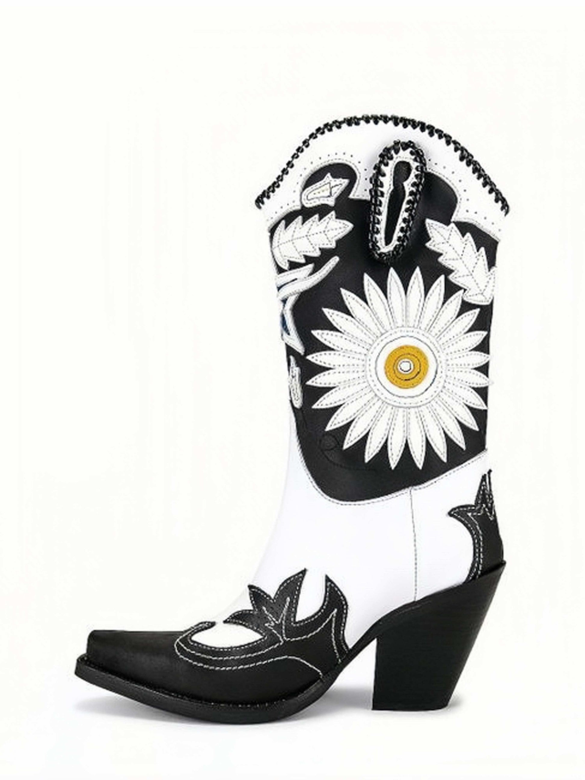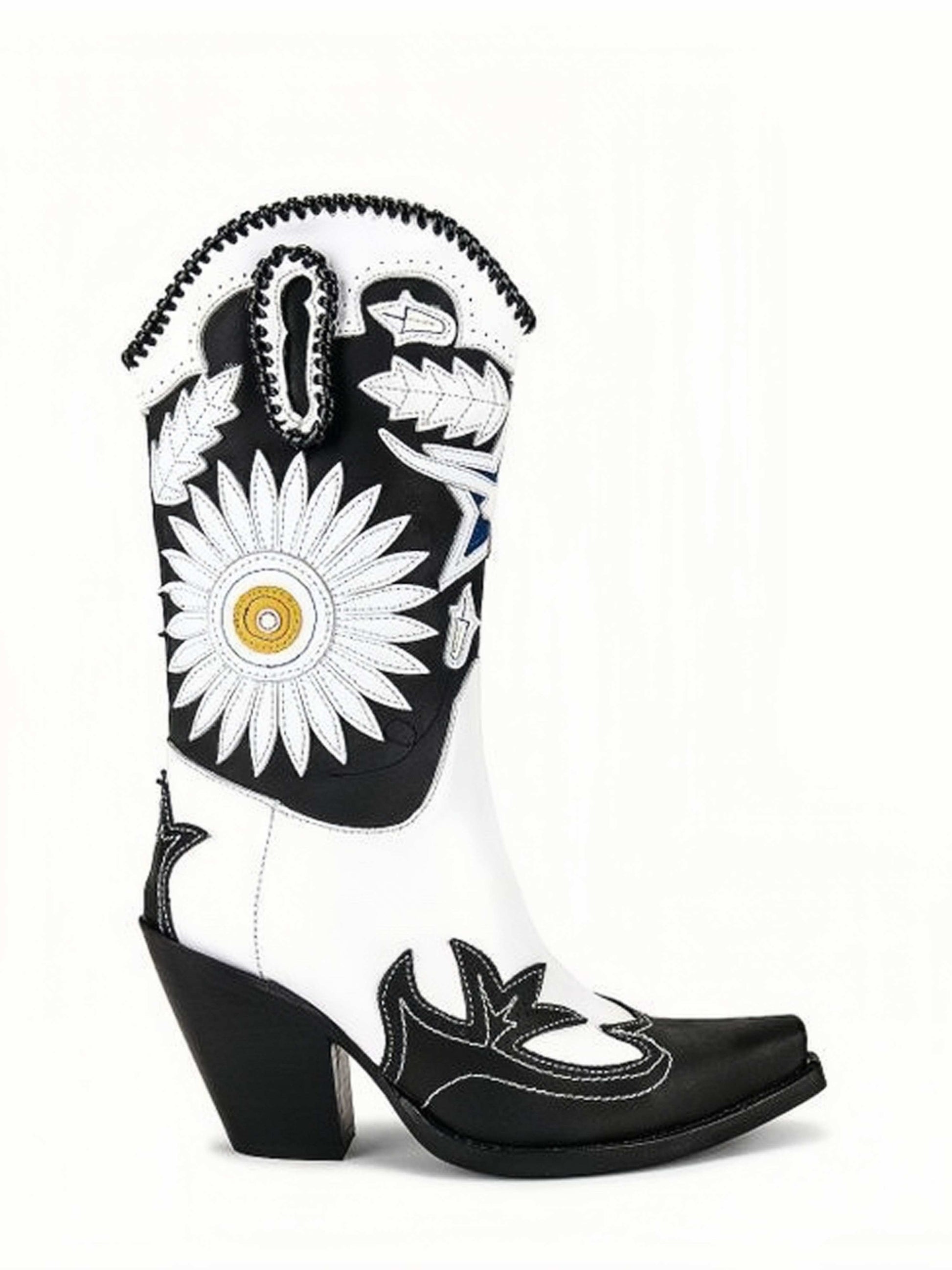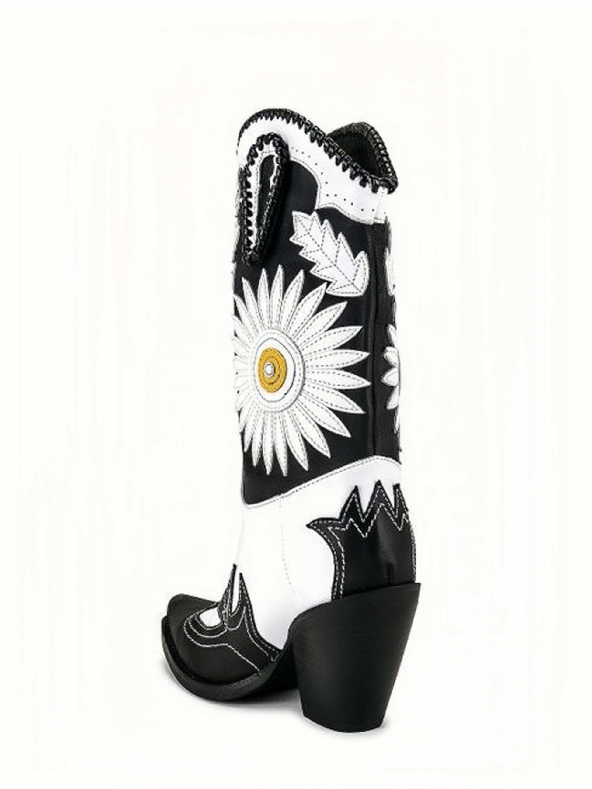 White and Black Short Personalized Sunflower Cowgirl Boots feature a squared snip toe, a big sunflower, and a classic white and black color match.