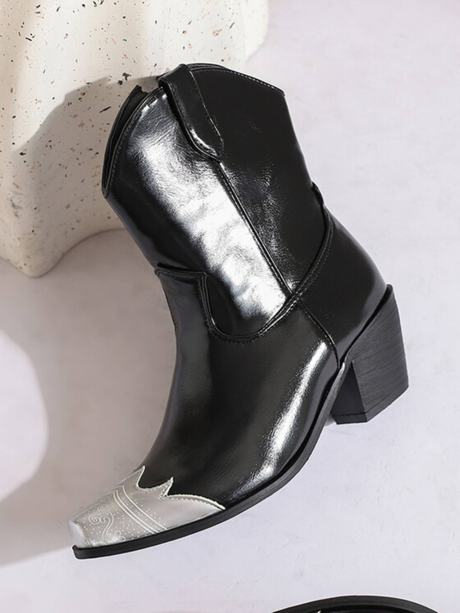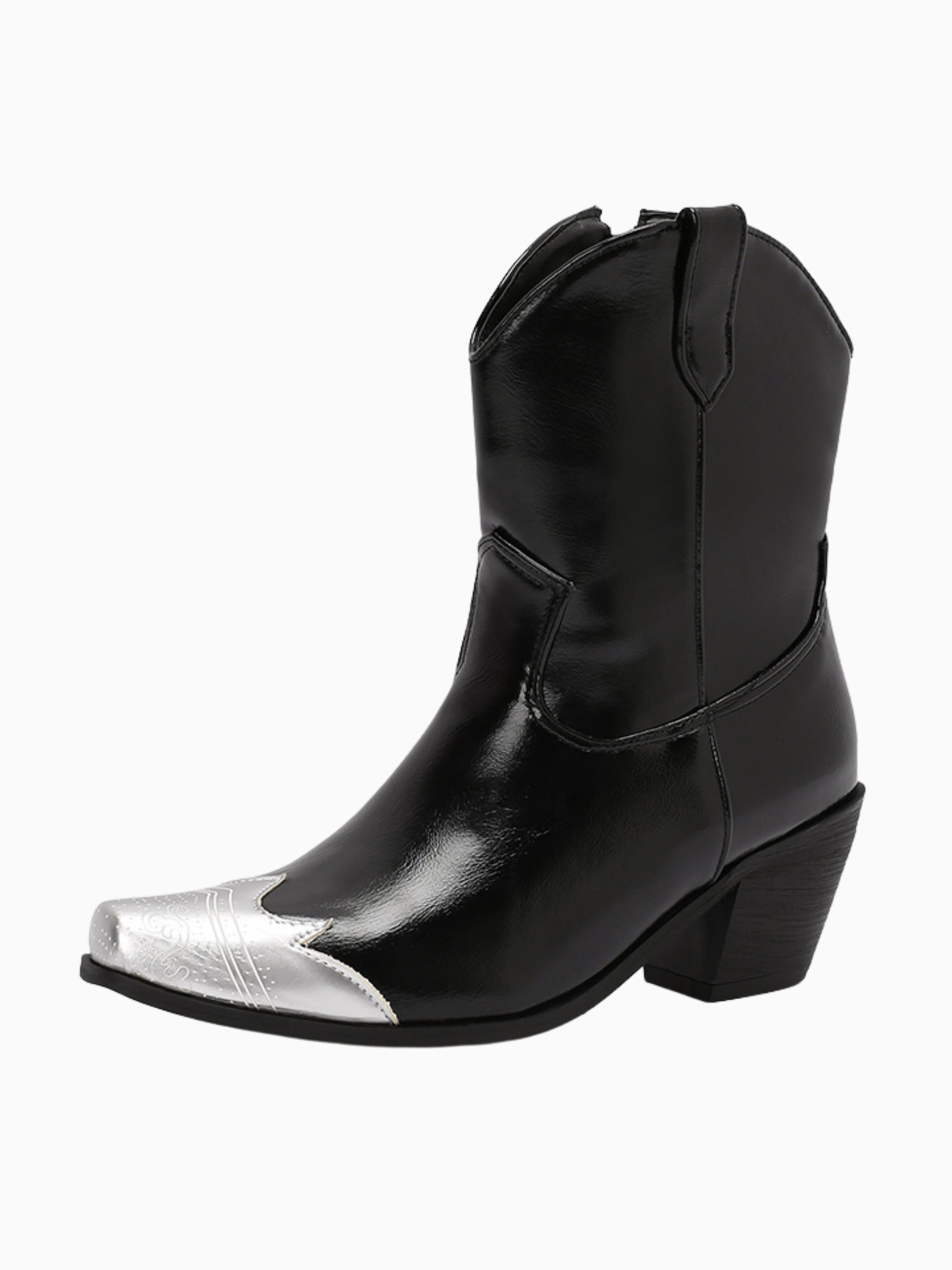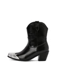 Sleek black ankle boots feature eye-catching silver metallic toe caps and western-inspired design, perfect for modern cowgirl style.