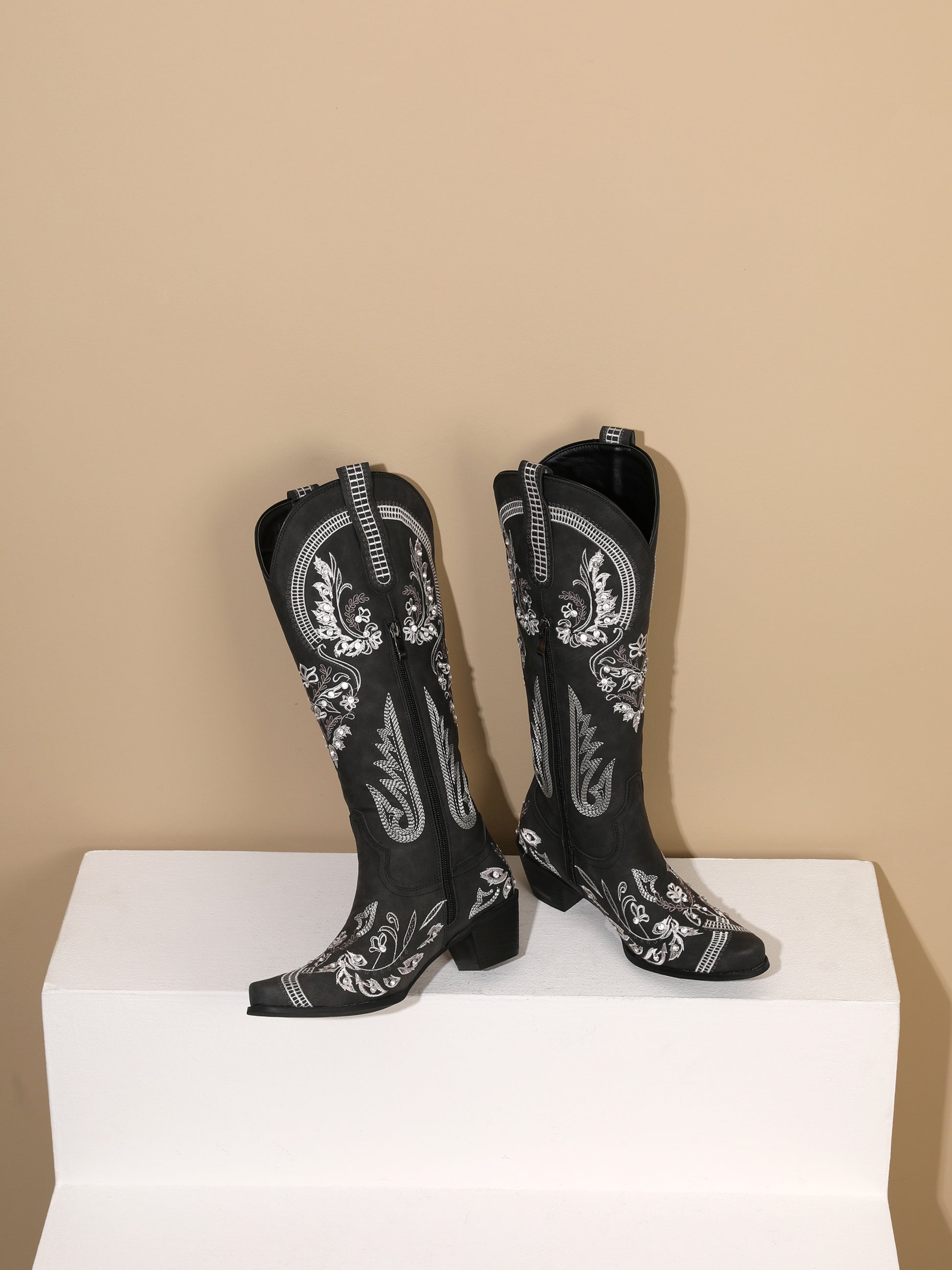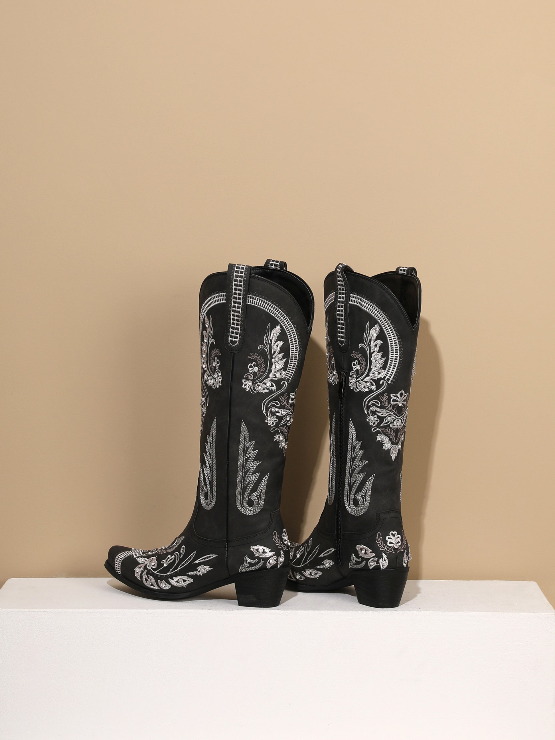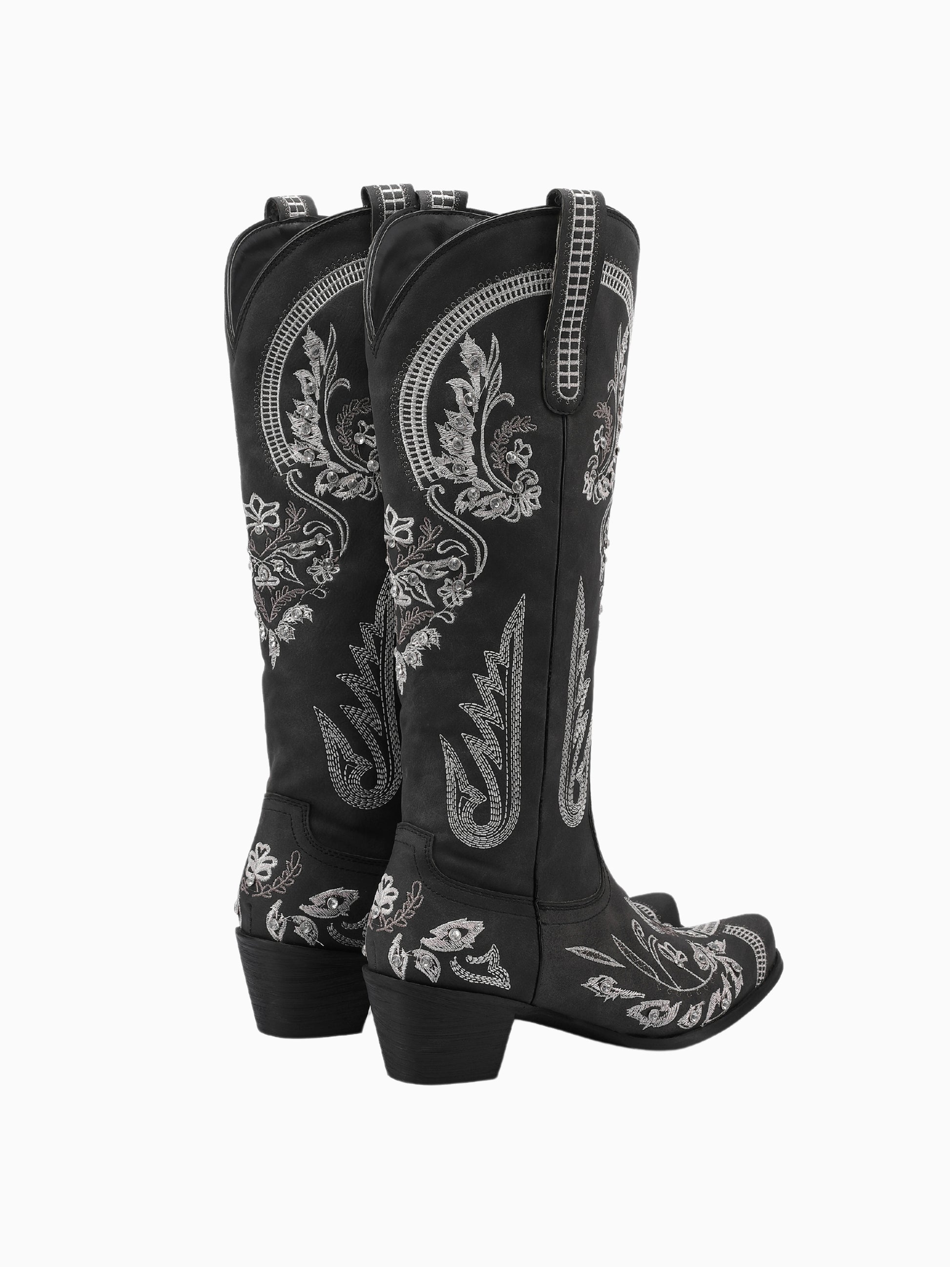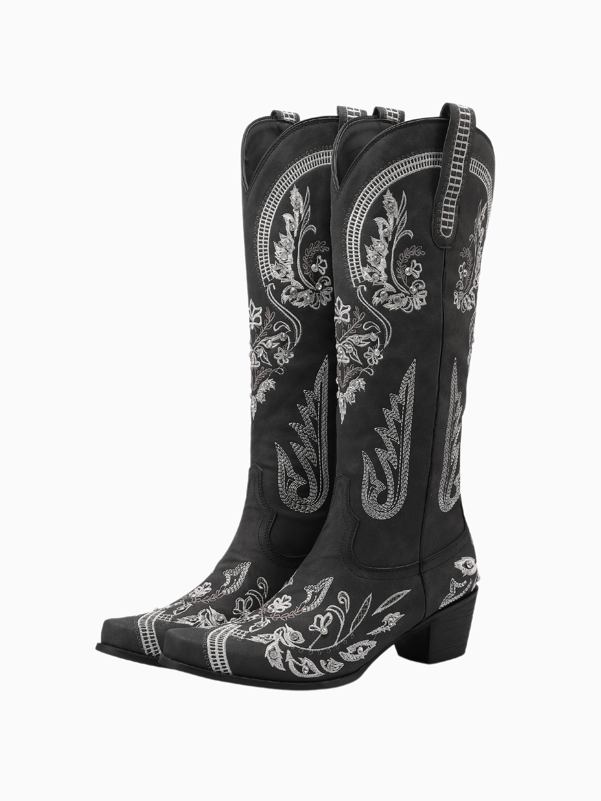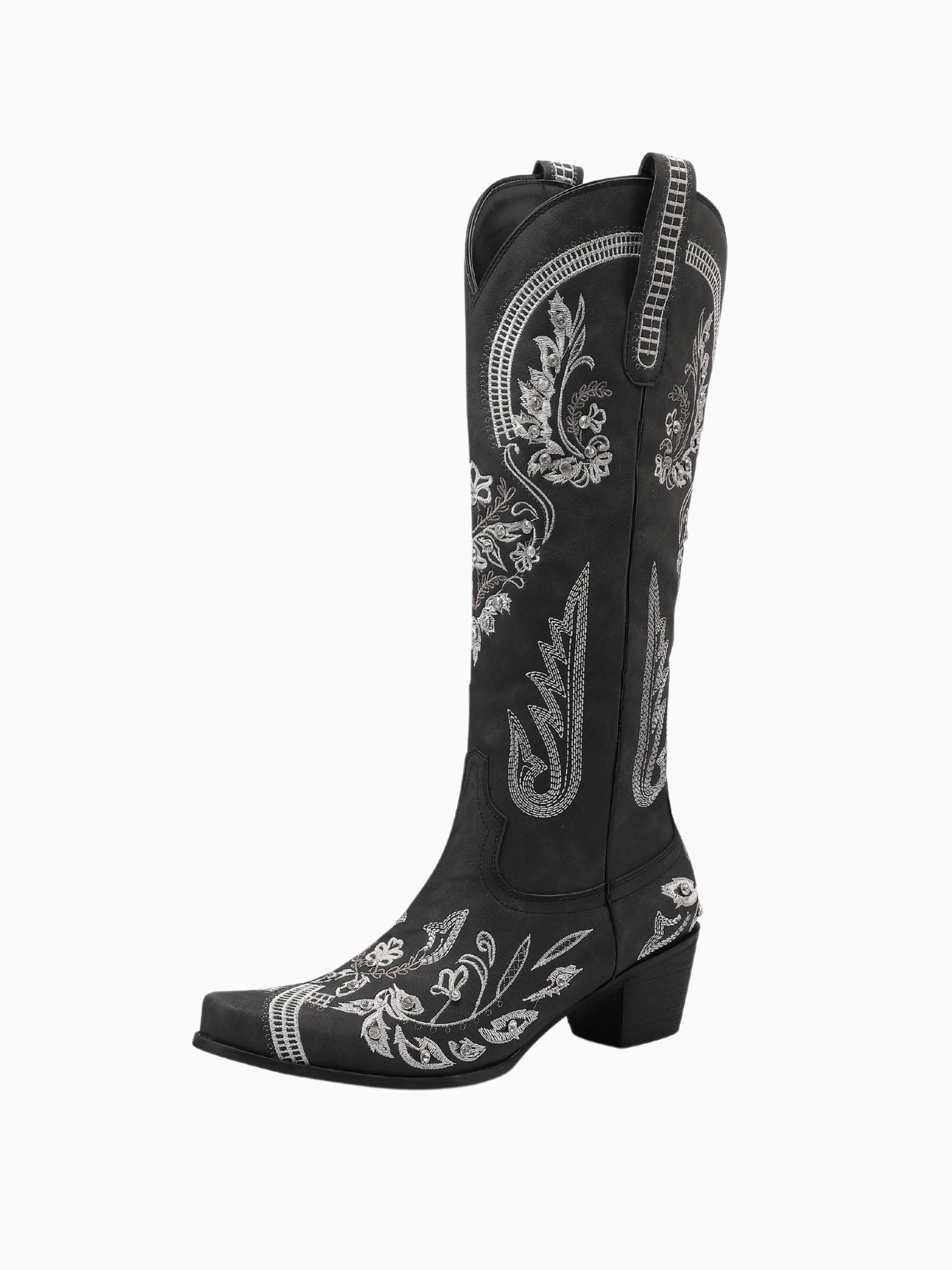 Classic black western boots adorned with intricate silver vine embroidery, mid-calf length, and floral motifs, create an elegant evening-ready statement.