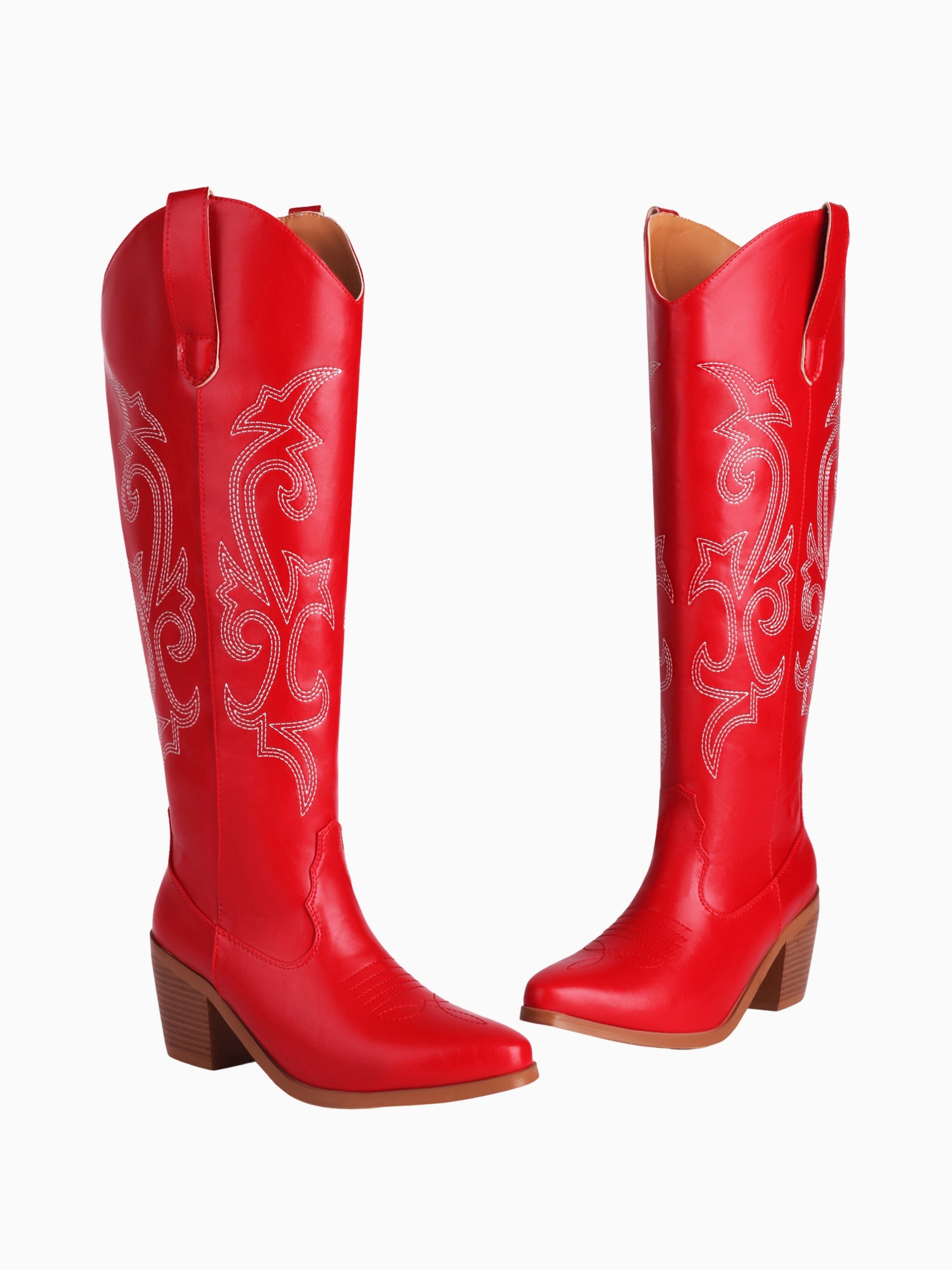 Embroidered Knee-High Red Cowgirl Boots Pointed Toe