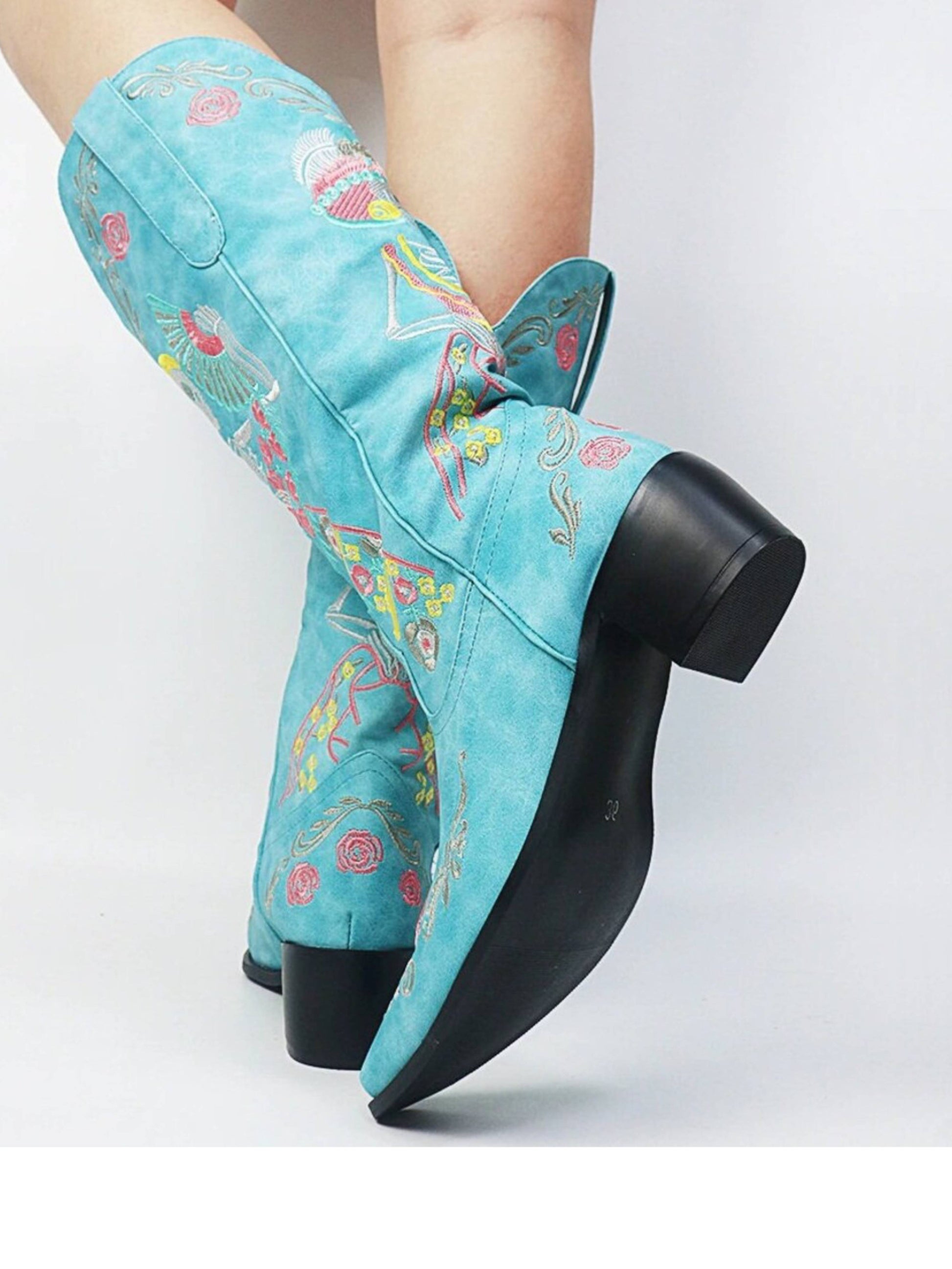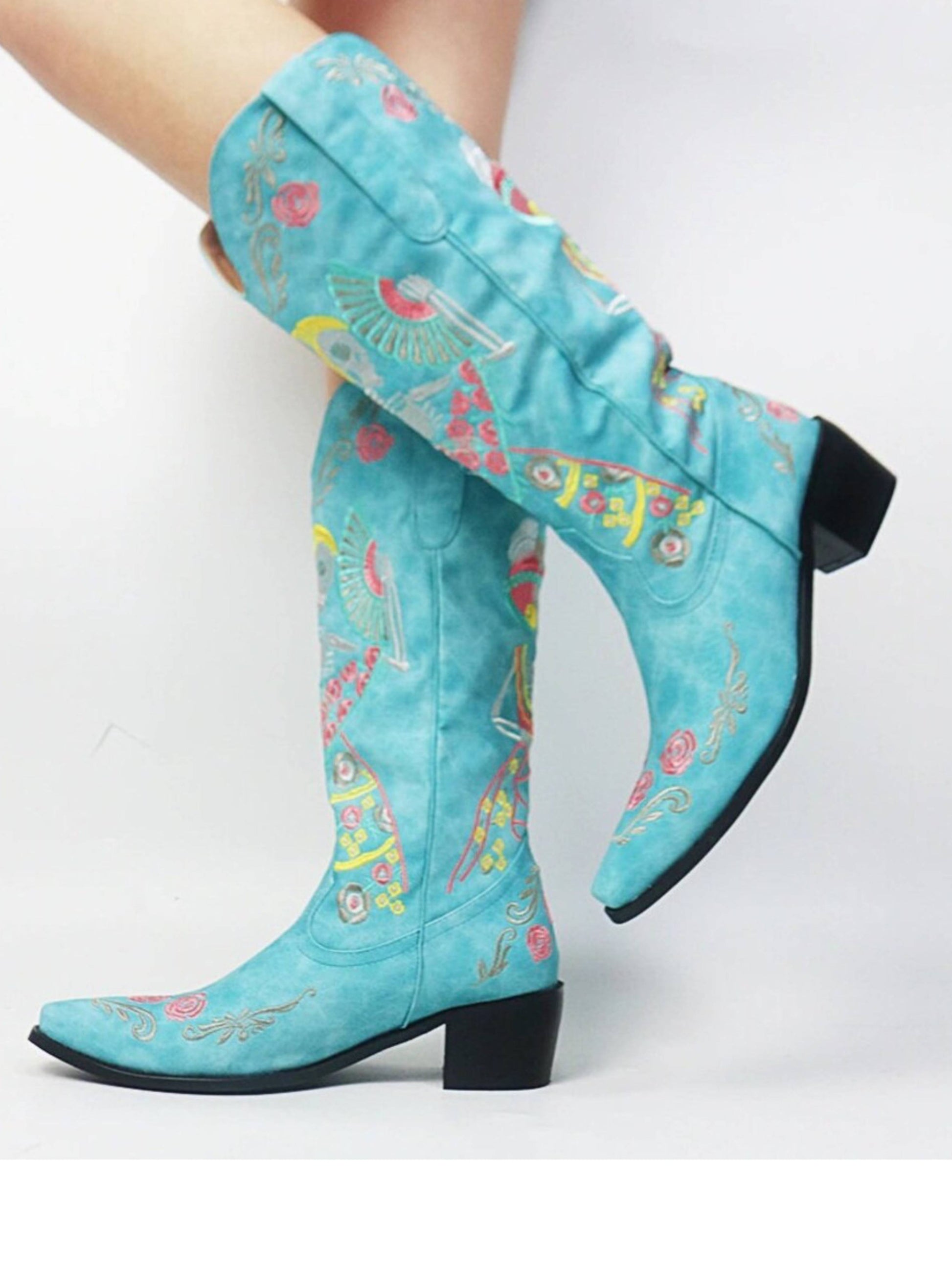 Skeleton Snip Toe Block Heel Blue Mid-Calf Cowgirl Boots feature multicolor skeleton embroidery, distressed, and wide-calf design.