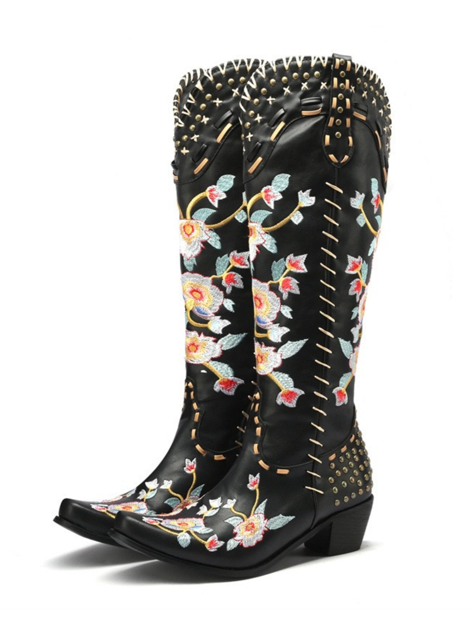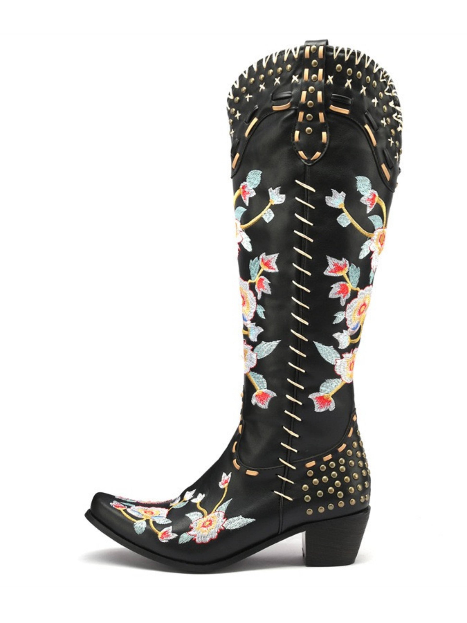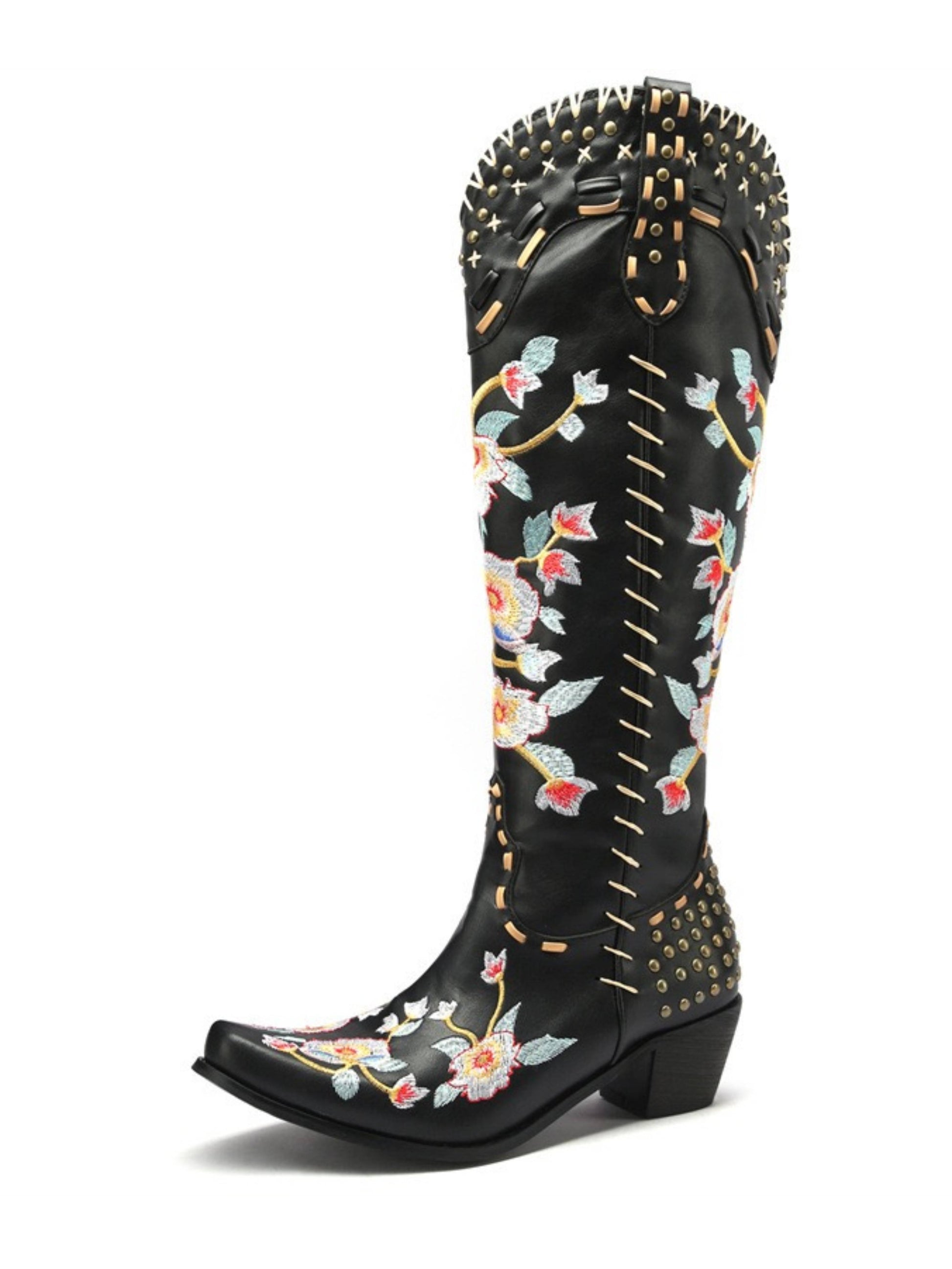 Snip Toe Flower Knee-High Studded Black Cowboy Boots for Women