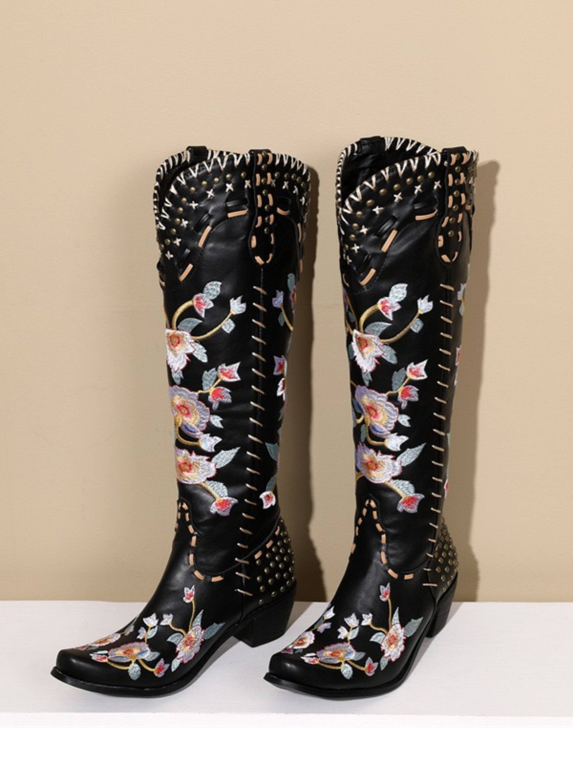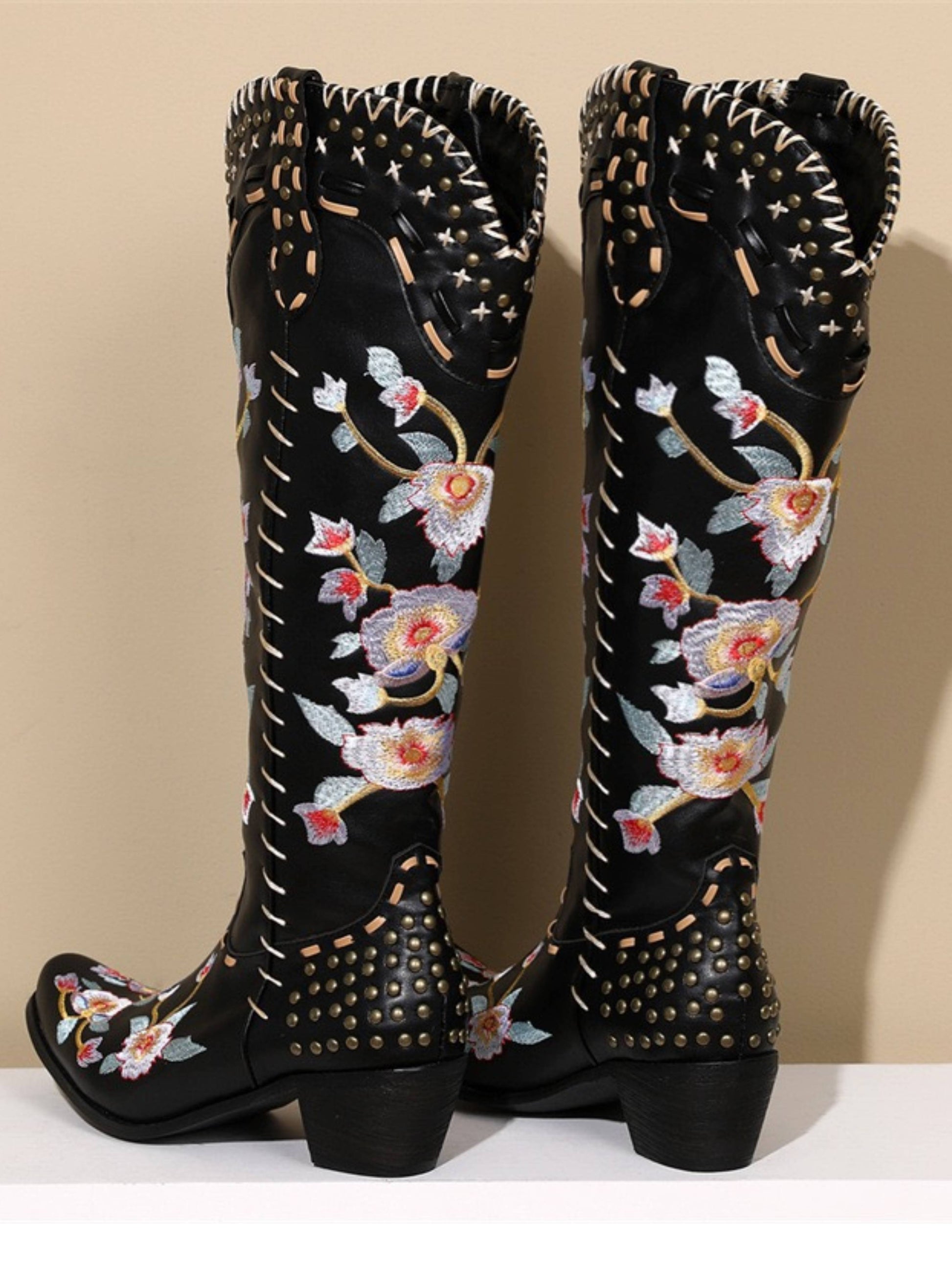 Sleek black cowboy boots rising to the knee, adorned with intricate floral embroidery. The snip toe offers modern edge while maintaining Western authenticity. Metal studs accent the flowers, adding edgy sparkle to feminine details. These statement boots blend biker boldness with ranch tradition—perfect for concerts, festivals, or pairing with denim.