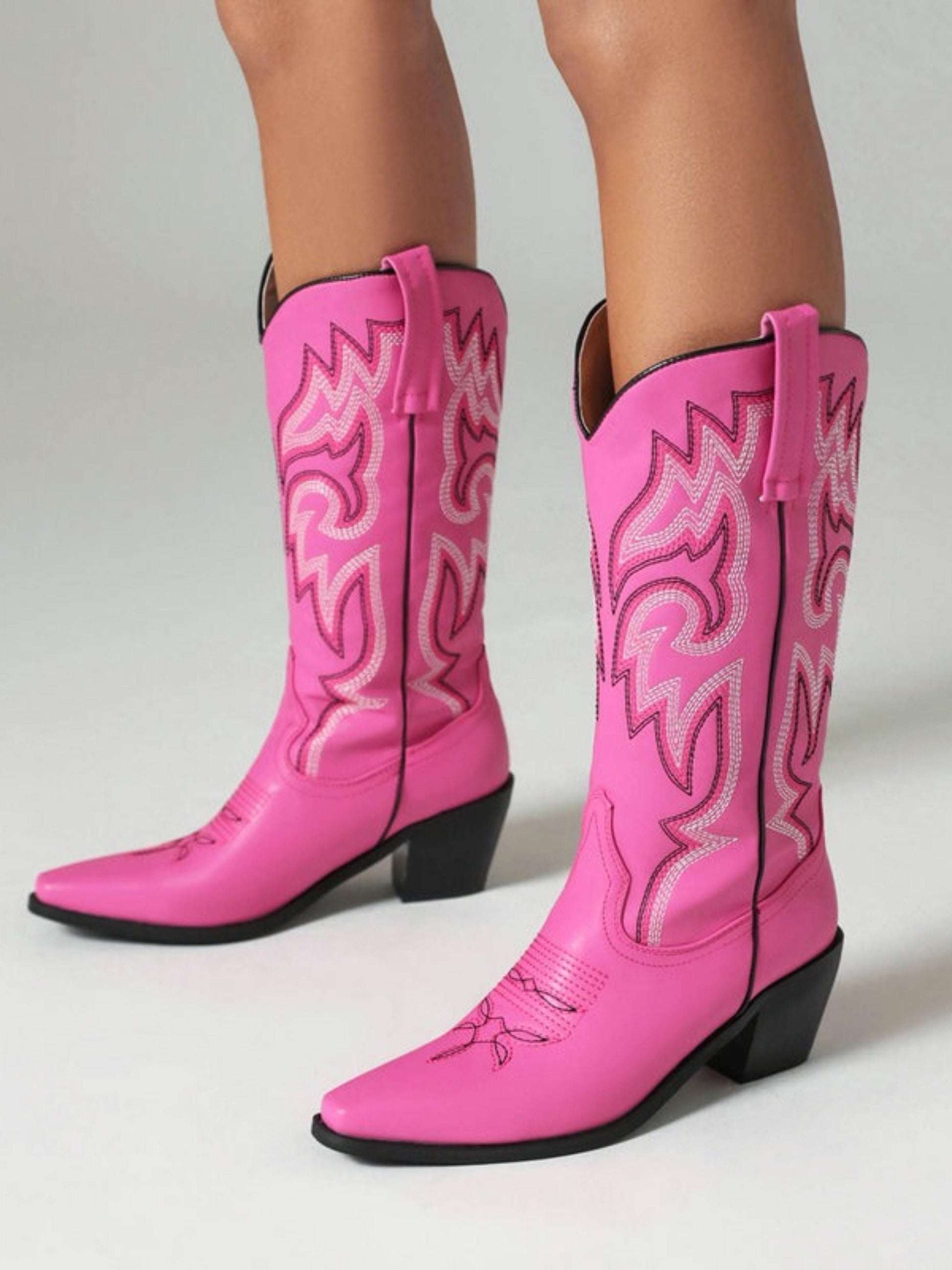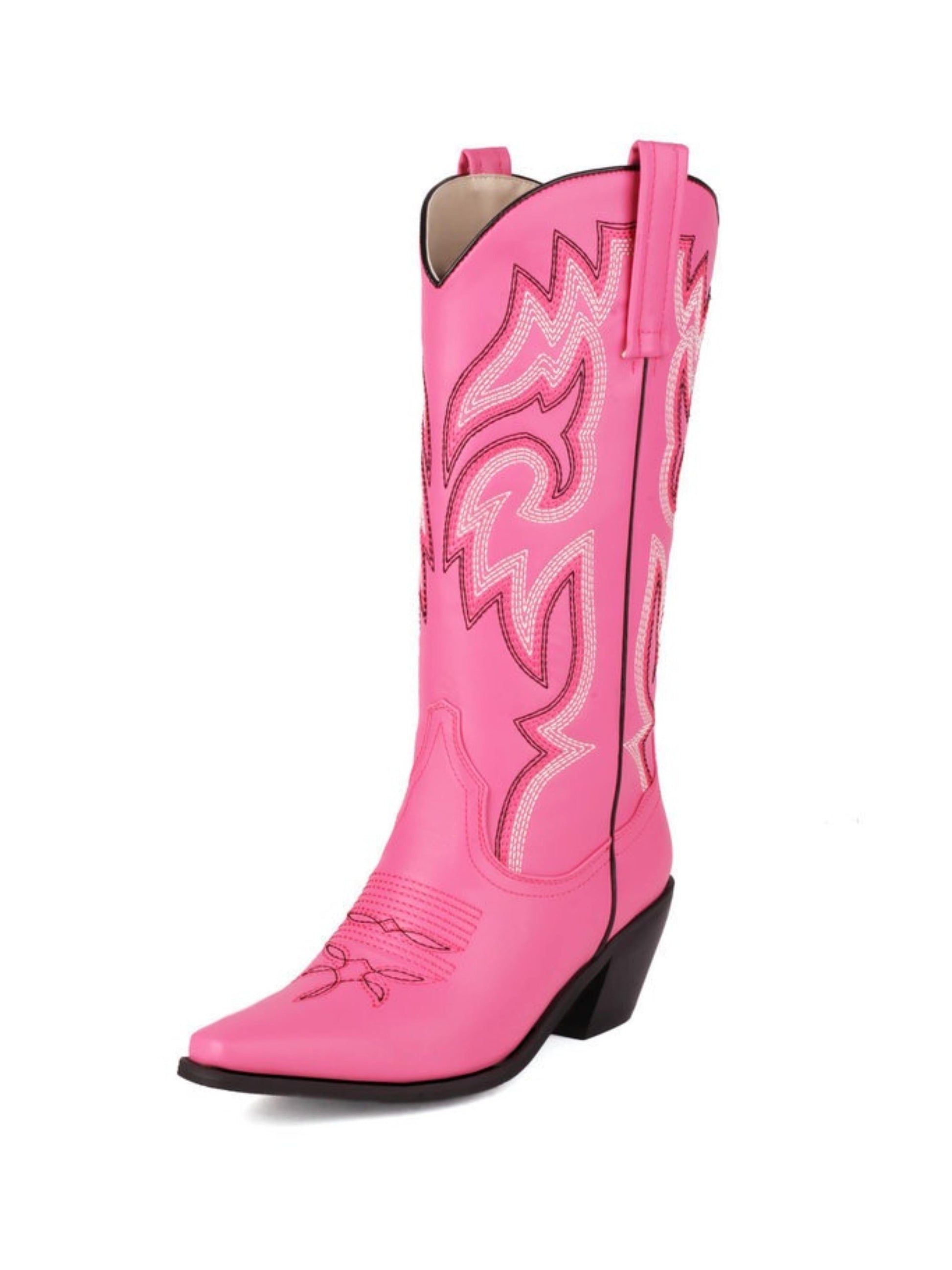 Elegant pink vegan leather boots featuring distinctive snip toes, decorative stitching, embellished shafts, sturdy Western heels, and mid-calf height—combining fashion with cowgirl tradition.