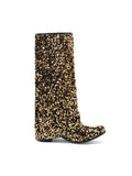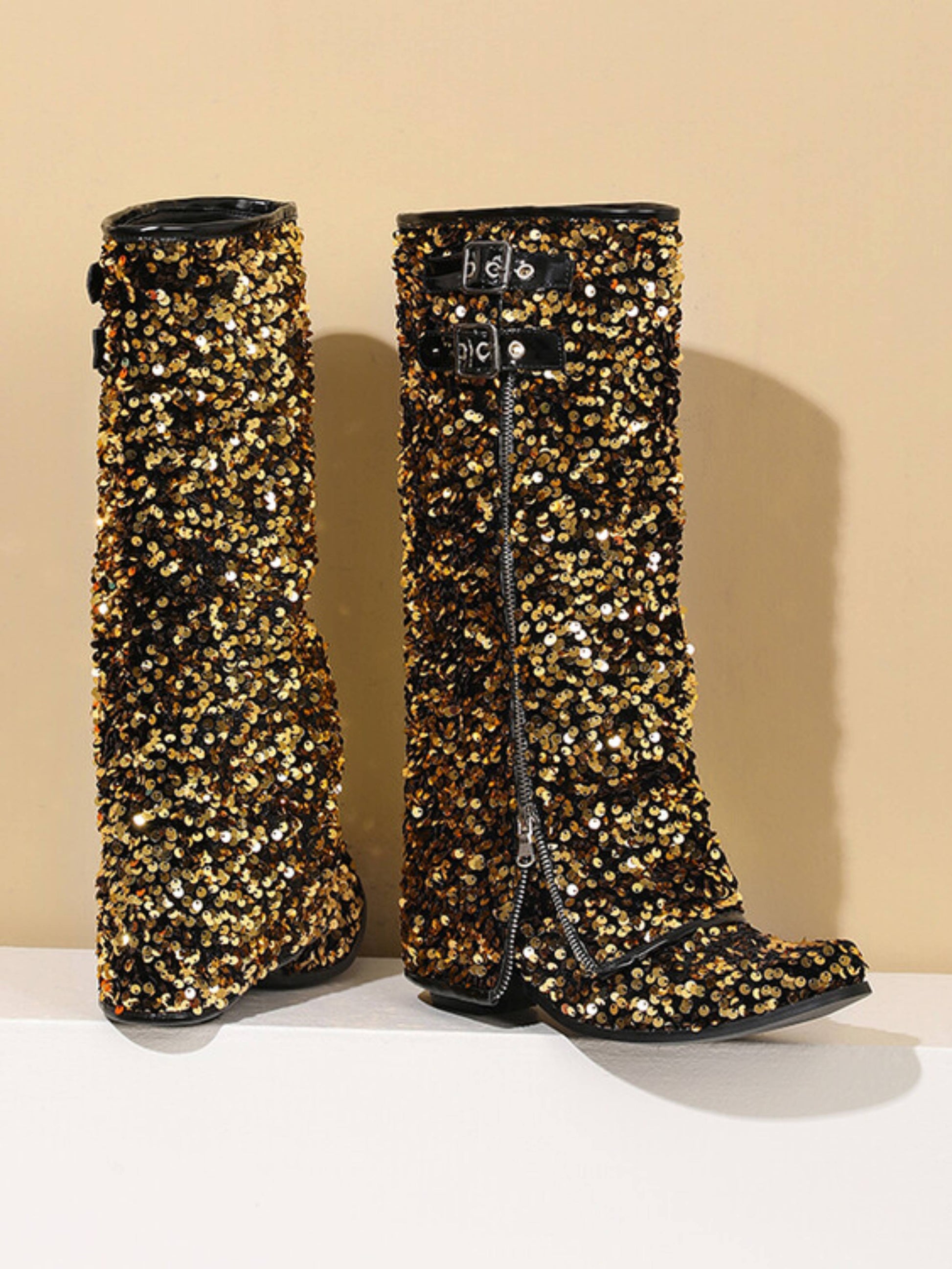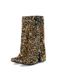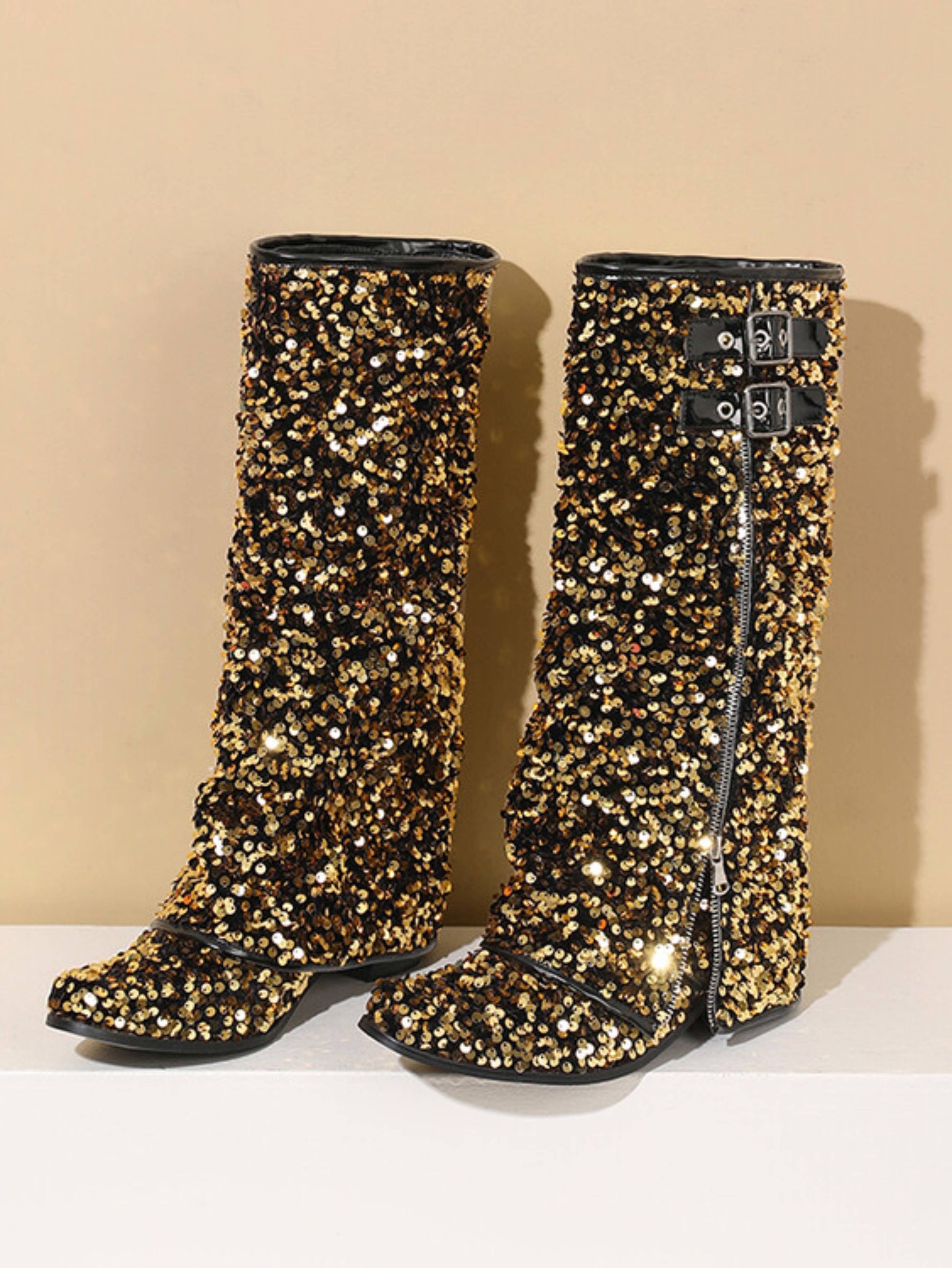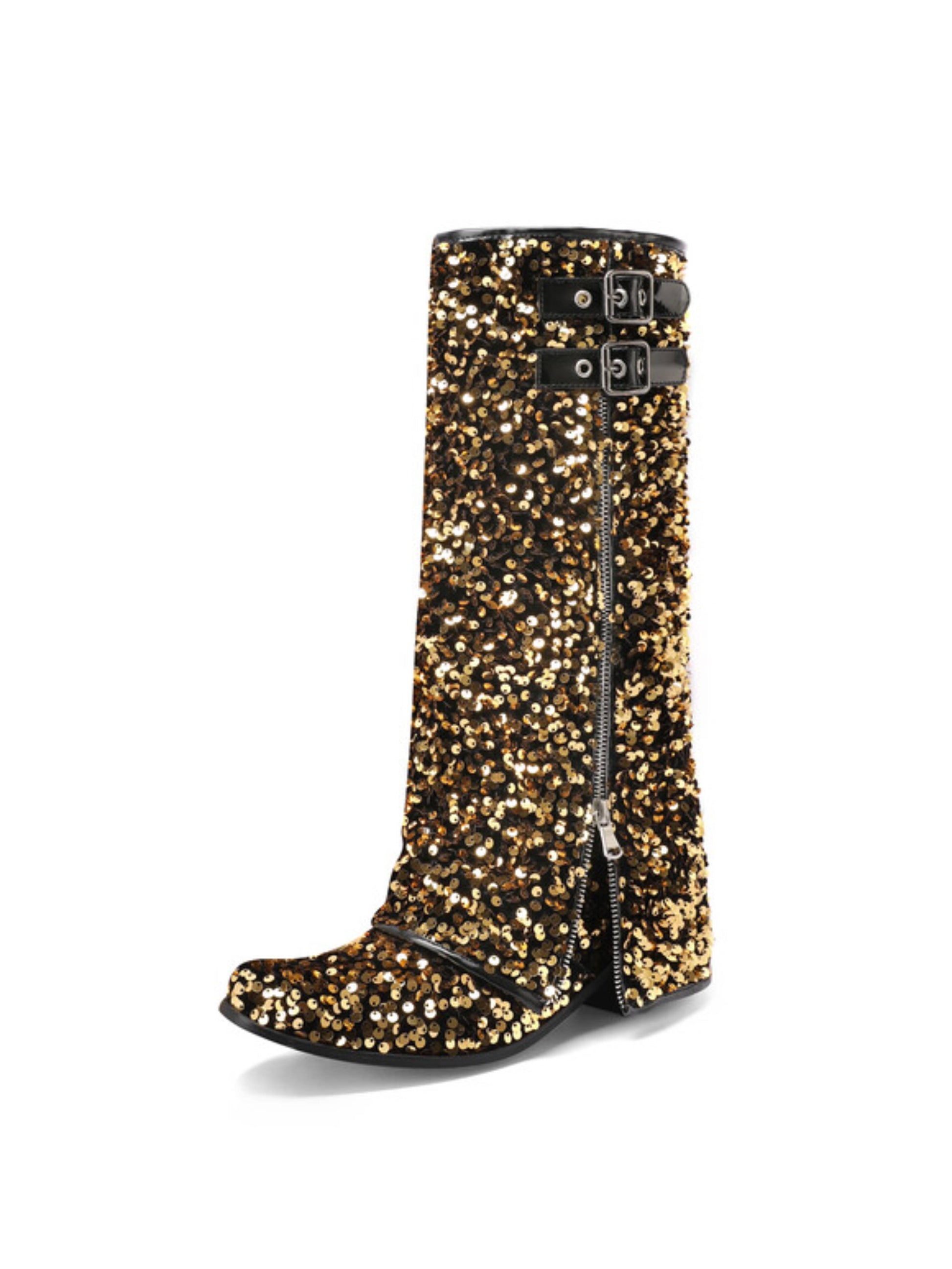 Sparkly Gold Zipper Decor Fold Over Bucked Tall Cowgirl Boots