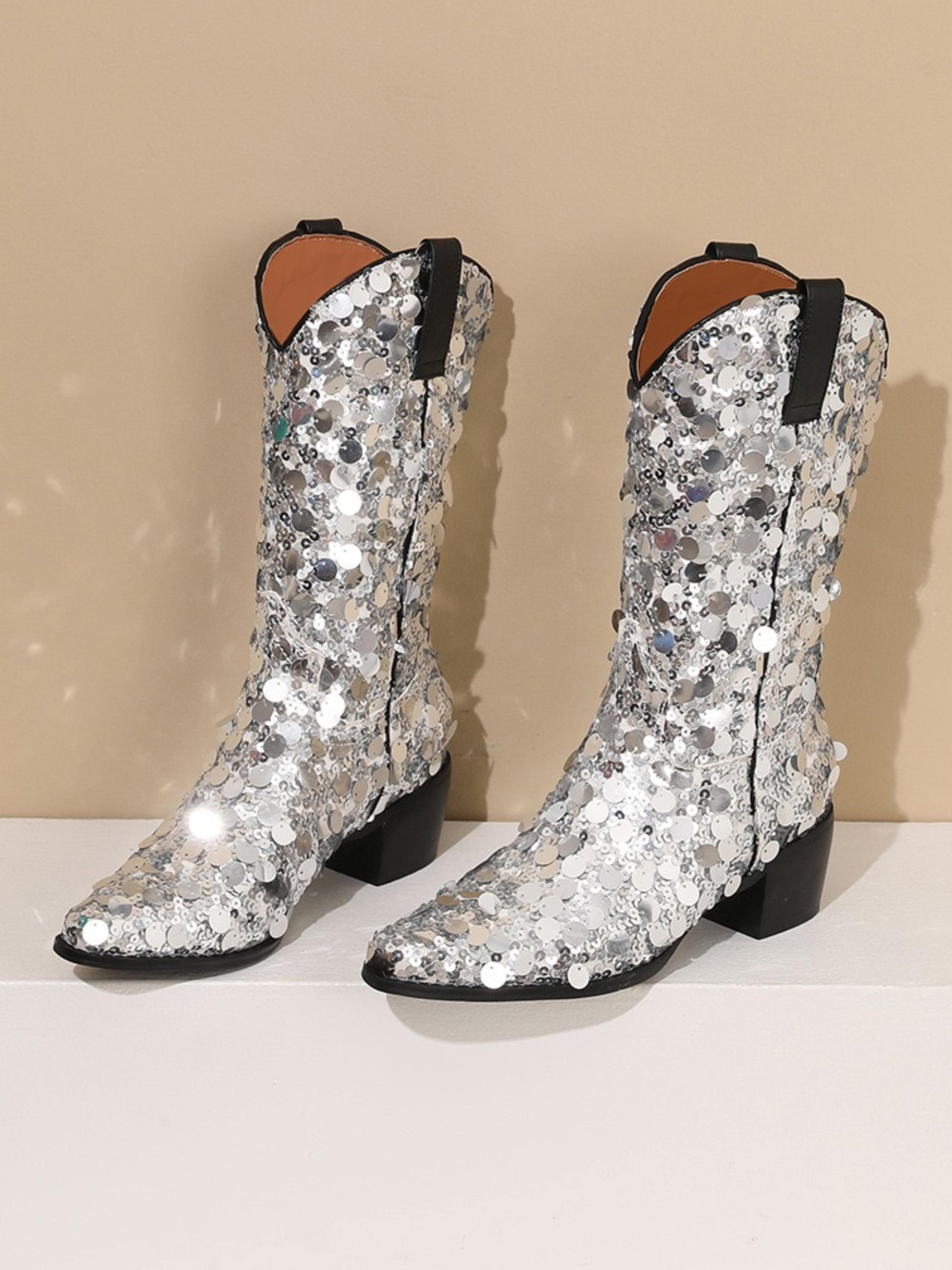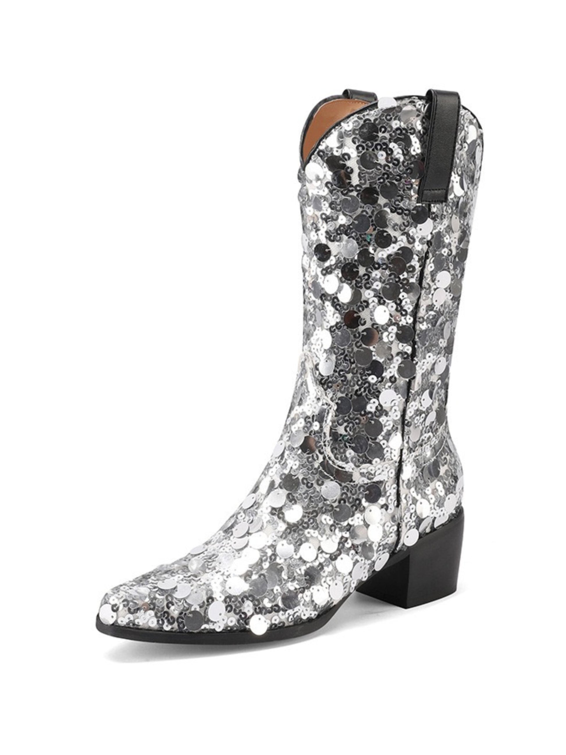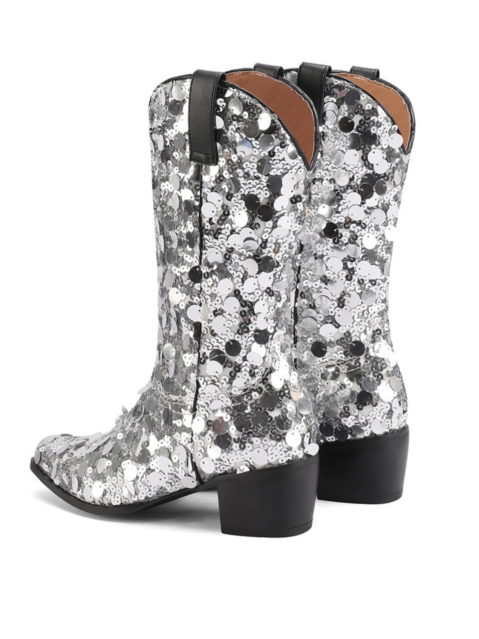 Dazzling silver boots catch every light beam with thousands of shimmering sequins. Each tiny disc creates a mirror-like gleam, transforming these Western classics into head-turning statement footwear.