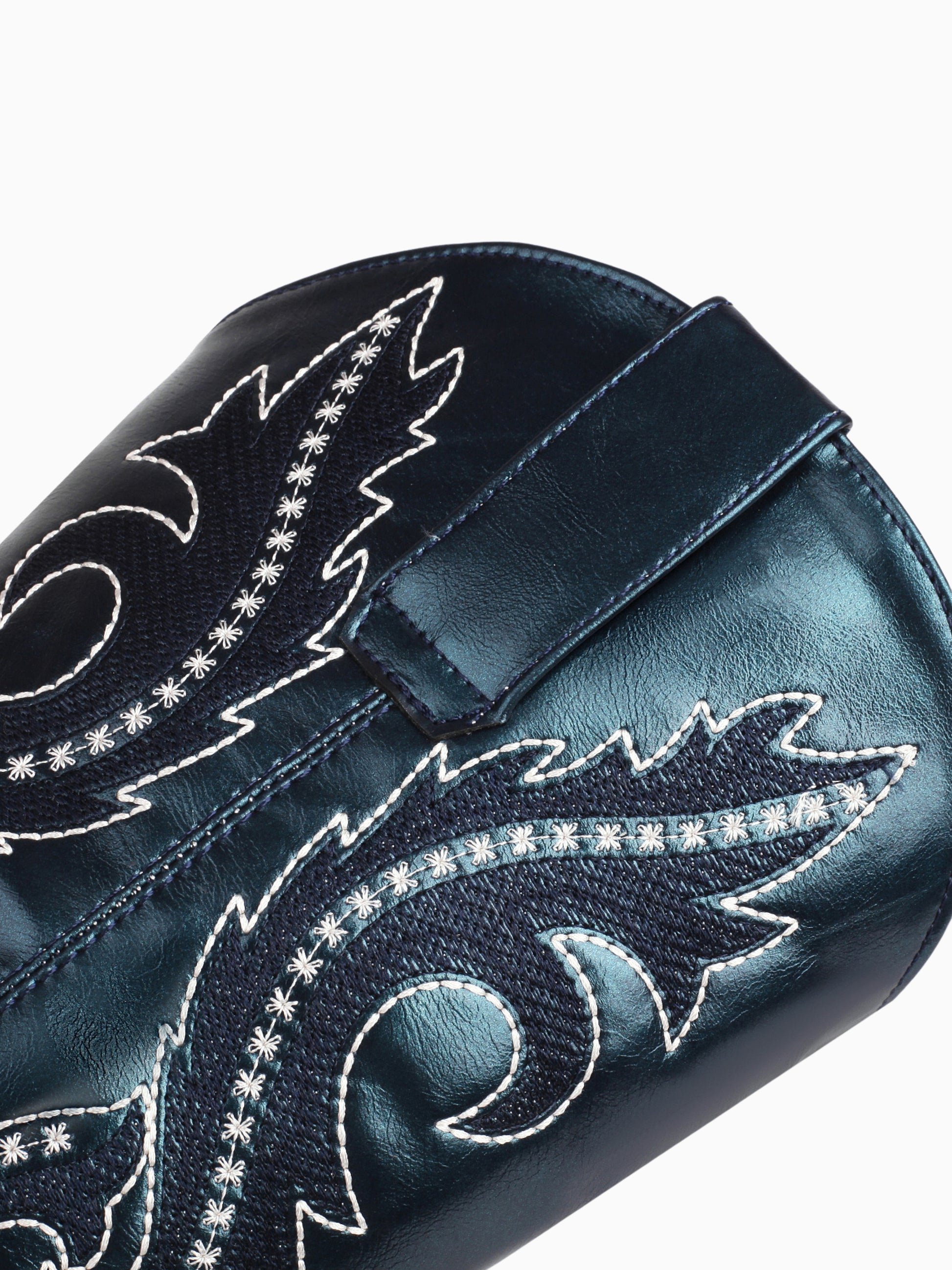 Metallic navy mid-calf square toe cowgirl boots adorned with starlit white embroidery, featuring a classic square toe and sleek Western silhouette.