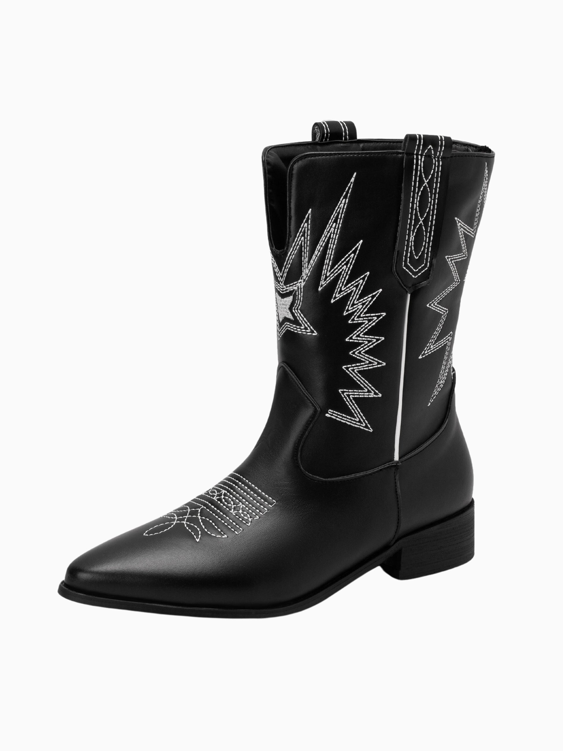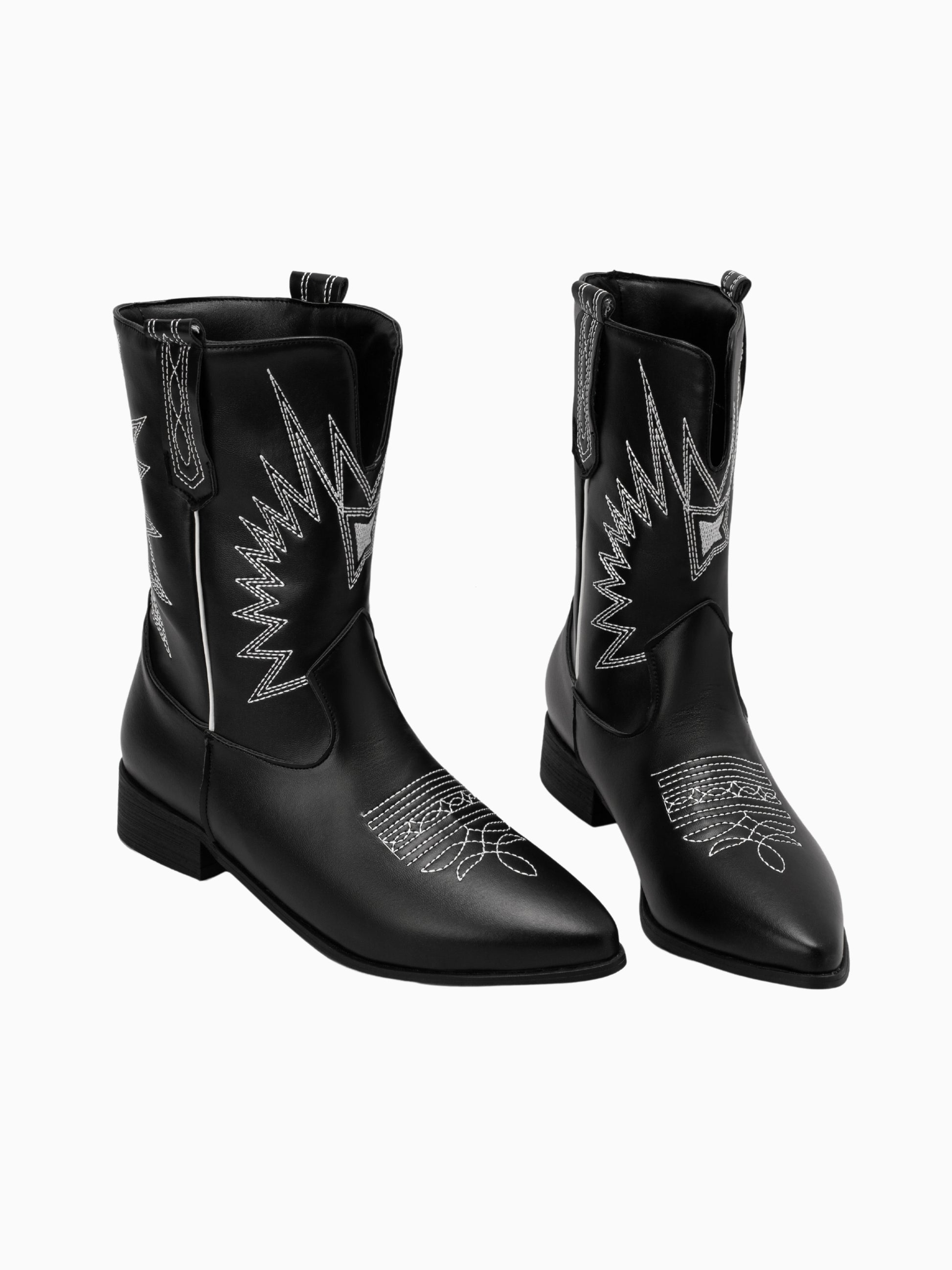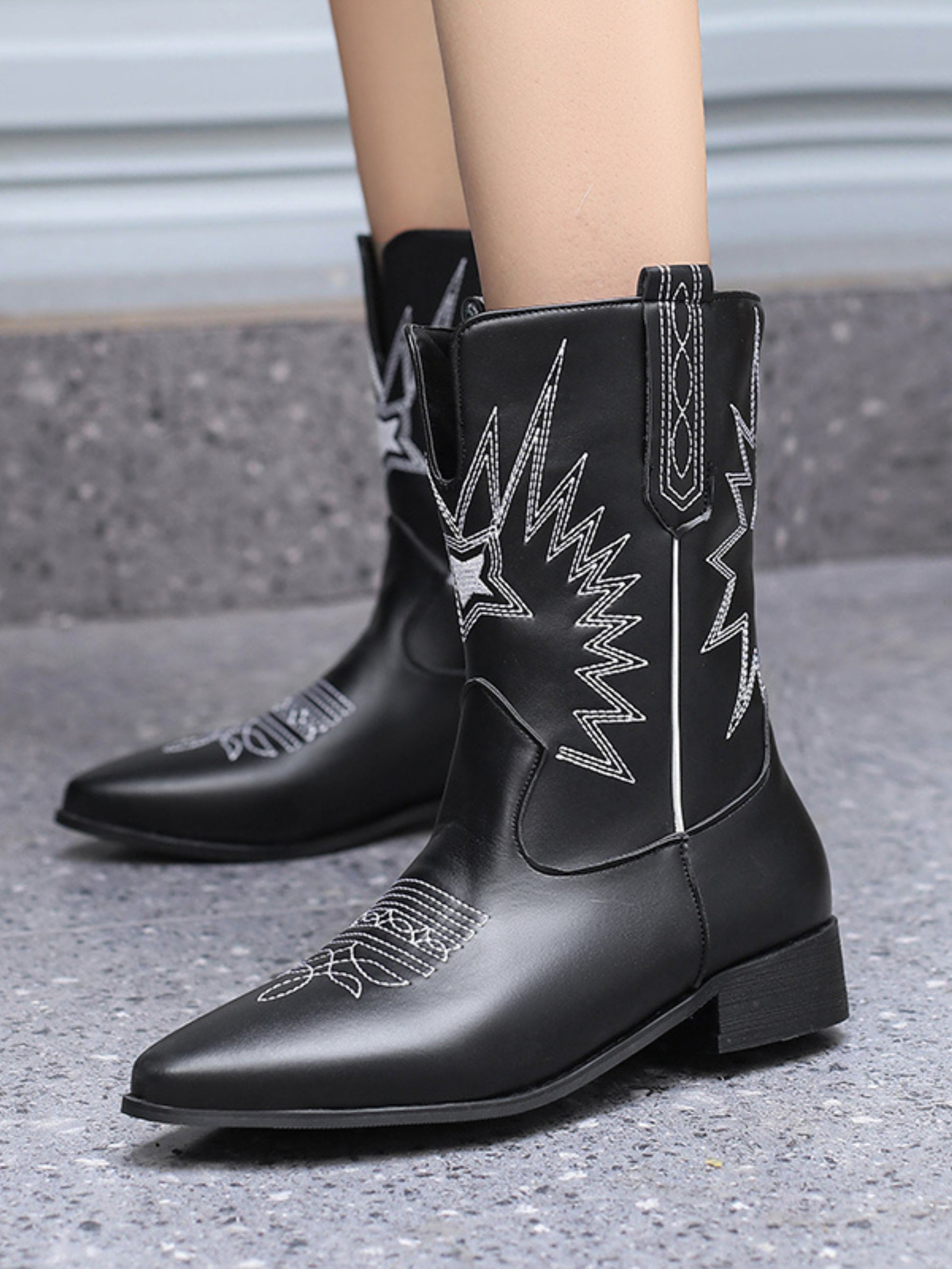 Edgy black cowgirl boots featuring striking white lightning embroidery and a pointed toe design, perfect for the modern rebel with classic Western style.