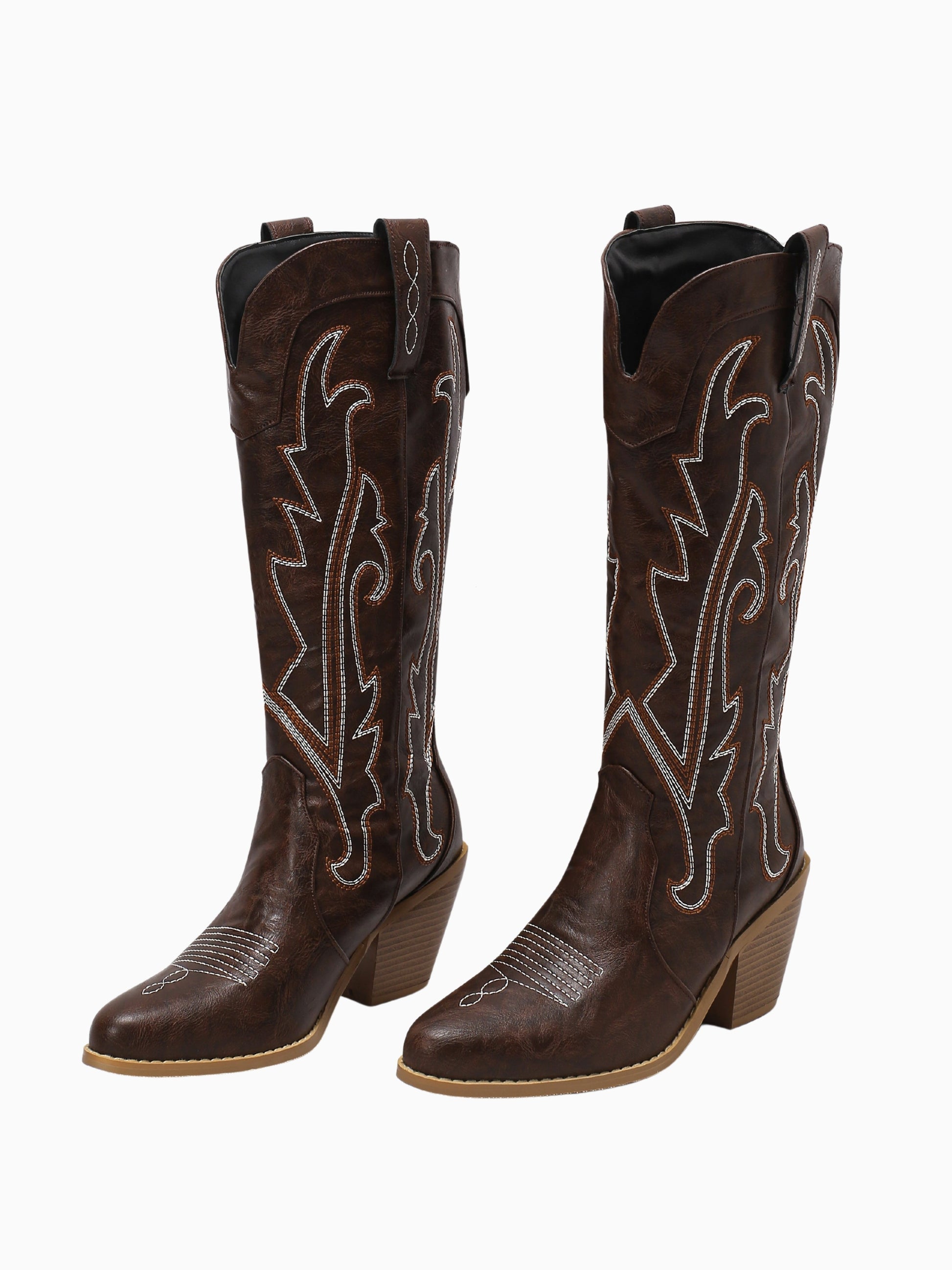 Striking dark brown western boots feature bold zigzag stitching, mid-calf length, and stacked heels, creating a dramatic silhouette for the contemporary cowgirl style.