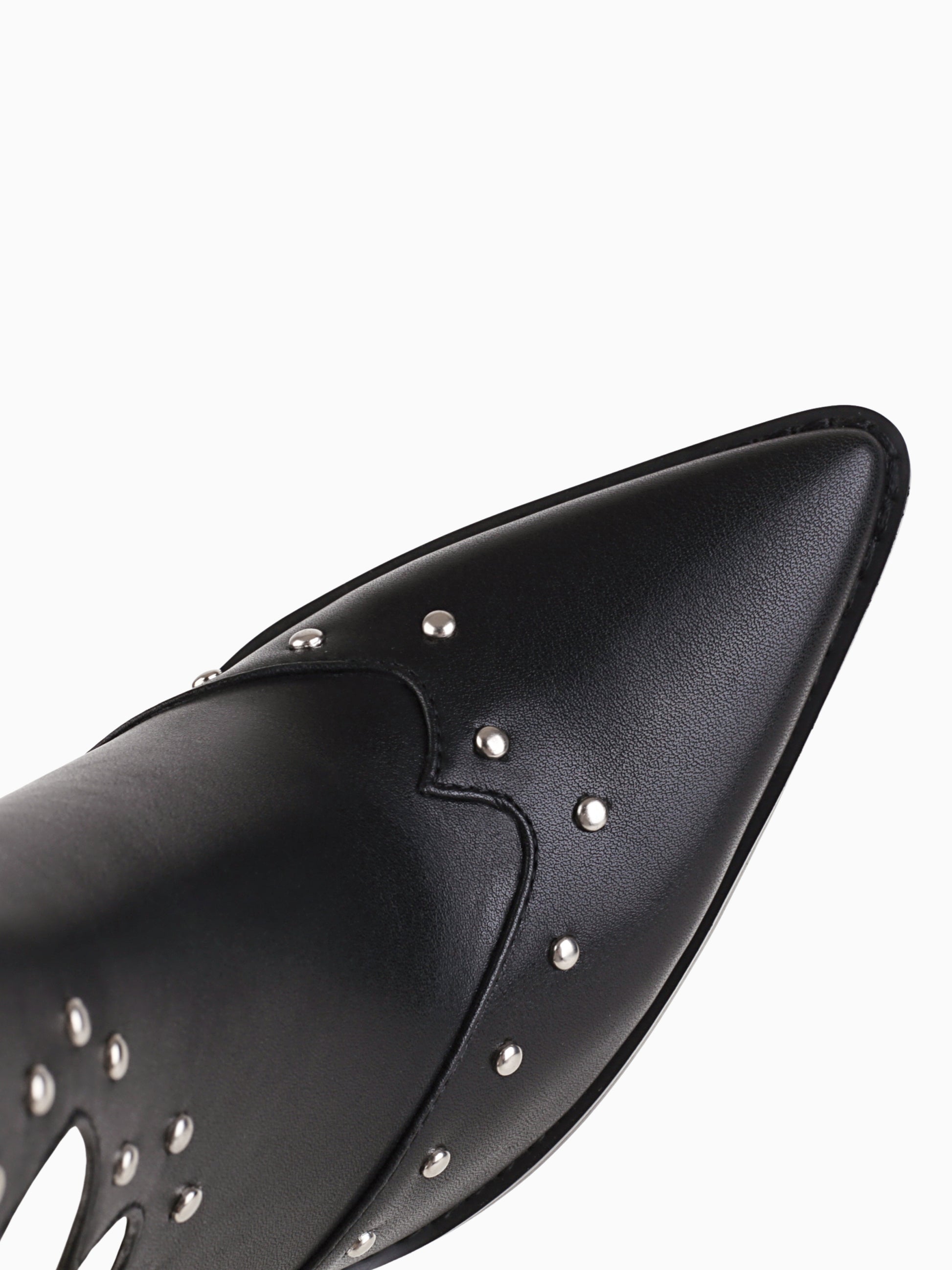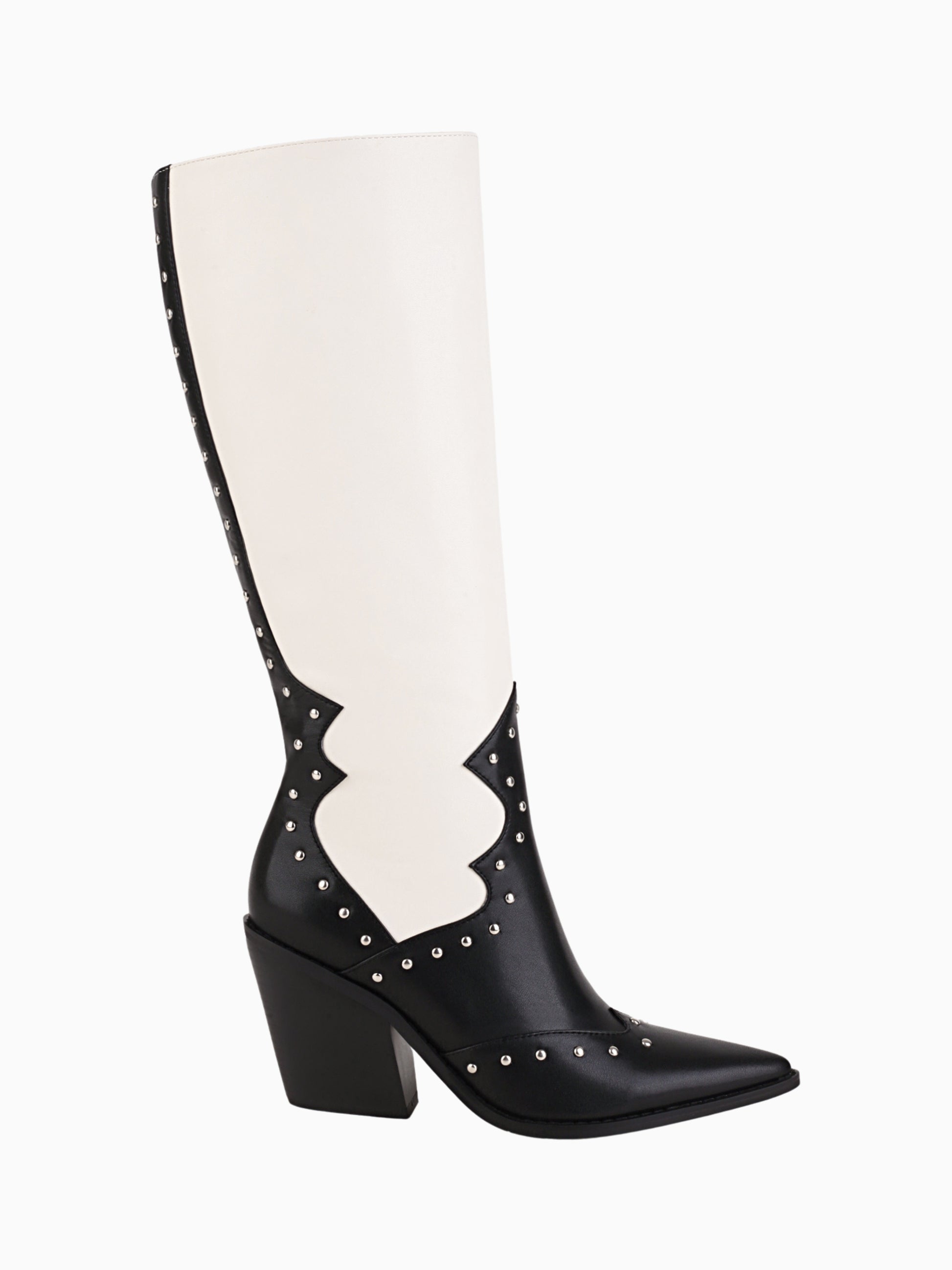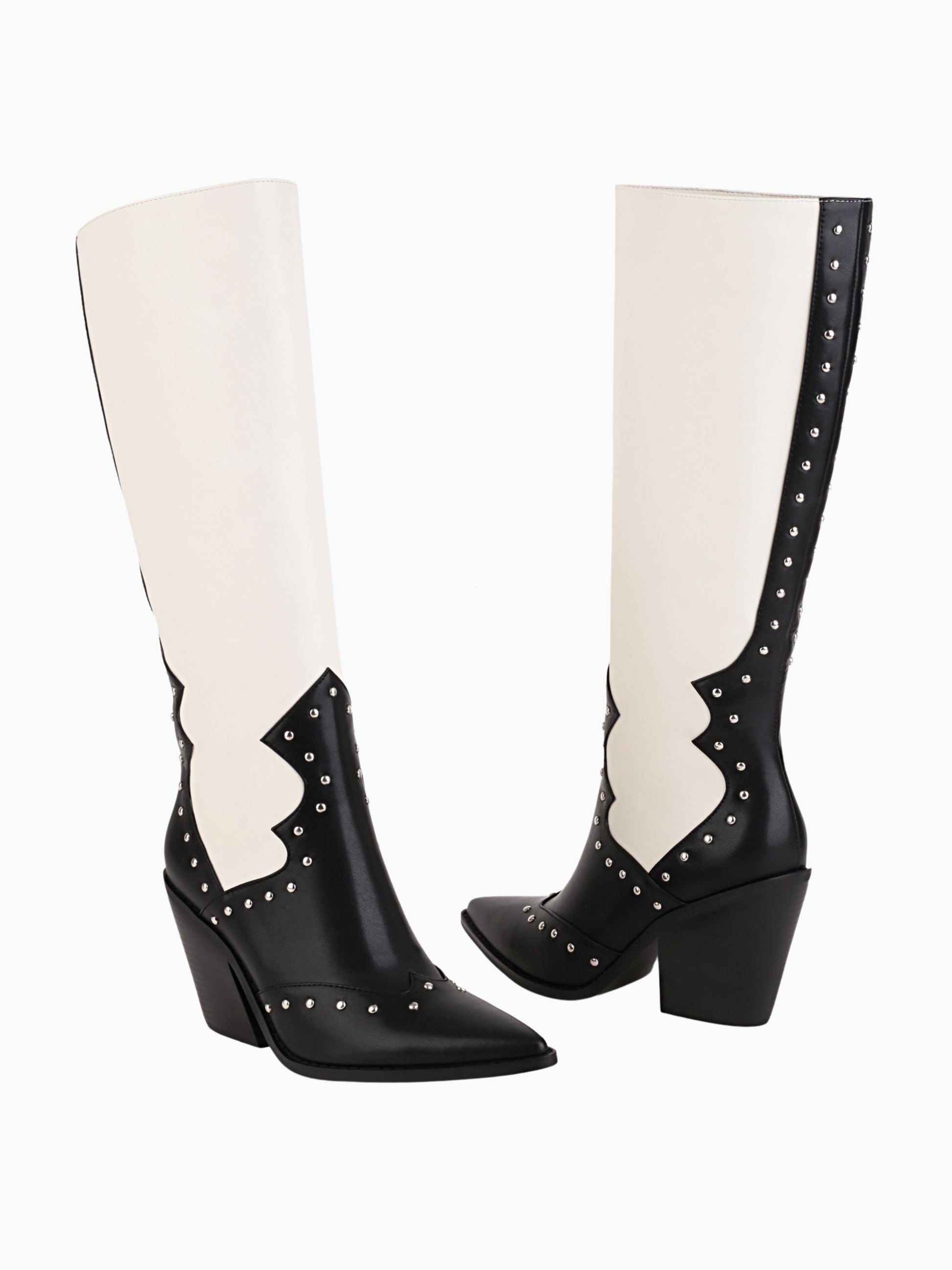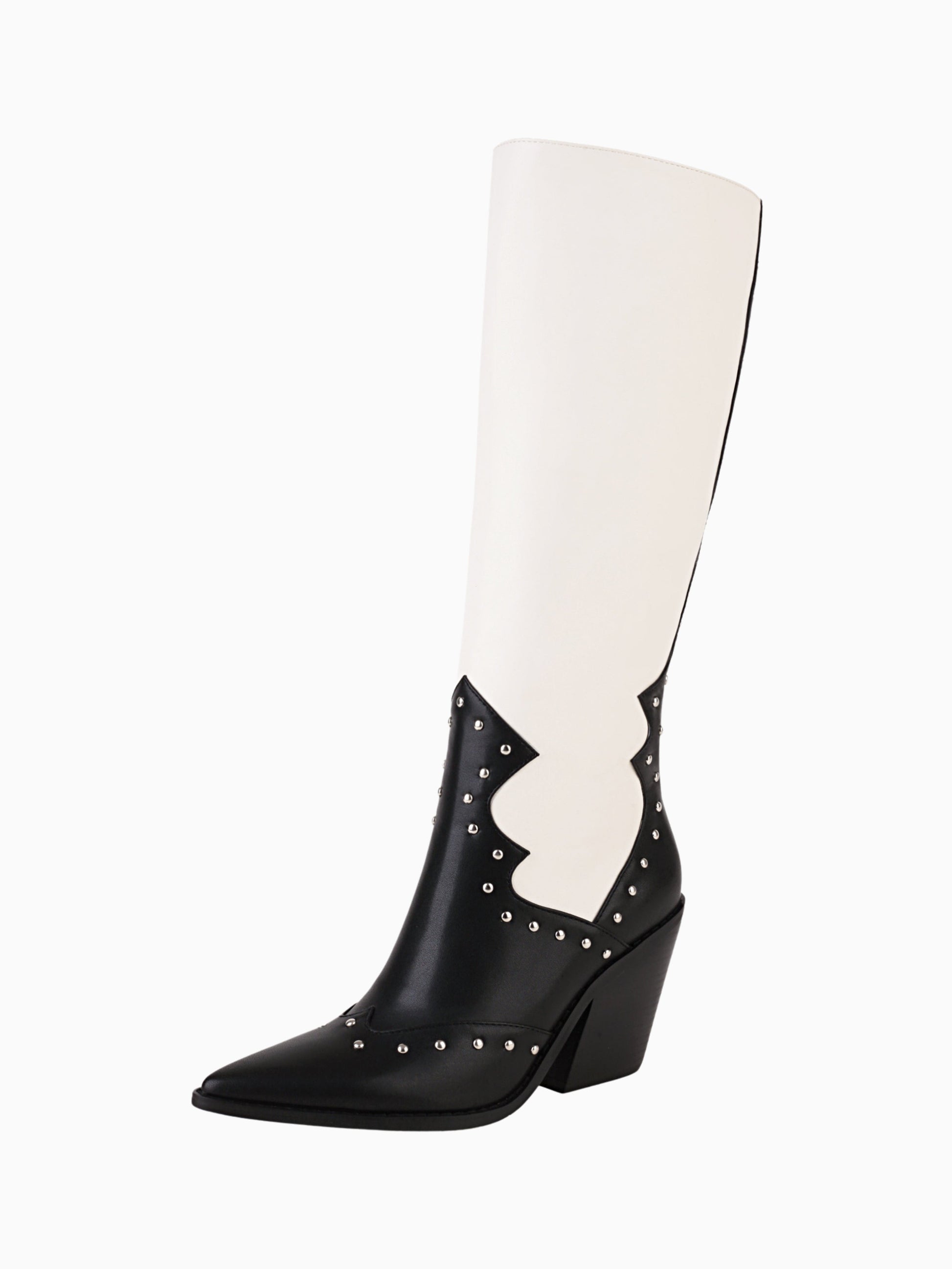 Black & White Studded Knee-High Pointed Toe Cowgirl Boots