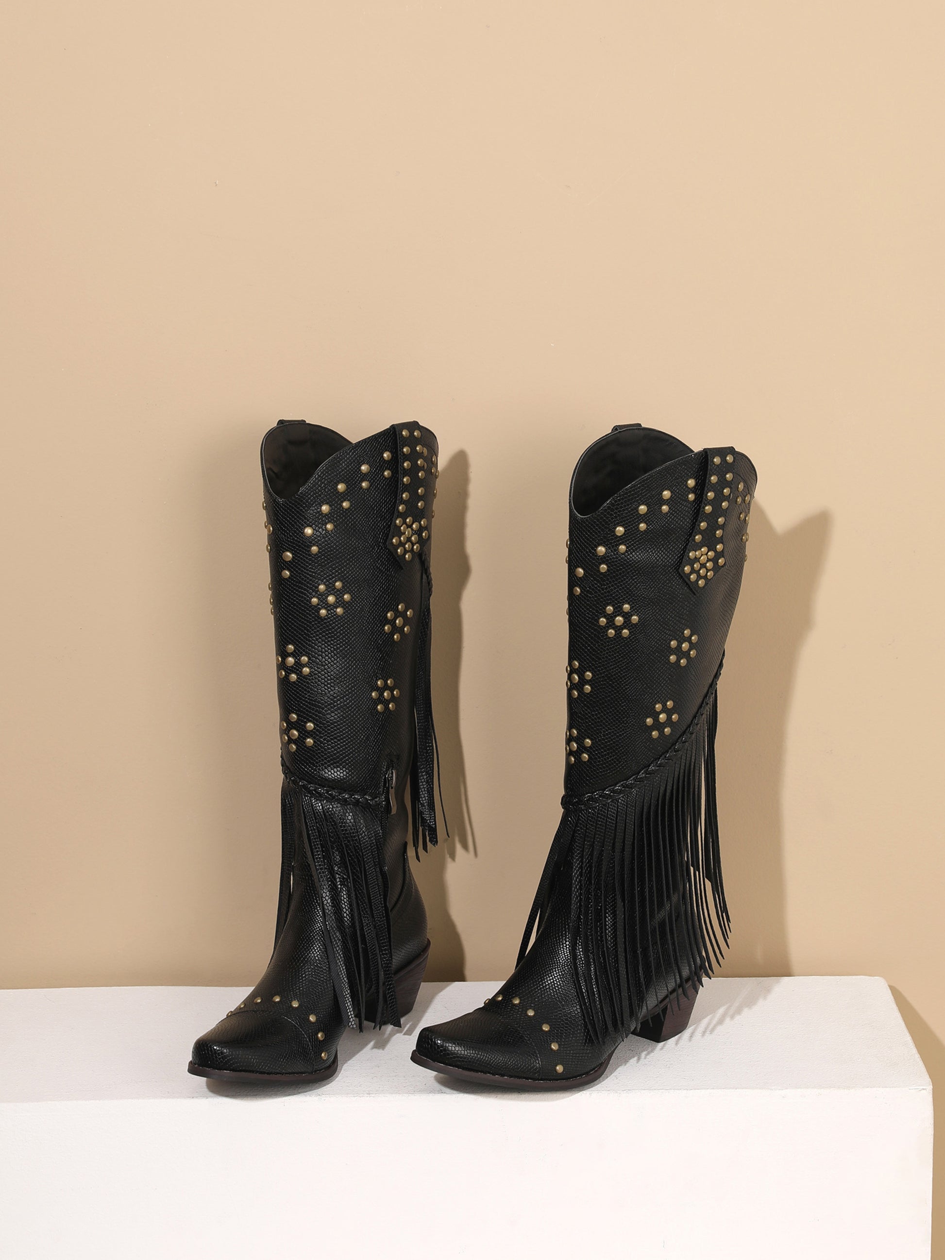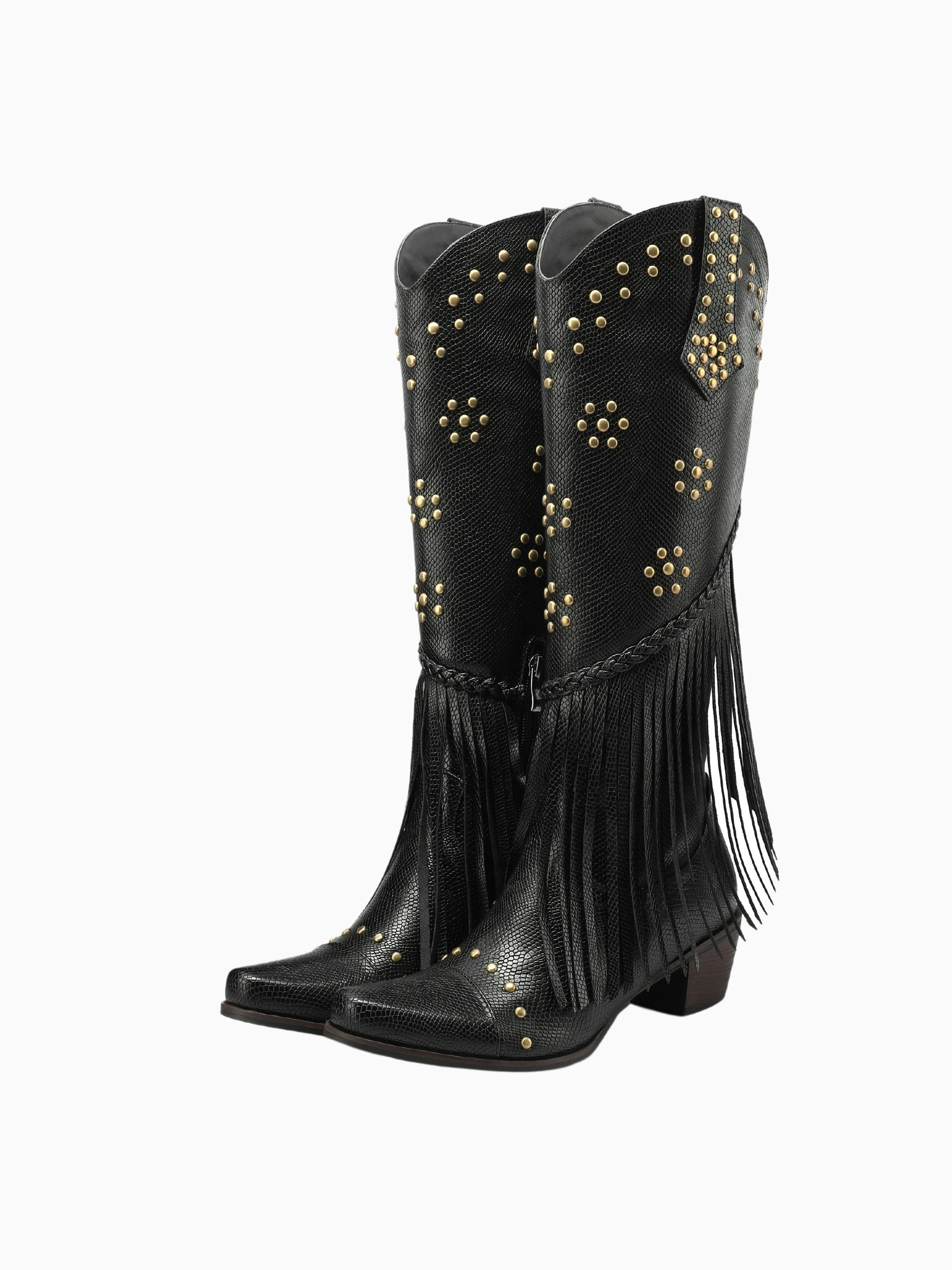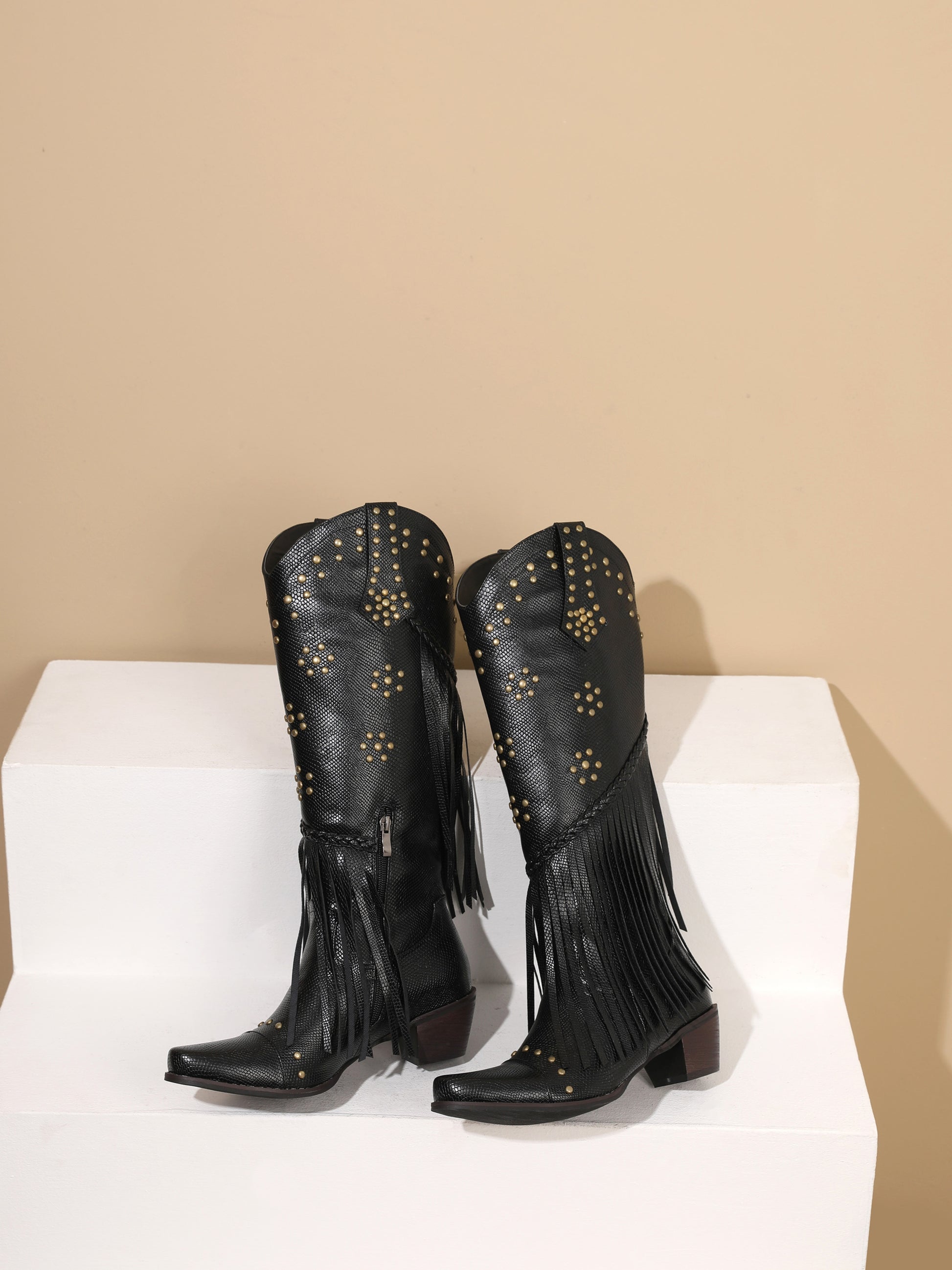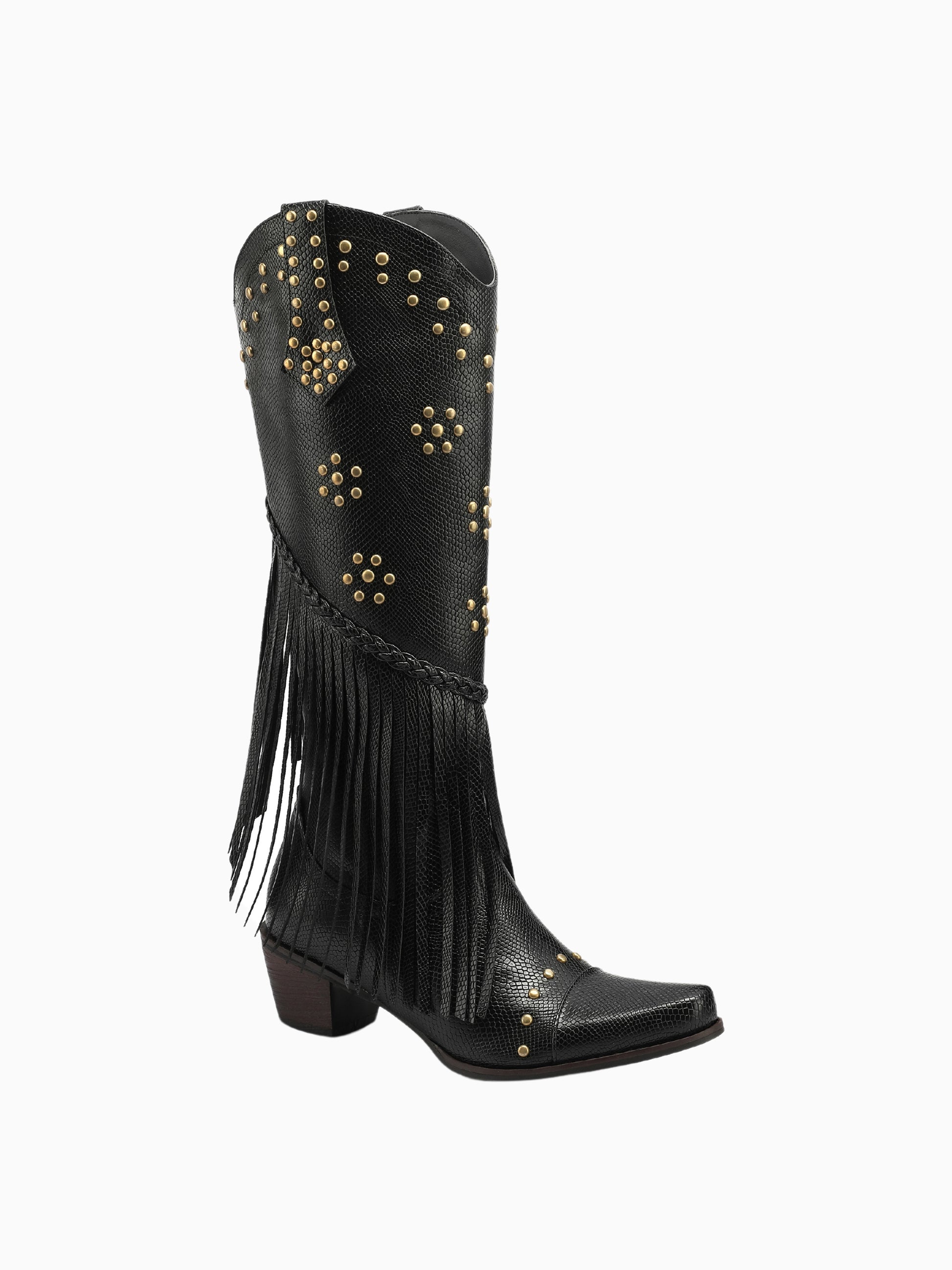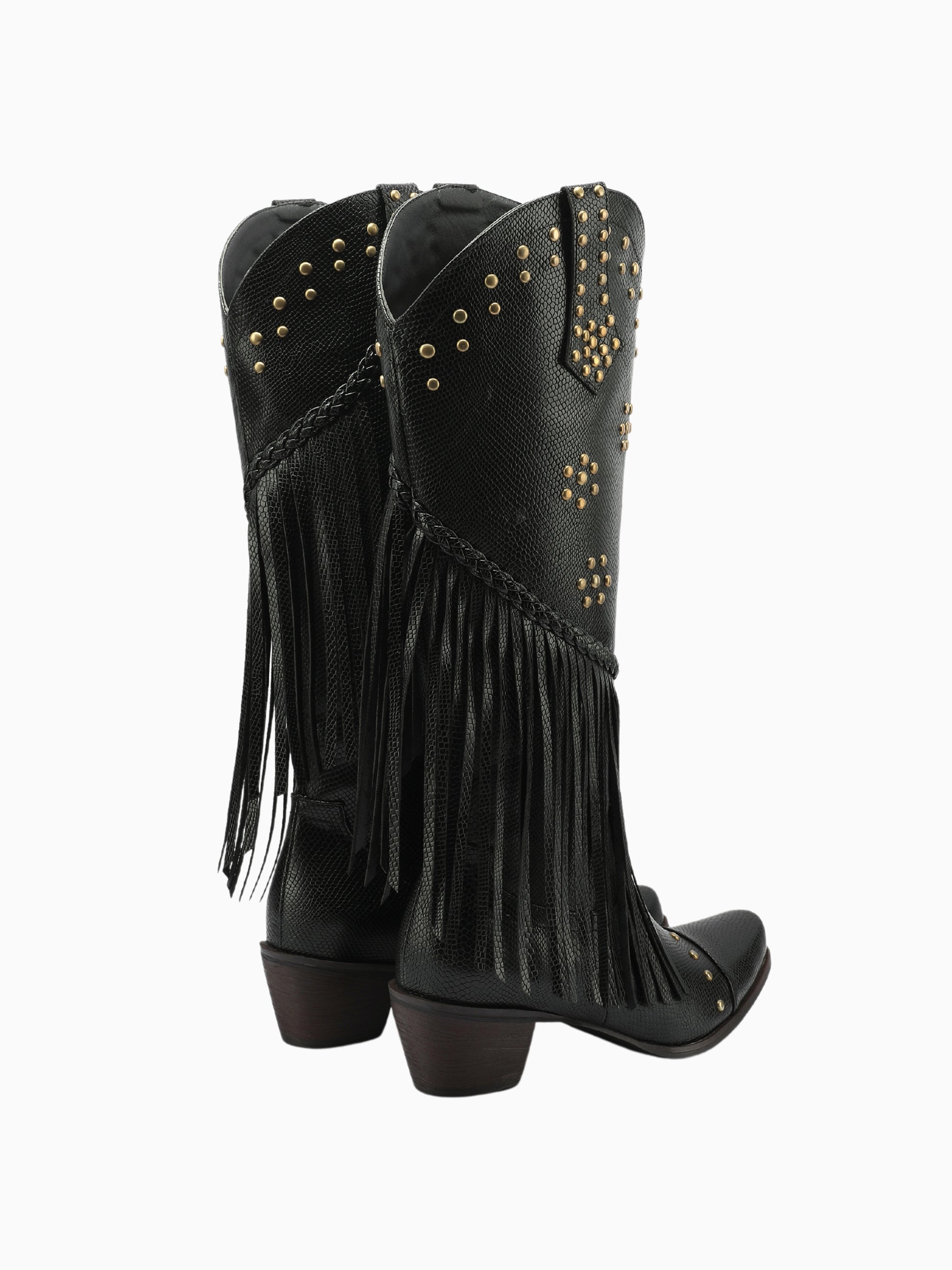 Edgy black western boots showcase brass stud patterns and dramatic side fringe, perfect for making a bold fashion statement.