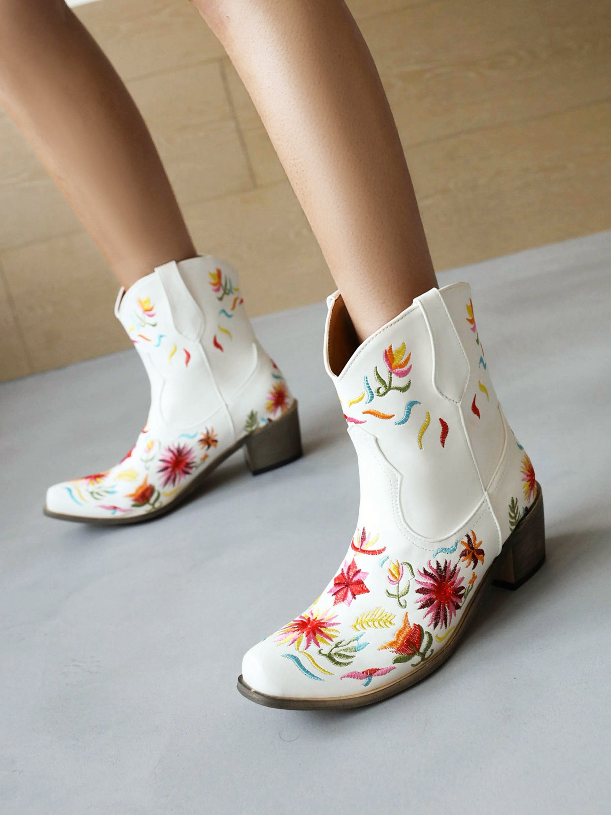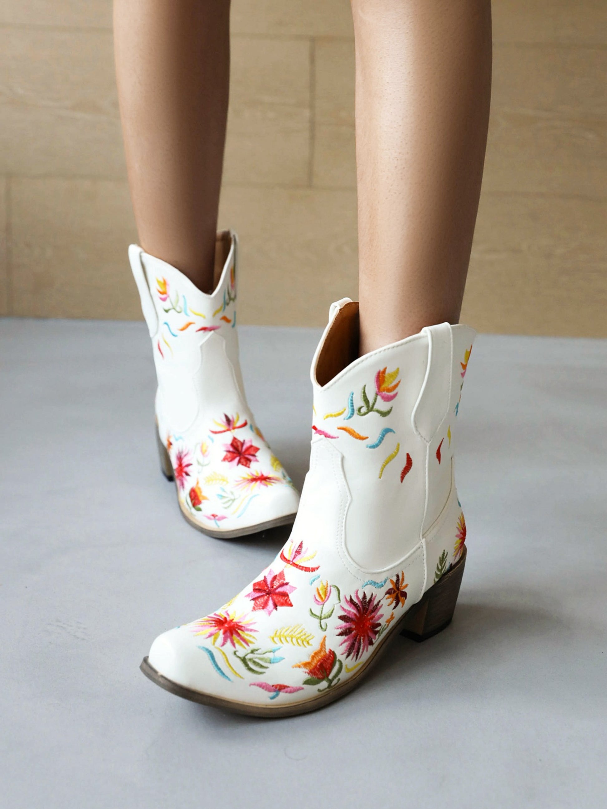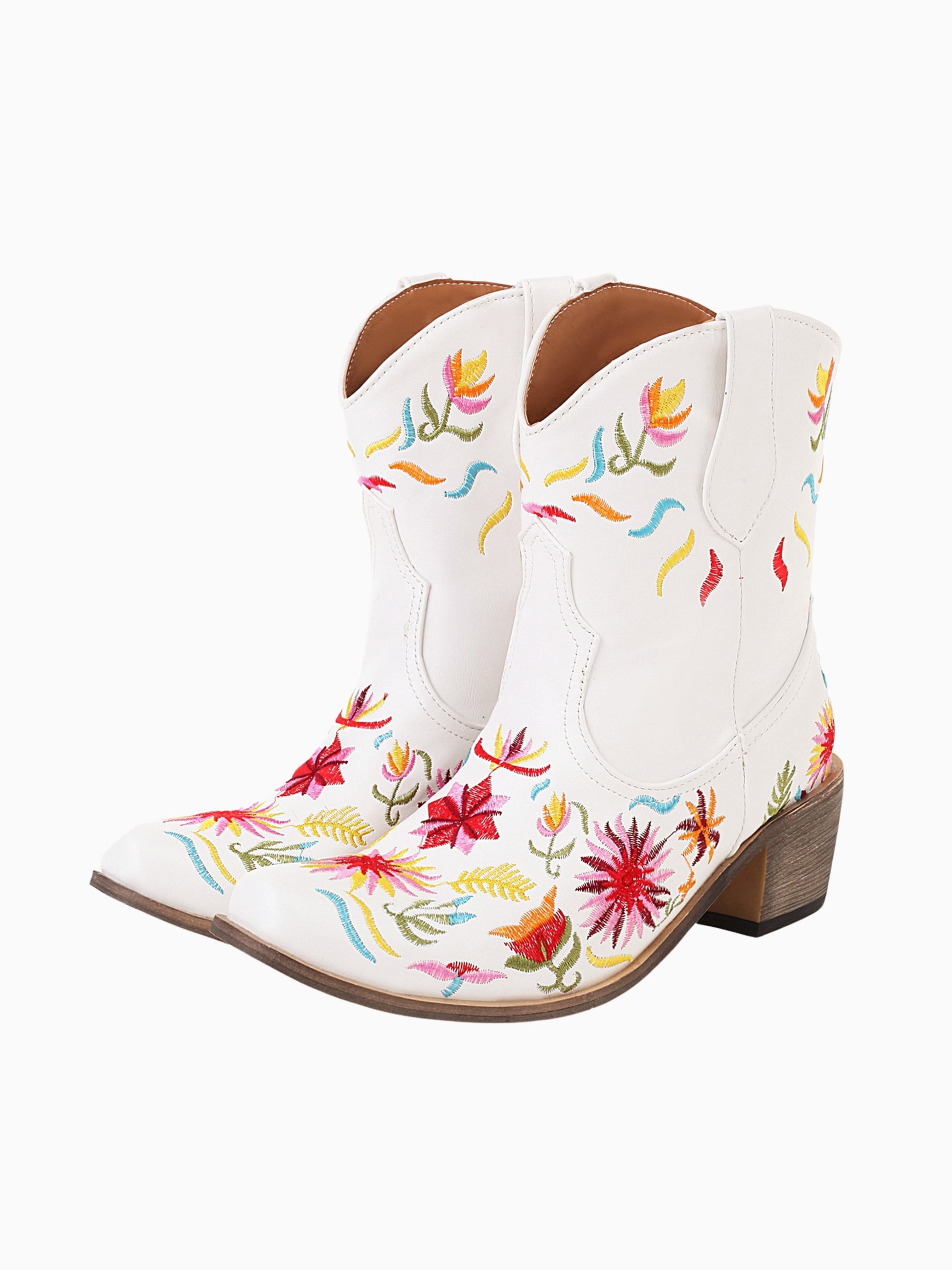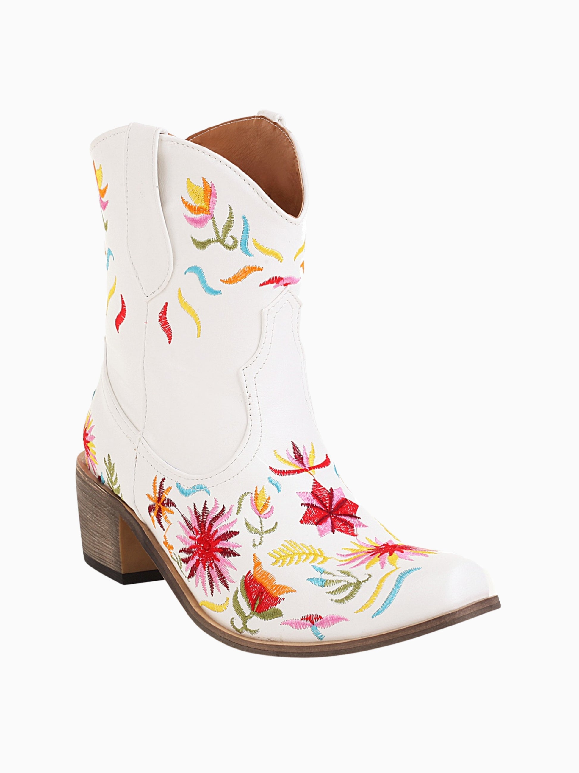 Stunning white western boots showcase vibrant multi-colored floral embroidery, featuring a comfortable heel height and classic pointed-toe design.