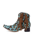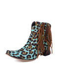 Trendy teal leopard ankle boots with fringe perfect for women seeking stylish Western footwear. Features classic snip toe cowboy boot design. Ideal for country concerts, festivals, casual outfits. Shop unique cowgirl boots online today.