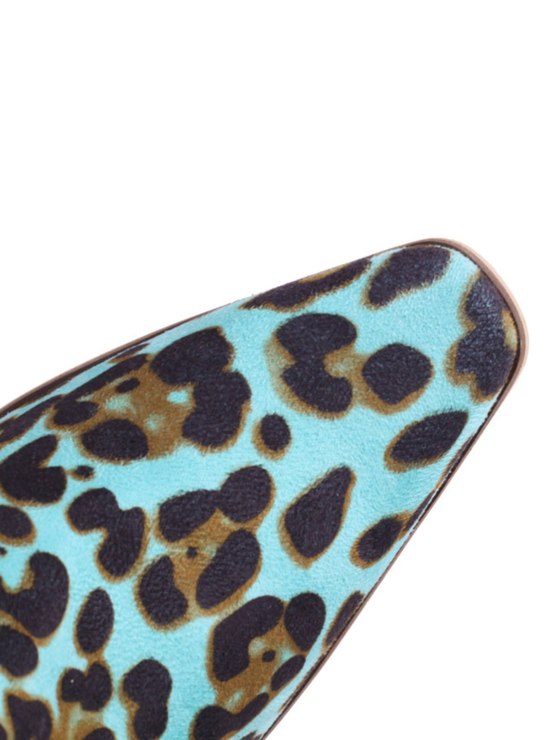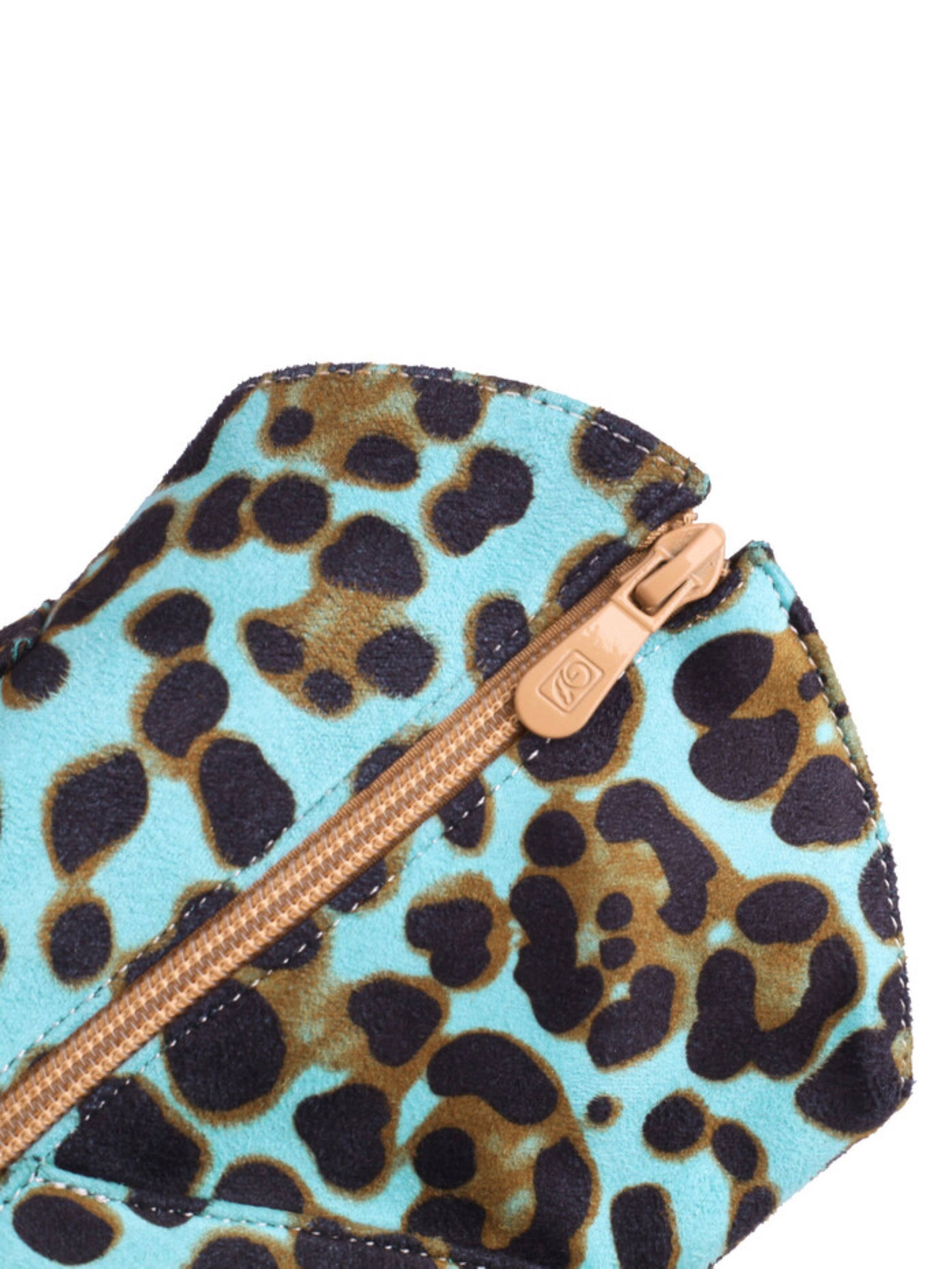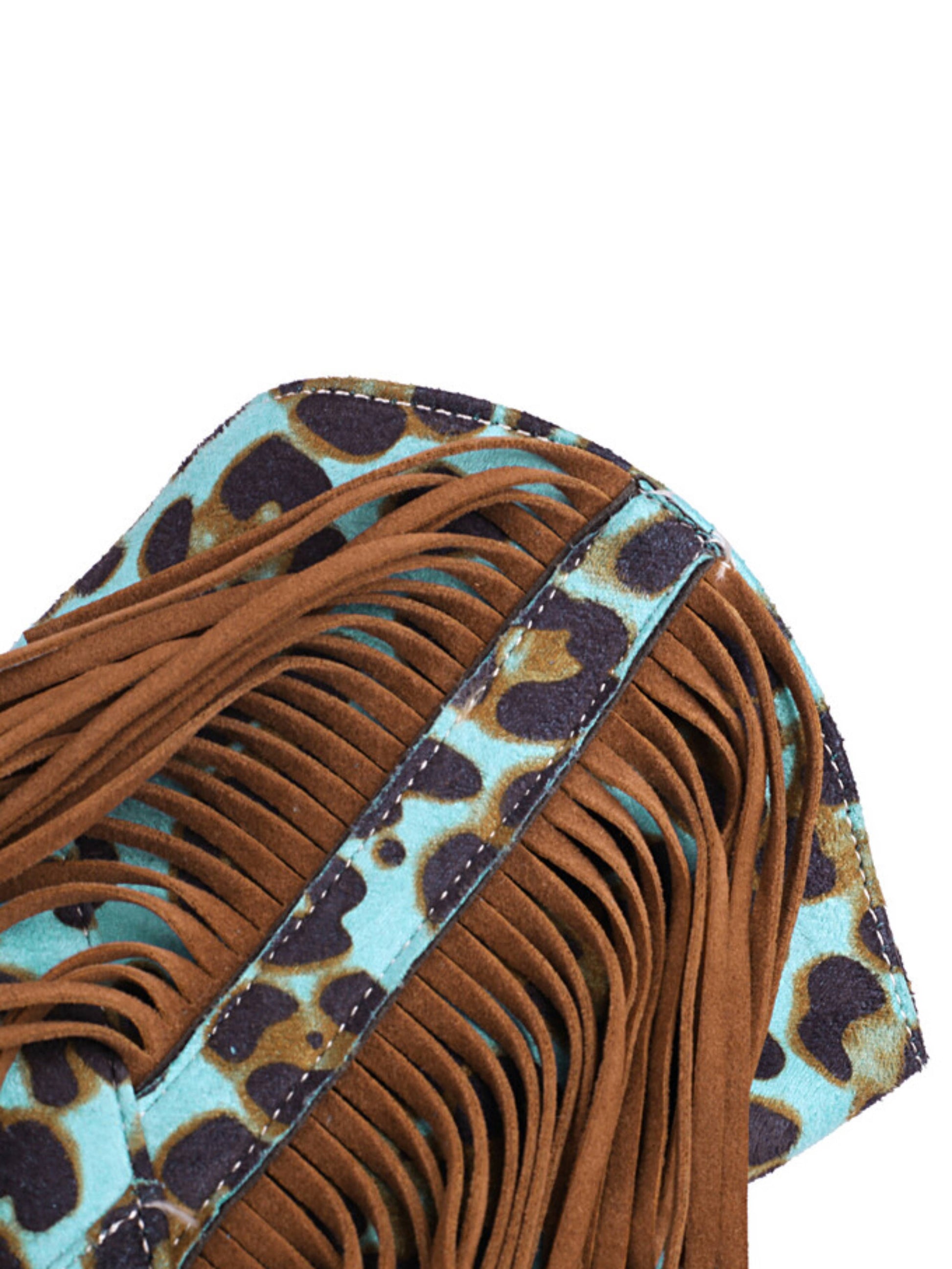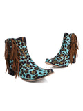 Teal Leopard Snip Toe Ankle Cowgirl Boots with Fringe
